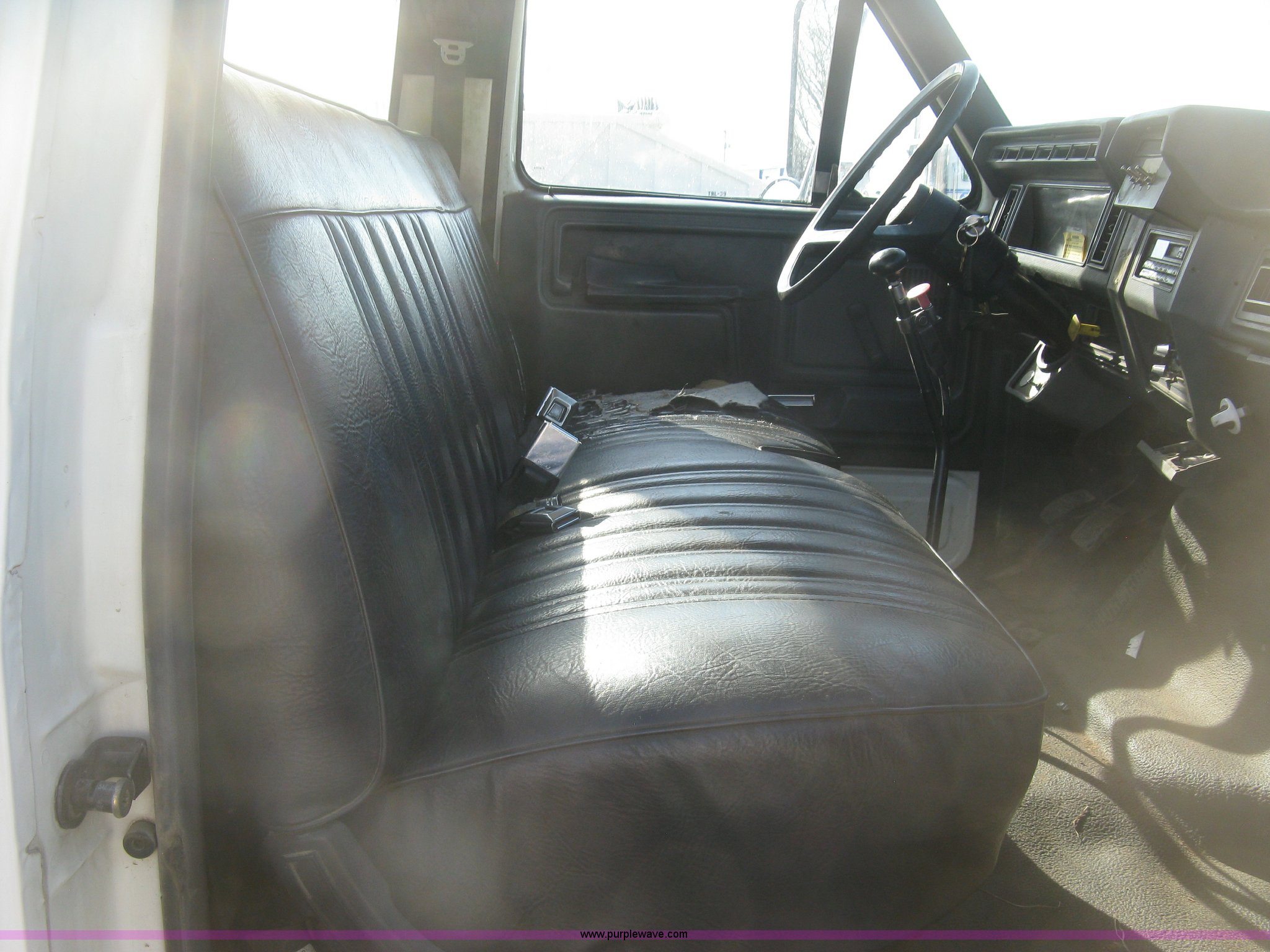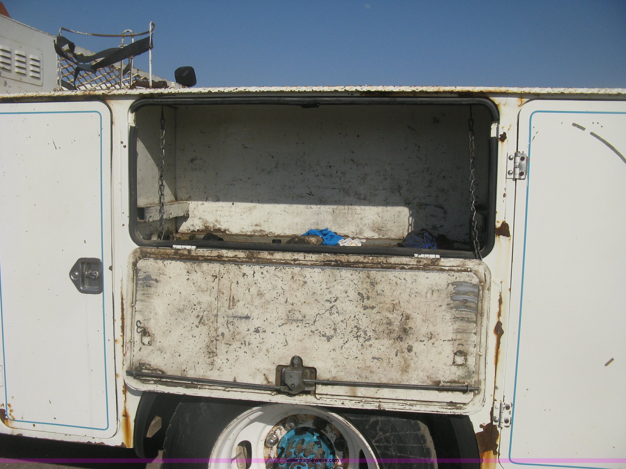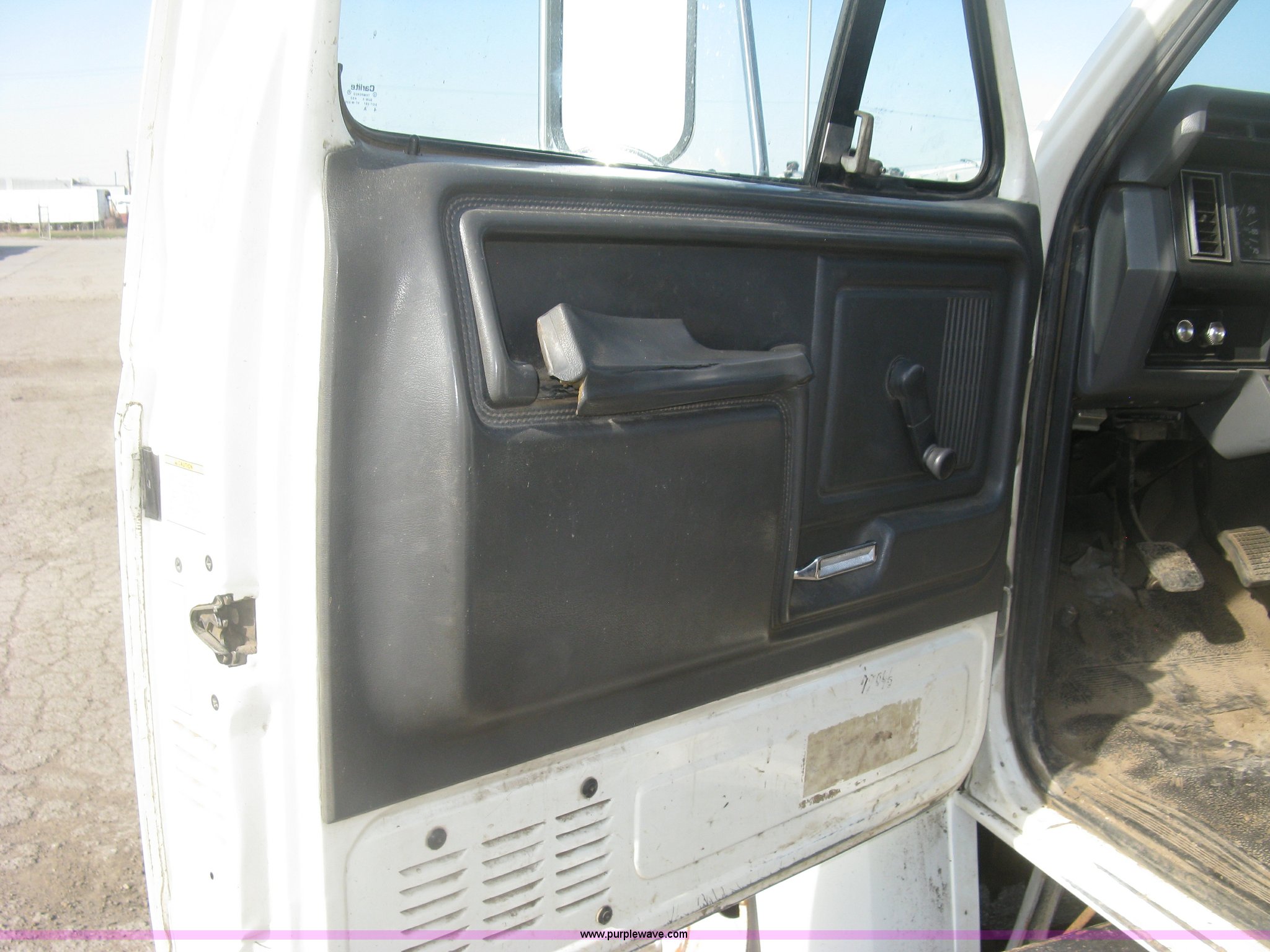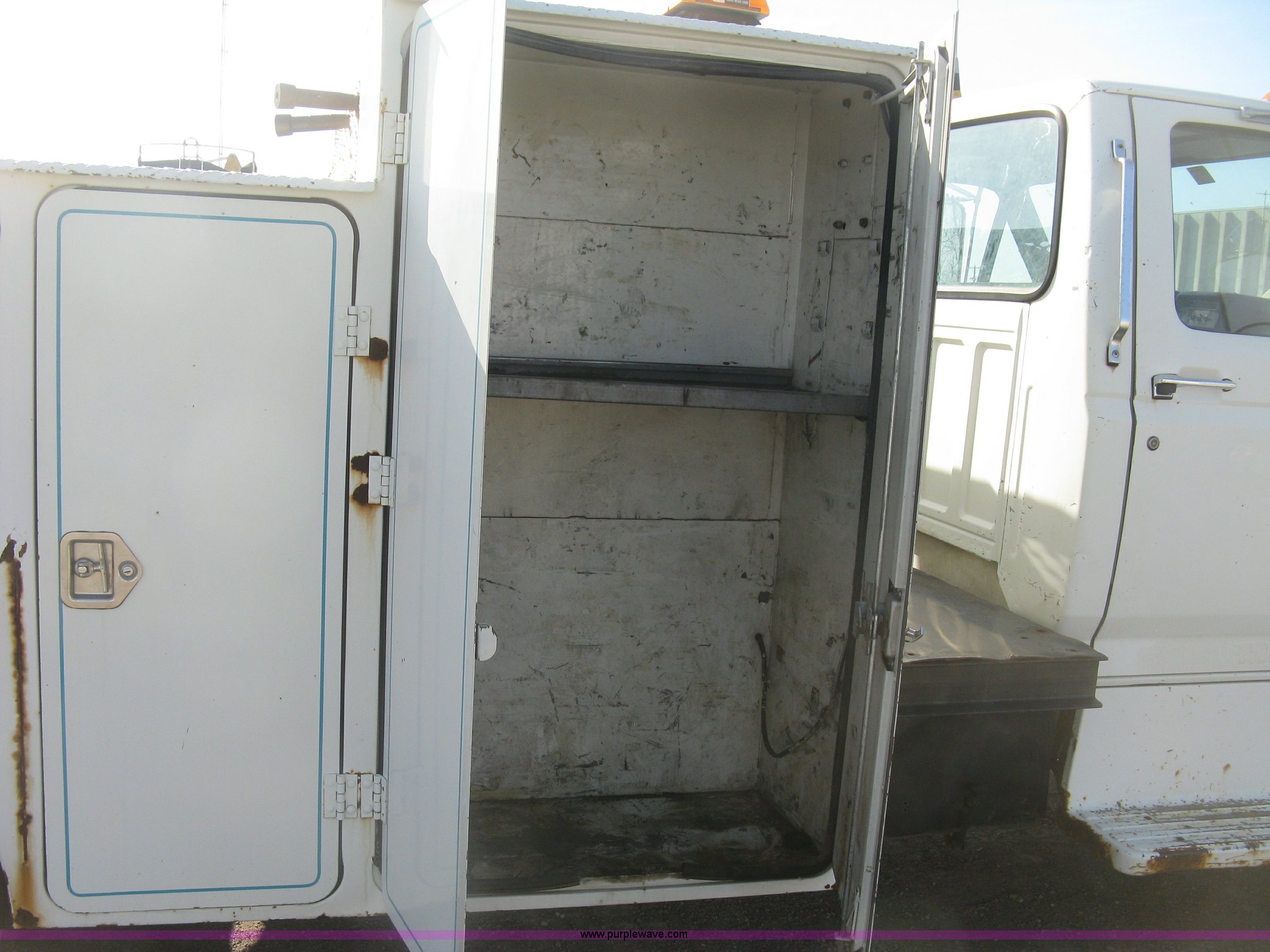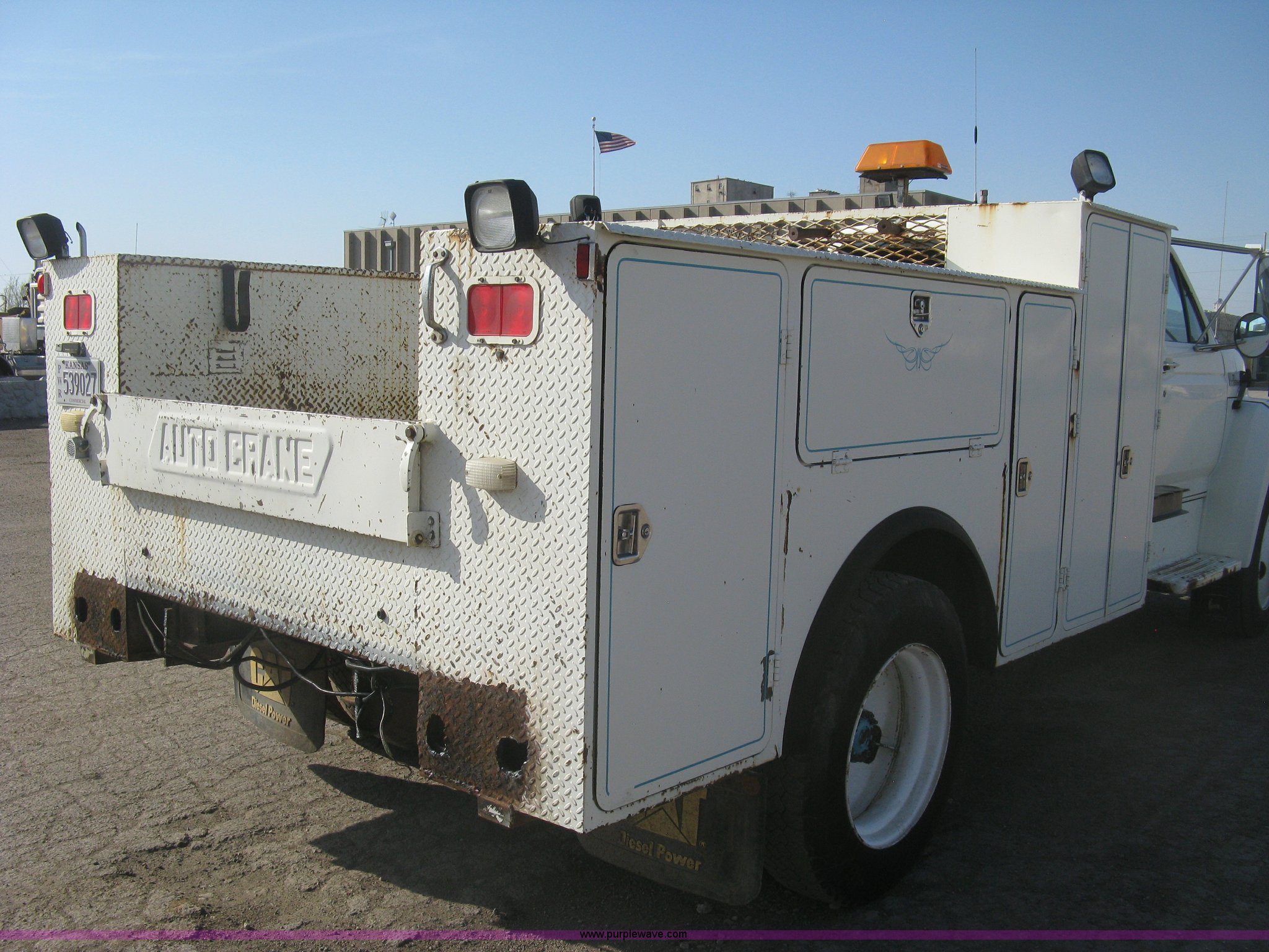 Purple Wave is selling a used Service Truck in Kansas. This item is a 1994 Ford F700 service truck with the following: 385,268 miles on odometer, Cummins 5.9L L6 diesel engine, Five speed manual transmission, Two speed rear end, AC and heat, AM/FM/cassette, Manual windows and locks, Vinyl interior, Autocrane service bed, 11'L x 94"W, Diamond plate floor, (8) side compartments, Work lights, 50 gallon fuel tank, 171" wheelbase, 255/70R22.5 front tires, 9R22.5 rear tires, GVWR 24,200 lbs, Windshield chipped, Unit# LTT10