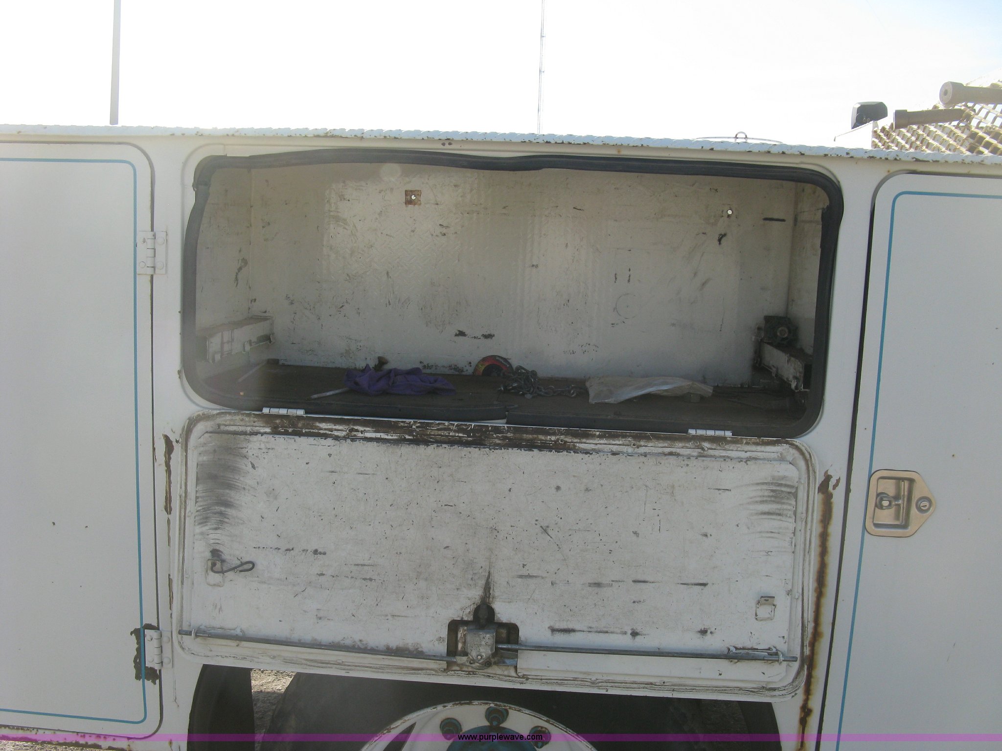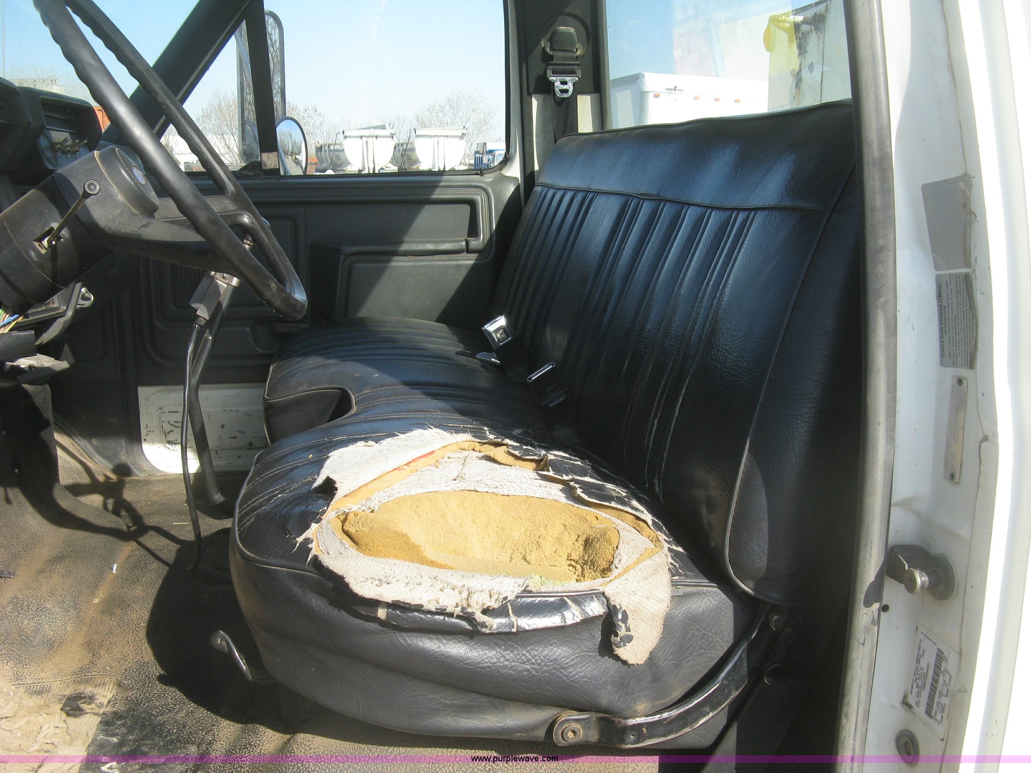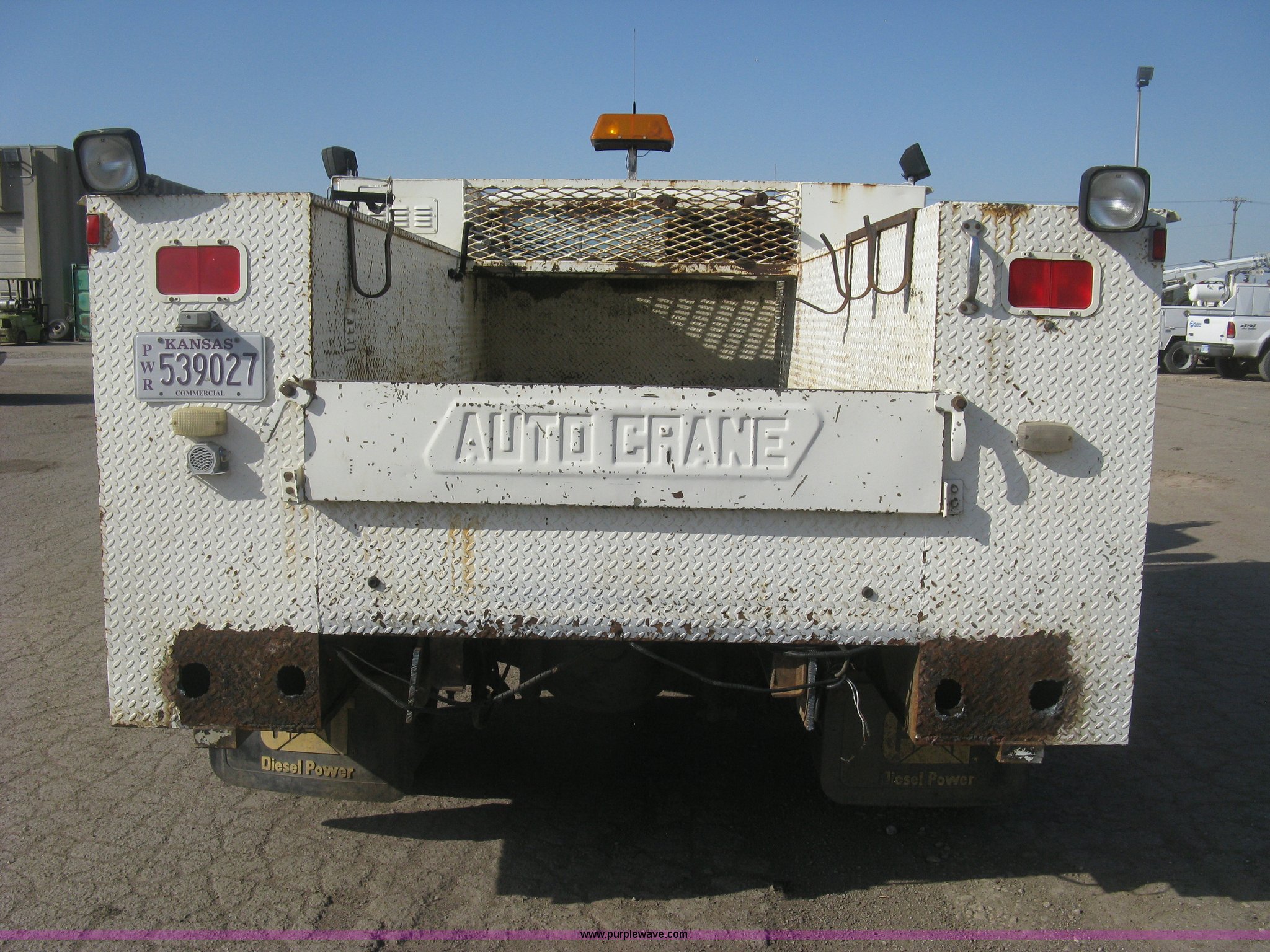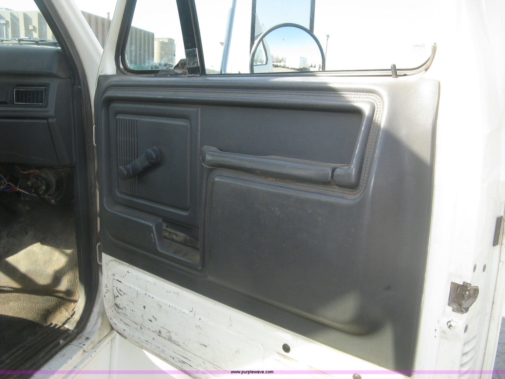 Purple Wave is selling a used Service Truck in Kansas. This item is a 1994 Ford F700 service truck with the following: 385,268 miles on odometer, Cummins 5.9L L6 diesel engine, Five speed manual transmission, Two speed rear end, AC and heat, AM/FM/cassette, Manual windows and locks, Vinyl interior, Autocrane service bed, 11'L x 94"W, Diamond plate floor, (8) side compartments, Work lights, 50 gallon fuel tank, 171" wheelbase, 255/70R22.5 front tires, 9R22.5 rear tires, GVWR 24,200 lbs, Windshield chipped, Unit# LTT10