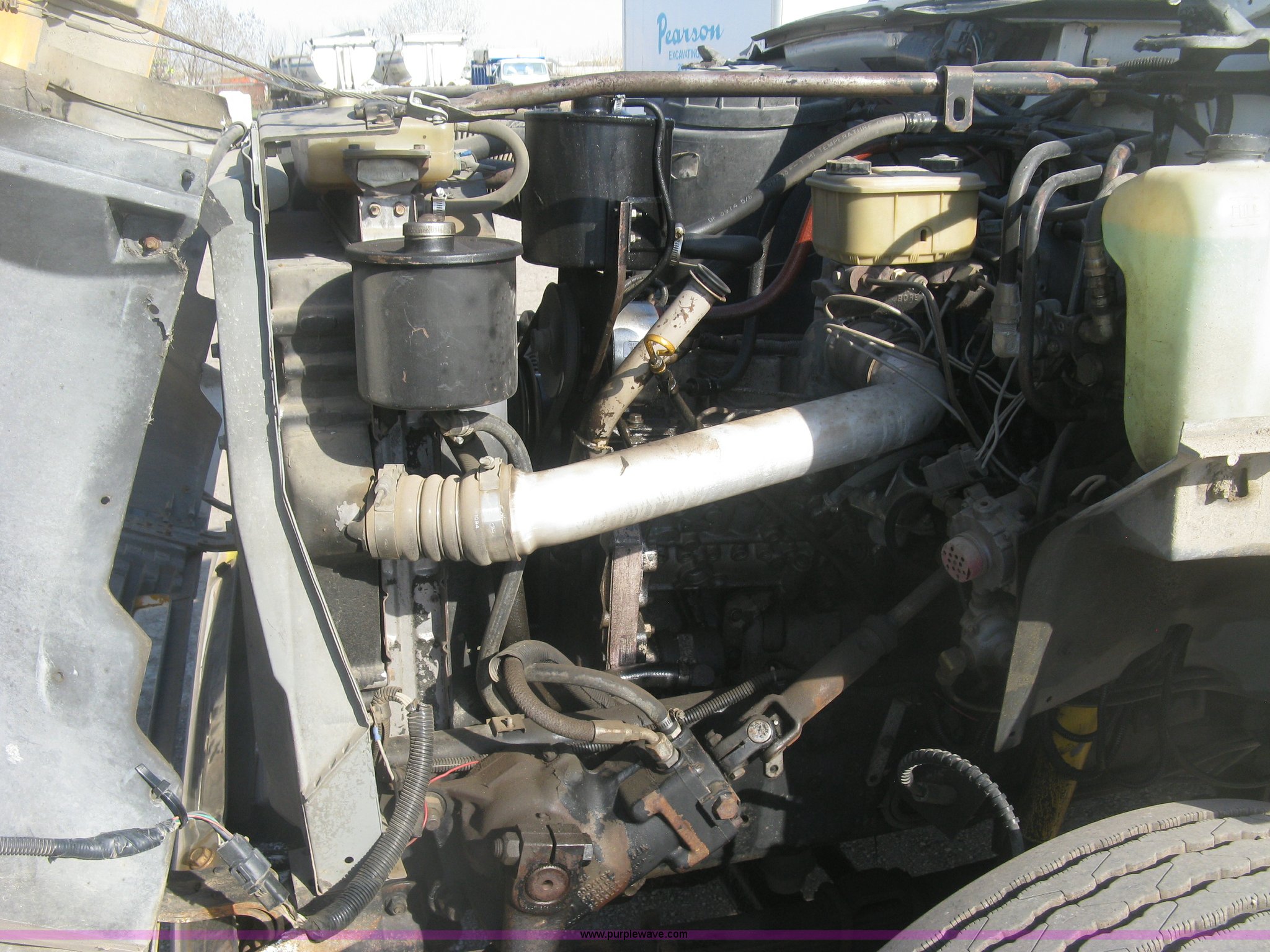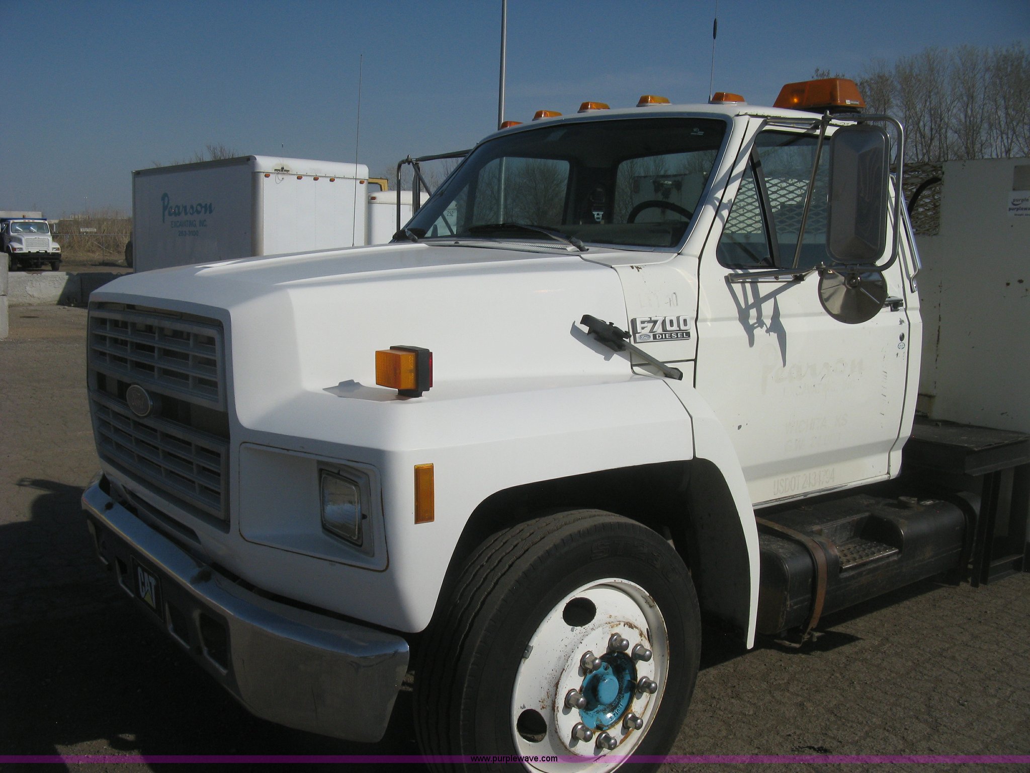 1994 Ford F700 service truck. 385,268 miles on odometer, Cummins 5.9L L6 diesel engine, Five speed manual transmission, Two speed rear end, AC and heat, AM/FM/cassette, Manual windows and locks, Vinyl interior, Autocrane service bed 11'L x 94"W, Diamond plate floor, (8) side compartments, Work lights, 50 gallon fuel tank, 171" wheelbase, 255/70R22.5 front tires, 9R22.5 rear tires, GVWR 24,200 lbs, Windshield chipped, Unit# LTT10. 1FDNK72CXRVA43823. Pearson Construction. 821 E 25th Street North. Wichita, KS 67219