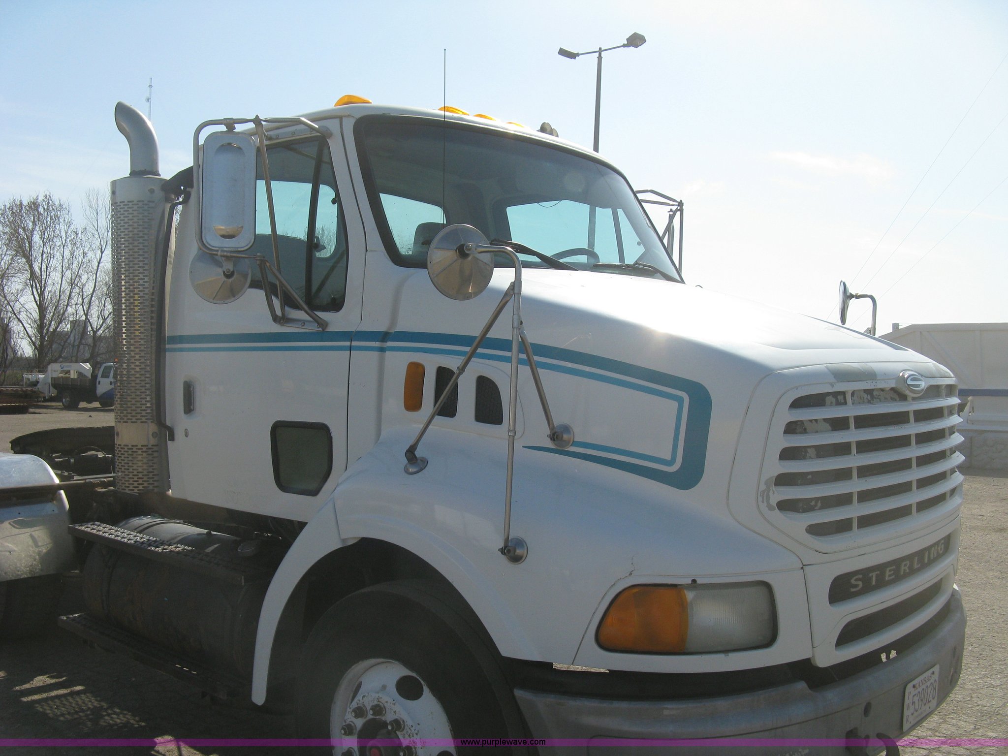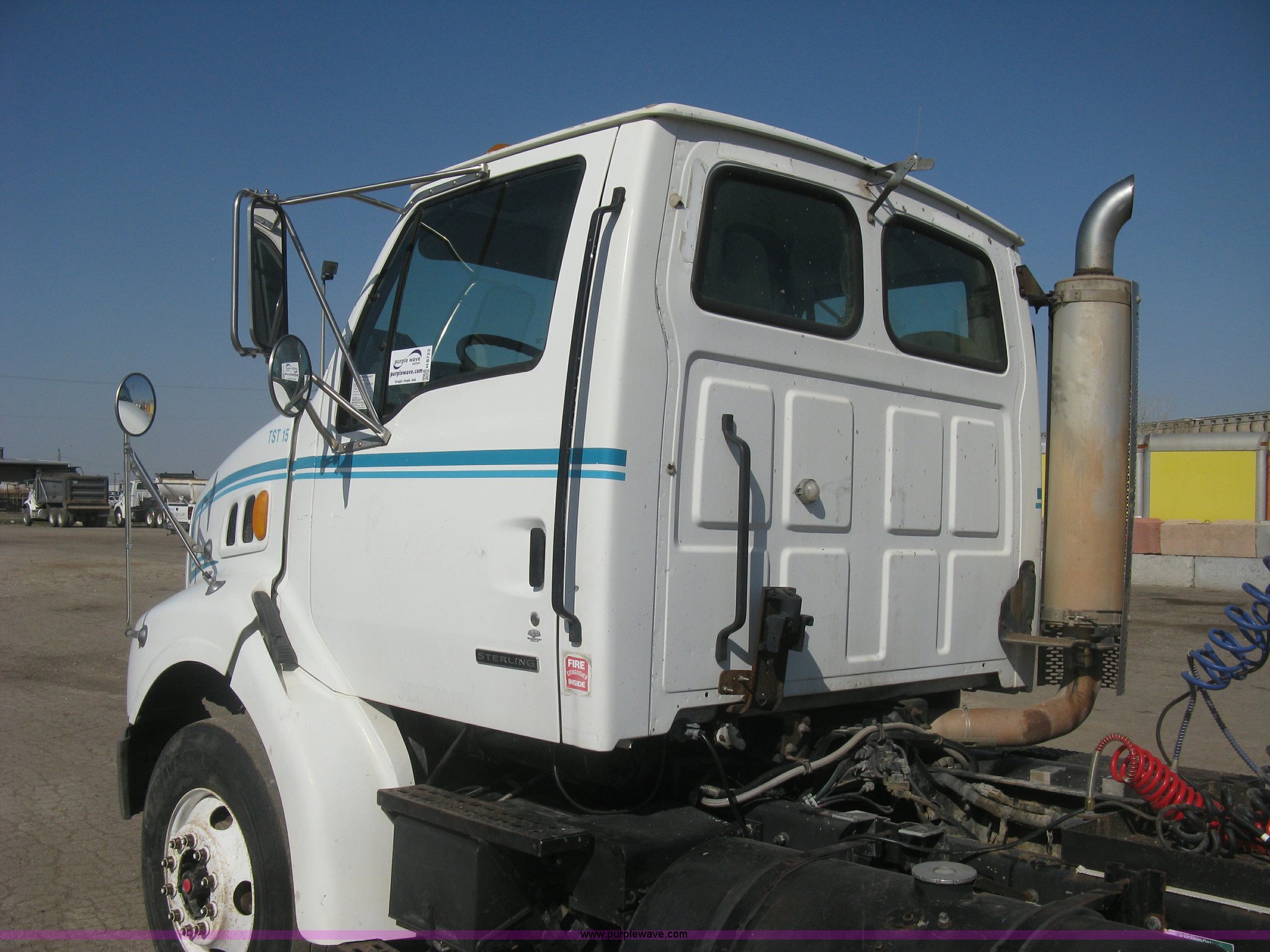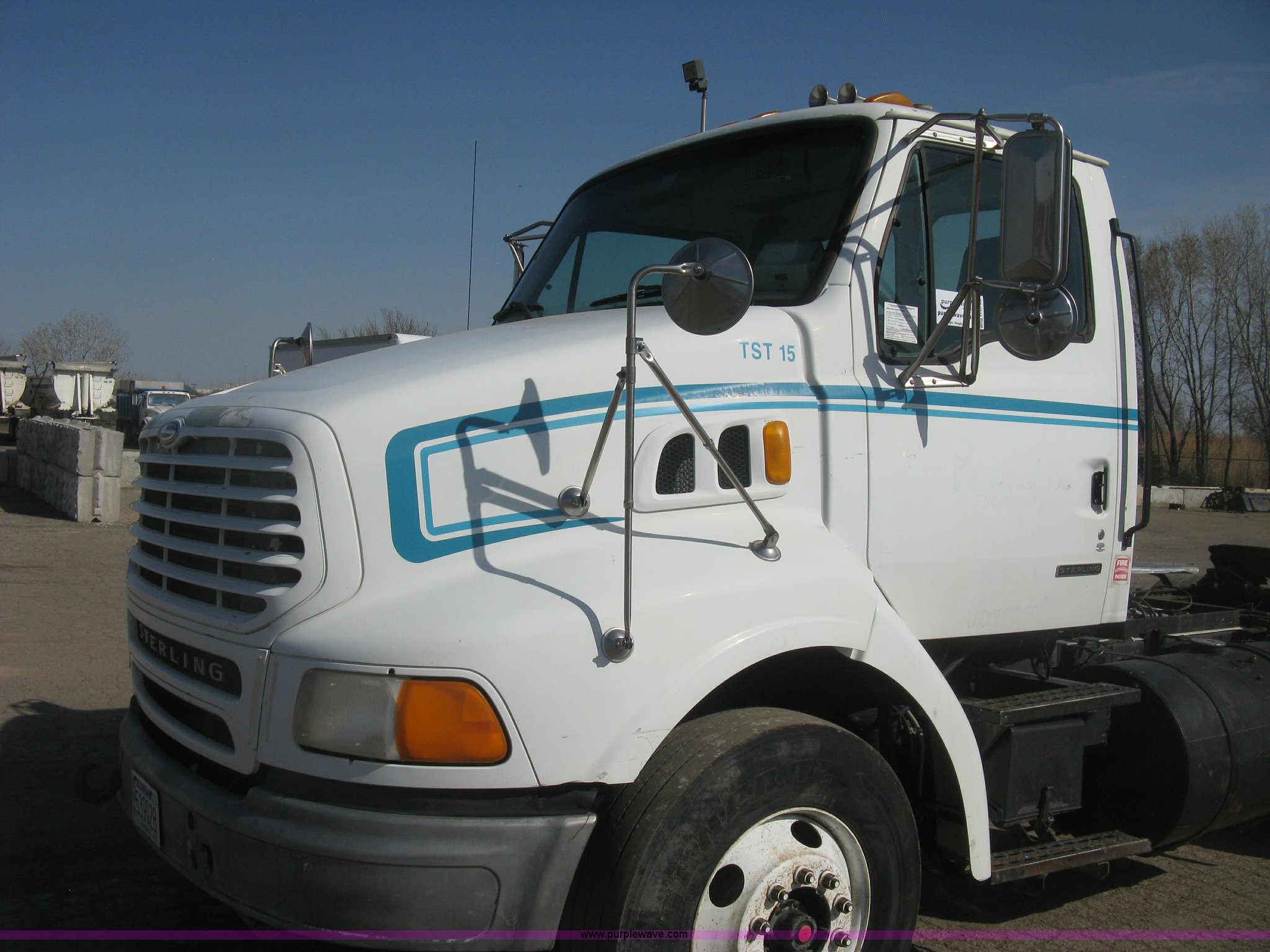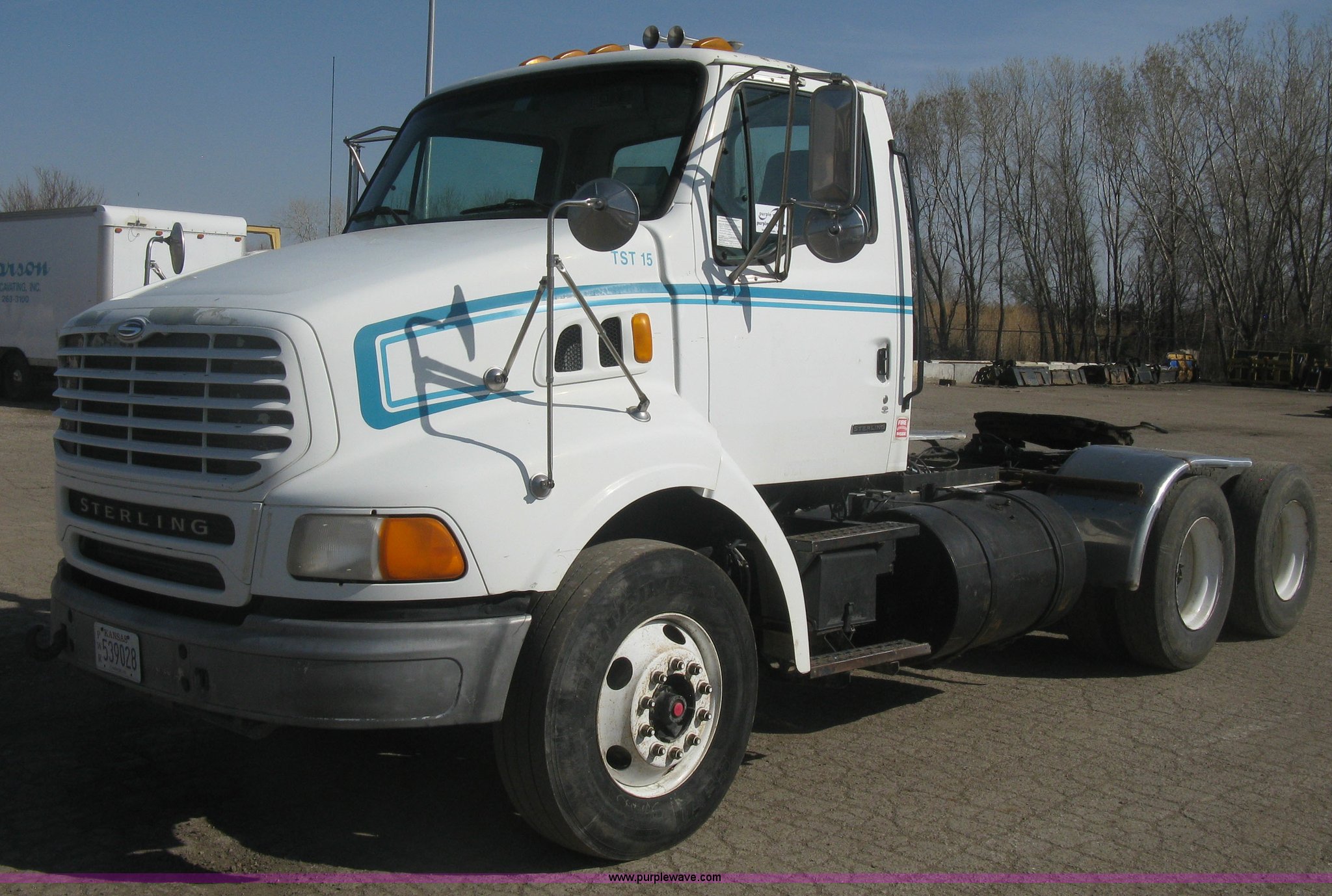 Purple Wave is selling a used Truck Tractor in Kansas. This item is a 2001 Sterling semi truck with the following: 291,029 miles on odometer, Caterpillar 14.6L L6 diesel engine, Eaton Fuller Road Ranger 10 speed manual transmission, Twin screw, Locking differential, AC and heat, Cruise, AM/FM, Passenger daylight door, Air suspension seat, Air slide fifth wheel plate, Stainless steel half fenders, Steel deck plate, Single exhaust stack, Air suspension, Air brakes, Jake brake, Trailer brake controller, 182" wheelbase, 11R22.5 tires, GVWR 52,000 lbs, FAWR 12,000 lbs, IAWR 20,000 lbs, RAWR 20,000 lbs, Scratches and dents, Engine uses oil, Unit# TST15