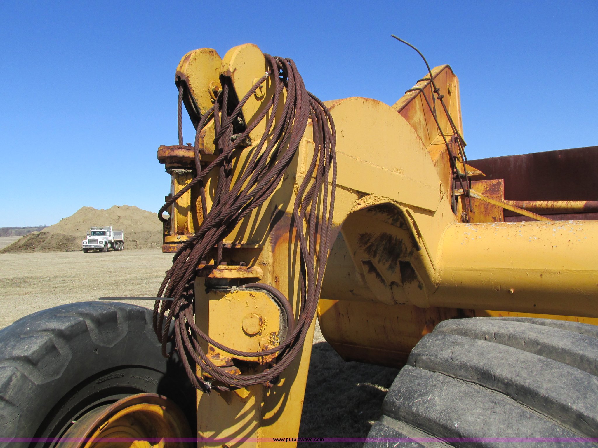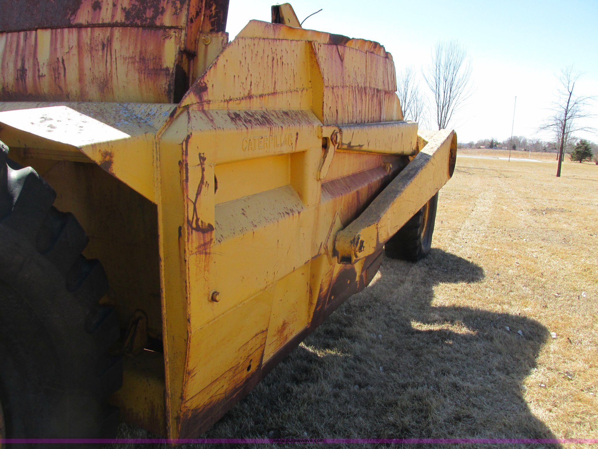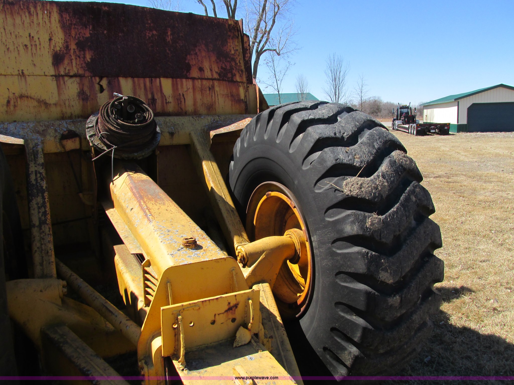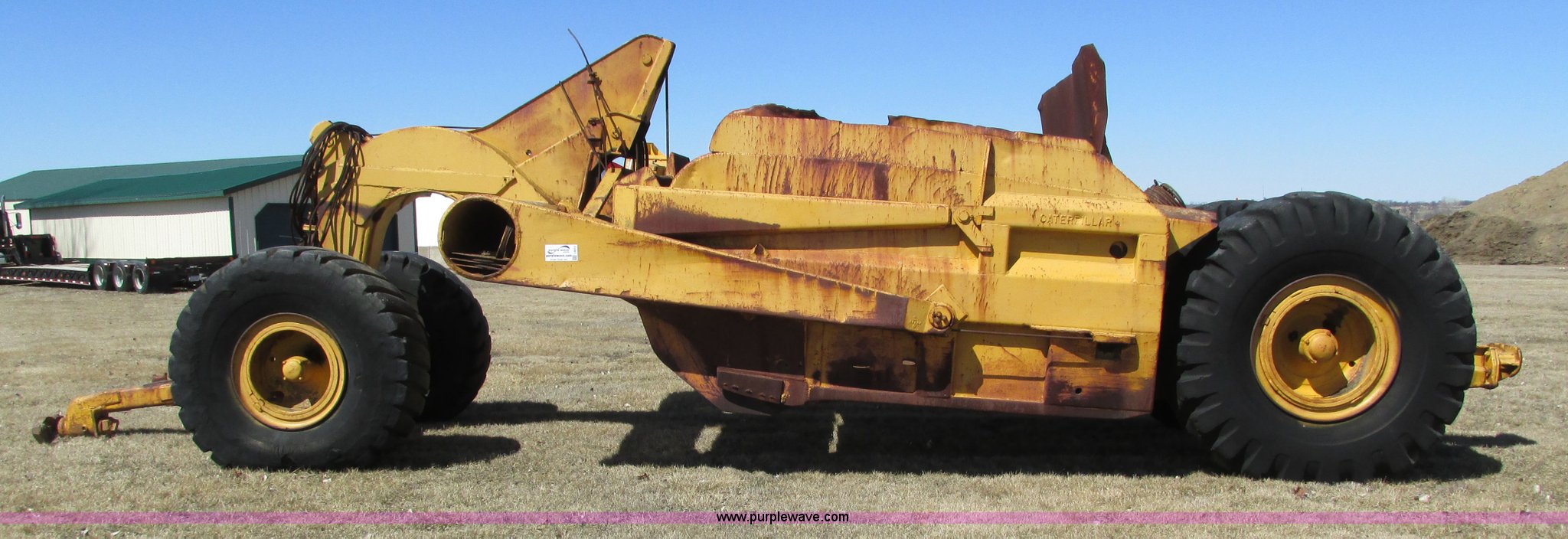 Purple Wave is selling a used Pull Type Scraper in Iowa. This item is a Caterpillar 80 pull scraper with the following: 11'2"W, 9' cutting capacity, 13.5 cubic yard struck capacity, 18 cubic yard heaped capacity, 21.00-25 left front tire, 18.00-25 right front tire, 24.00-29 rear tires, Unknown operating condition, Serial 2D2023