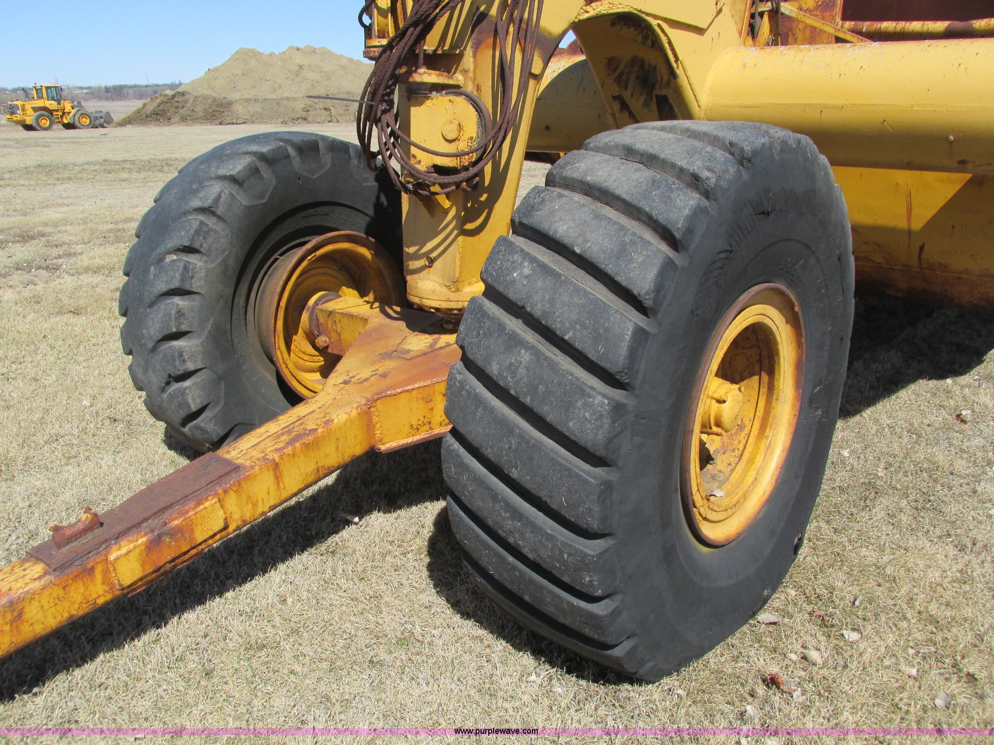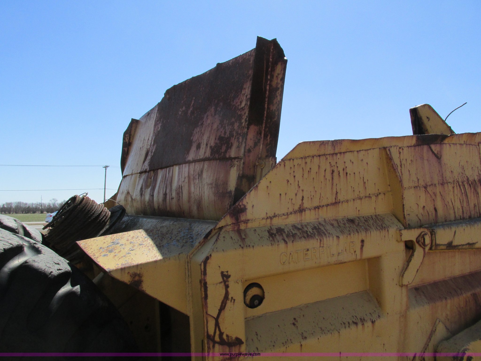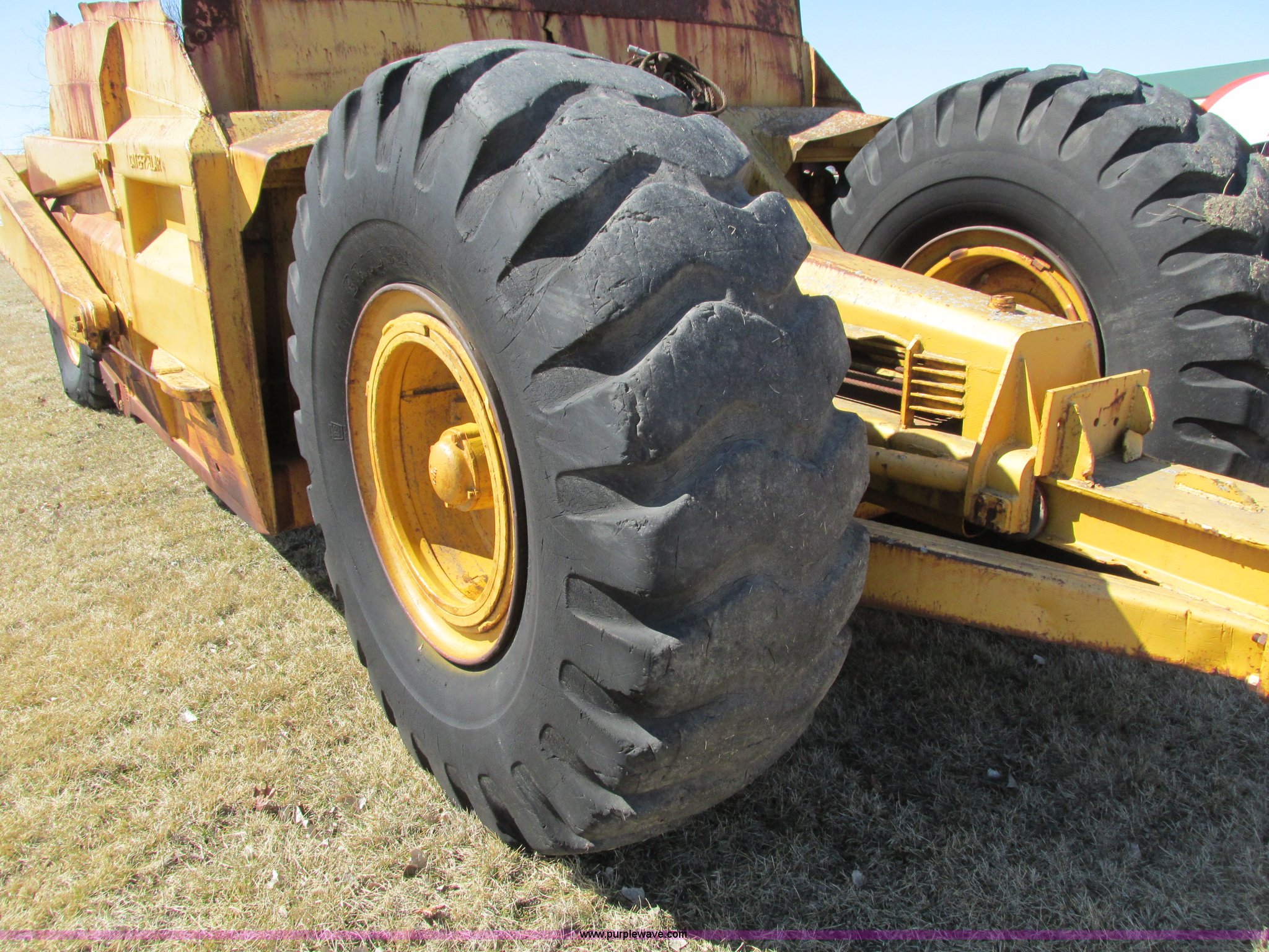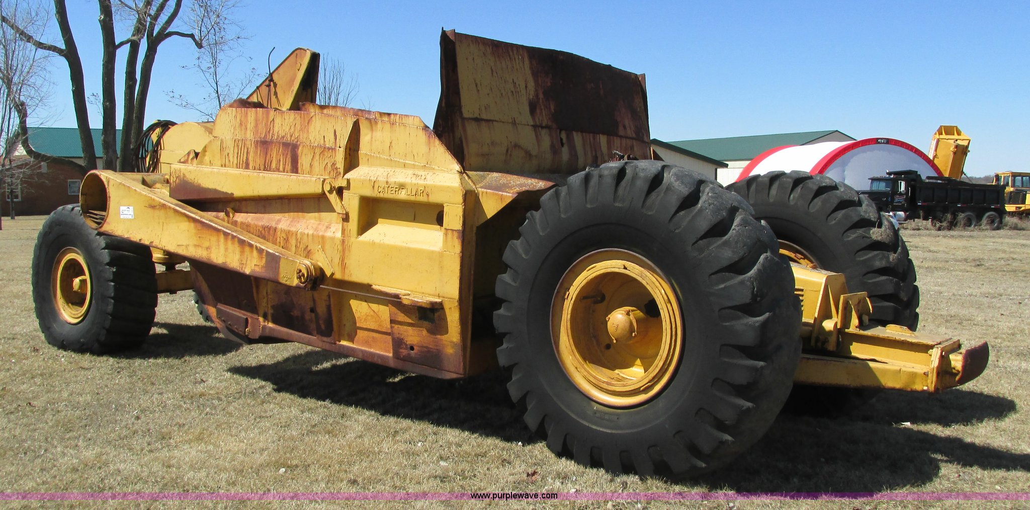 Purple Wave is selling a used Pull Type Scraper in Iowa. This item is a Caterpillar 80 pull scraper with the following: 11'2"W, 9' cutting capacity, 13.5 cubic yard struck capacity, 18 cubic yard heaped capacity, 21.00-25 left front tire, 18.00-25 right front tire, 24.00-29 rear tires, Unknown operating condition, Serial 2D2023