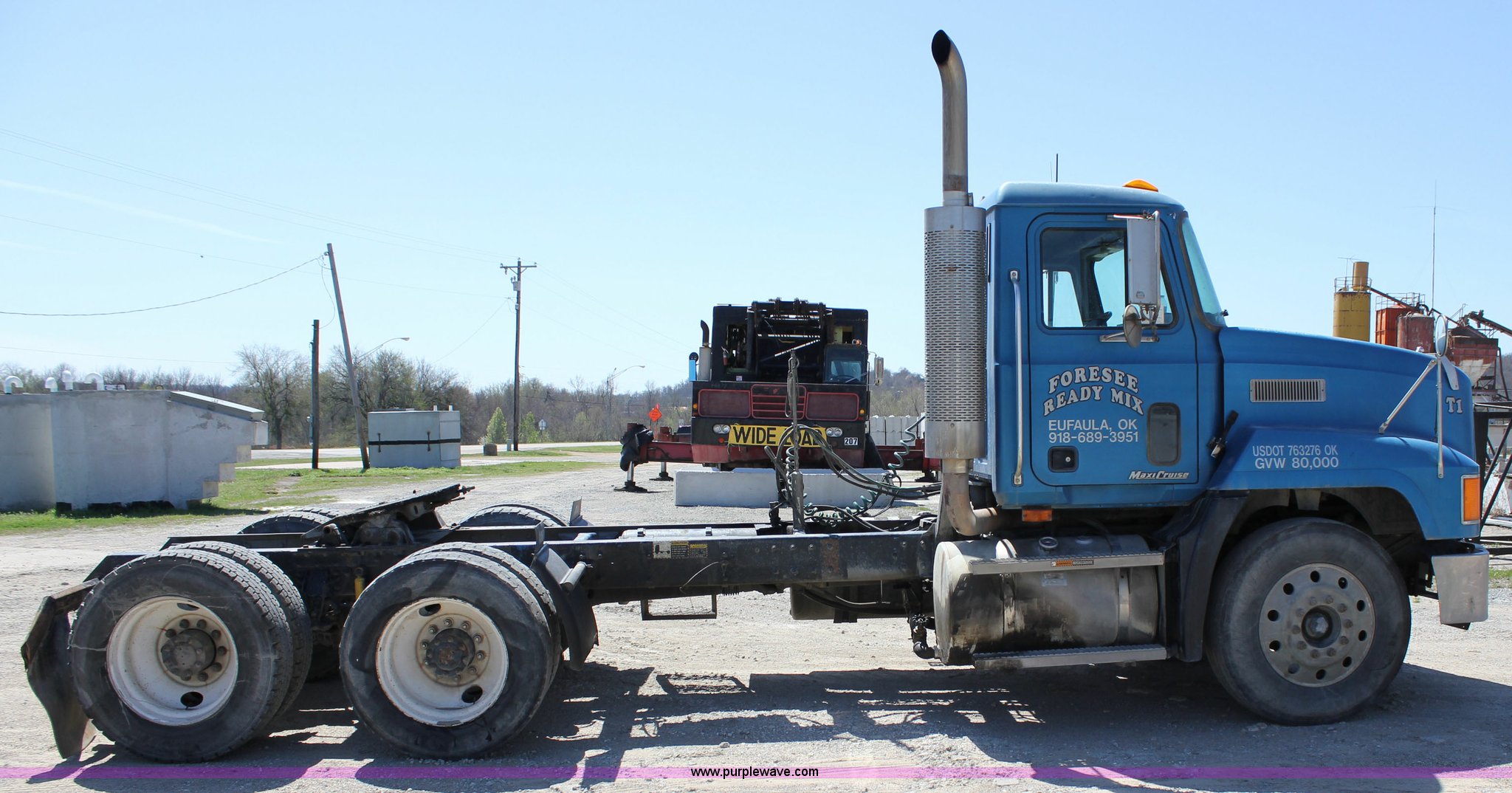 1999 Mack CH613 semi truck. 622,404 actual miles , Mack E7 12.0L L6 diesel engine, Eaton Fuller Maxi-torque 10 speed manual transmission, AC and heat, Tilt, AM/FM/CD, Passenger daylight door, Telescoping steering wheel, Air suspension seat, Heated mirrors, Chrome bumper, Block heater, Rear work light, Tow hooks, Quarter fenders, Dual fuel tanks, Air suspension , Air brakes, 11R24.5 tires, GVWR 80,000 lbs, Unit# T1. 1M1AA13Y1XW101726. View equipment video. Foresee Ready Mix. 710 S. Main Street. Eufaula, OK 74432