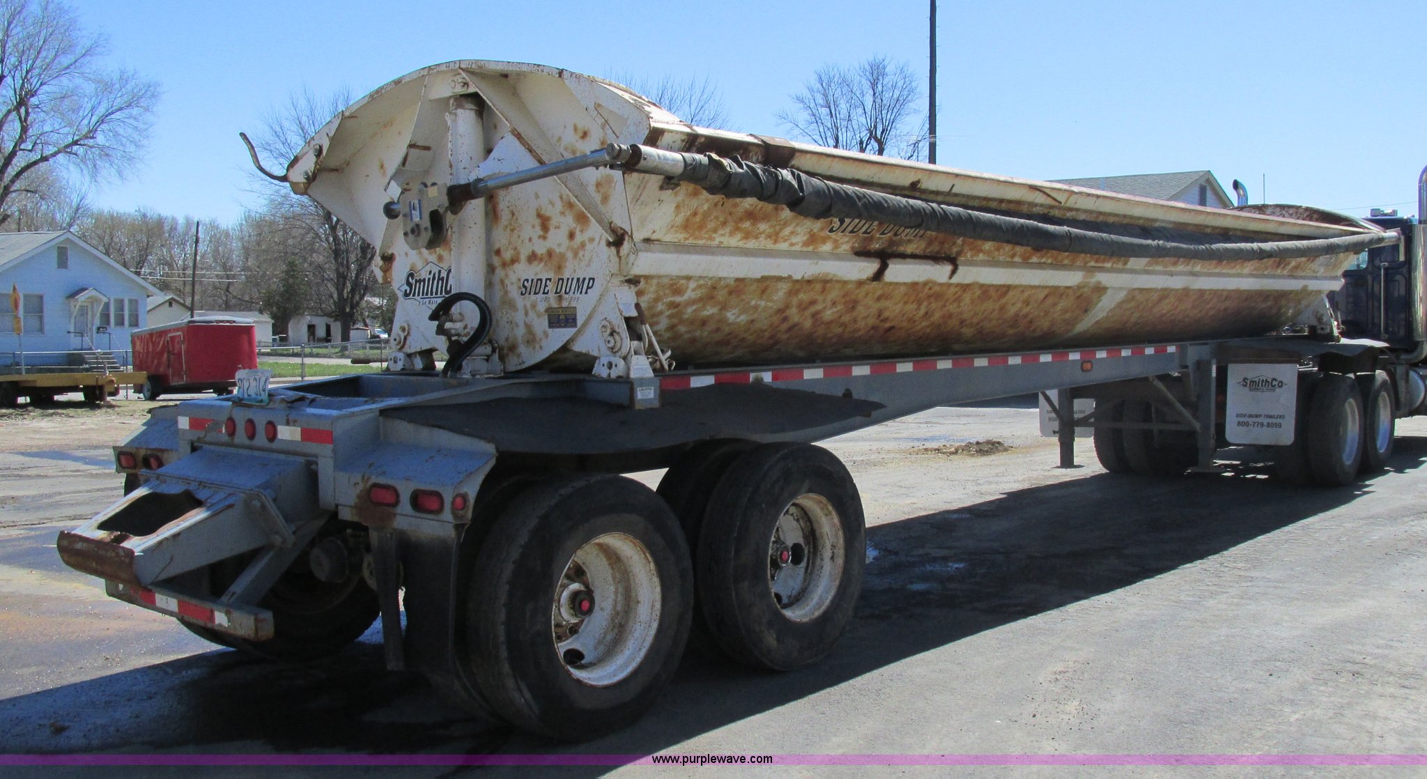 Purple Wave is selling a used Dump Trailer in Missouri. This item is a 2000 Smith side dump trailer with the following: 34'L tub, 39.5' overall length, Left or right dump, Electric roll-over tarp, Dual leg landing gears, Spring suspension, Air brakes, 11R22.5 tires, GVWR 74,320 lbs