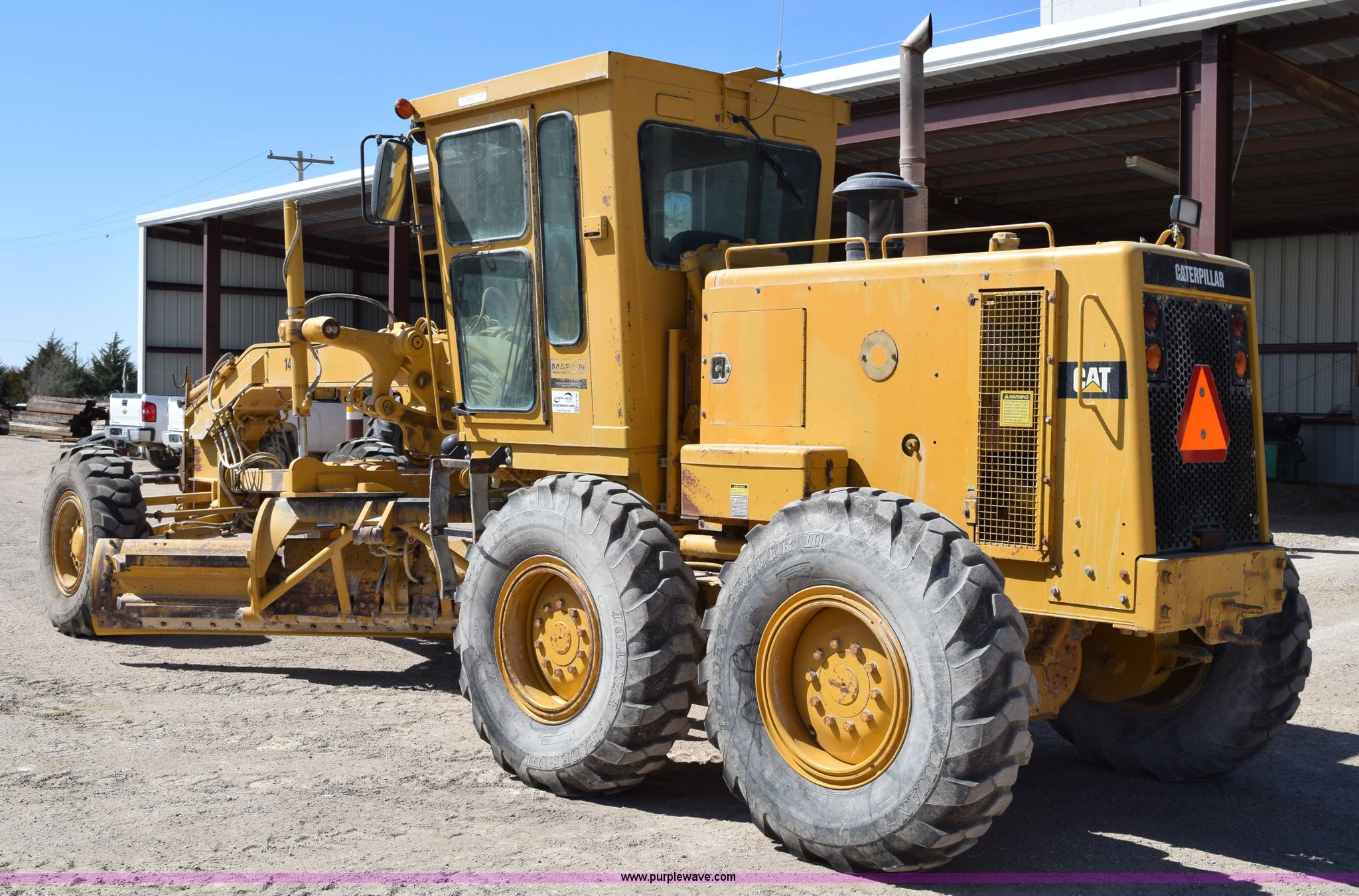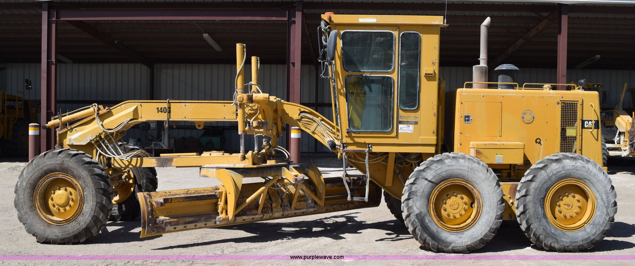 Purple Wave is selling a used Motor Grader in Kansas. This item is a 1991 Caterpillar 140G motor grader with the following: 13,013 hours on meter, Caterpillar 3306 six cylinder diesel engine, Ether start aid, Powershift transmission, 6F-6R gears, Locking differential, Enclosed cab, AC and heat, AM/FM, Front and rear wipers, Suspension seat, (9) control valves, 14' moldboard, Tip control, Side shift, Titan 14.00-24 tires, 29,175 lbs. base operating weight, Recently replaced battery and cutting edge, Parts and service manuals, Serial 072V13787, Unit# 31