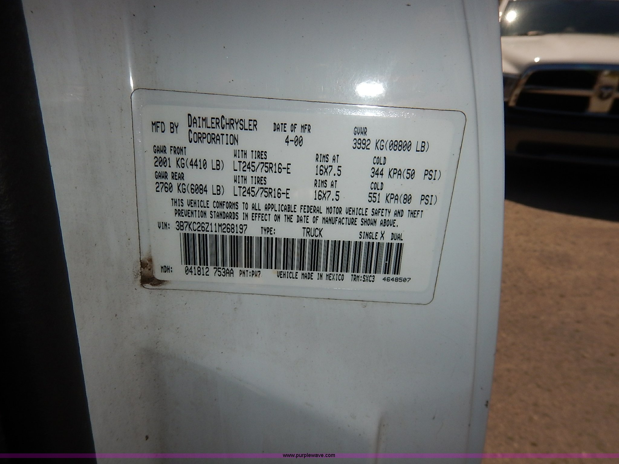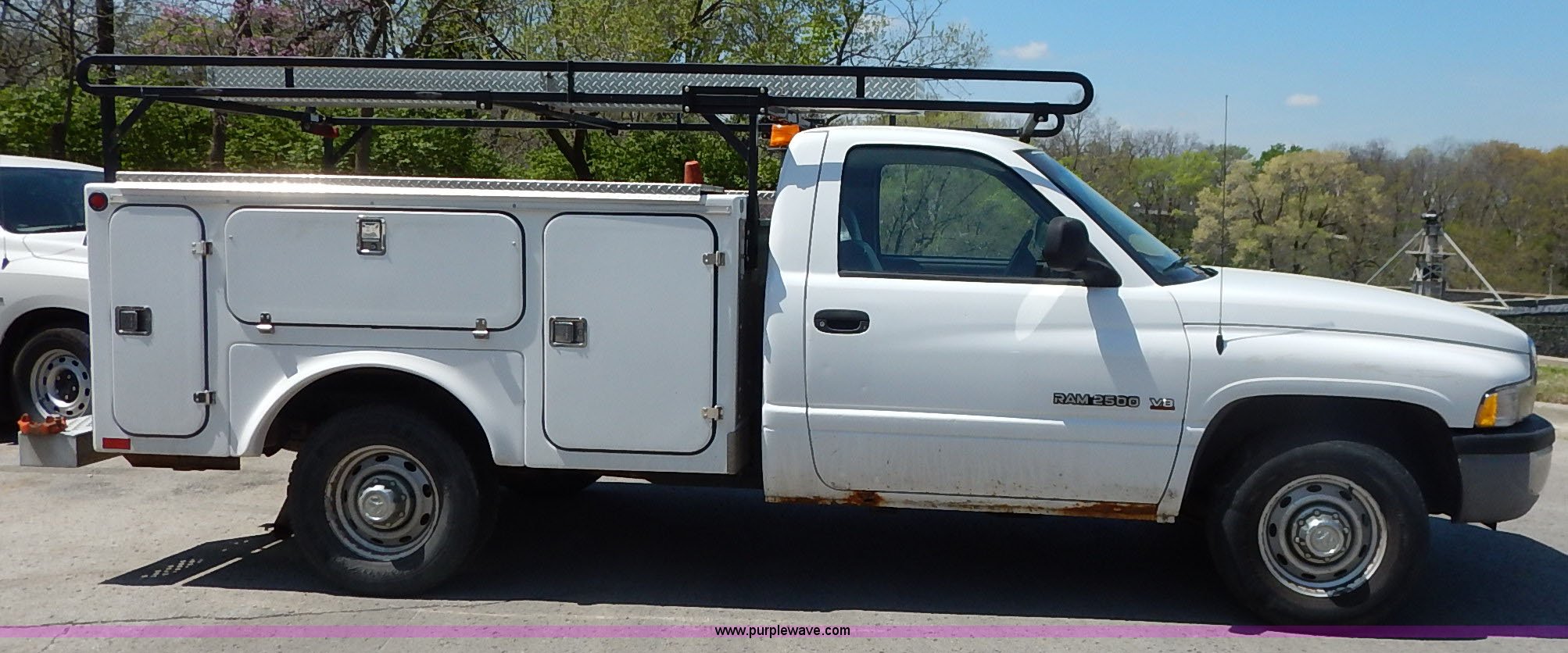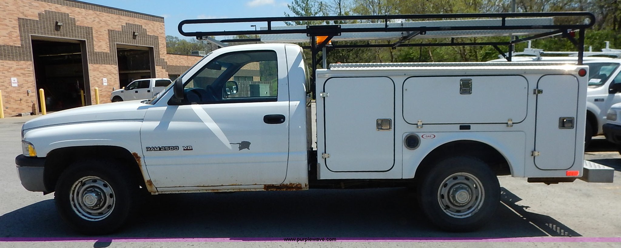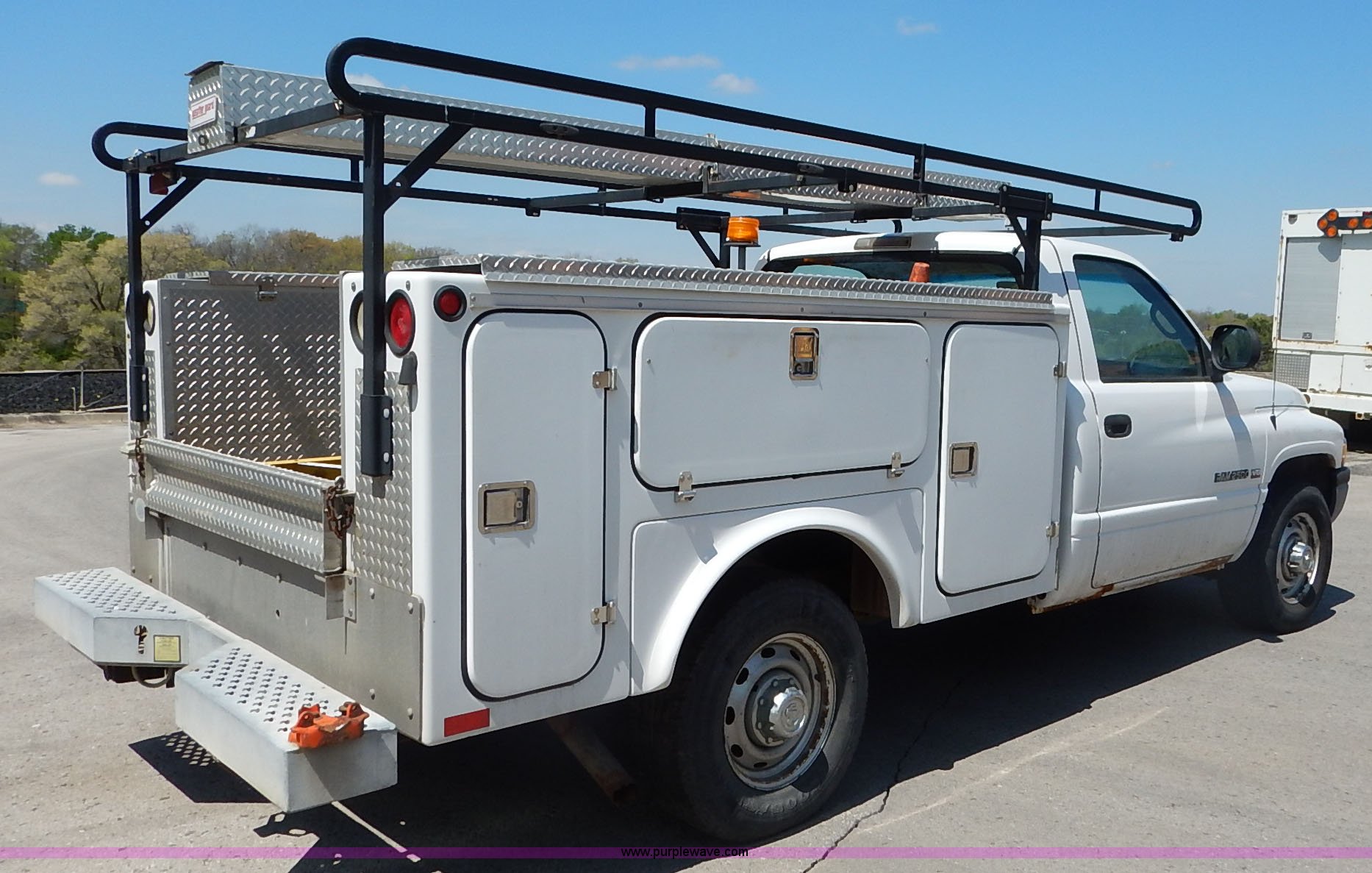 Purple Wave is selling a used Service Truck in Kansas. This item is a 2001 Dodge Ram 2500 utility truck with the following: 83,323 miles on odometer, 4,969 hours on meter, 5.9L V8 OHV 16V gas engine, Automatic transmission, AC and heat, AM/FM/cassette, Manual windows and locks, Vinyl interior, Strobe light, Fibre body bed, (8) compartments, Ladder rack, Backup alarm, Receiver hitch, Trailer wiring, 245/75R16 tires, Interior/exterior cosmetic damage, Paint peeling, Rust, Check engine light on, Contents not included, Unit# JCW6112