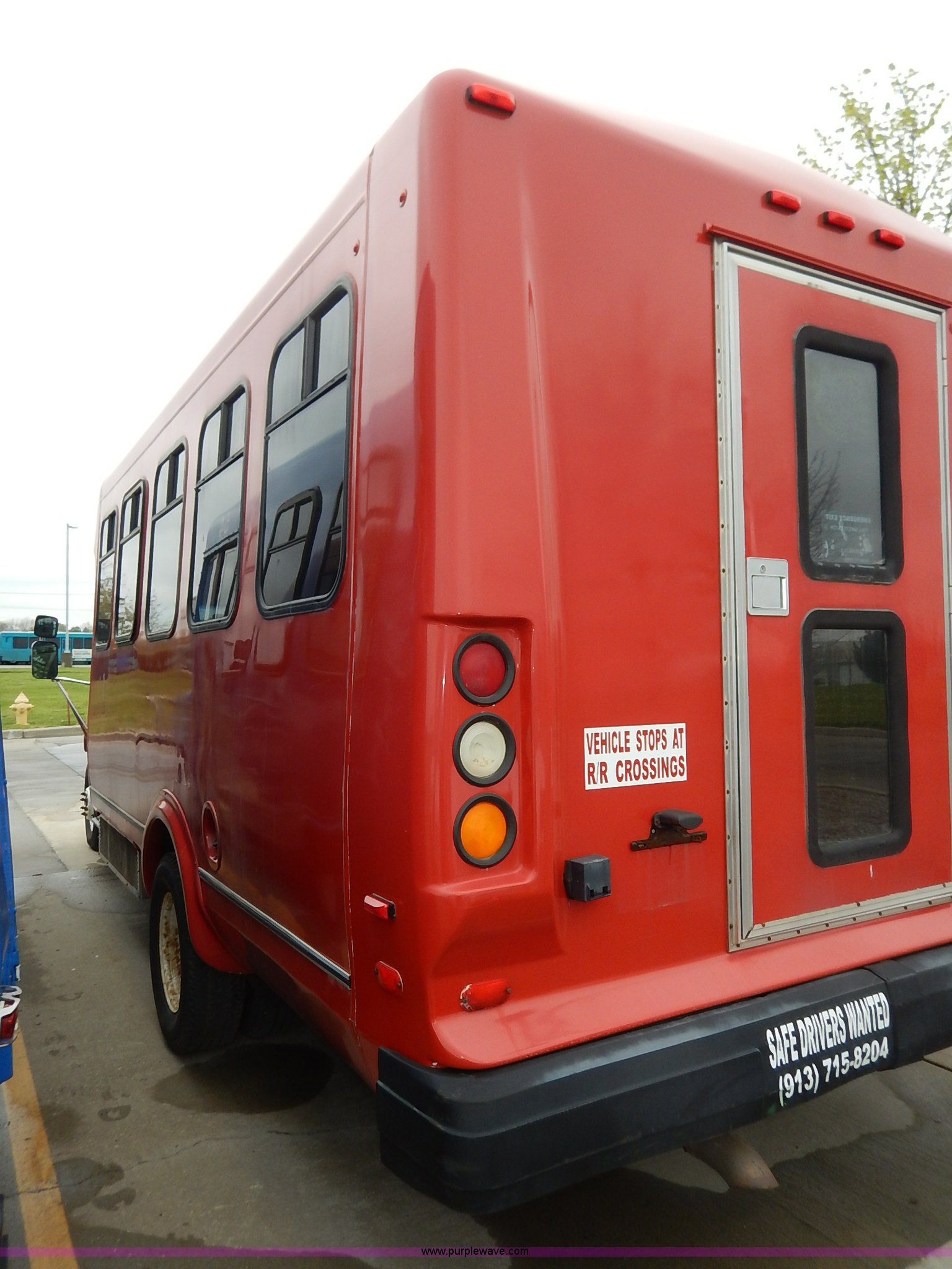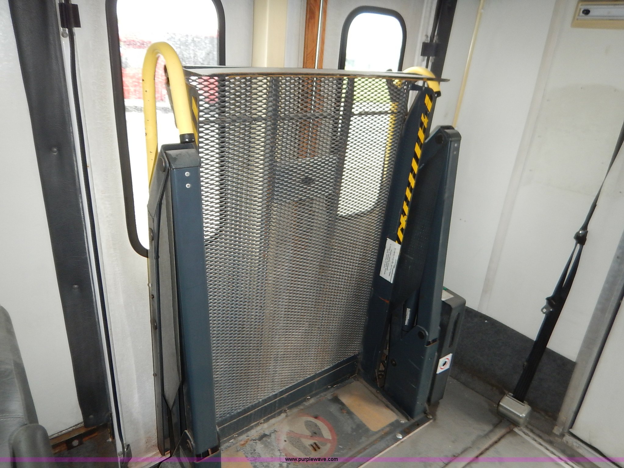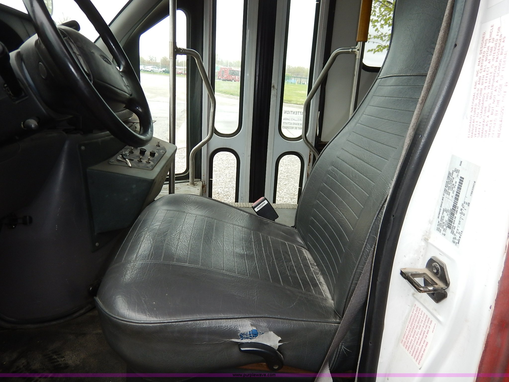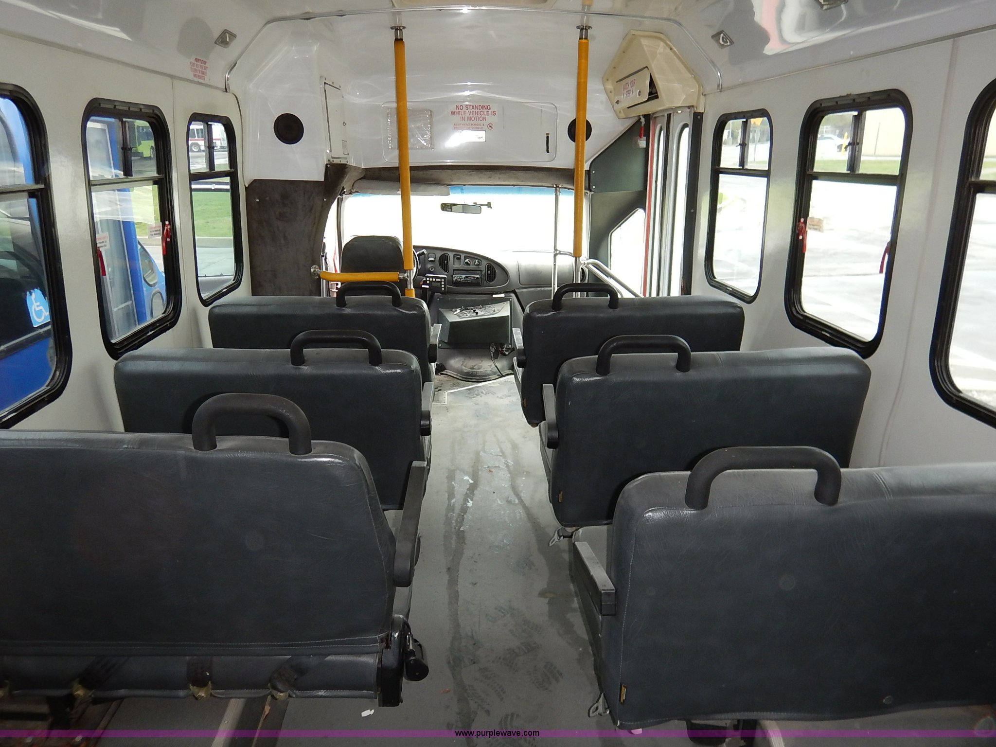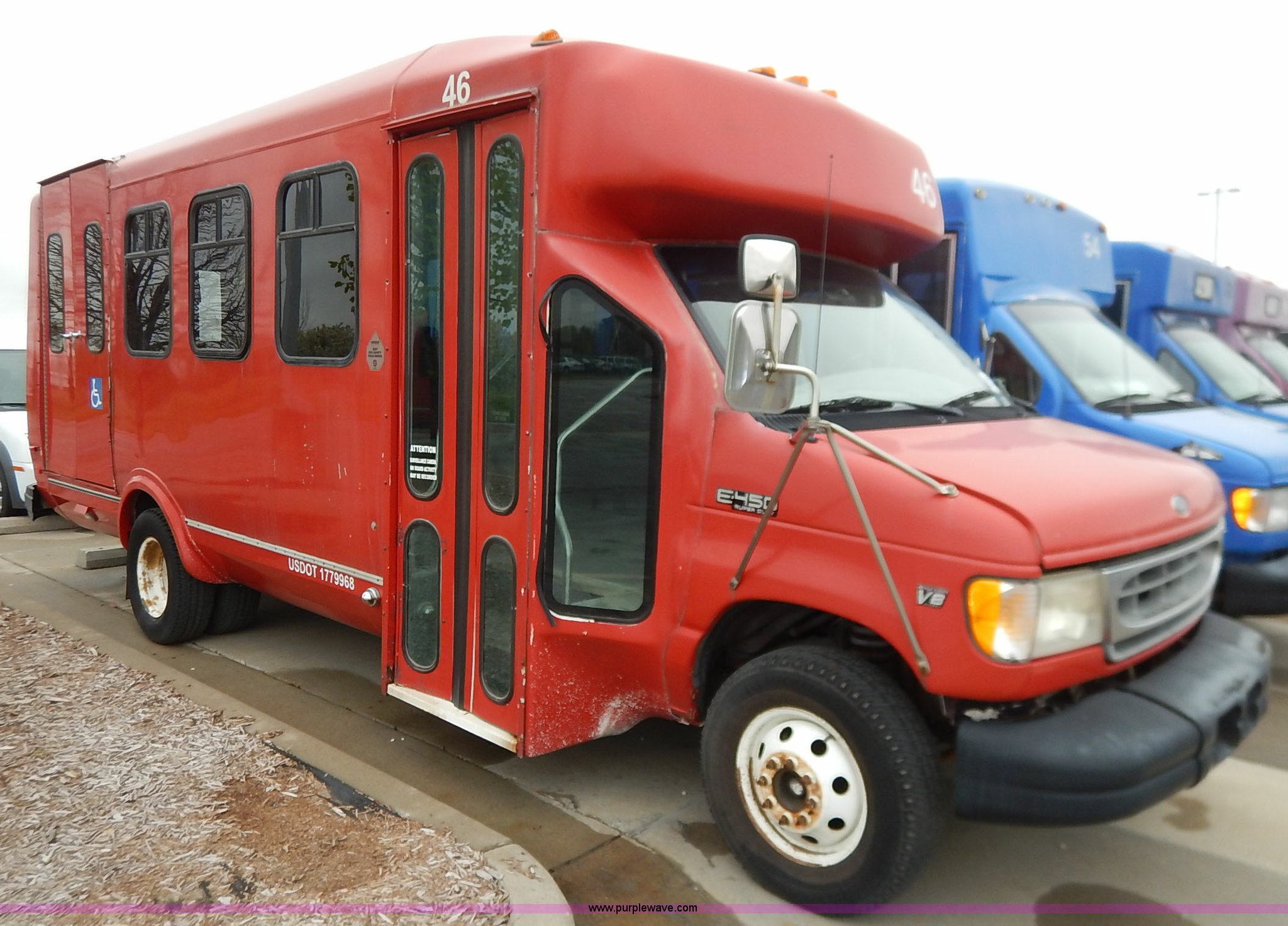 Purple Wave is selling a used Bus in Kansas. This item is a 2000 Ford 801 transit bus with the following: 207,291 miles on odometer, 7.3L V8 OHV 16V turbo diesel engine, Automatic transmission, AC and heat, Tilt, Cruise, AM/FM/cassette, Manual windows and locks, Vinyl interior, OEM radio band, 14 passenger capacity, Backup alarm, Wheel chair lift, Rear egress, 225/75R16 tires, Interior/exterior cosmetic damage, Paint chipping, Dents, Scratches, Dead battery, Unknown operating condition, Unit# TRN46