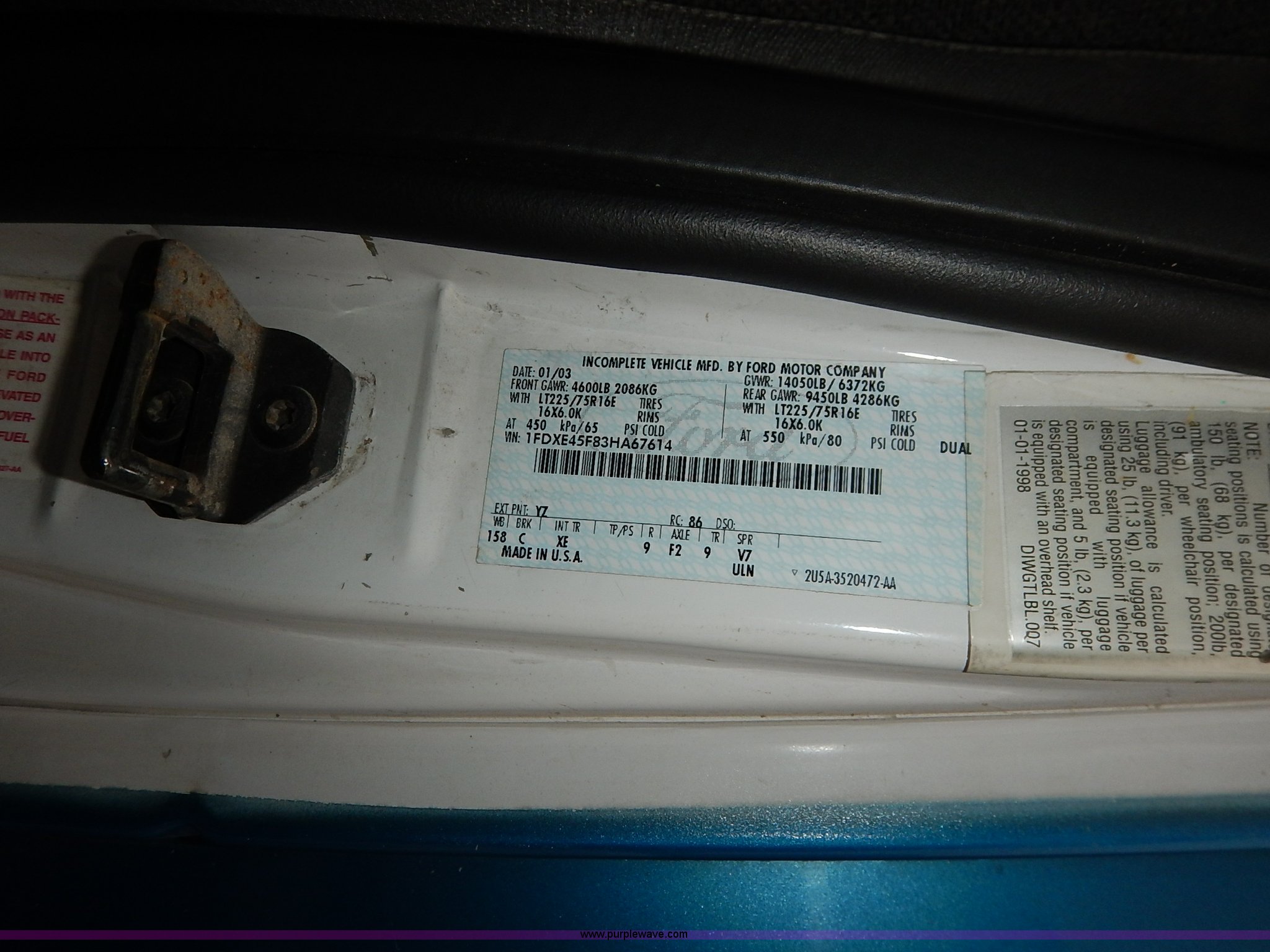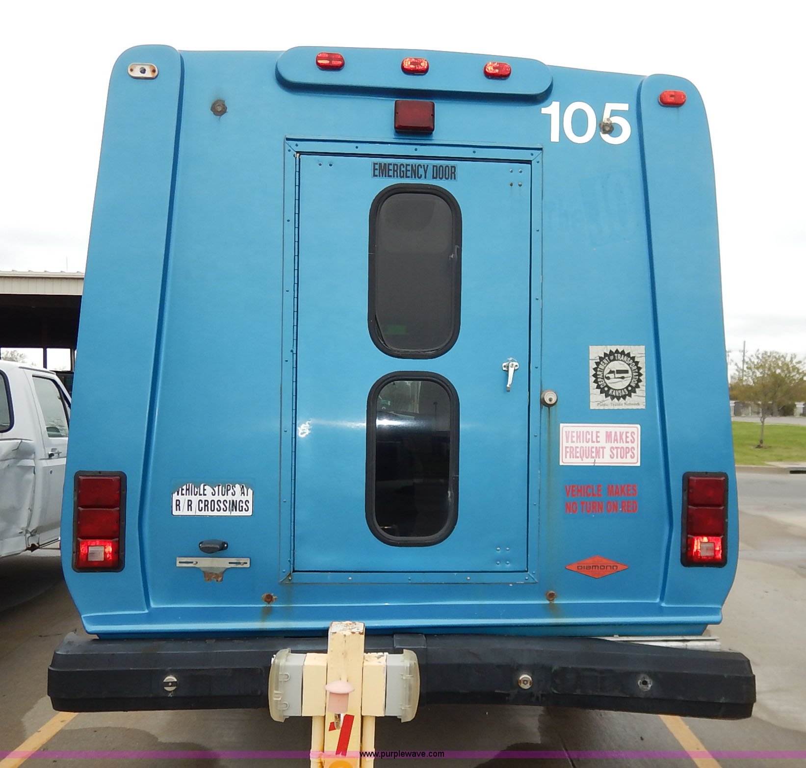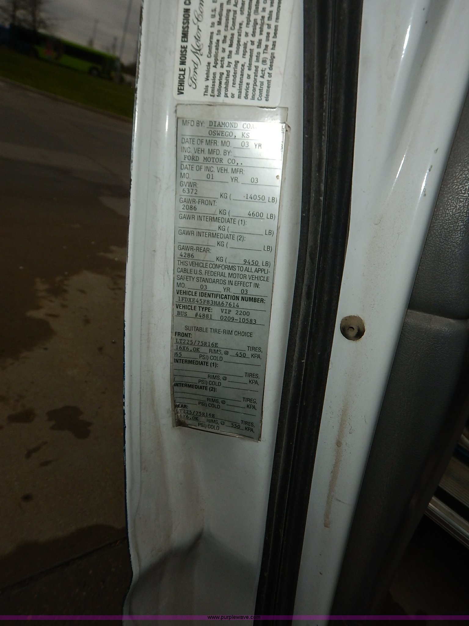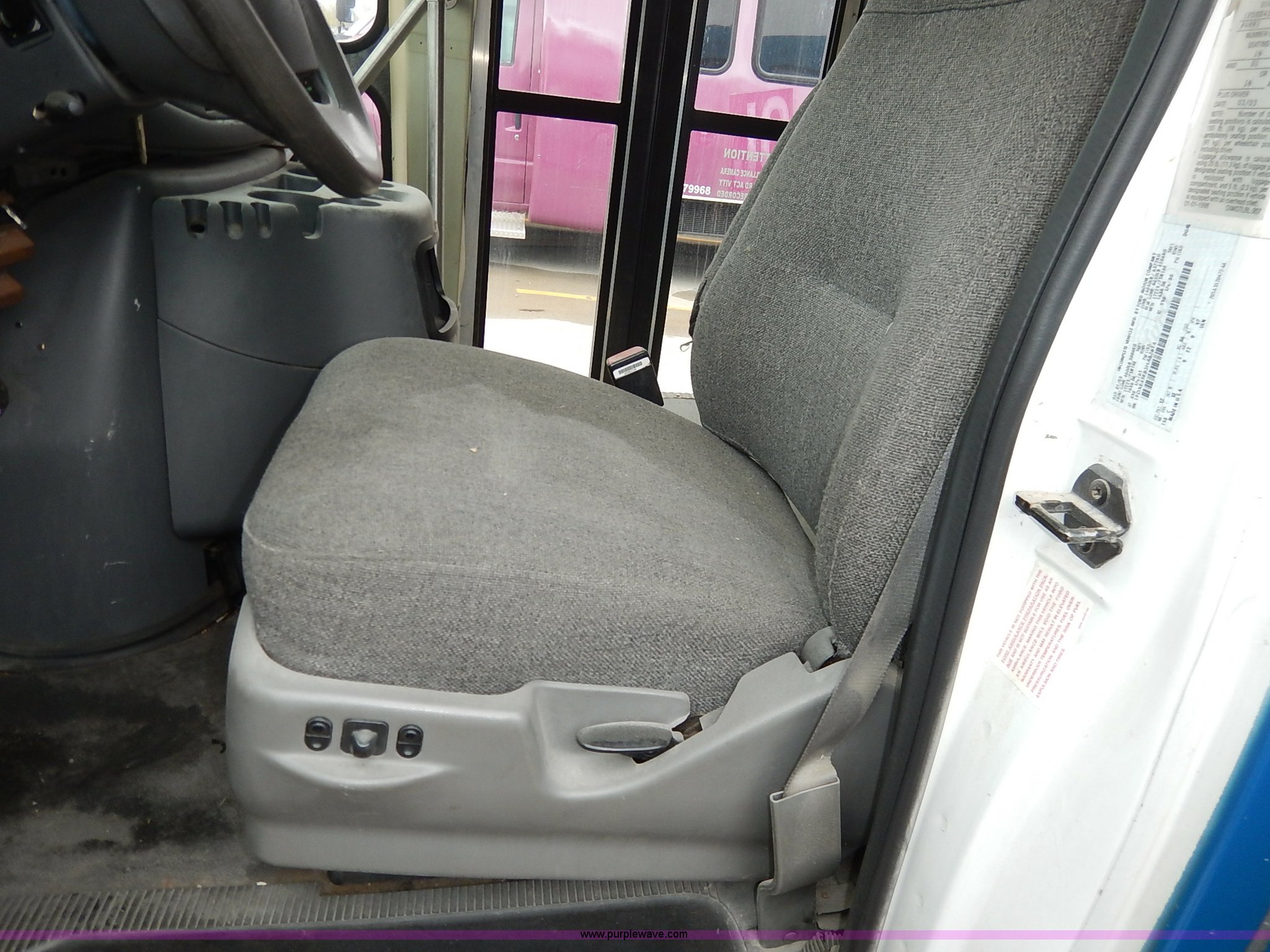 Purple Wave is selling a used Bus in Kansas. This item is a 2003 Ford 801 transit bus with the following: 313,447 miles on odometer, 7.3L V8 OHV 16V turbo diesel engine, Automatic transmission, AC and heat, Tilt, Cruise, Control buttons missing, AM/FM/cassette, Manual windows and locks, Power driver seat, Cloth driver interior, OEM radio band, 16 passenger capacity, Backup alarm, Wheelchair lift, Rear egress, 225/75R16 tires, Interior/exterior cosmetic damage, Paint chipping, Cosmetic damage to rear bumper, Driver side mirror damage, Cracked windshield, Rear view mirror missing, Lower dash panel missing, Unit# TRN105