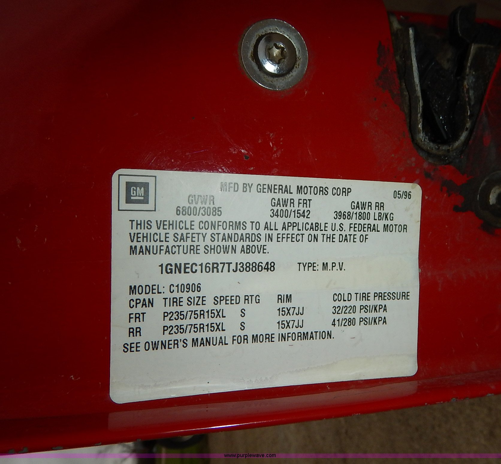 1996 Chevrolet Suburban C1500 SUV. 141,819 miles on odometer, 5.7L V8 OHV 16V gas engine, Automatic transmission, AC and heat, AM/FM, Manual windows and locks, Vinyl interior, 235/75R15 tires, Decals will be removed prior to auction, Unit# 10. 1GNEC16R7TJ388648. USD 481. 414 E Goodnow. White City, KS 66872