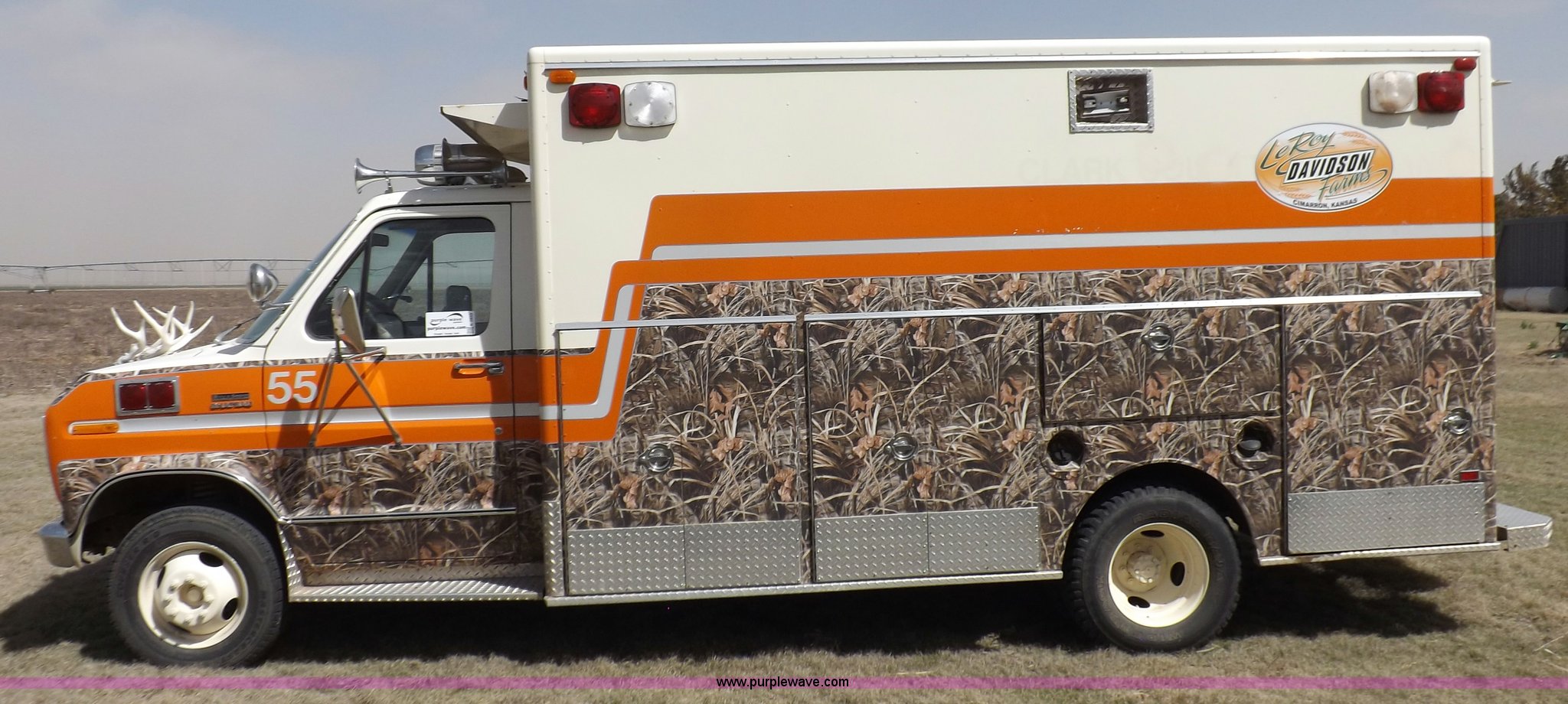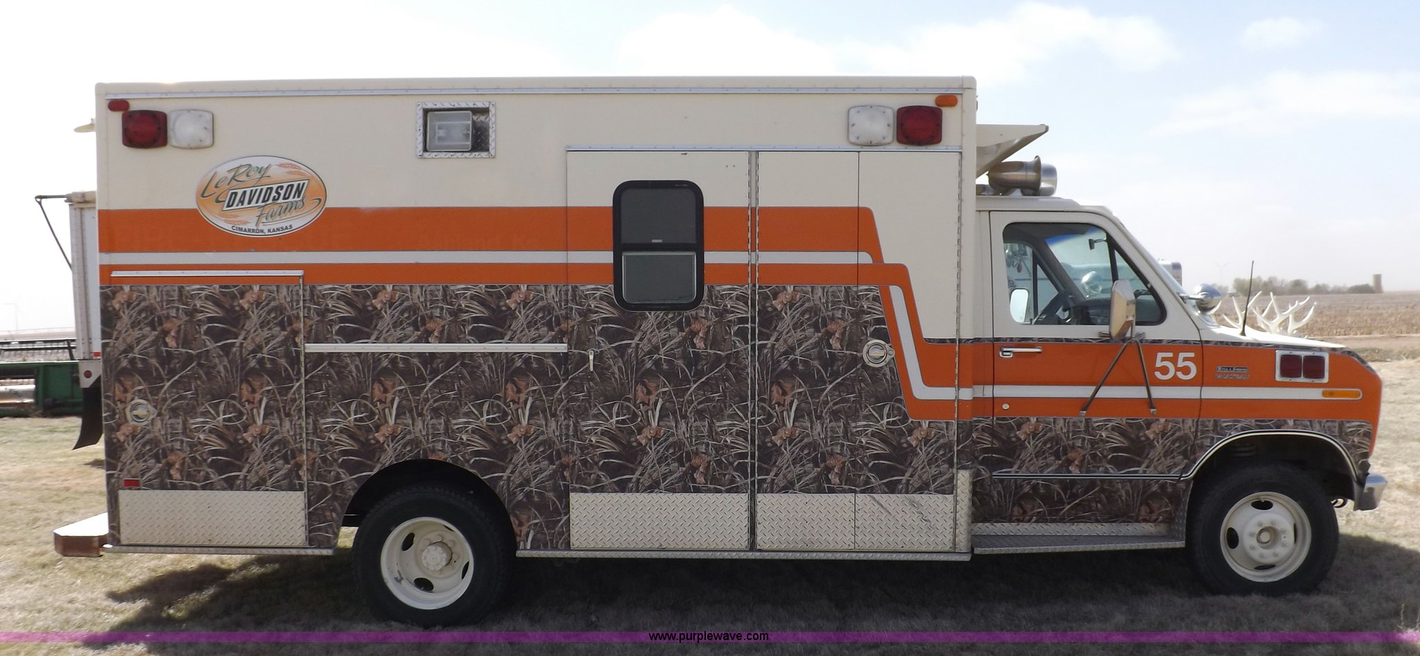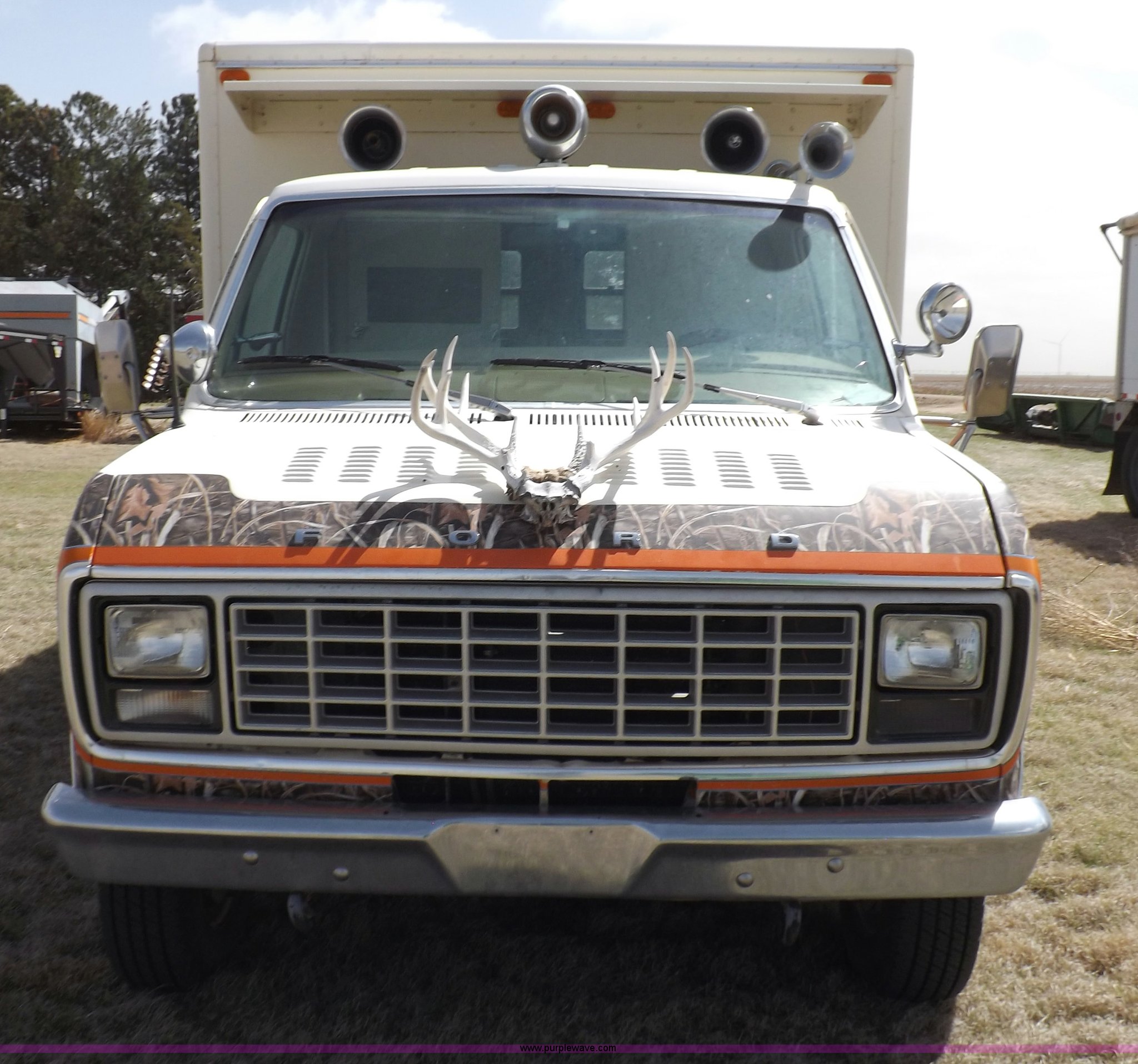 Purple Wave is selling a used Fire Truck or Emergency Vehicle in Kansas. This item is a 1980 Ford Chateau ambulance with the following: 83,133 miles on odometer, Eight cylinder gas engine, Automatic transmission, AC and heat, AM/FM/CD, Manual windows and locks, Vinyl interior, EVF ambulance body, Model M421/E37HGD5860, Dual spotlights, (6) exterior storage compartments, Vinyl interior, Master electric disconnect, Rear step, Dual fuel tanks, Receiver hitch, 158" wheelbase, 225/75R16 tires, GVWR 11,000 lbs, FAWR 3,850 lbs, RAWR 7,400 lbs, Chipped windshield