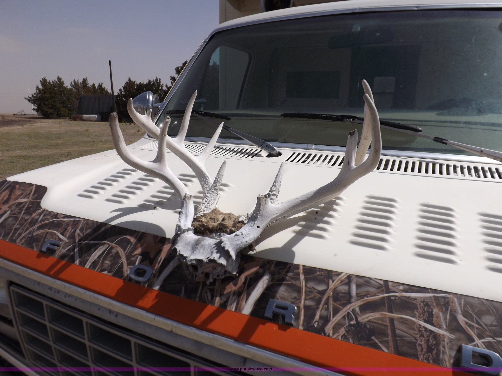 1980 Ford Chateau ambulance. 83,133 miles on odometer, Eight cylinder gas engine, Automatic transmission, AC and heat, AM/FM/CD, Manual windows and locks, Vinyl interior, EVF ambulance body Model M421/E37HGD5860, Dual spotlights, (6) exterior storage compartments, Vinyl interior, Master electric disconnect, Rear step, Dual fuel tanks, Receiver hitch, 158" wheelbase, 225/75R16 tires, GVWR 11,000 lbs, FAWR 3,850 lbs, RAWR 7,400 lbs, Chipped windshield. E37LHGD5860. Thompson Farms. 15204 G Rd. Ingalls, KS 67835