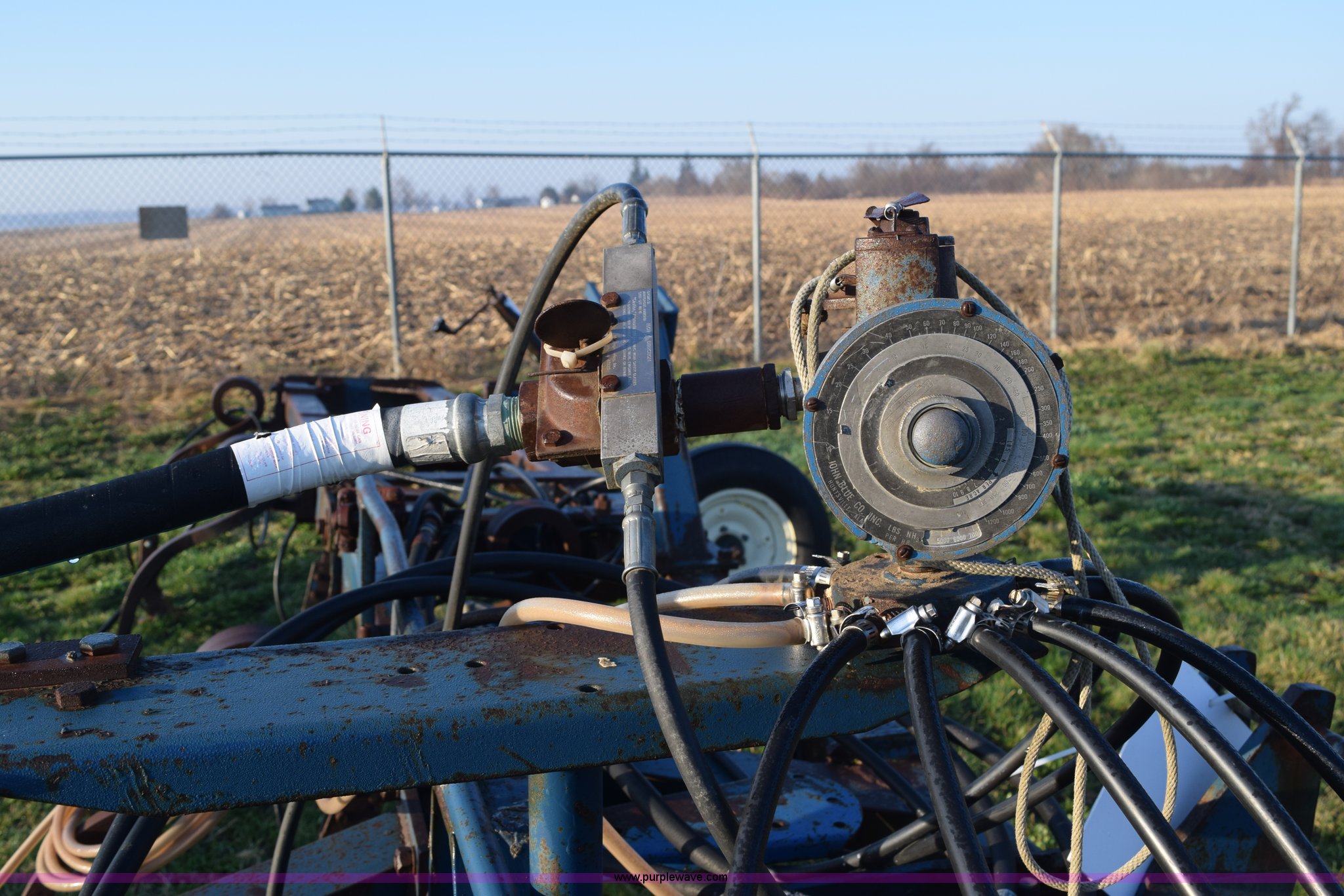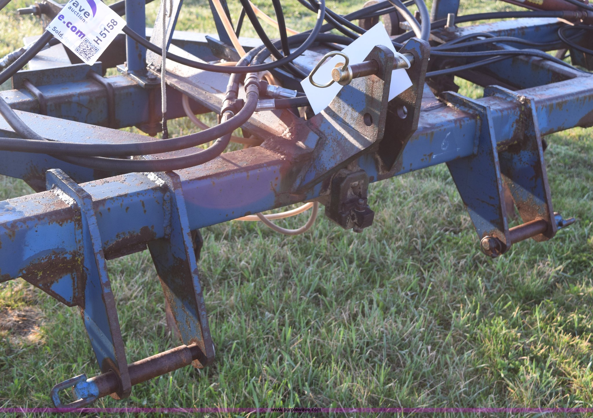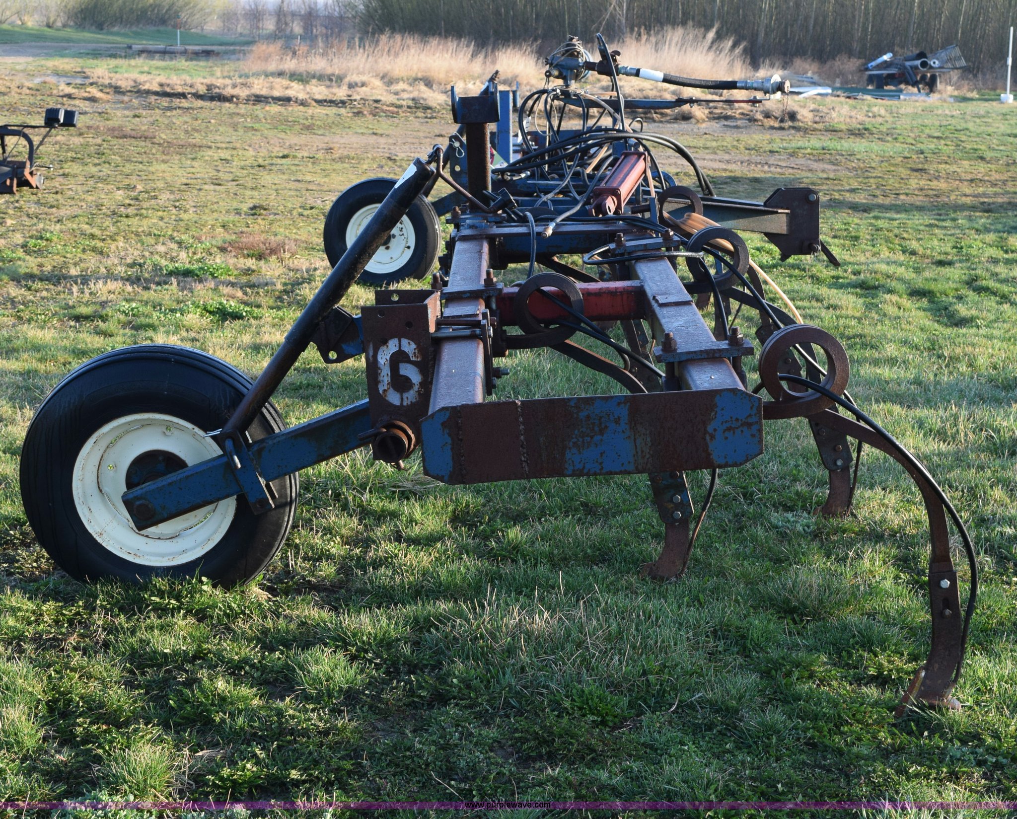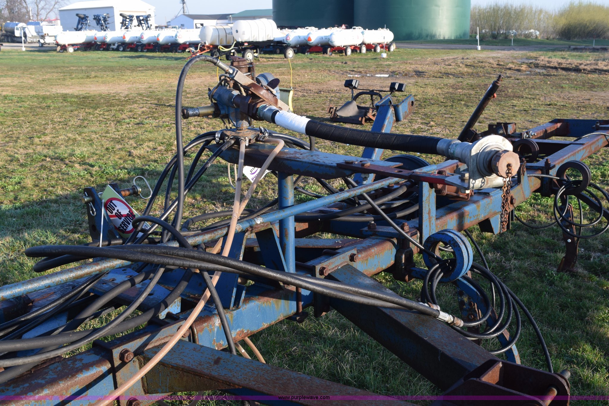 Purple Wave is selling a used Applicator Attach. in Michigan. This item is a Anhydrous applicator with the following: Approx. 27'W toolbar, 30" spacing, 11 shank, John Blue pump, Hydraulic fold, Three point, 7.60-15 tires, Unit# 6