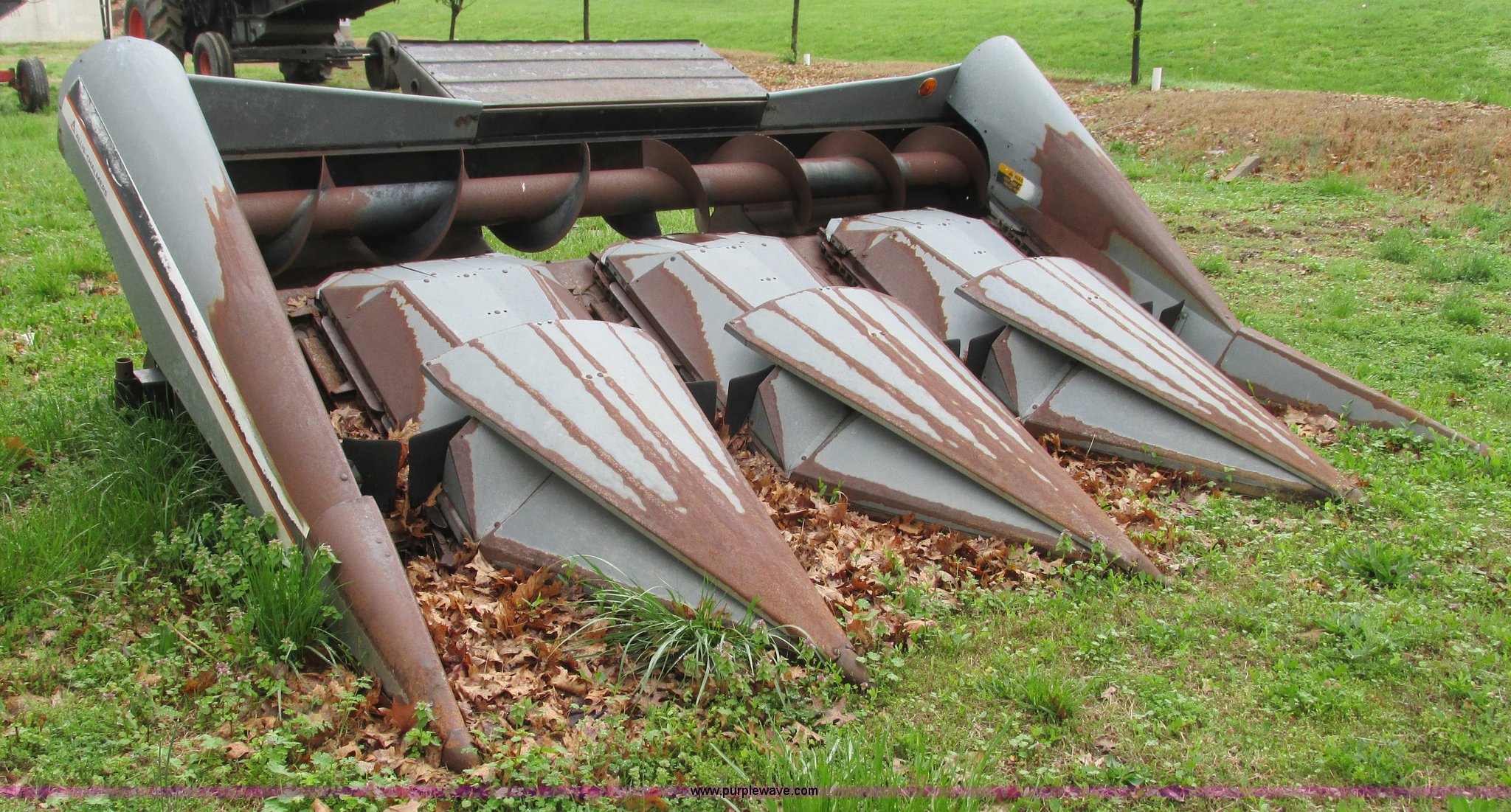 Purple Wave is selling a used Corn or Row Head in Missouri. This item is a Allis Chalmers 438A corn head with the following: Four row, Fits Gleaner M2 combines, Paint faded, Rust, Serial 11275