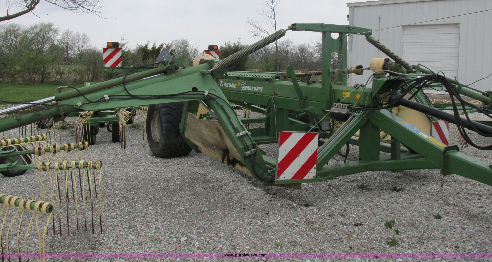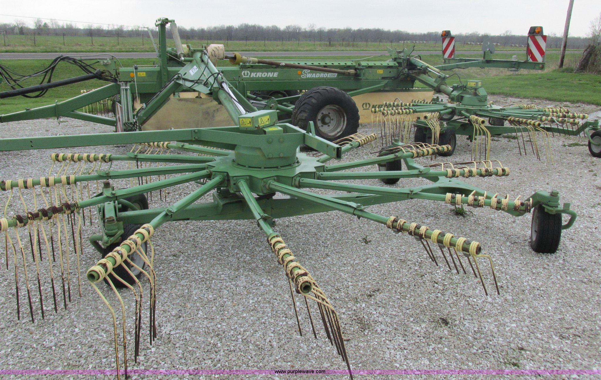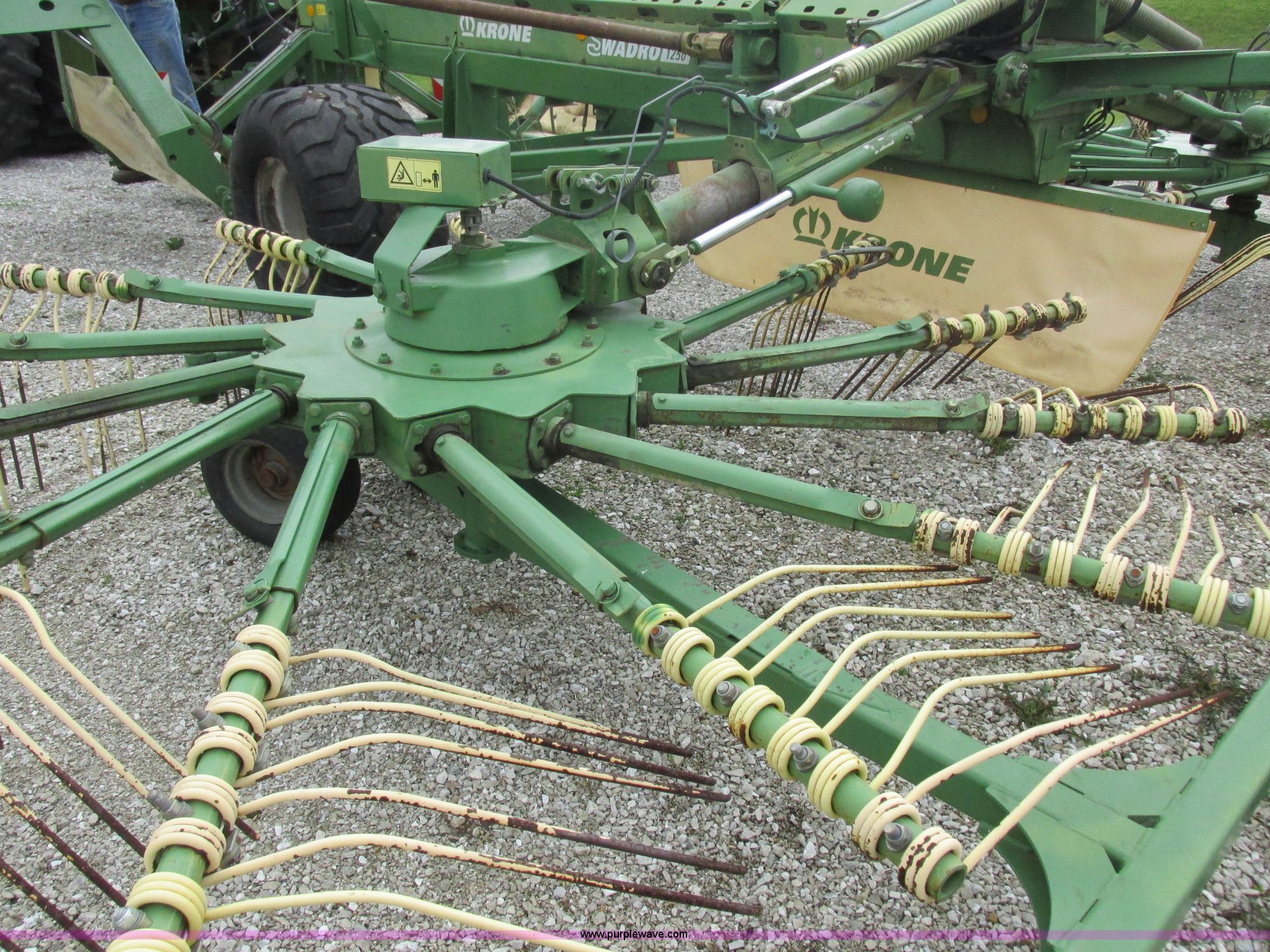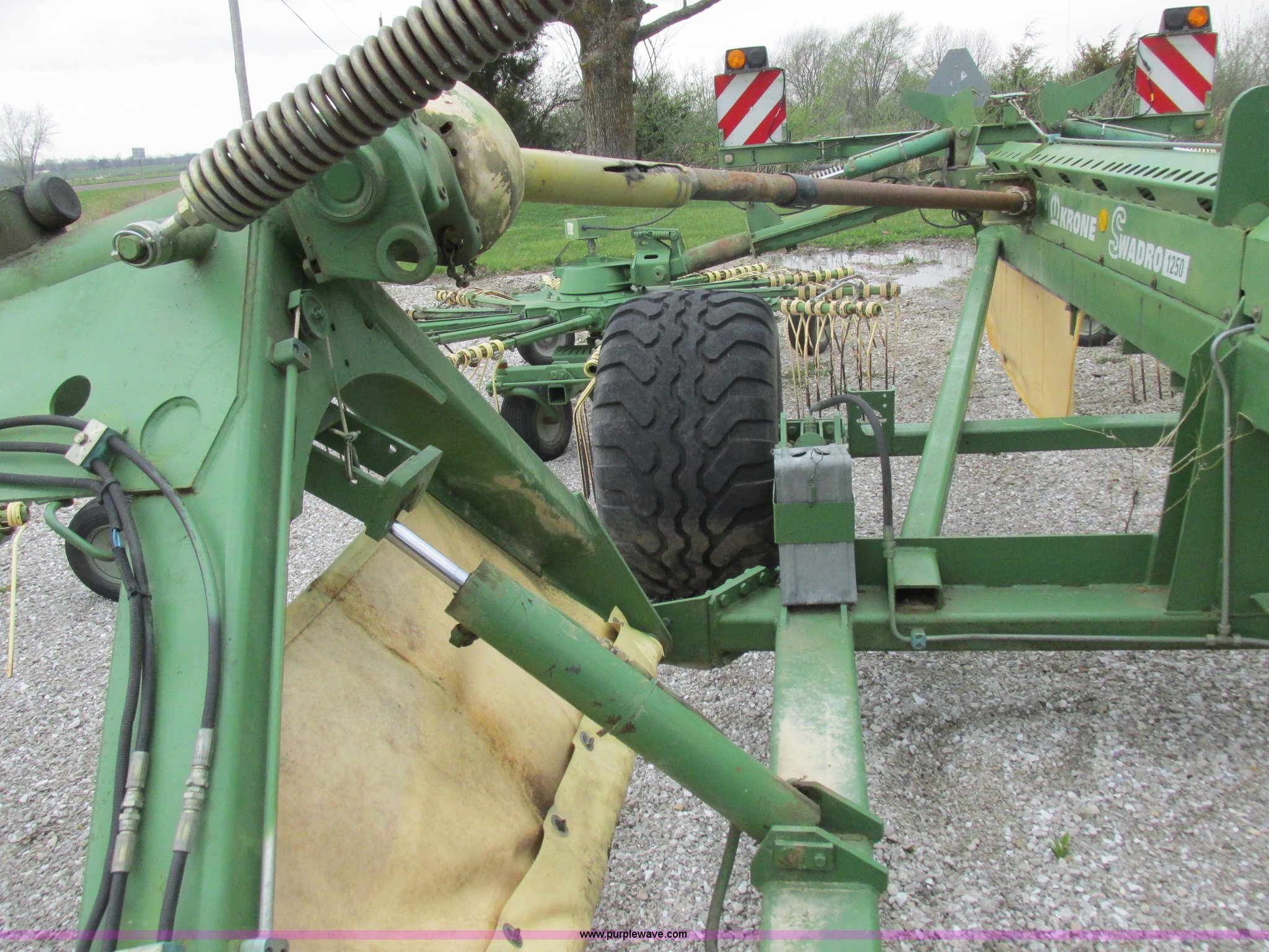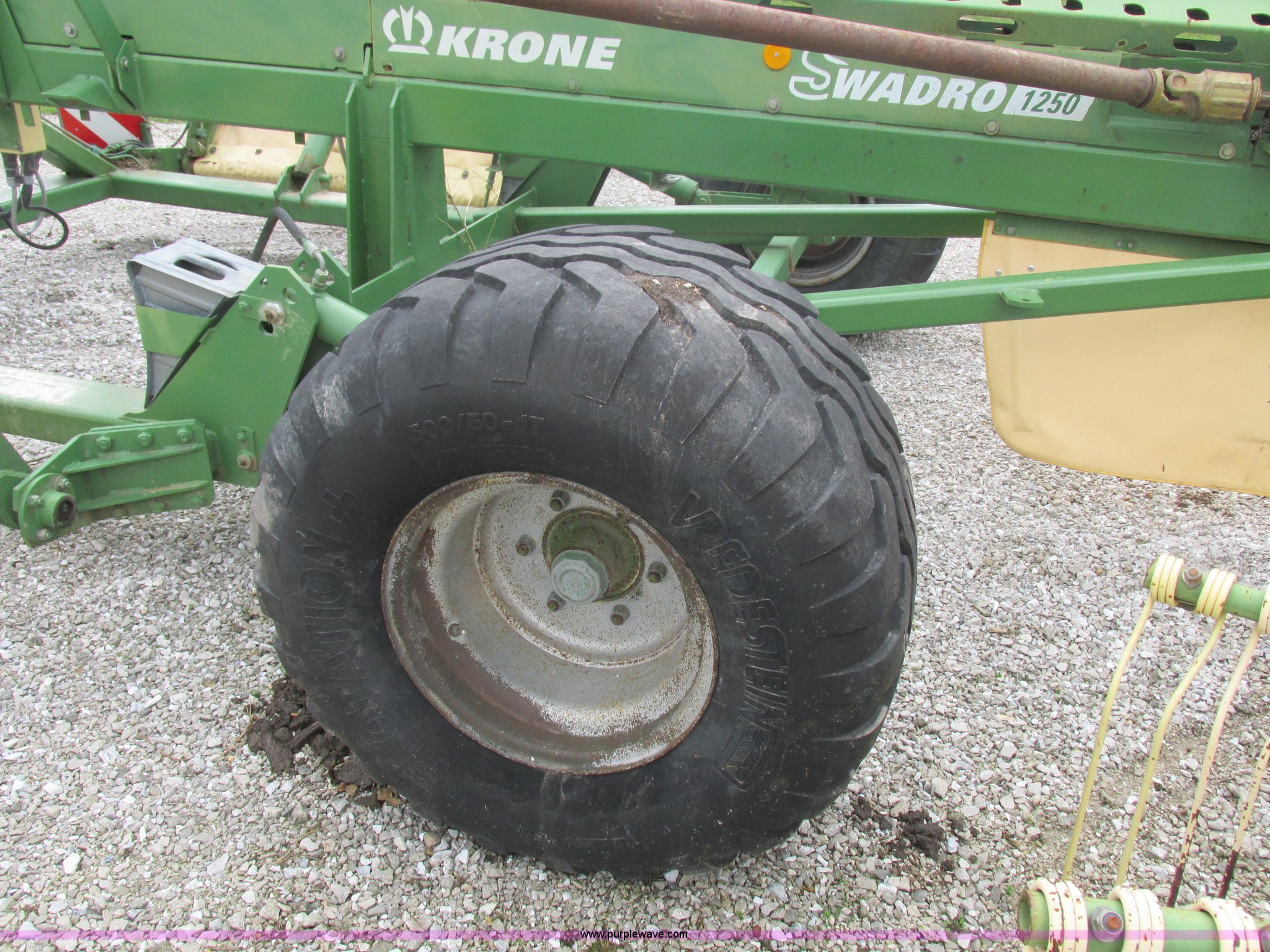 Purple Wave is selling a used Hay Rake in Missouri. This item is a Krone Swardro 1250 rotary hay rake with the following: Approx. 40' coverage path, Krone controller, Toggle switches, 540 PTO driven, Pin hitch, (4) hydraulic wheels, 500/50-17 wheels, 6.5x6.50-8 wheels