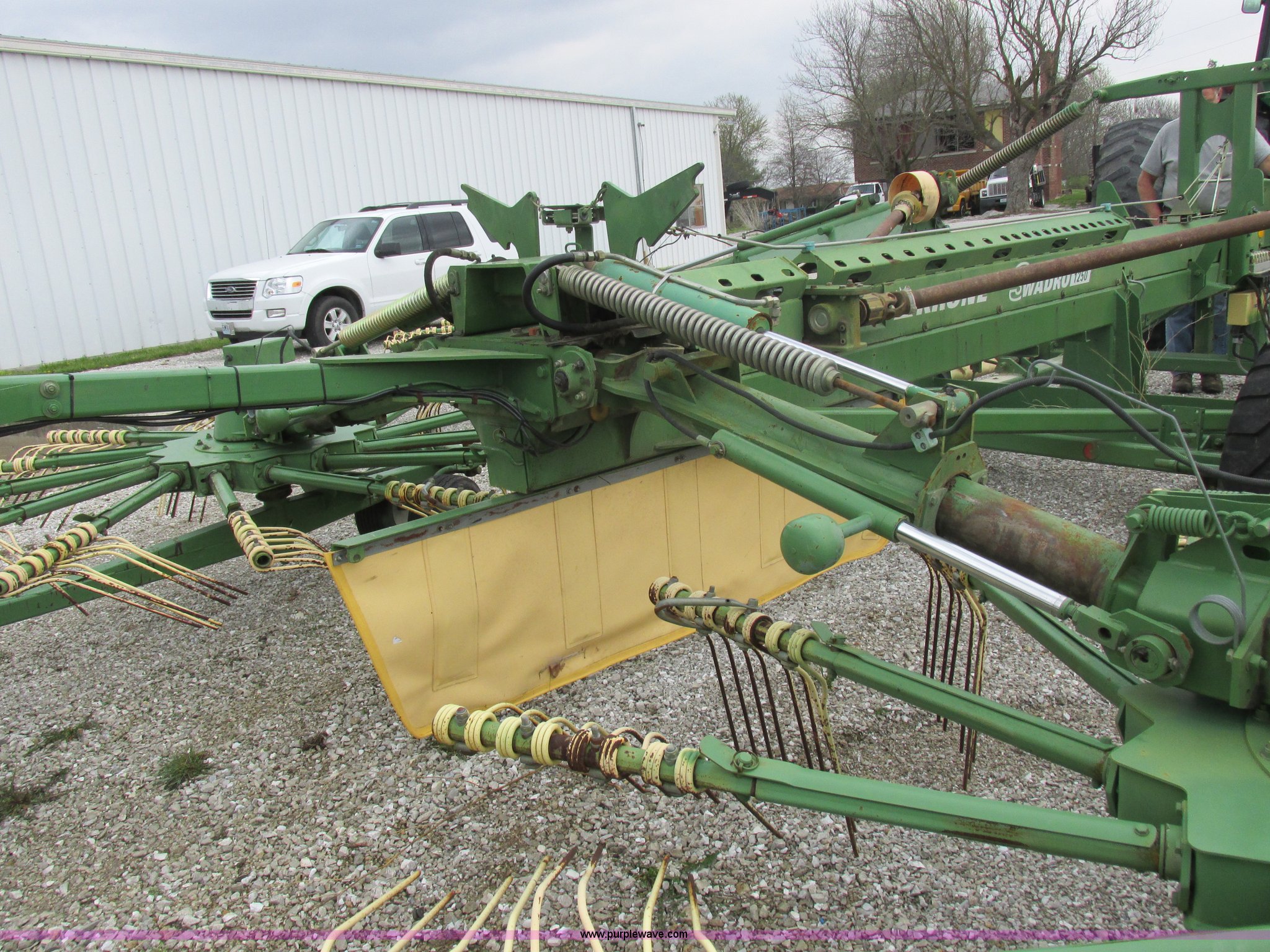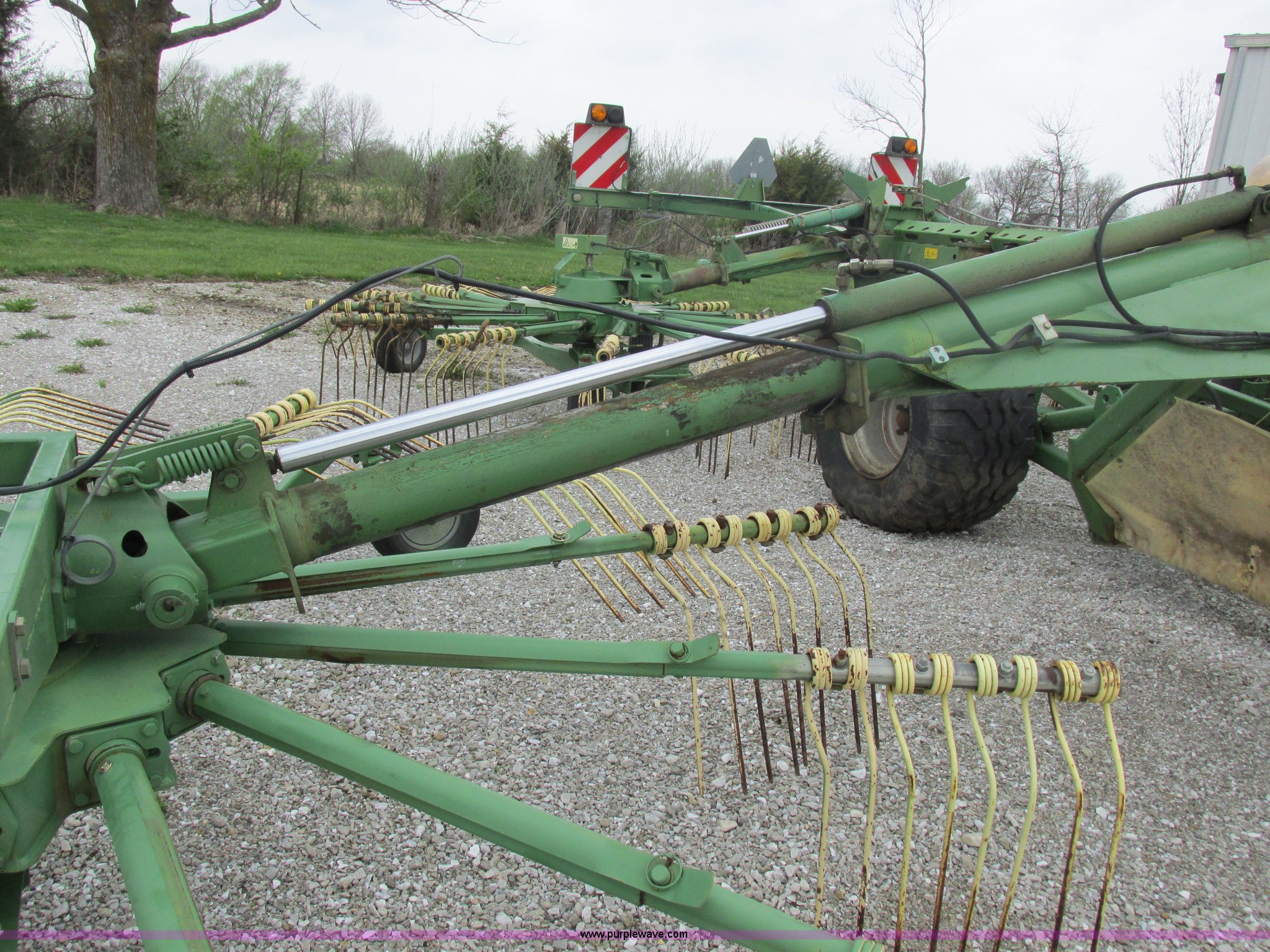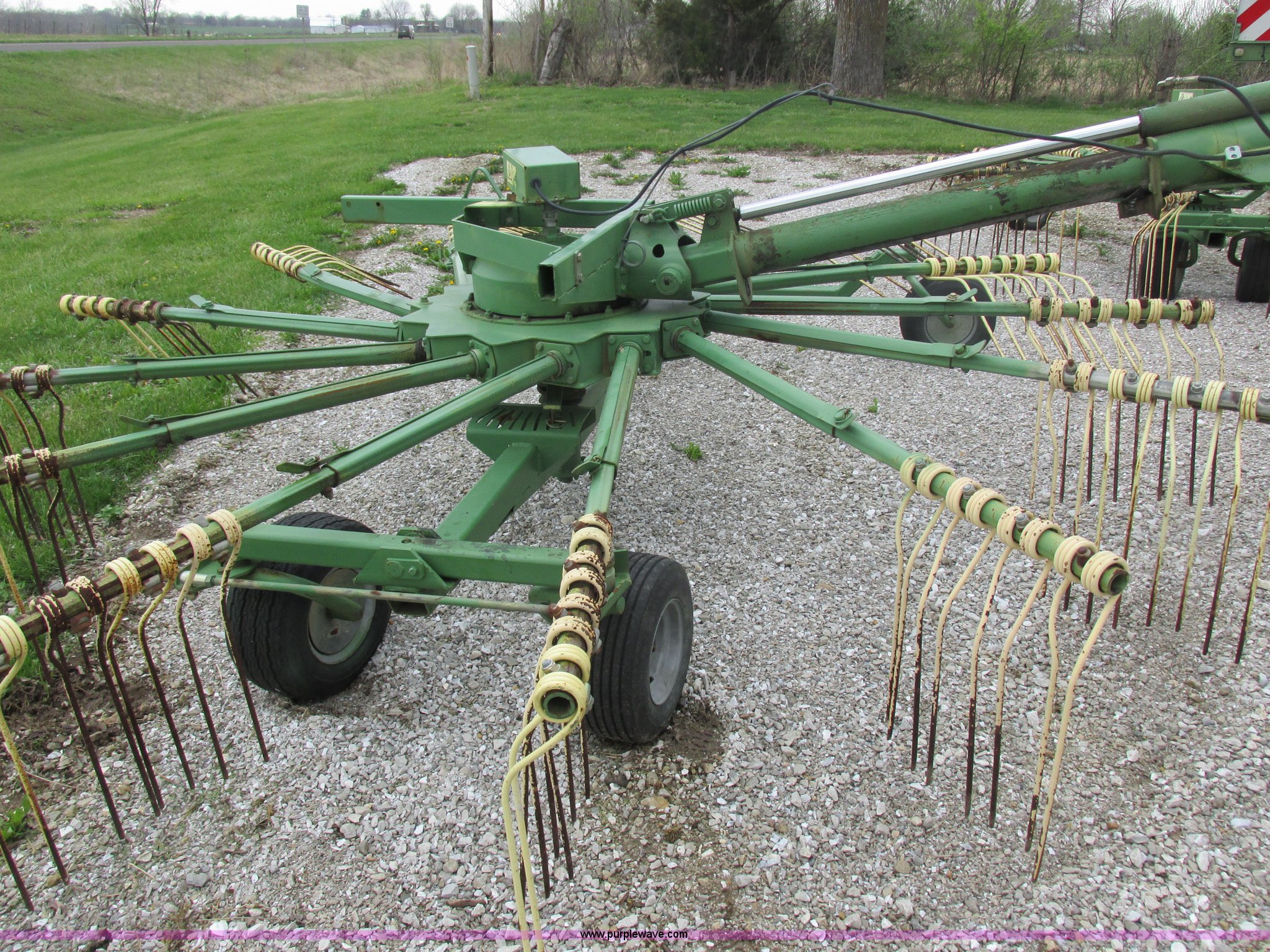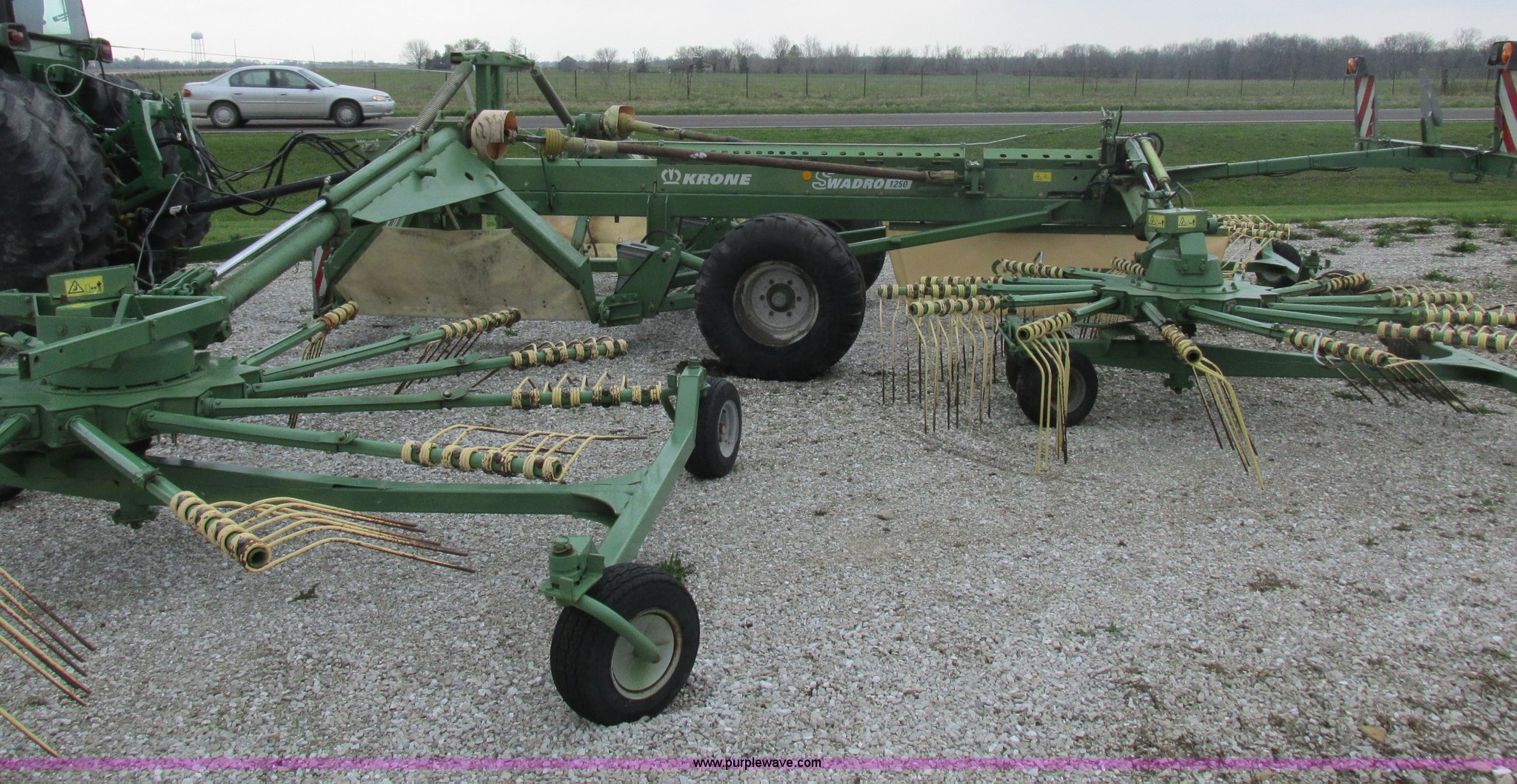 Purple Wave is selling a used Hay Rake in Missouri. This item is a Krone Swardro 1250 rotary hay rake with the following: Approx. 40' coverage path, Krone controller, Toggle switches, 540 PTO driven, Pin hitch, (4) hydraulic wheels, 500/50-17 wheels, 6.5x6.50-8 wheels