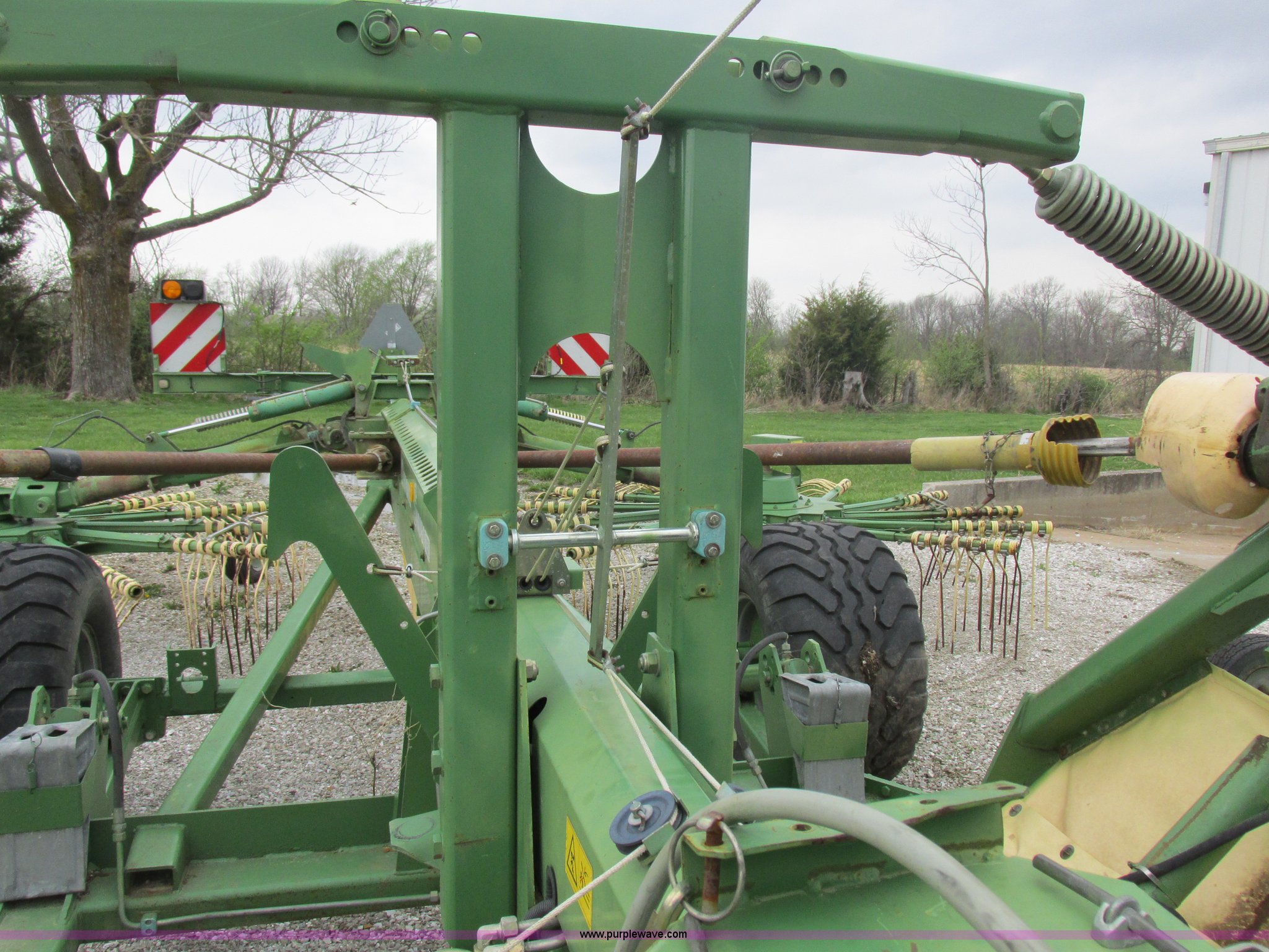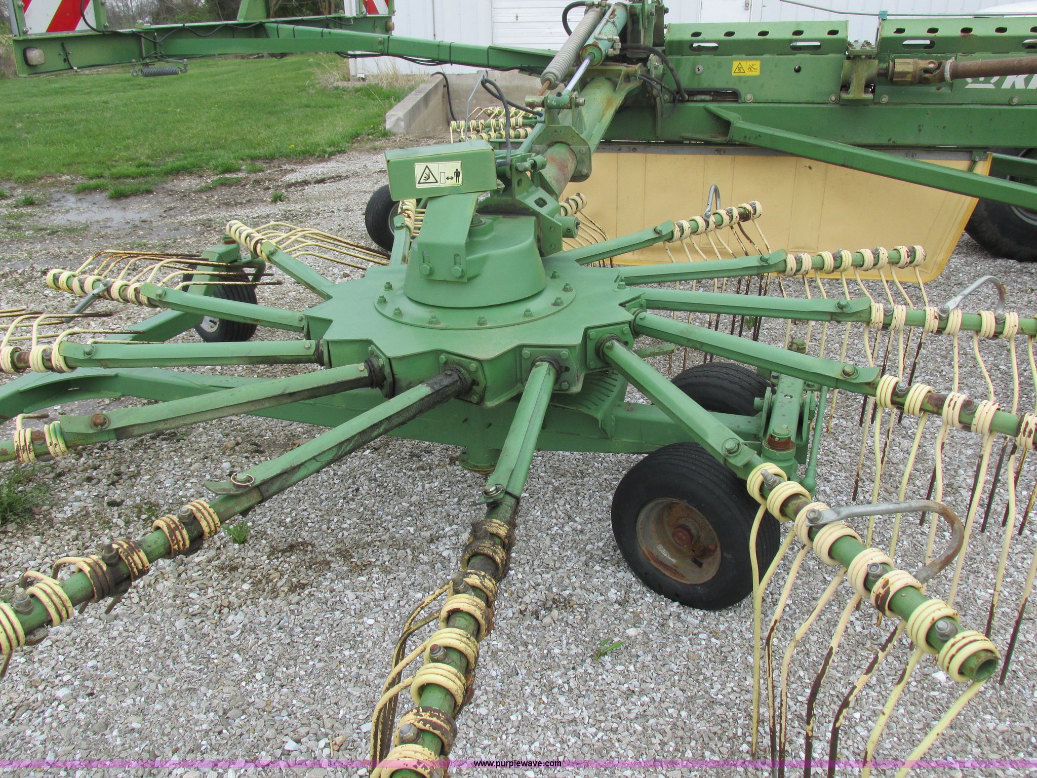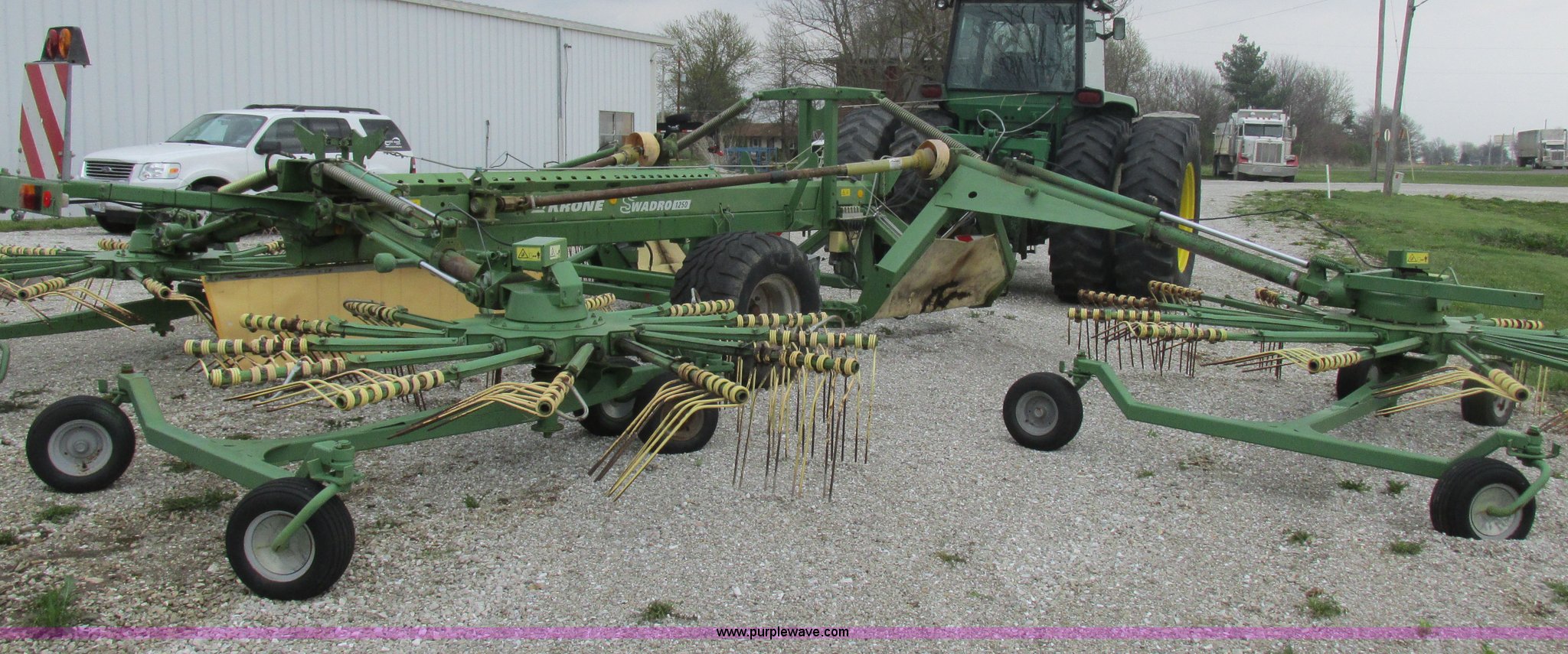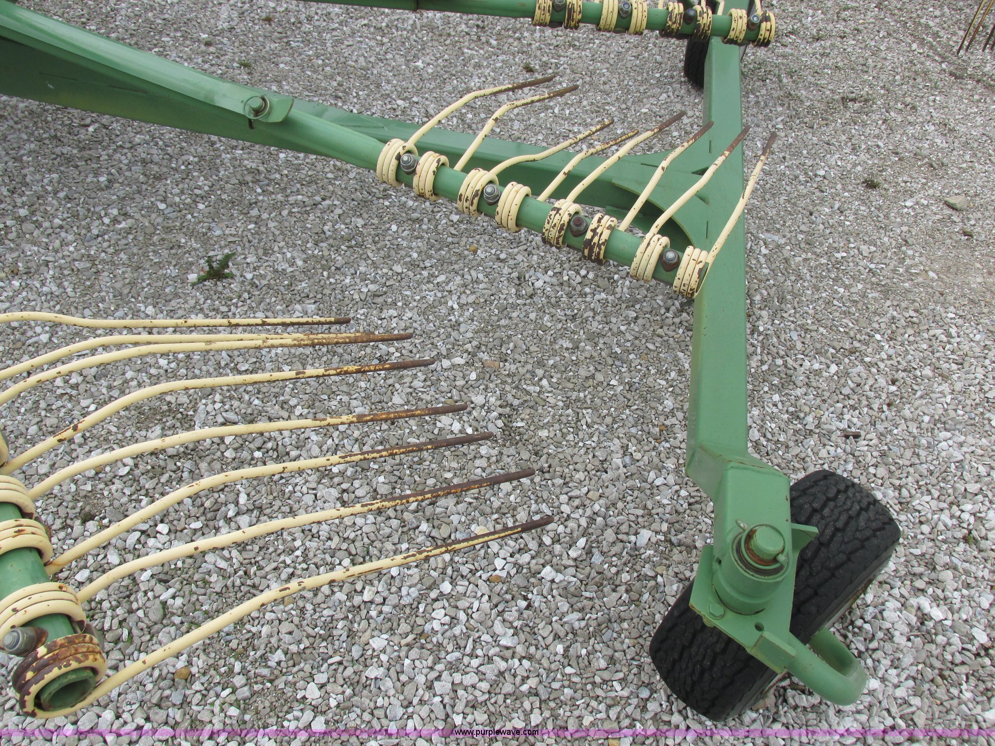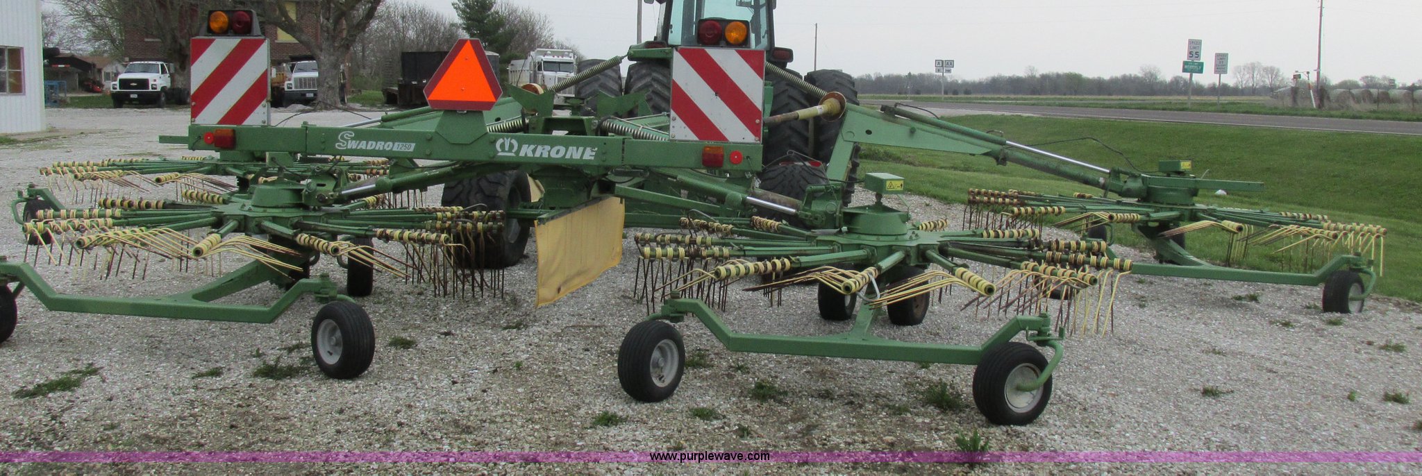 Purple Wave is selling a used Hay Rake in Missouri. This item is a Krone Swardro 1250 rotary hay rake with the following: Approx. 40' coverage path, Krone controller, Toggle switches, 540 PTO driven, Pin hitch, (4) hydraulic wheels, 500/50-17 wheels, 6.5x6.50-8 wheels