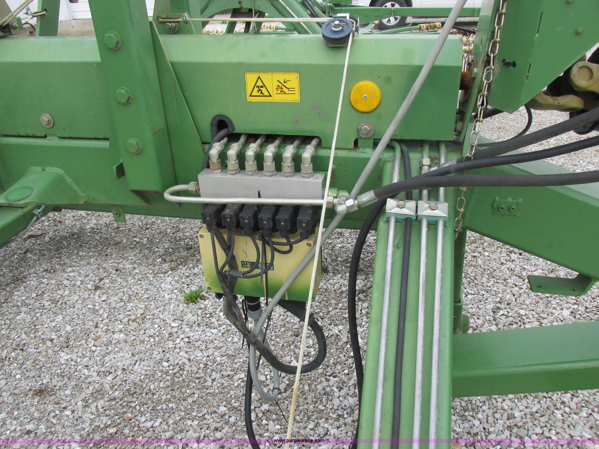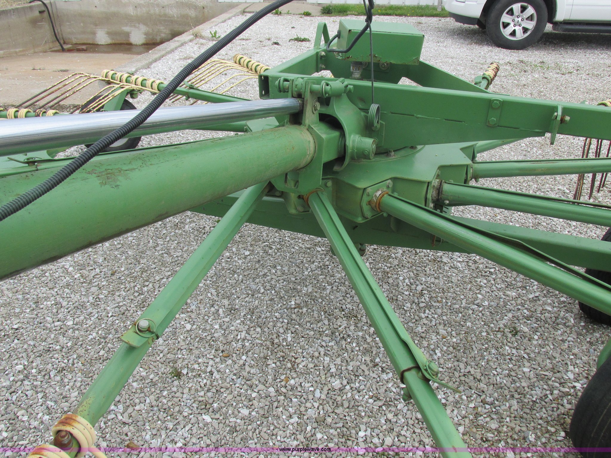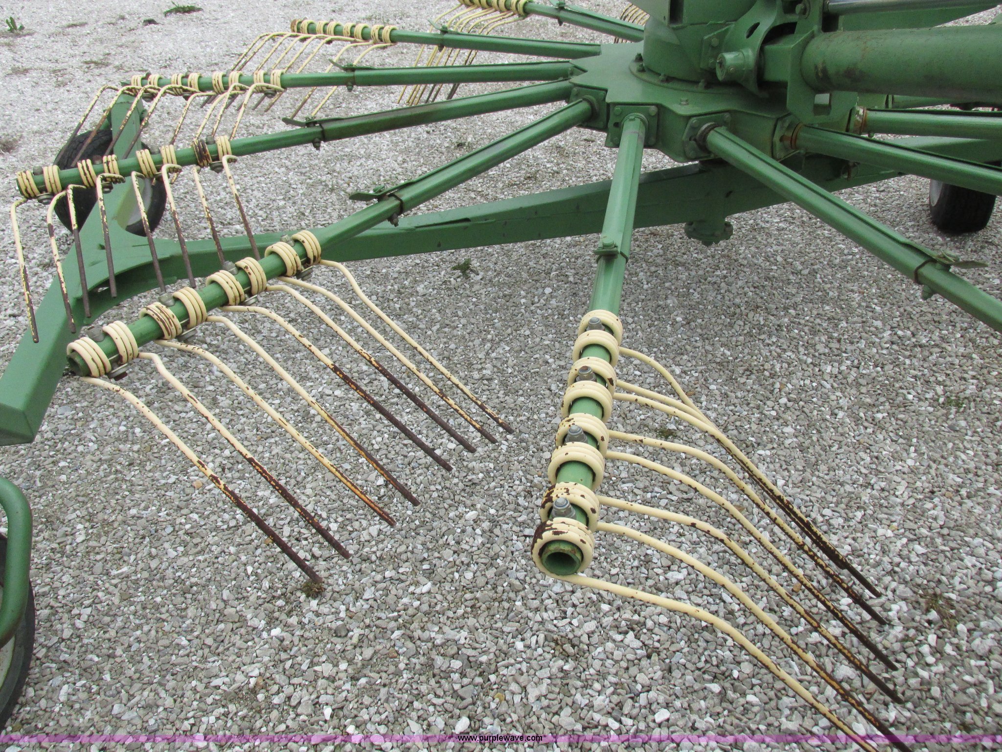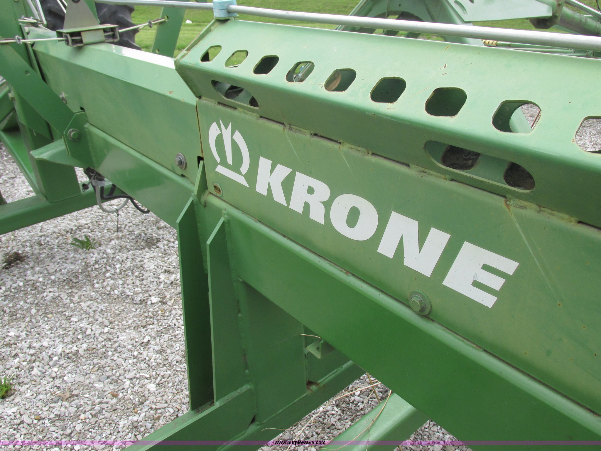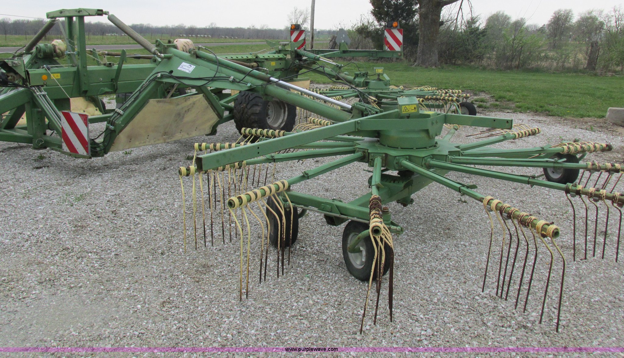 Purple Wave is selling a used Hay Rake in Missouri. This item is a Krone Swardro 1250 rotary hay rake with the following: Approx. 40' coverage path, Krone controller, Toggle switches, 540 PTO driven, Pin hitch, (4) hydraulic wheels, 500/50-17 wheels, 6.5x6.50-8 wheels