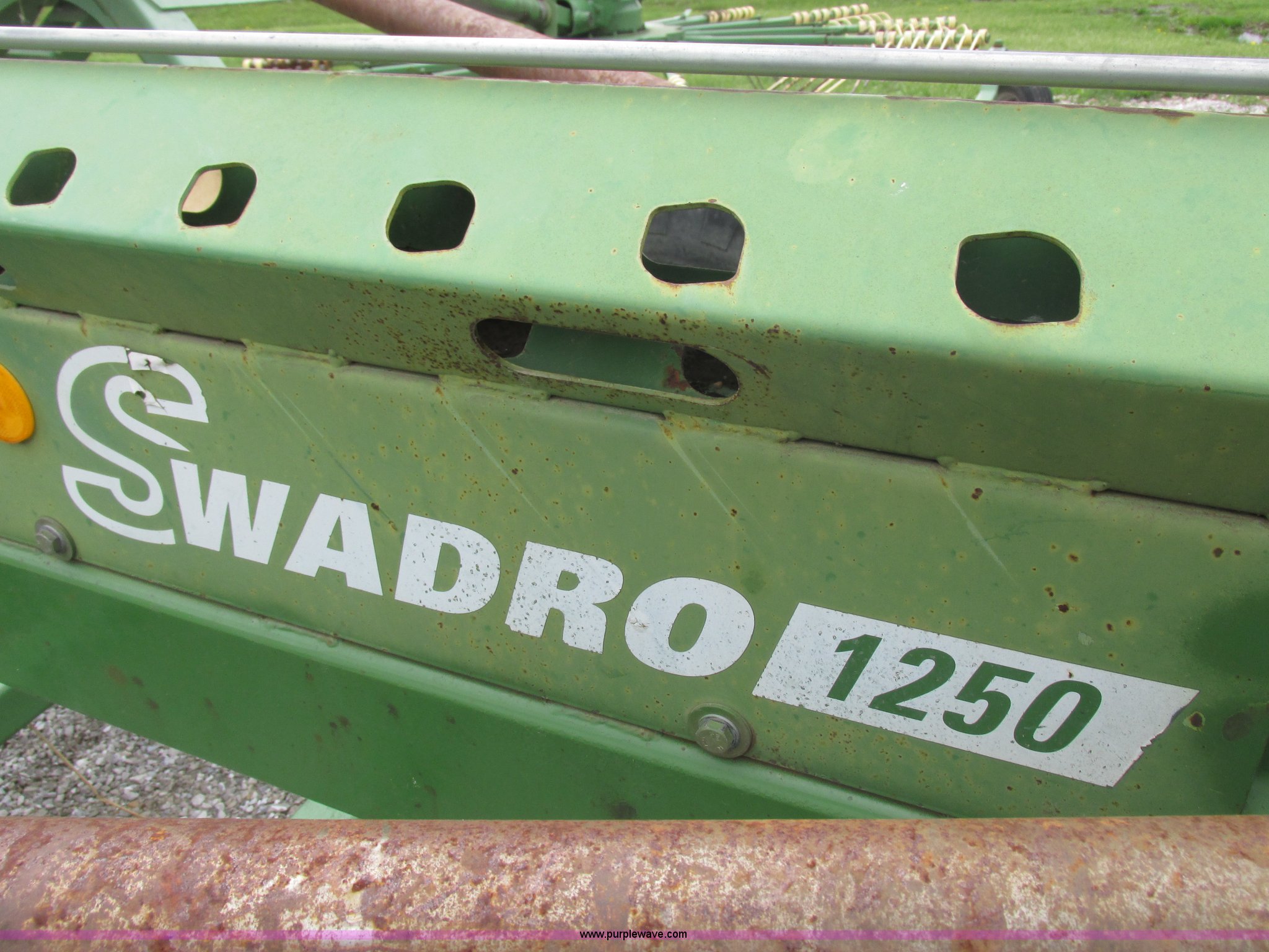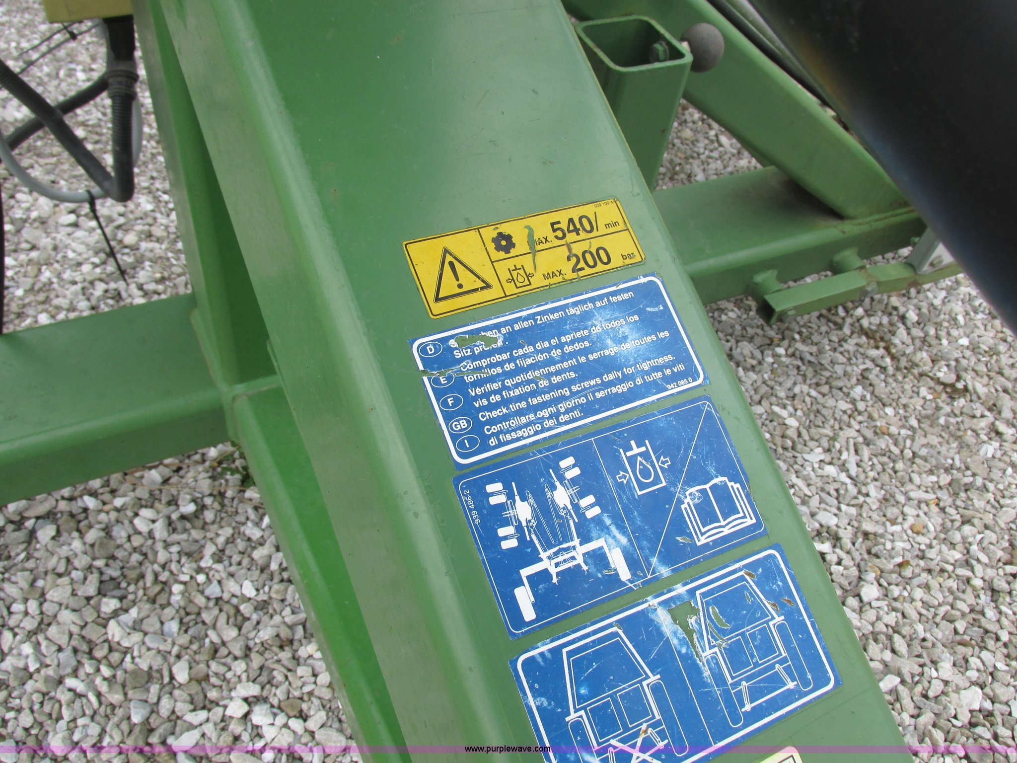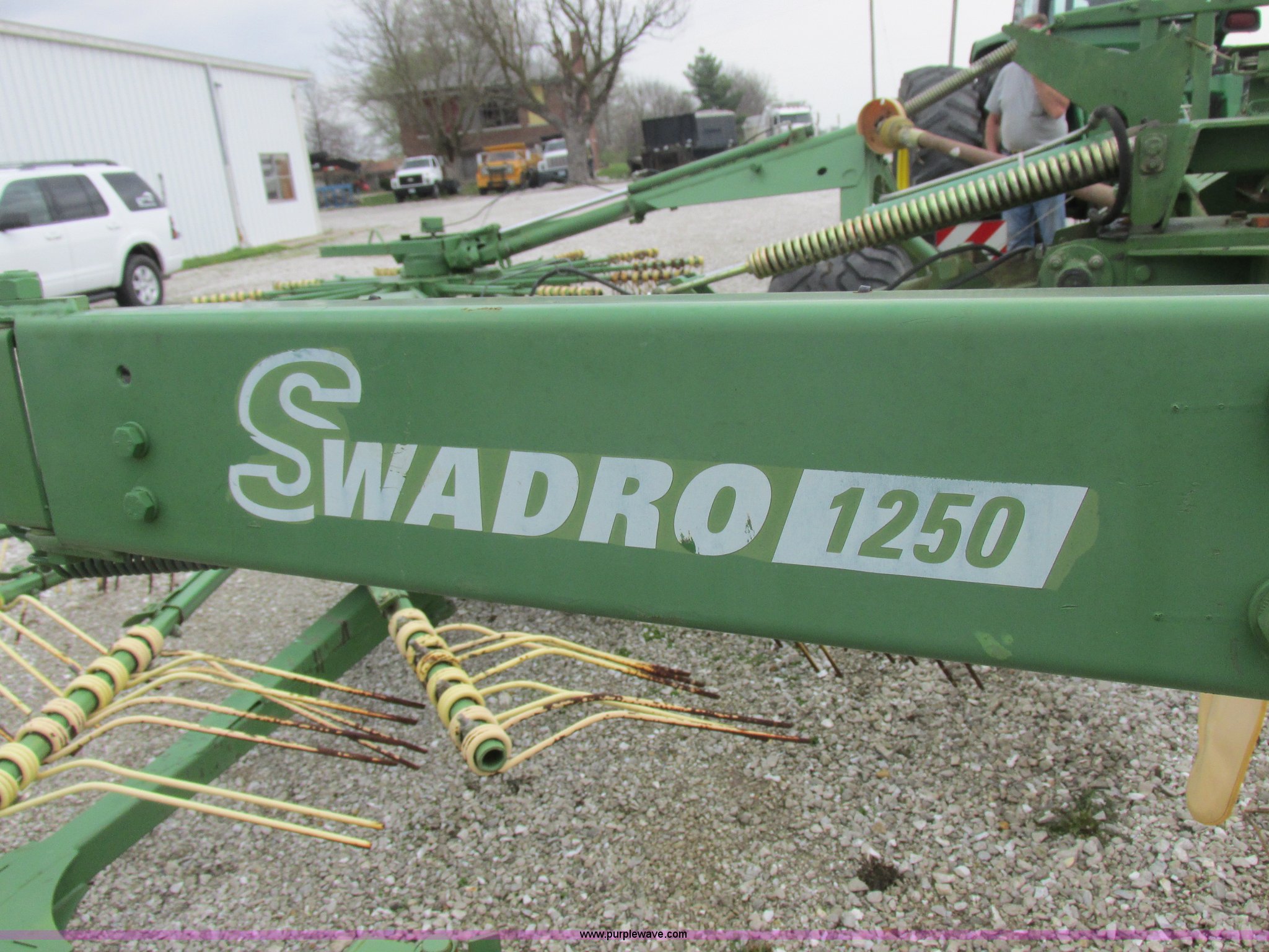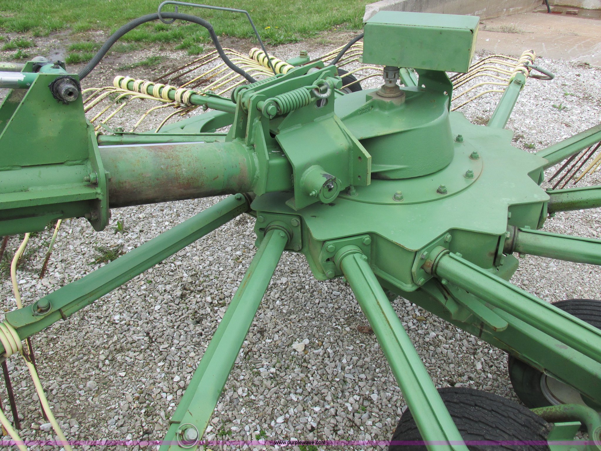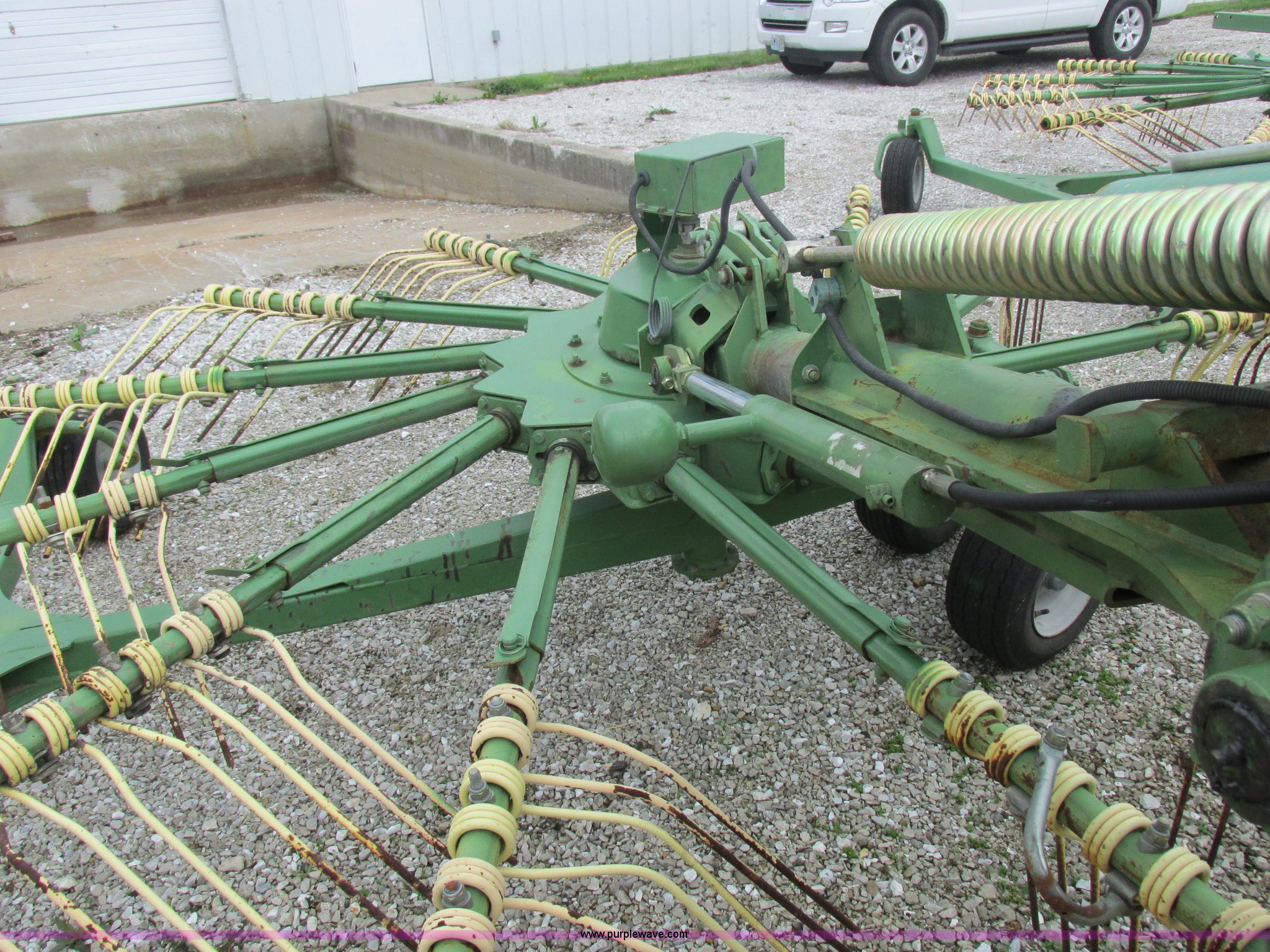 Purple Wave is selling a used Hay Rake in Missouri. This item is a Krone Swardro 1250 rotary hay rake with the following: Approx. 40' coverage path, Krone controller, Toggle switches, 540 PTO driven, Pin hitch, (4) hydraulic wheels, 500/50-17 wheels, 6.5x6.50-8 wheels