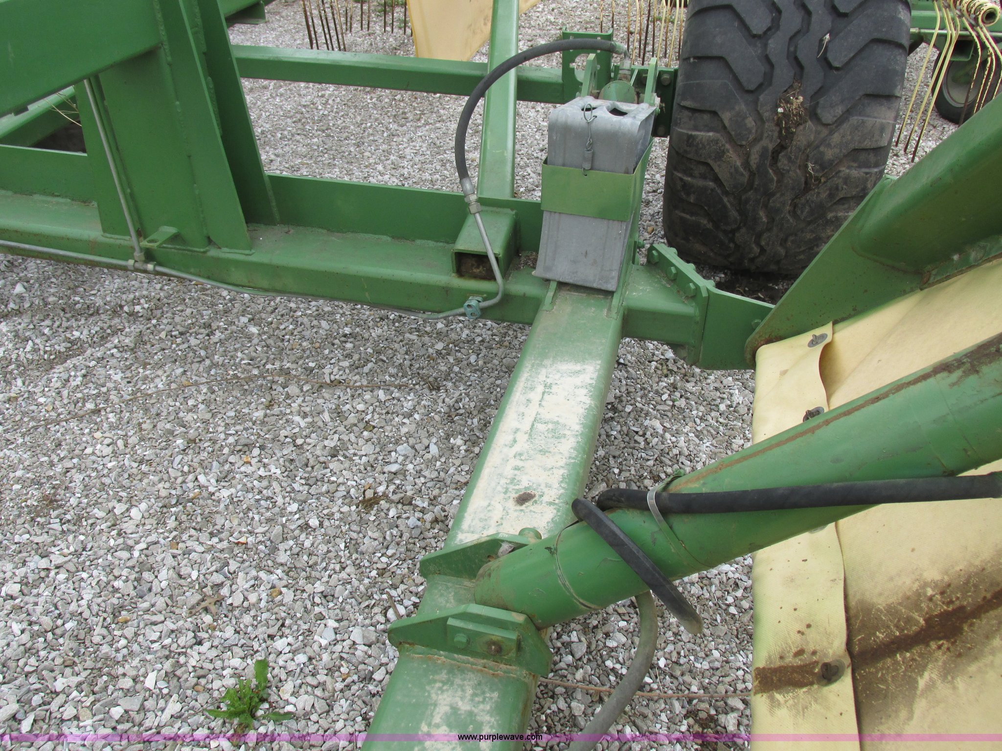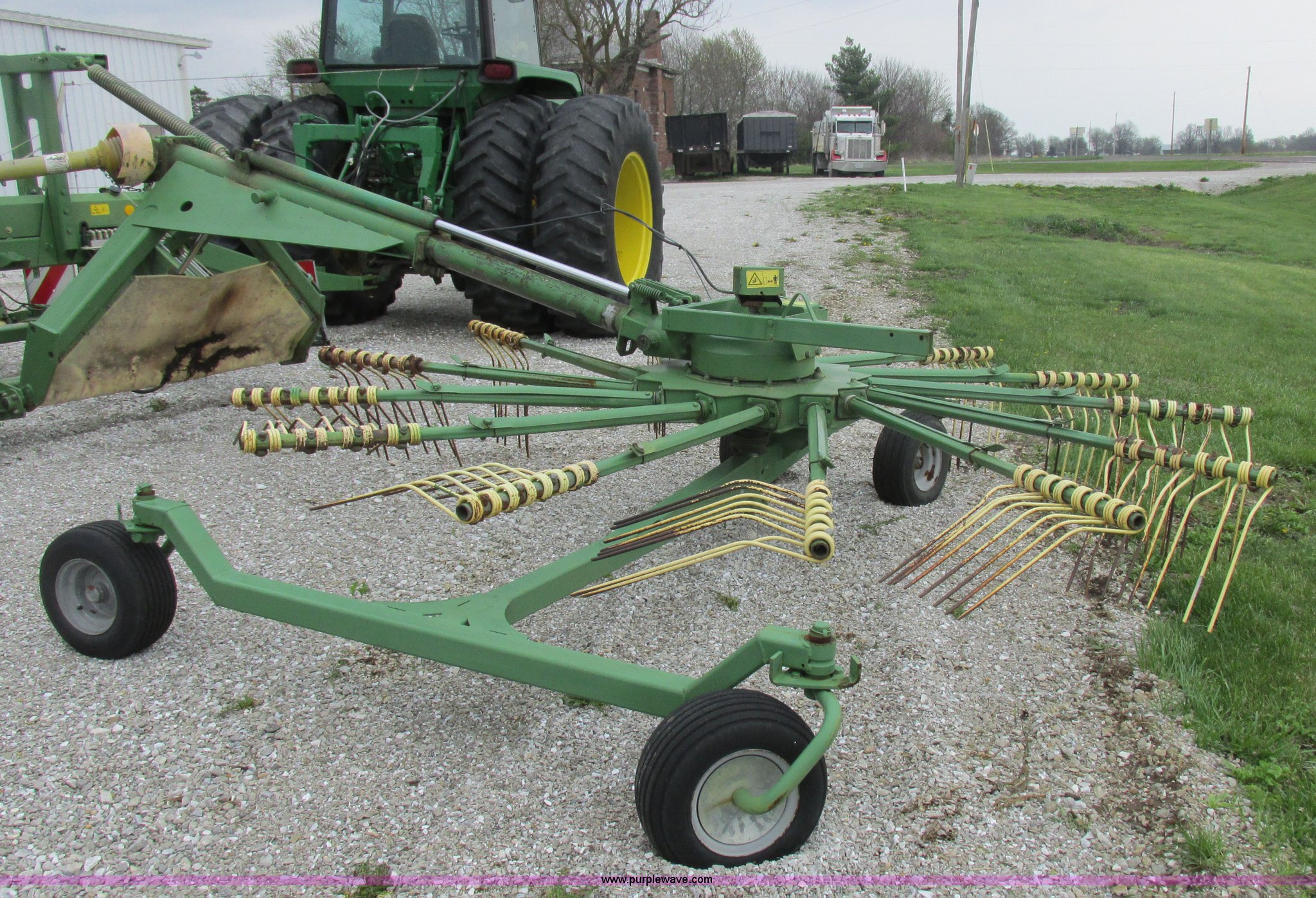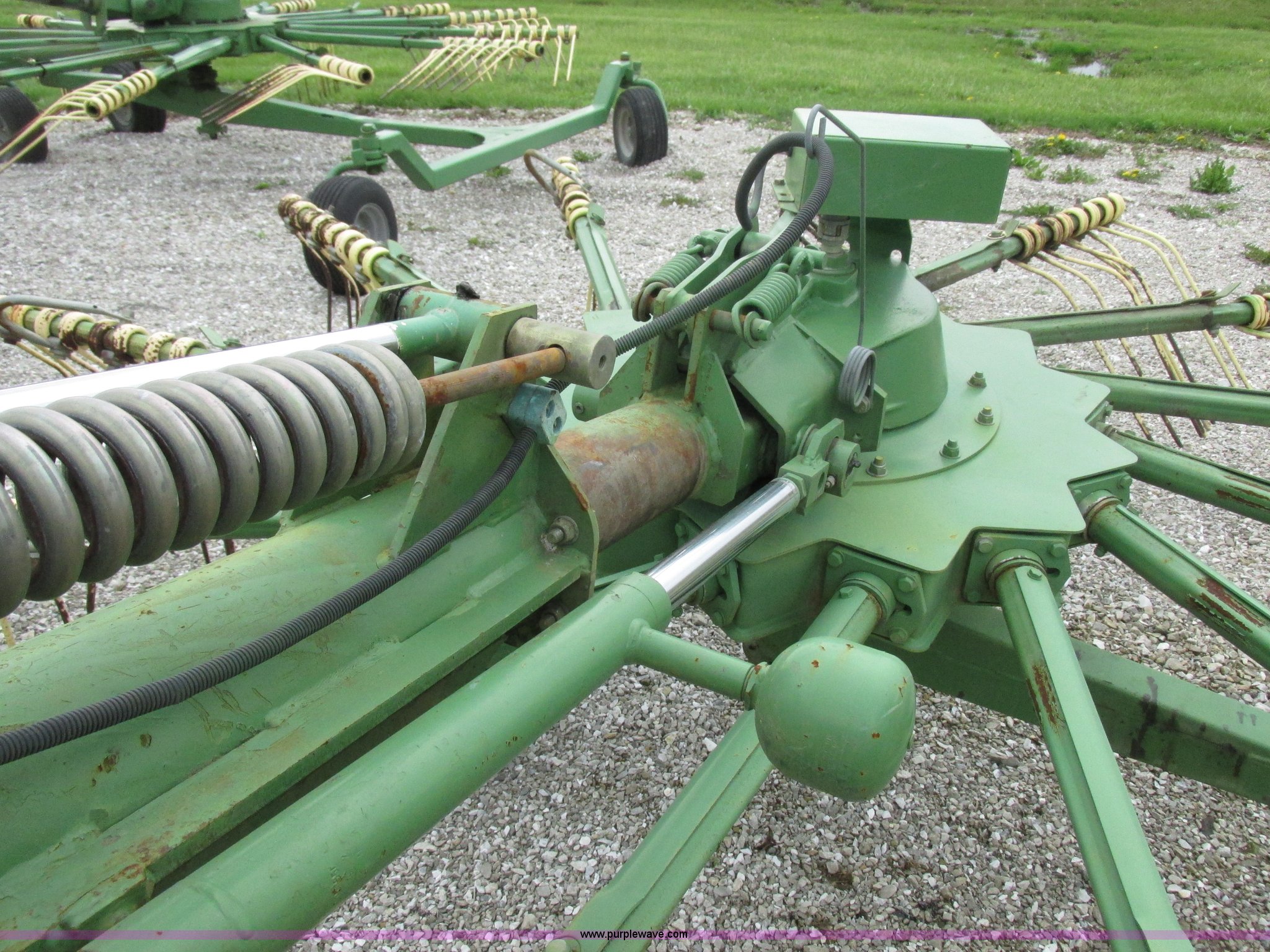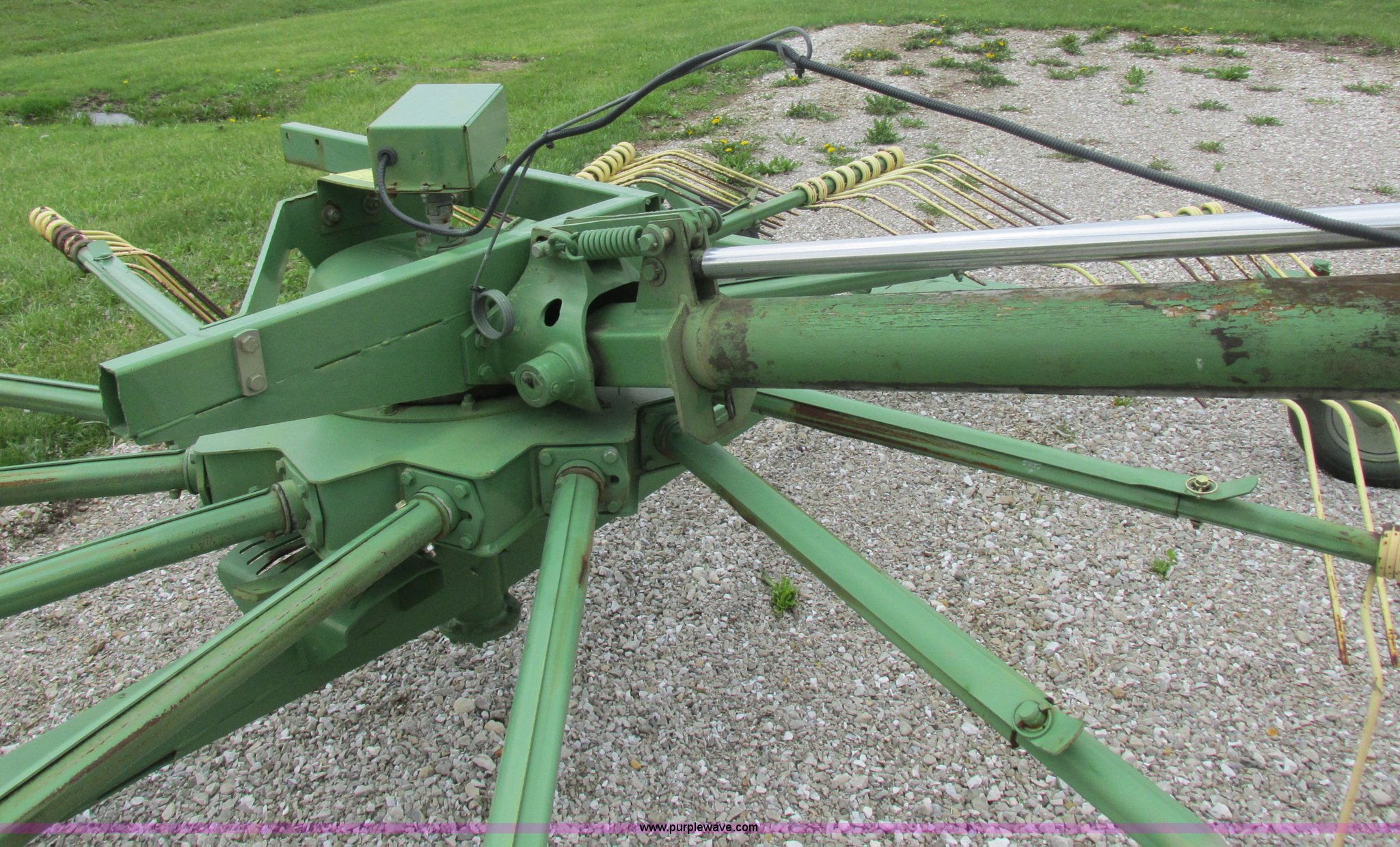 Purple Wave is selling a used Hay Rake in Missouri. This item is a Krone Swardro 1250 rotary hay rake with the following: Approx. 40' coverage path, Krone controller, Toggle switches, 540 PTO driven, Pin hitch, (4) hydraulic wheels, 500/50-17 wheels, 6.5x6.50-8 wheels