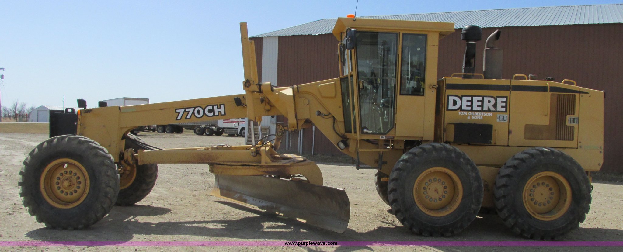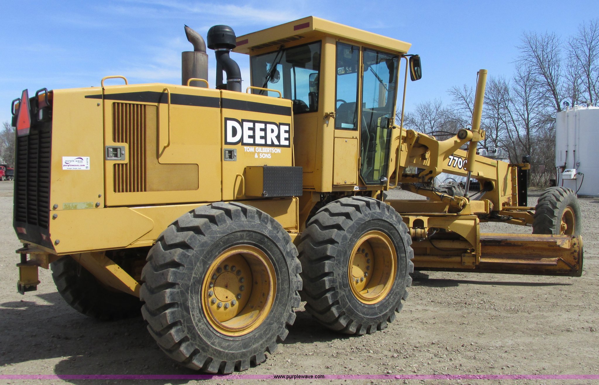 Purple Wave is selling a used Motor Grader in North Dakota. This item is a 1998 John Deere 770CH motor grader with the following: 7,222 hours on meter, John Deere six cylinder diesel engine, Serial RG6081H064383, 8F-8R gears, Four wheel drive, Locking differential, EROPS, AC and heat, AM/FM, Air suspension seat, High cab profile, Block heater, 14'W moldboard, Side shift, Front mounted push block, 14-24 front tires, 17.5-25 rear tires, 32,780 lbs. base operating weight, Serial DW770CH568803