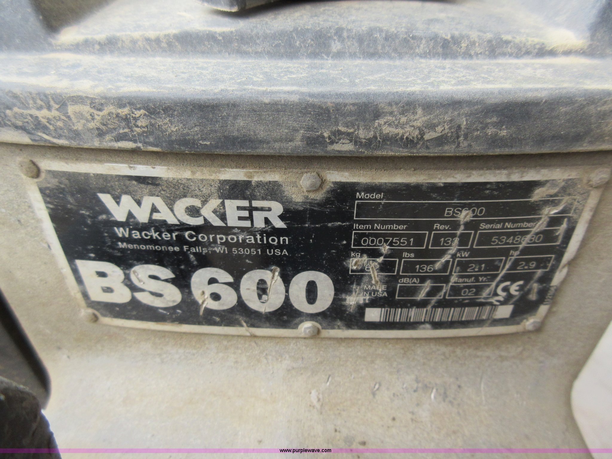 Purple Wave is selling a used Walk Behind Compactor in Missouri. This item is a Wacker BS600 tamper with the following: Two stroke gas engine, 11" x 13" plate