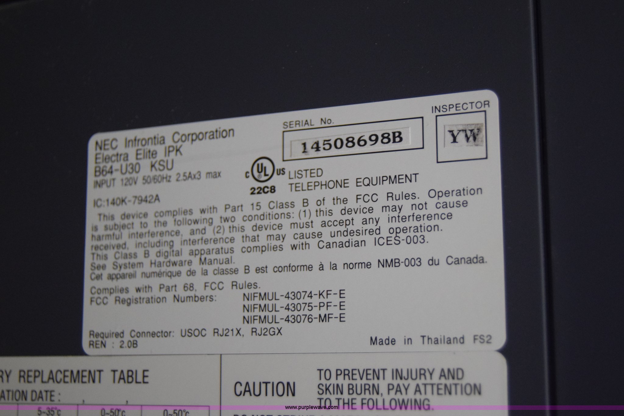 Purple Wave is selling a used Office Supplies and Equip. in Kansas. This item is a NEC Electra elite phone system with the following: (8) phones, Cables, Serial 14508698B