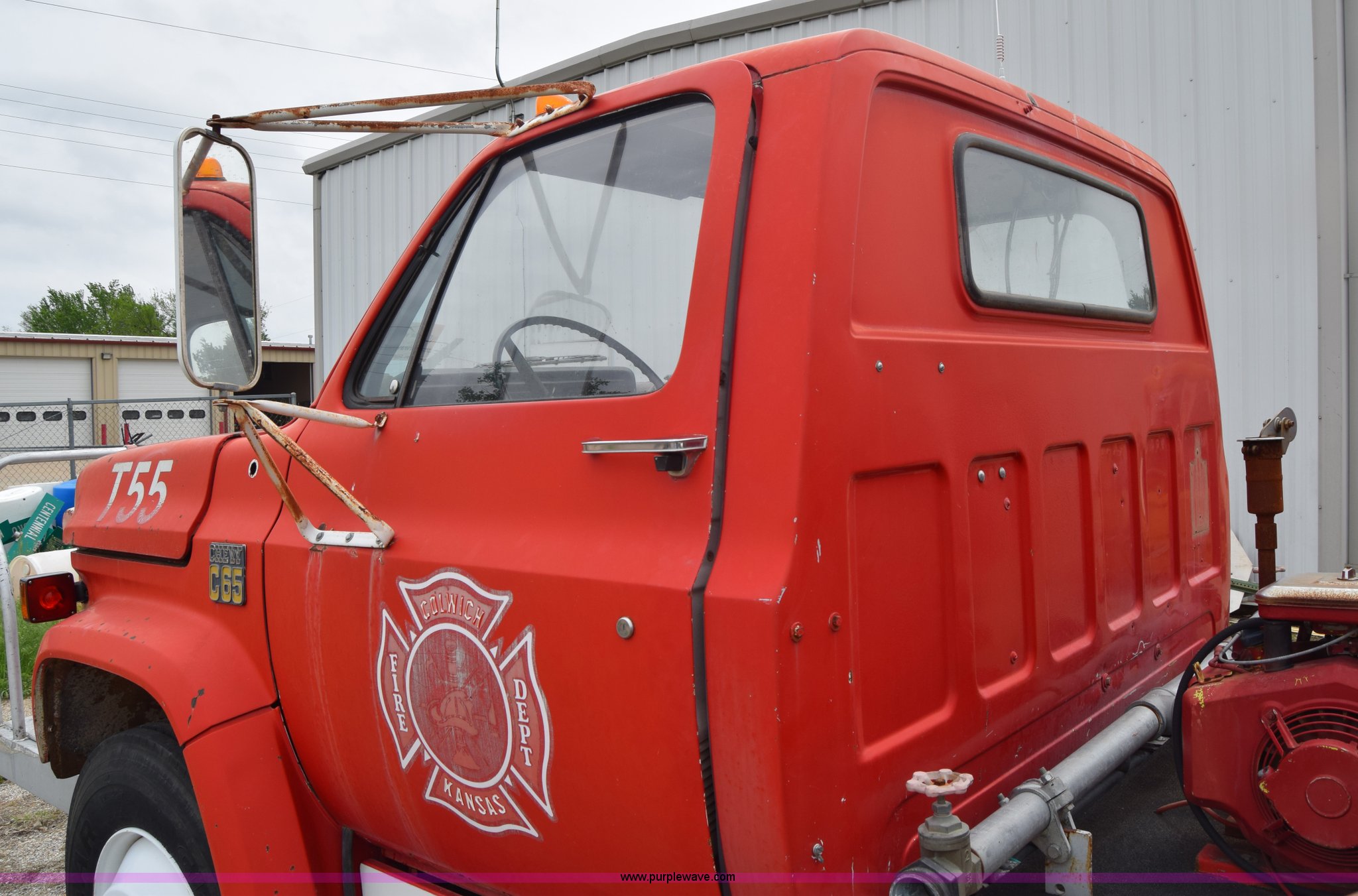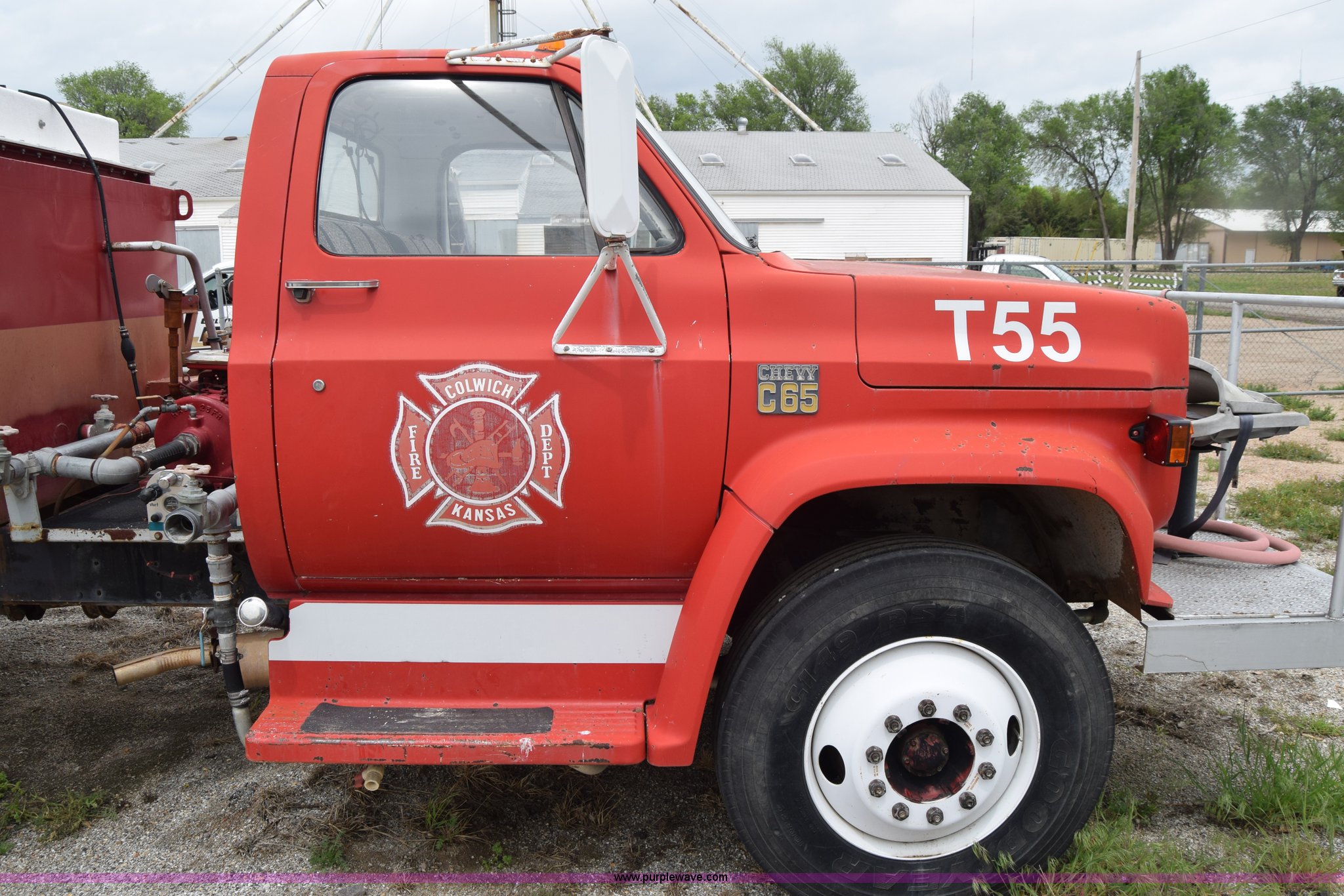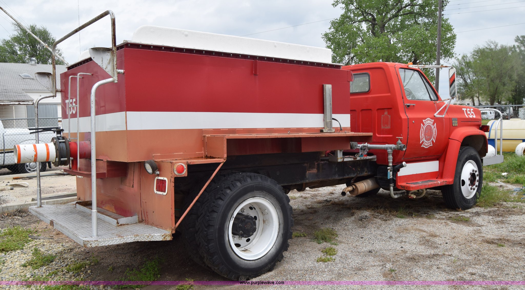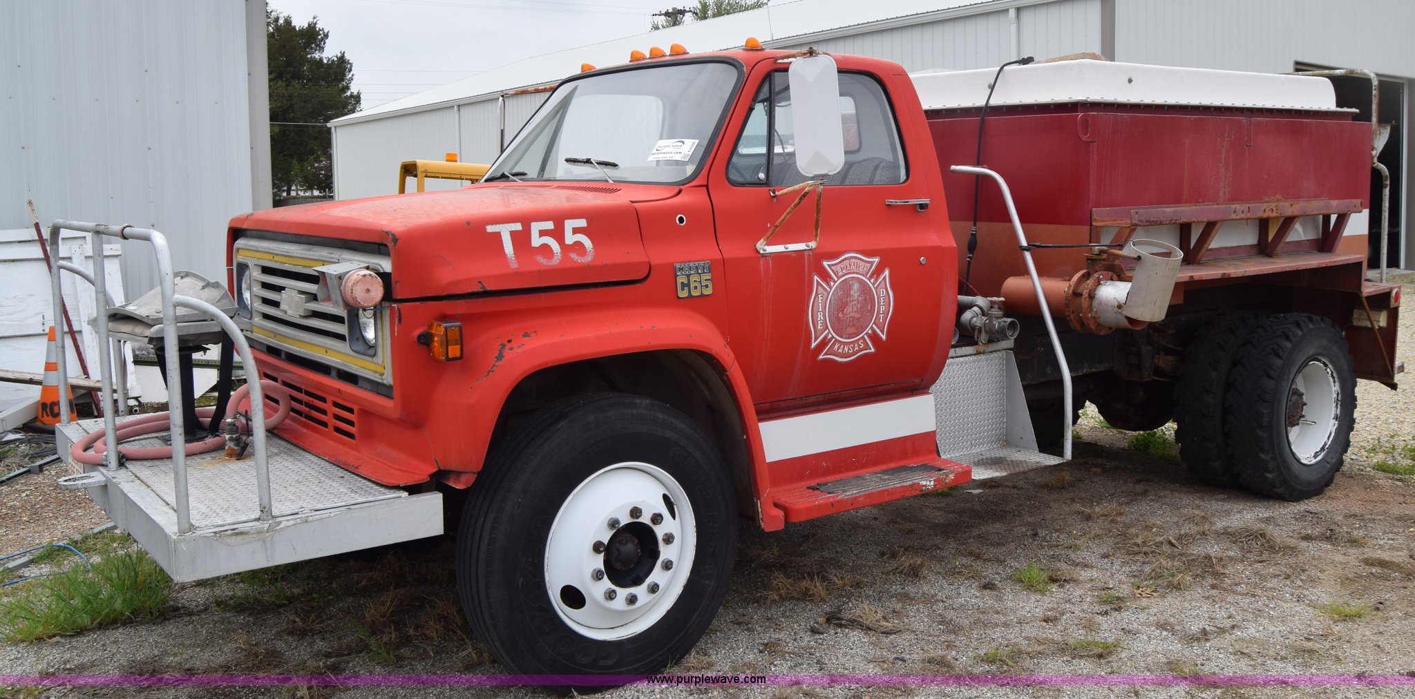 Purple Wave is selling a used Tank Truck or Water Truck in Kansas. This item is a 1975 Chevrolet C65 water truck with the following: 87,958 miles on odometer, 6.5L V8 OHV 16V gas engine, Five speed manual transmission, Heat, Manual windows and locks, Cloth interior, 10'L x 6'W water tank, Front operator's station, Hale pump, Model 25FR-B42, Wisconsin gas engine, Non-operational, Fire hoses, 9.00-20 tires, 10R22.5 tires