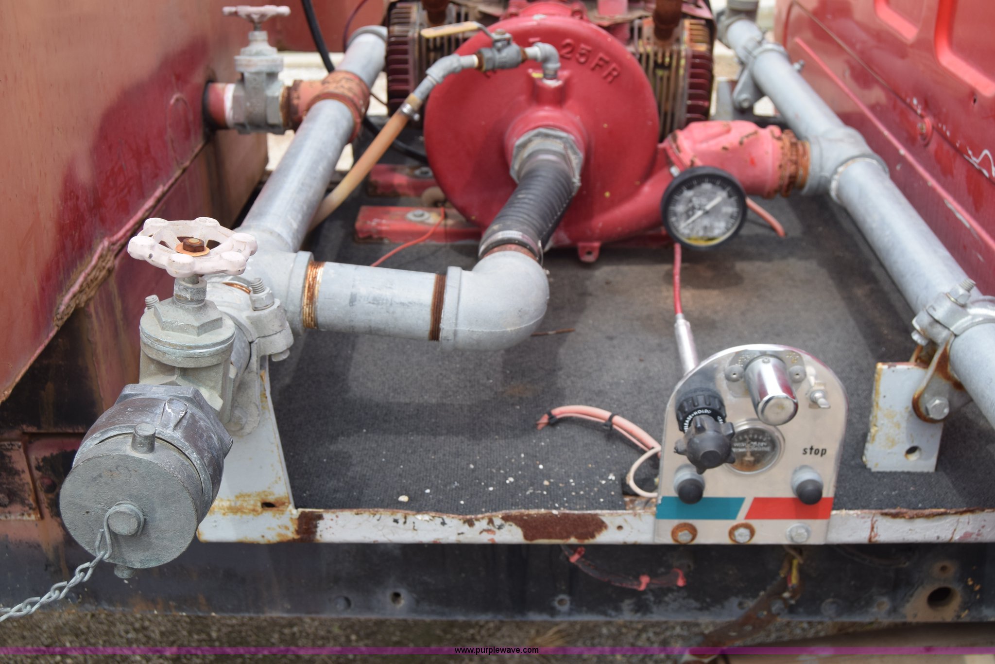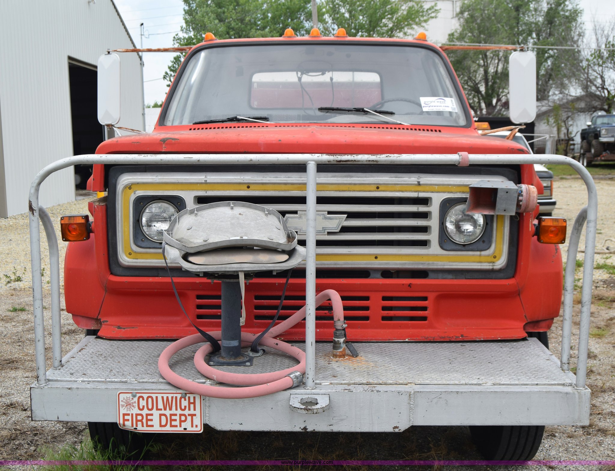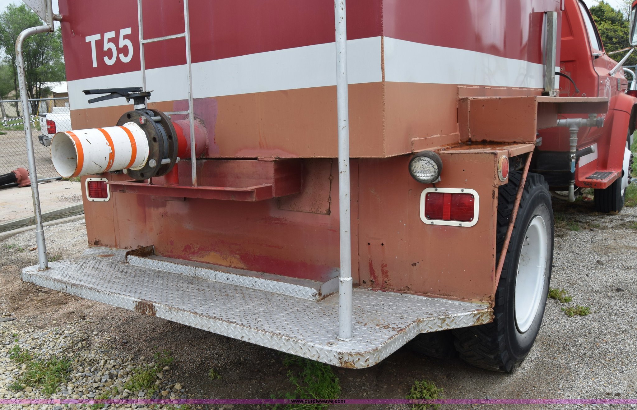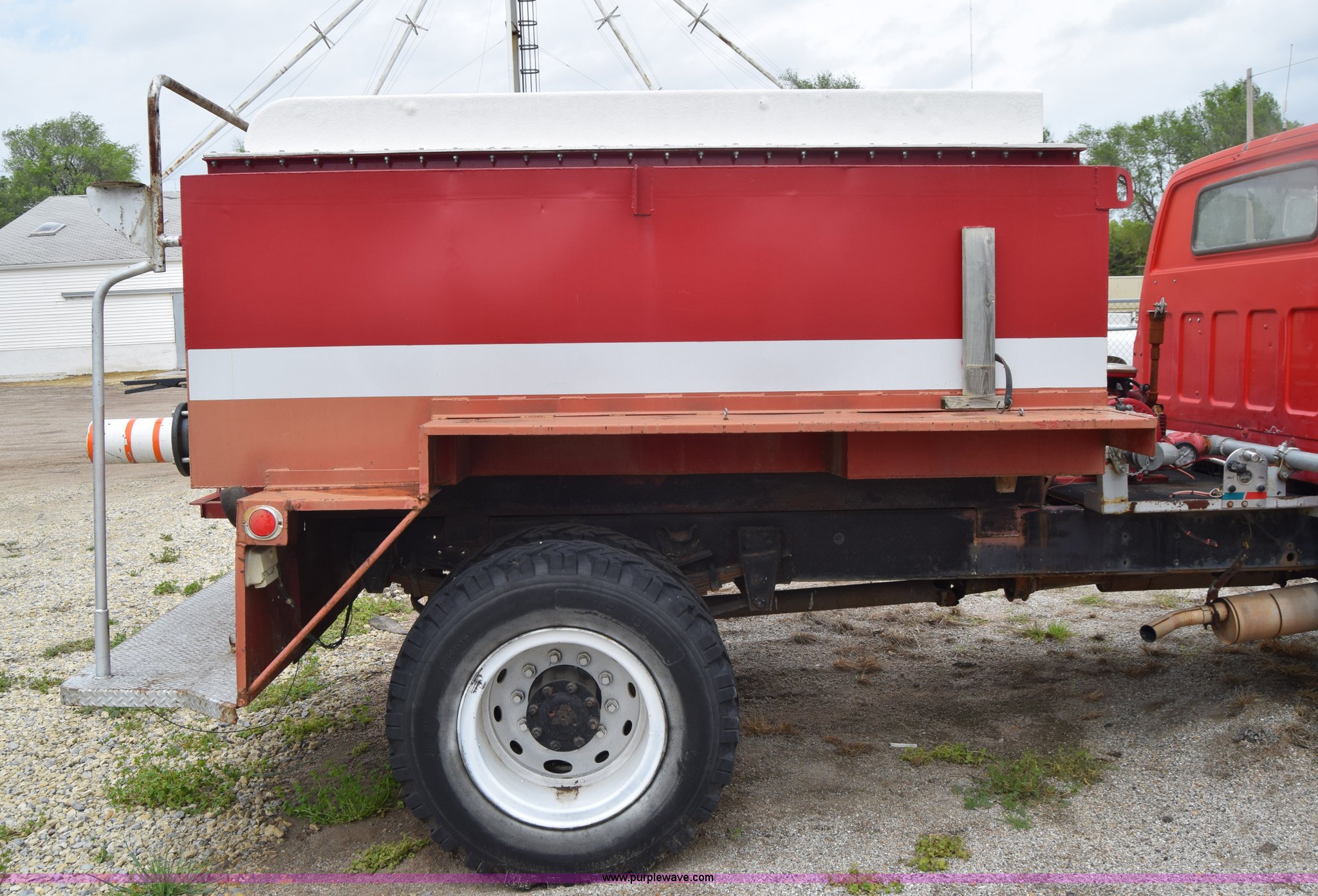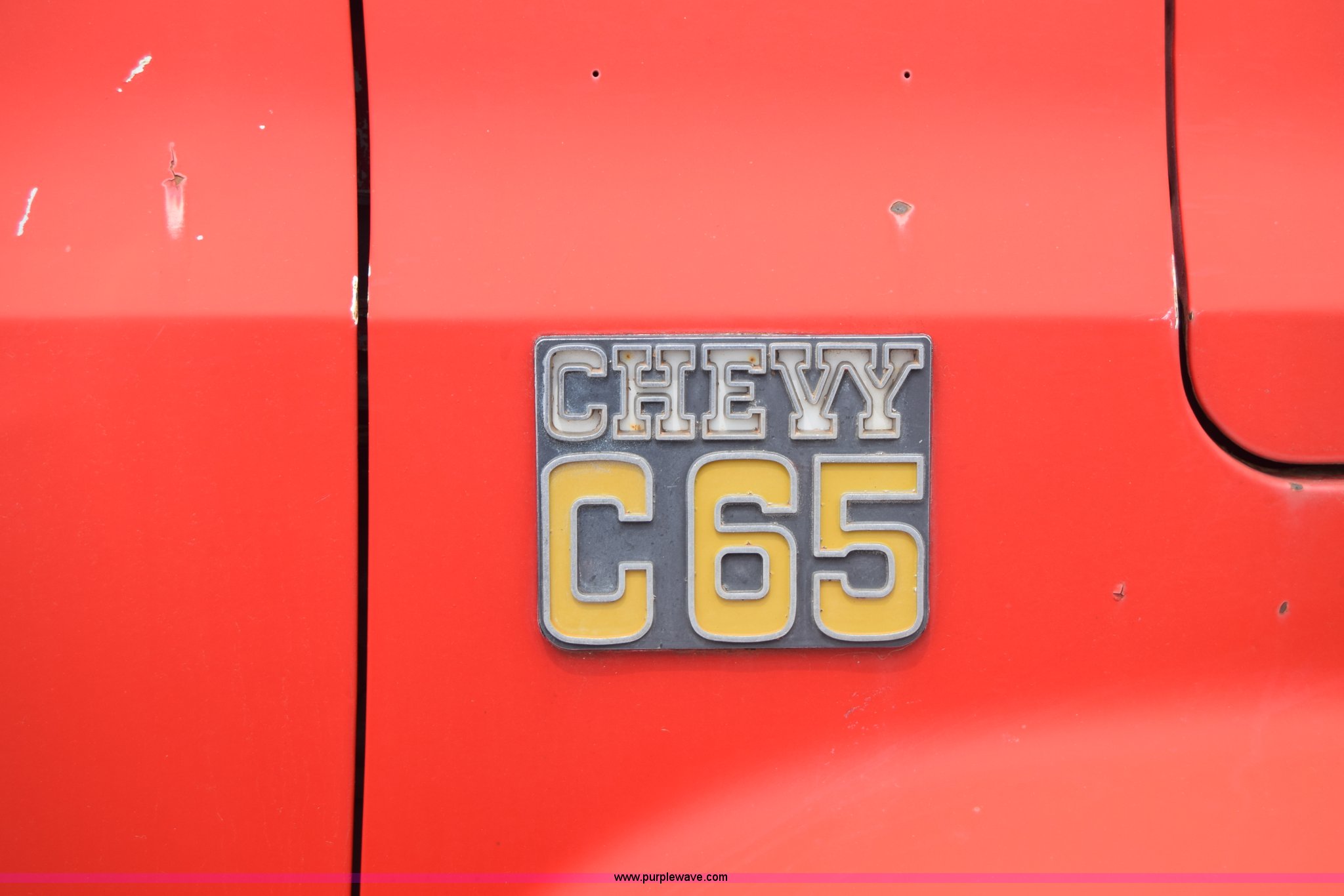Purple Wave is selling a used Tank Truck or Water Truck in Kansas. This item is a 1975 Chevrolet C65 water truck with the following: 87,958 miles on odometer, 6.5L V8 OHV 16V gas engine, Five speed manual transmission, Heat, Manual windows and locks, Cloth interior, 10'L x 6'W water tank, Front operator's station, Hale pump, Model 25FR-B42, Wisconsin gas engine, Non-operational, Fire hoses, 9.00-20 tires, 10R22.5 tires