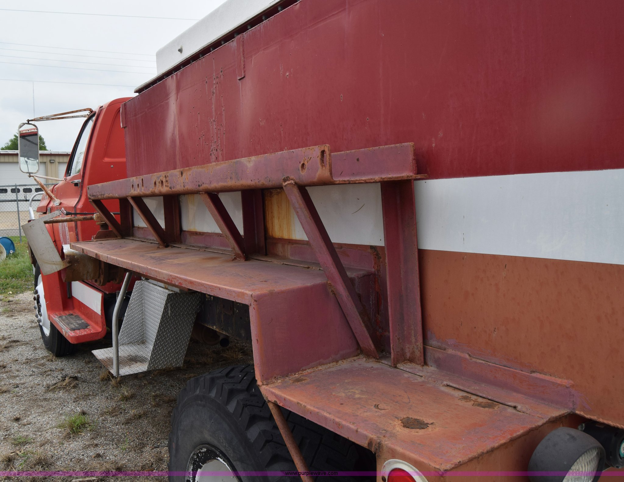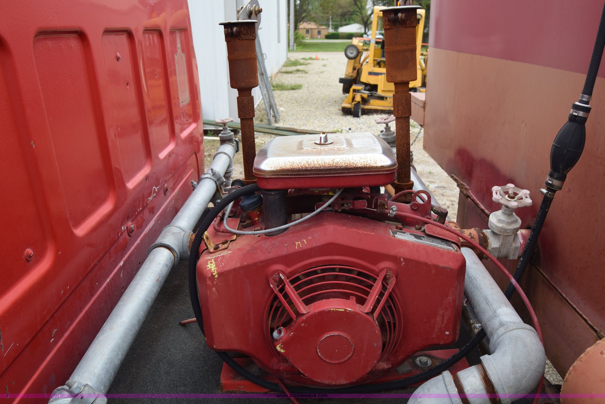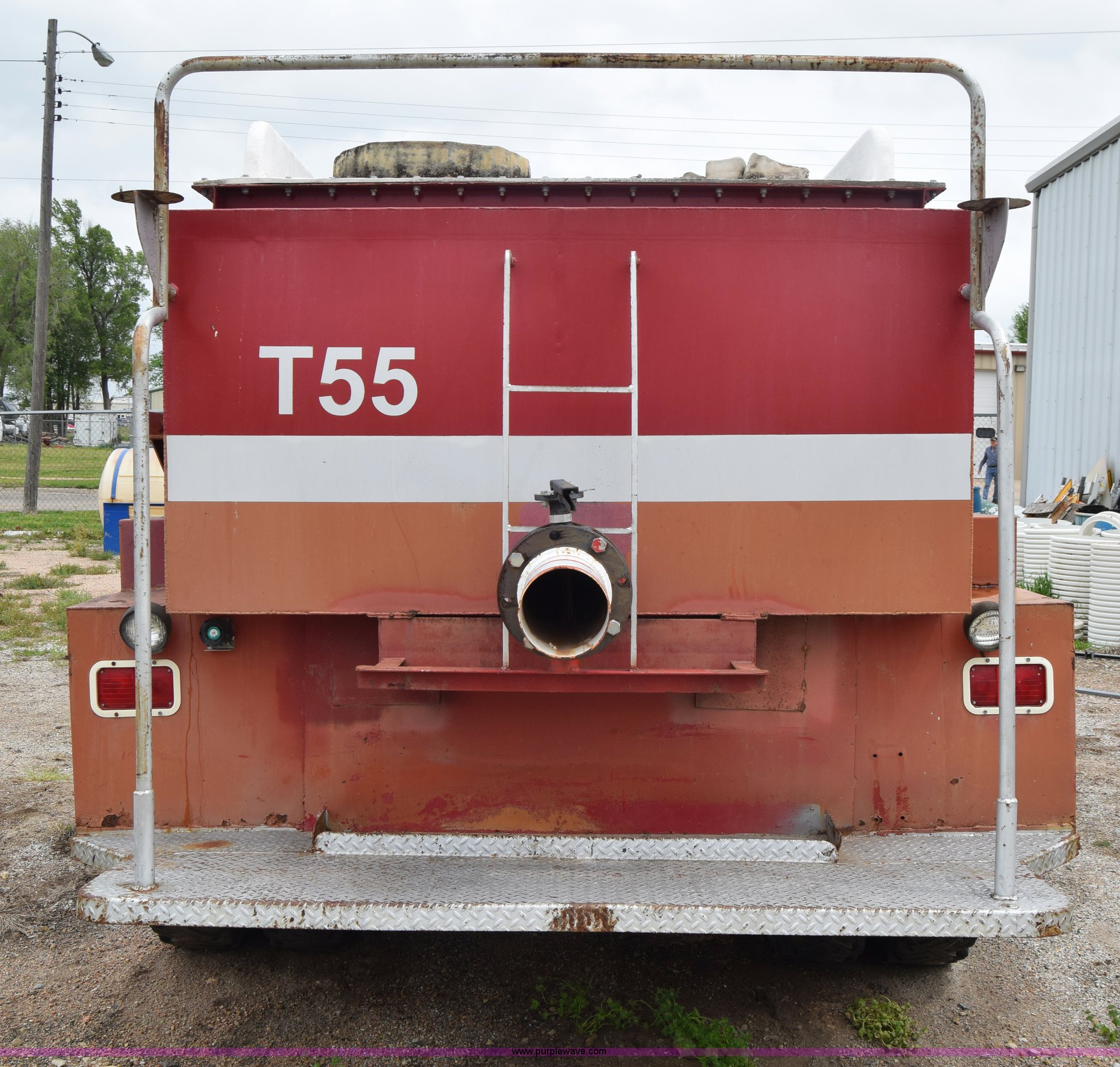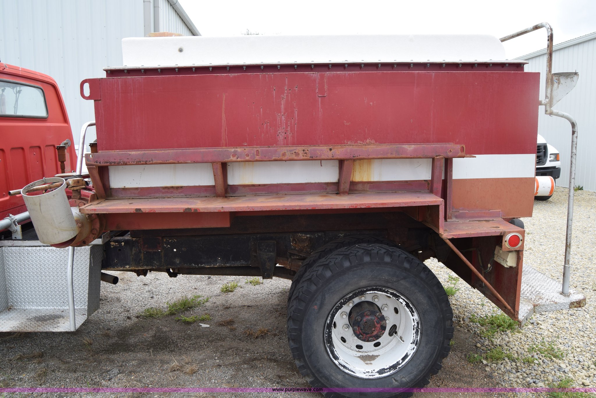 Purple Wave is selling a used Tank Truck or Water Truck in Kansas. This item is a 1975 Chevrolet C65 water truck with the following: 87,958 miles on odometer, 6.5L V8 OHV 16V gas engine, Five speed manual transmission, Heat, Manual windows and locks, Cloth interior, 10'L x 6'W water tank, Front operator's station, Hale pump, Model 25FR-B42, Wisconsin gas engine, Non-operational, Fire hoses, 9.00-20 tires, 10R22.5 tires