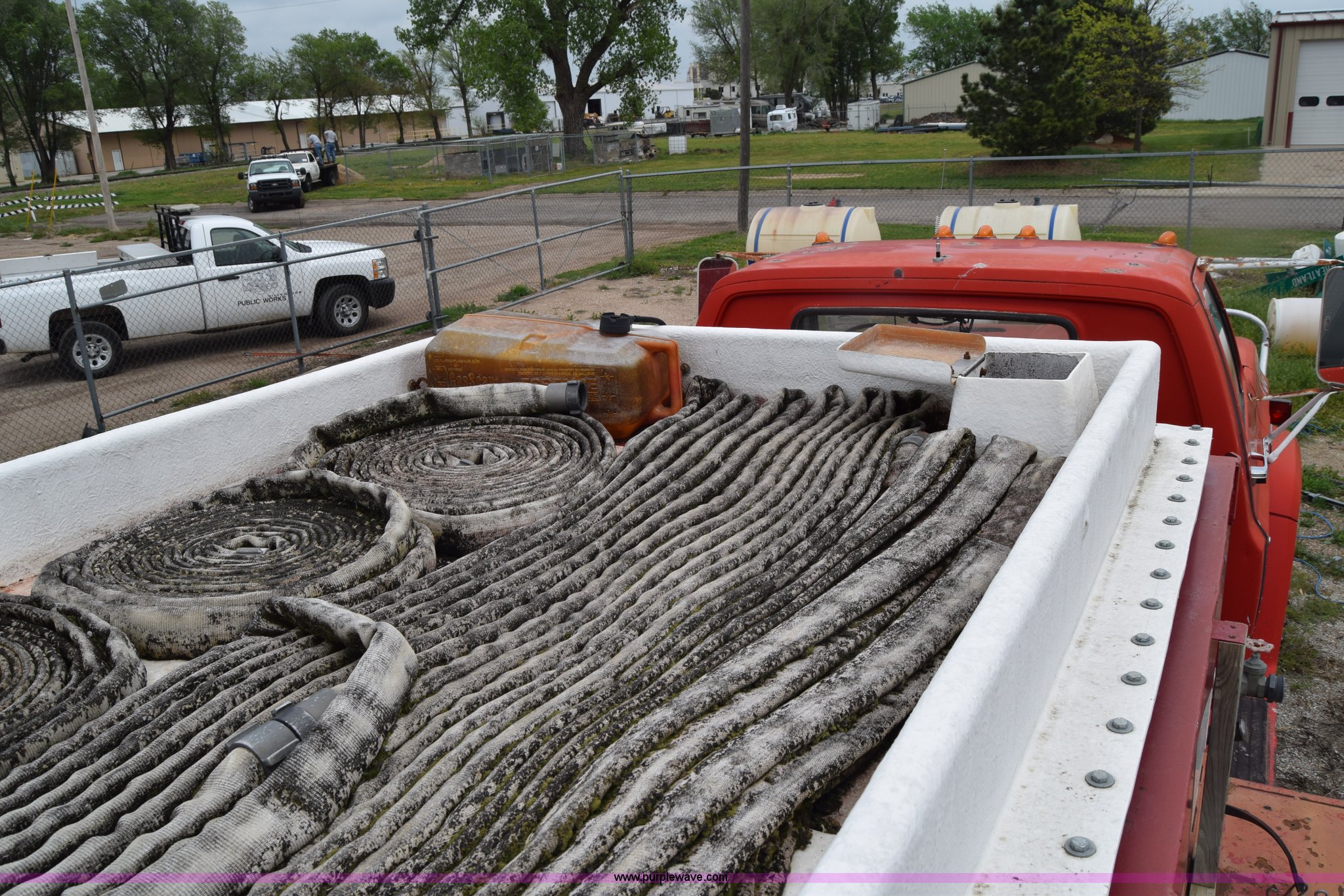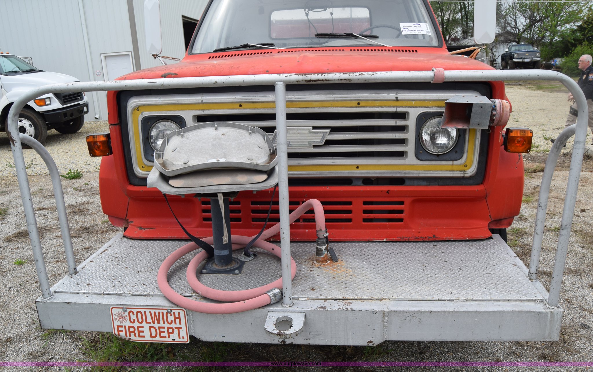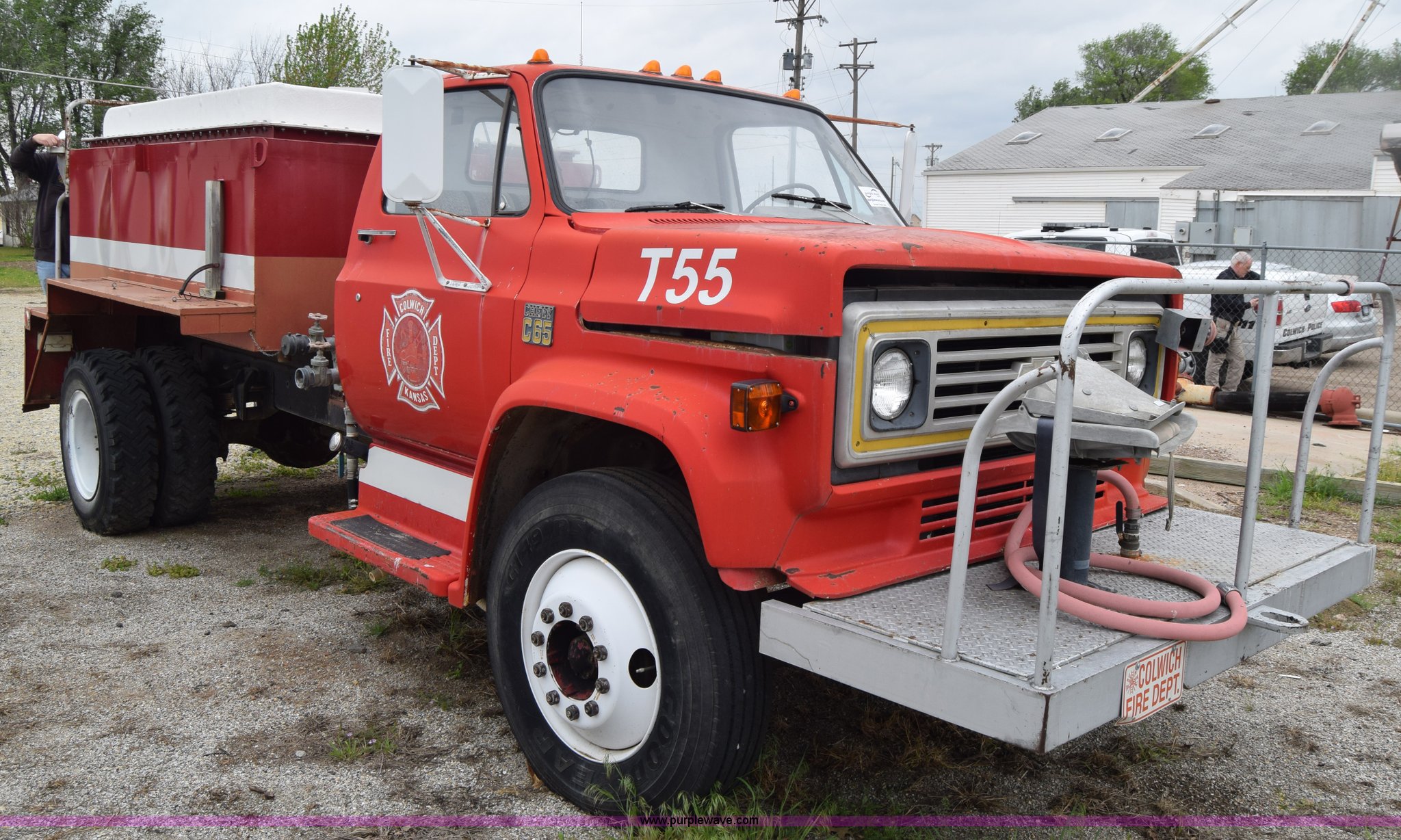 1975 Chevrolet C65 water truck. 87,958 miles on odometer, 6.5L V8 OHV 16V gas engine, Five speed manual transmission, Heat, Manual windows and locks, Cloth interior, 10'L x 6'W water tank, Front operator's station, Hale pump Model 25FR-B42, Wisconsin gas engine, Non-operational, Fire hoses, 9.00-20 tires, 10R22.5 tires. CCE665V132250. City of Colwich. 115 N 3rd. Colwich, KS 67030