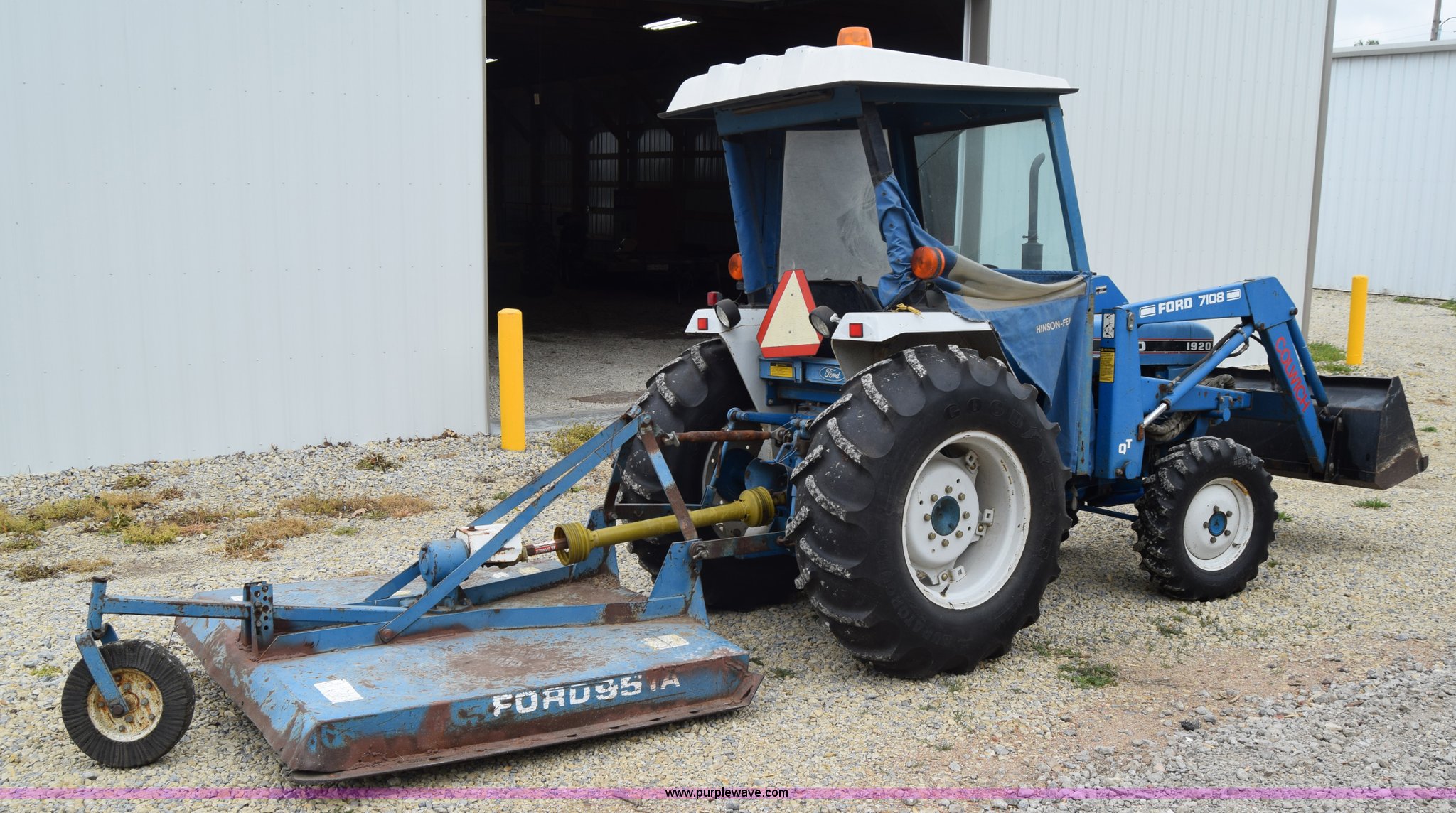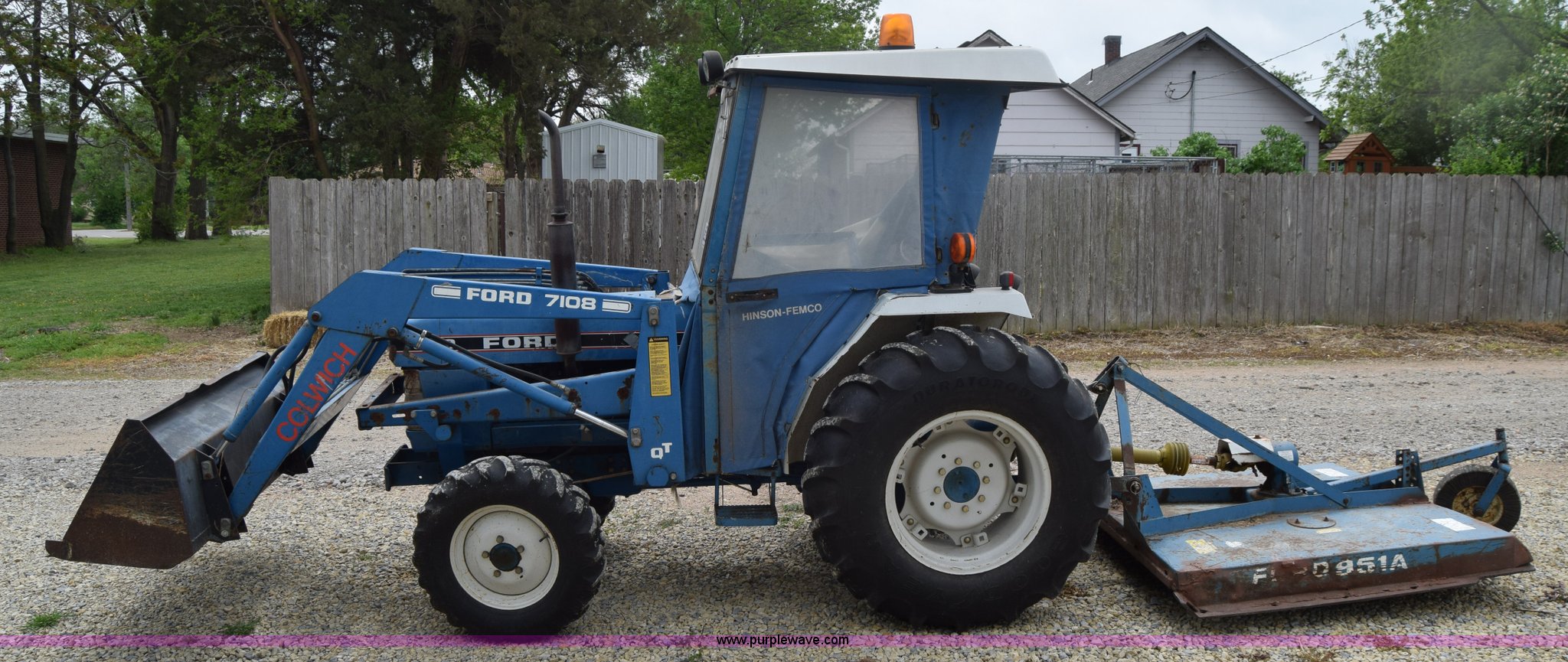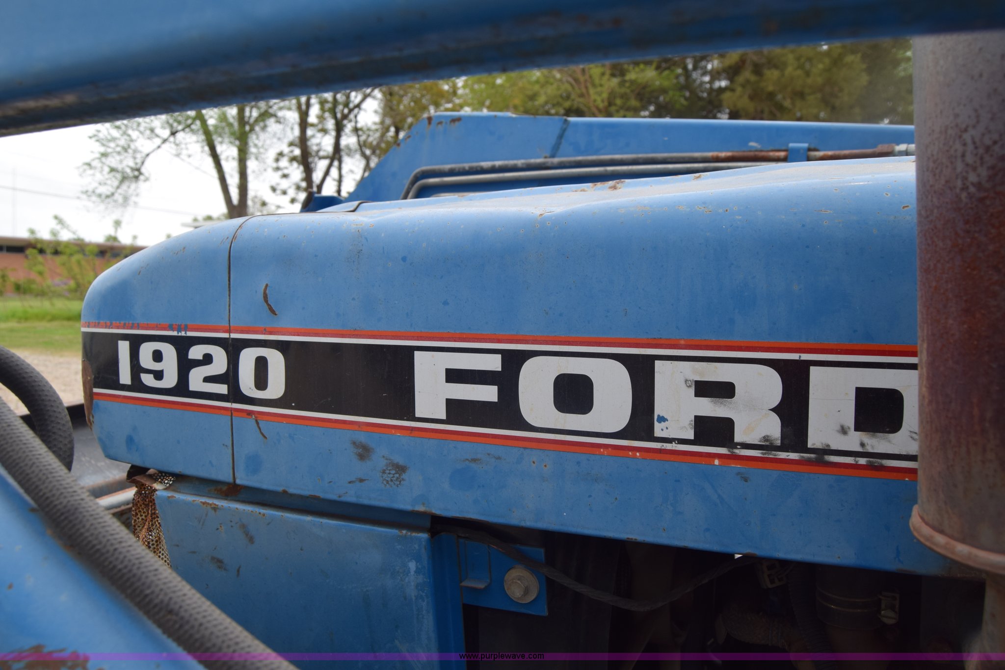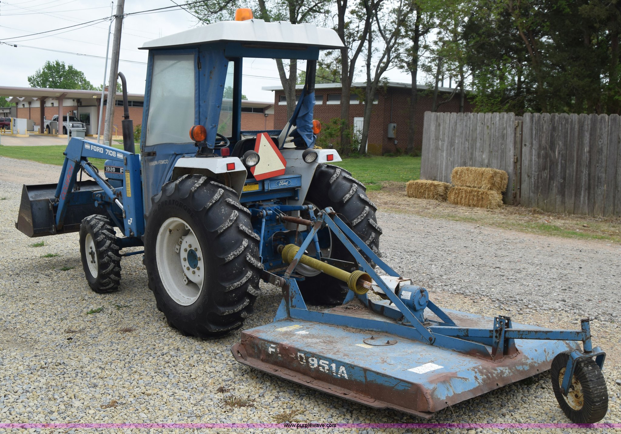 Purple Wave is selling a used Tractor in Kansas. This item is a Ford 1920 tractor with the following: 3,095 hours on meter, Shibaura N844 four cylinder diesel engine, 32 HP, Manual transmission, 12F-4R gears, Canopy, Spring suspension seat, Ford 7108 loader, 60"W bucket, Two-lever control, Ford 951A mower, 5'W cut, 540 PTO, Three point blade, 6'W x 14"H, Three point, Draw bar, 540 PTO, 9.8 gallon fuel tank, 69.9" wheelbase, 8-16 front tires, 14.9-24 rear tires, 3,069 lbs. base operating weight, Dents, Scratches, Seat torn