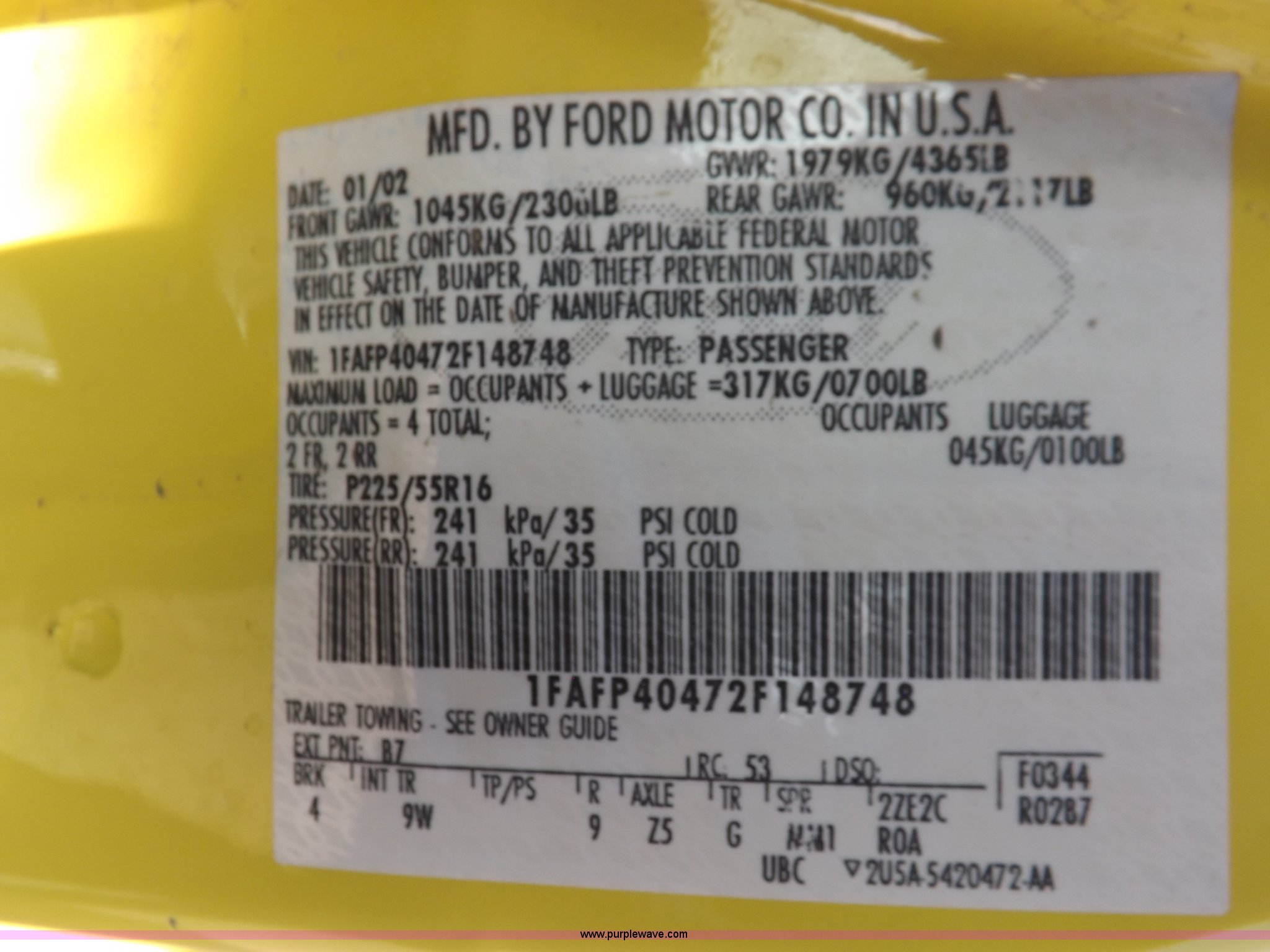 Purple Wave is selling a used Passenger Vehicle in Kansas. This item is a 2002 Ford Mustang with the following: 101,807 miles on odometer, 3.8L V6 OHV 12V gas engine, Five speed manual transmission, AC and heat, Tilt, Cruise, AM/FM/CD, Remote control, Power windows, locks, mirrors, and seats, Cloth interior, 235/55R17 tires, Interior/exterior cosmetic damage, Windshield cracked, Seat torn