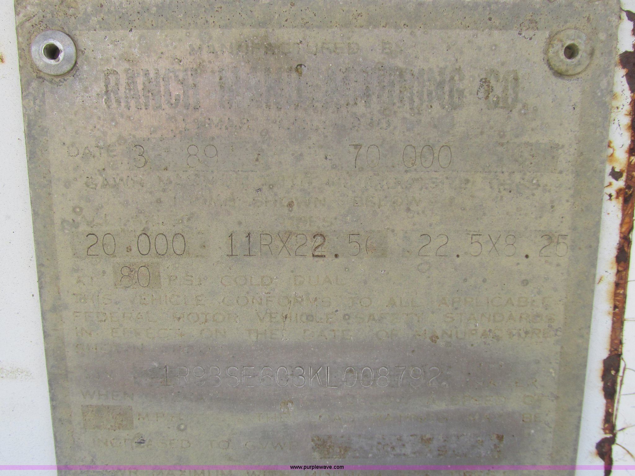 1989 Ranch belly dump trailer. 42'L x 8'W, Spring suspension, Air brakes, Steel wheels, 11.00x22.5 tires, GVWR 70,000 lbs. 1R9BSE603KL008792. Equipment Service Corp.. 280 S 11th St. Wahpeton, ND 58075