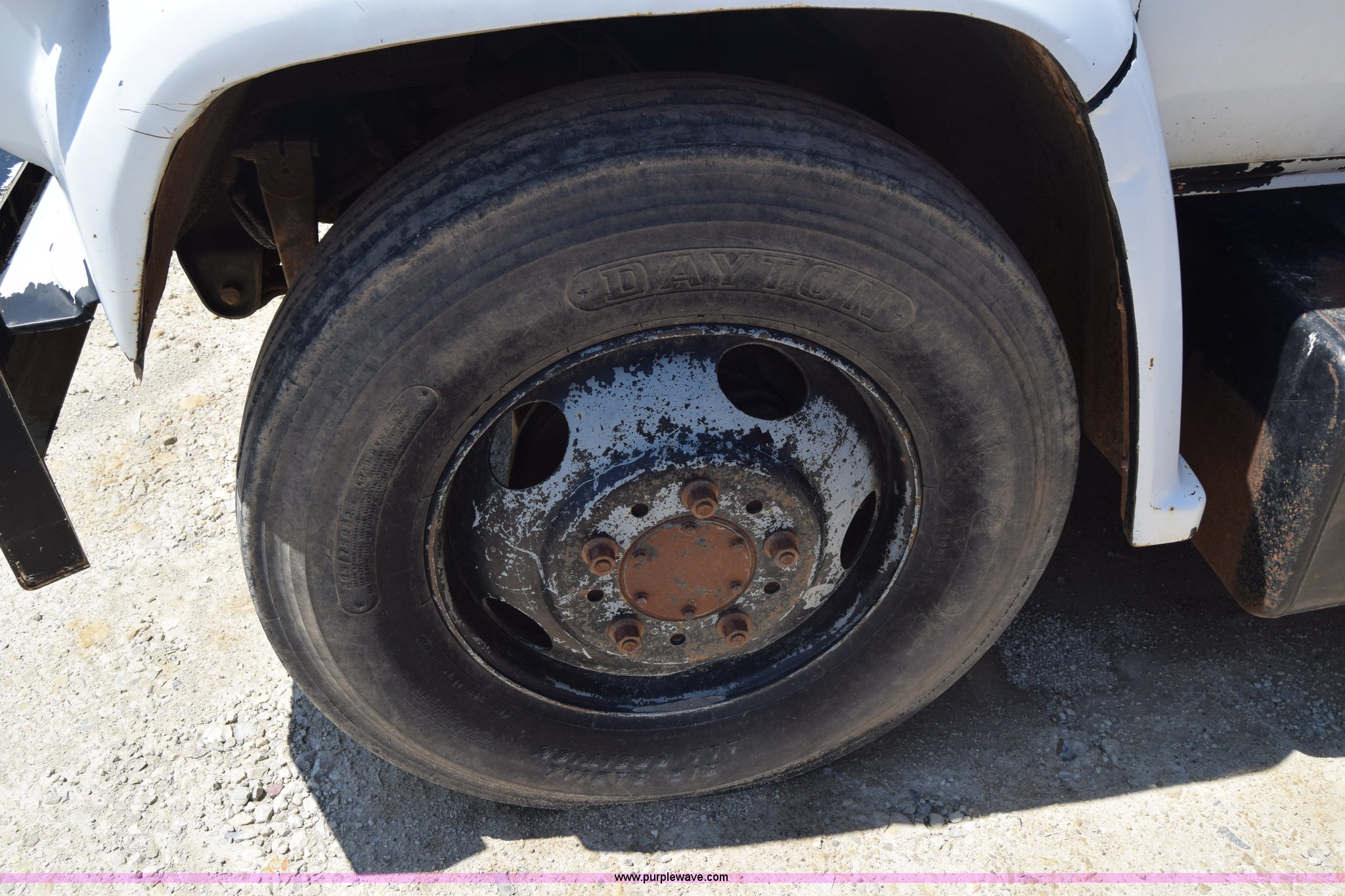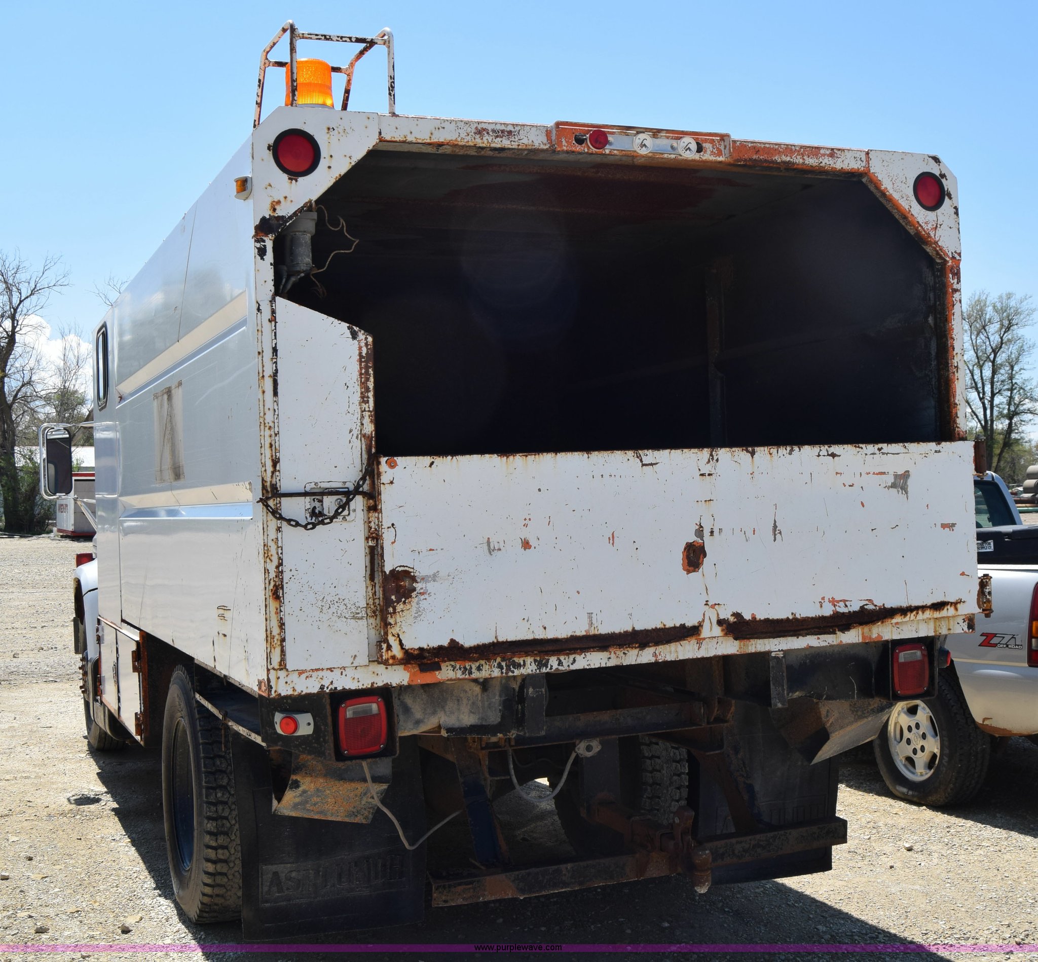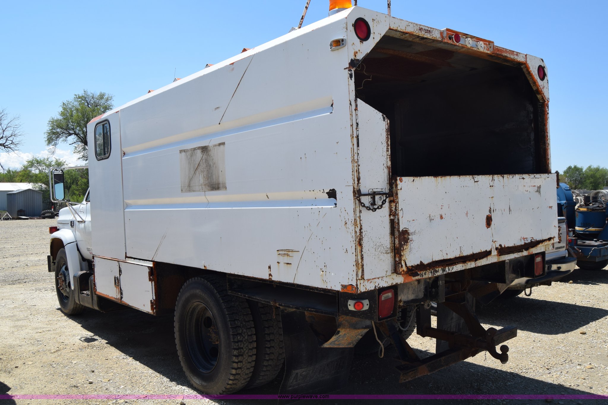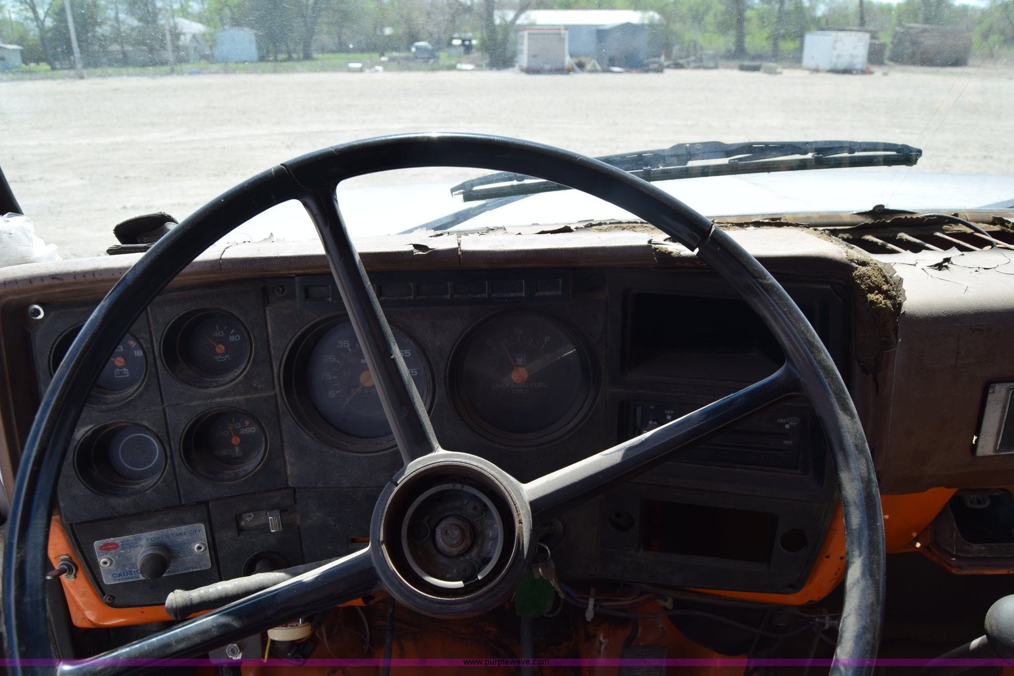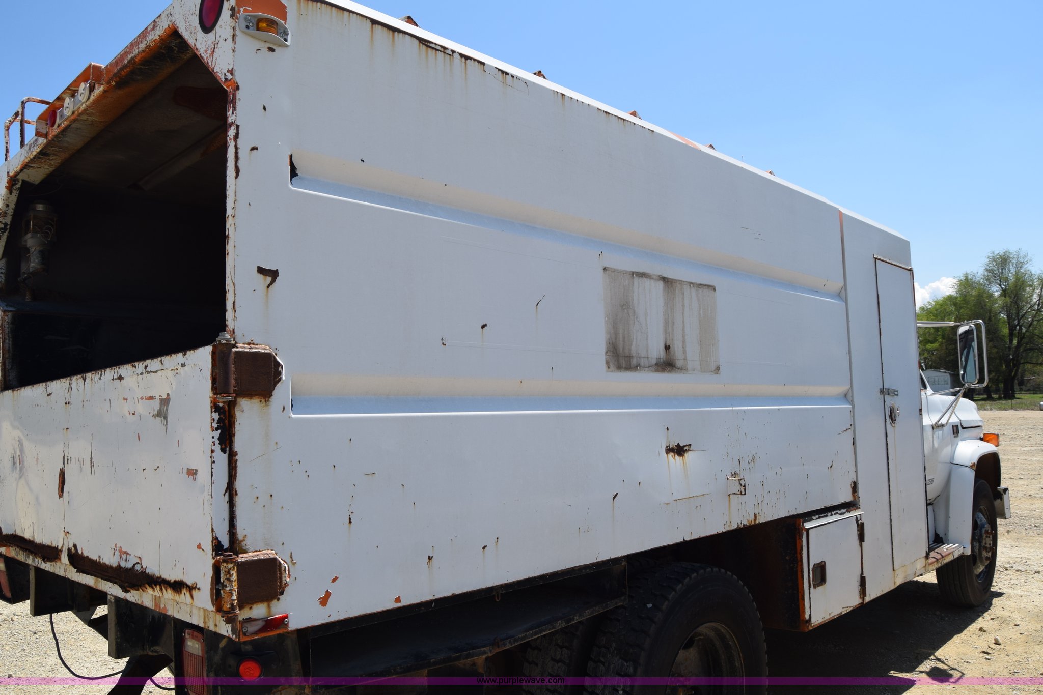 Purple Wave is selling a used Box Truck in Kansas. This item is a 1990 GMC TopKick chipper truck with the following: 27,103 miles on odometer, Actual mileage unknown, 6.0L V8 gas engine, Four speed manual transmission, Heat, Manual windows and locks, Cloth interior, Muncie PTO, 14'8"L x 7'9"W x 5'H chipper bed, Side storage, Pintle hitch ball hitch combo, 295/75R22.5 tires, Dash damaged, Rust