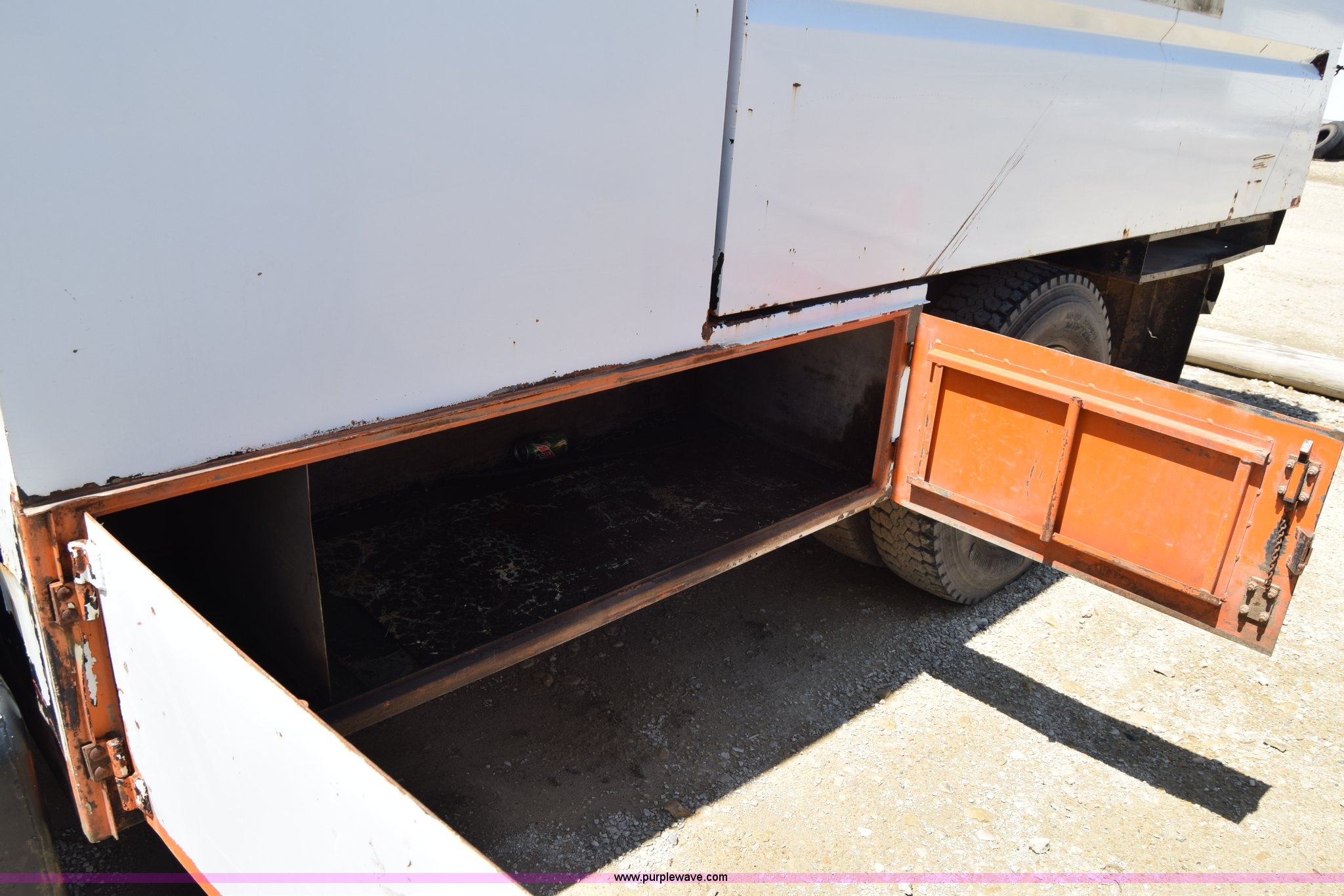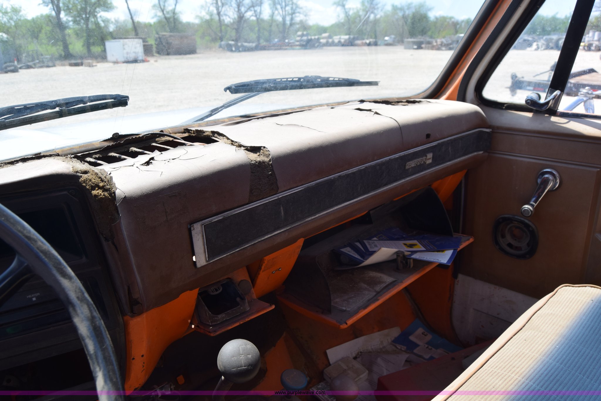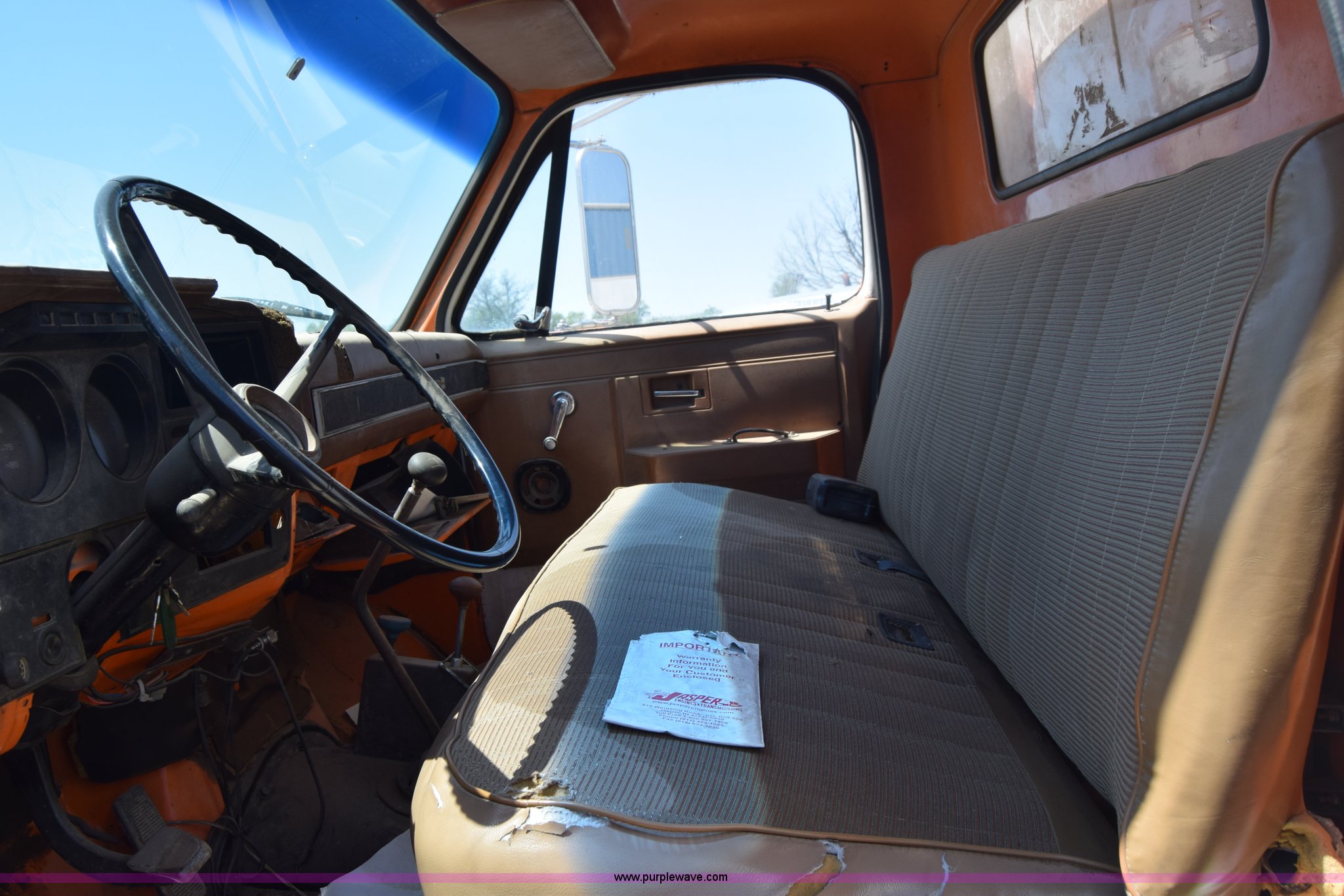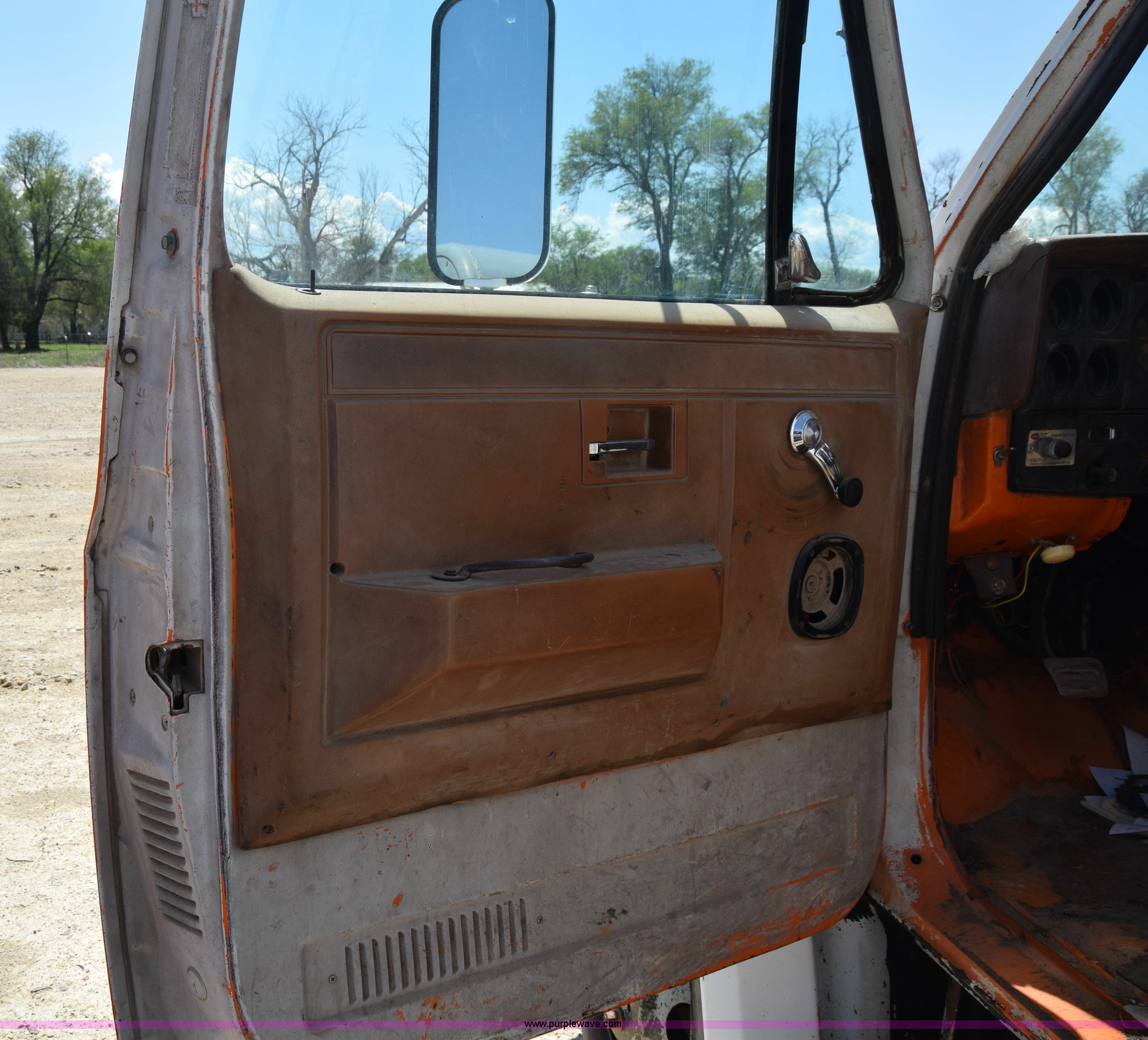 Purple Wave is selling a used Box Truck in Kansas. This item is a 1990 GMC TopKick chipper truck with the following: 27,103 miles on odometer, Actual mileage unknown, 6.0L V8 gas engine, Four speed manual transmission, Heat, Manual windows and locks, Cloth interior, Muncie PTO, 14'8"L x 7'9"W x 5'H chipper bed, Side storage, Pintle hitch ball hitch combo, 295/75R22.5 tires, Dash damaged, Rust