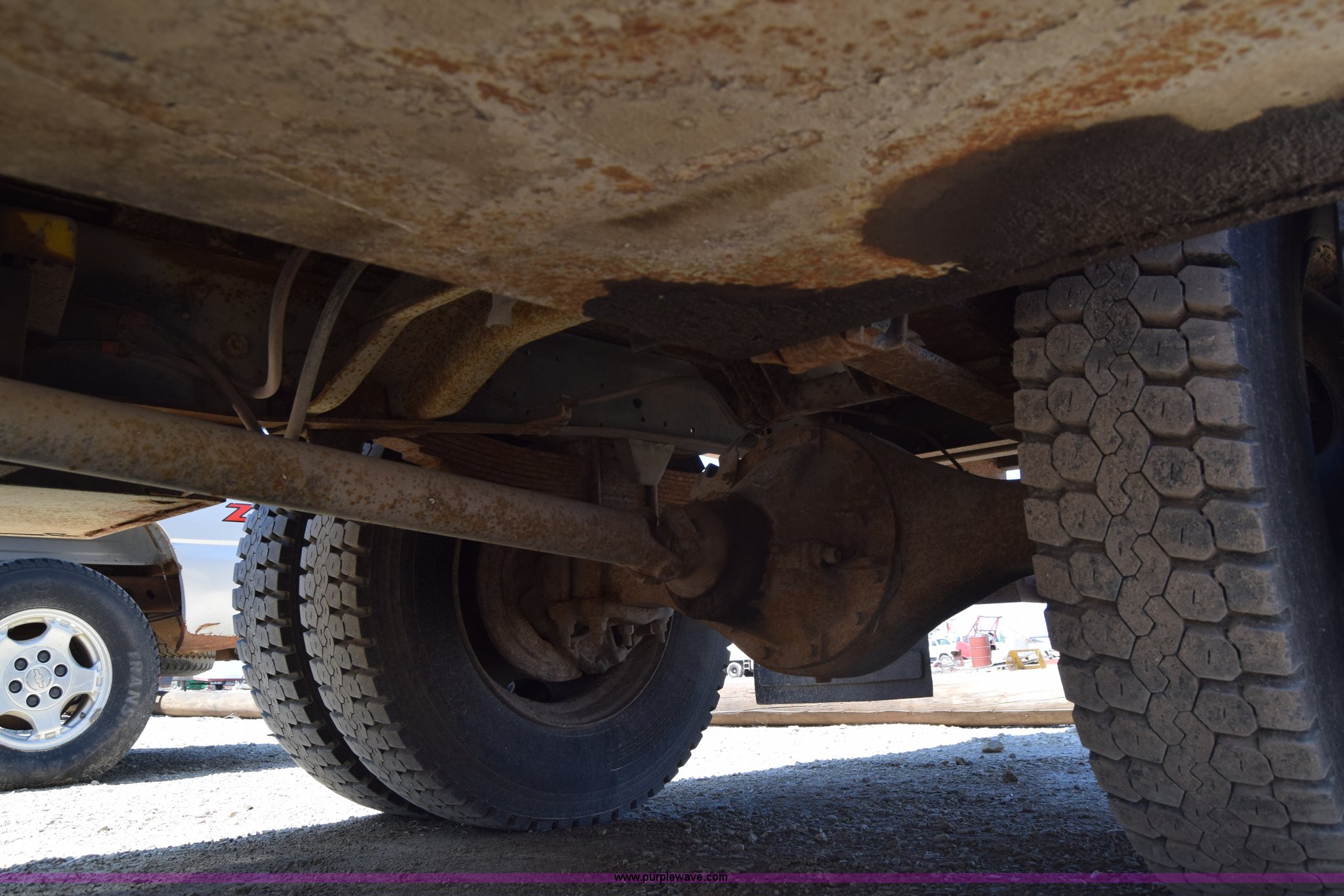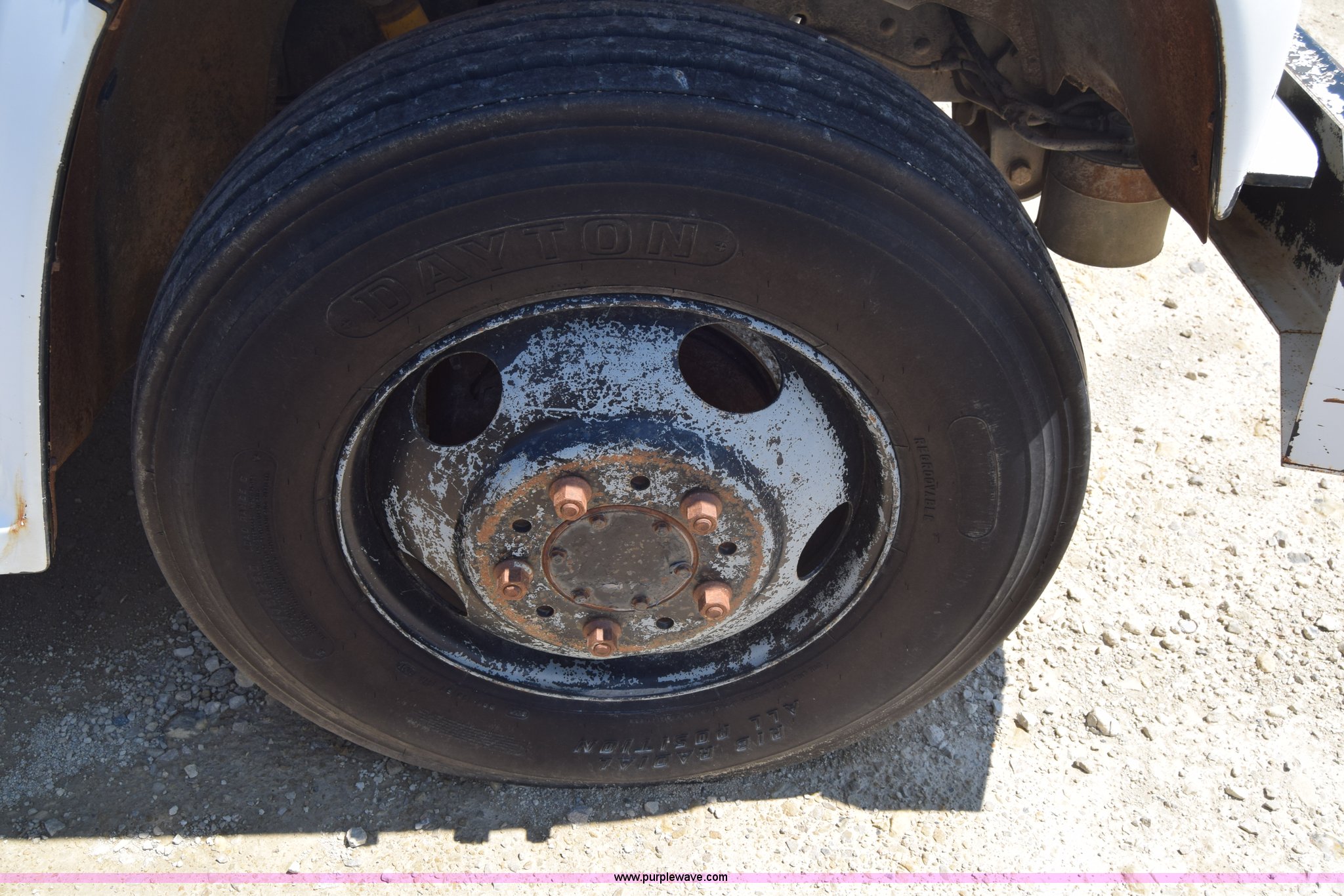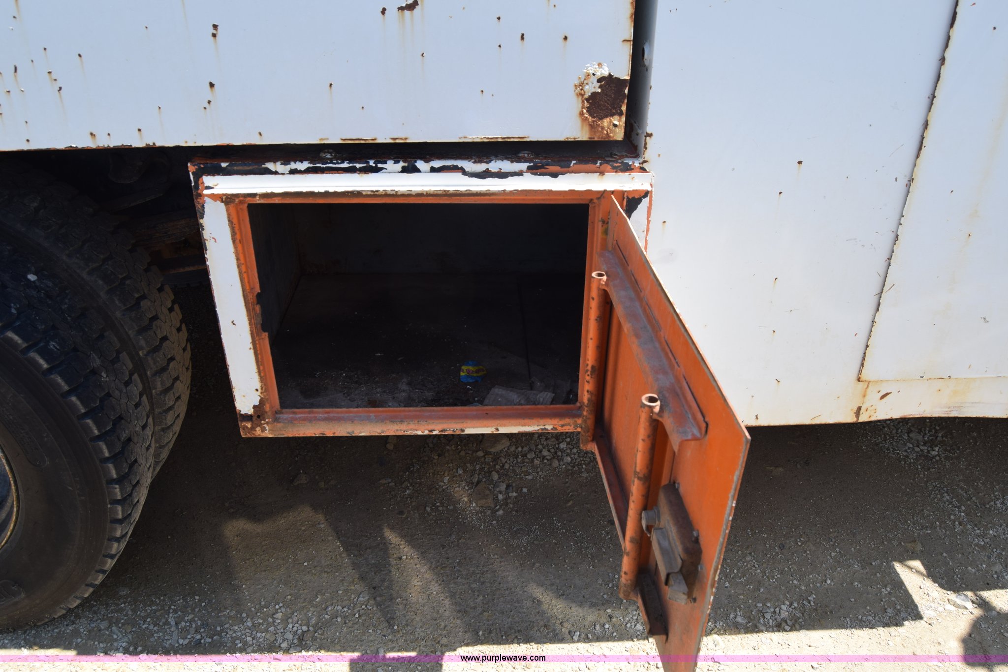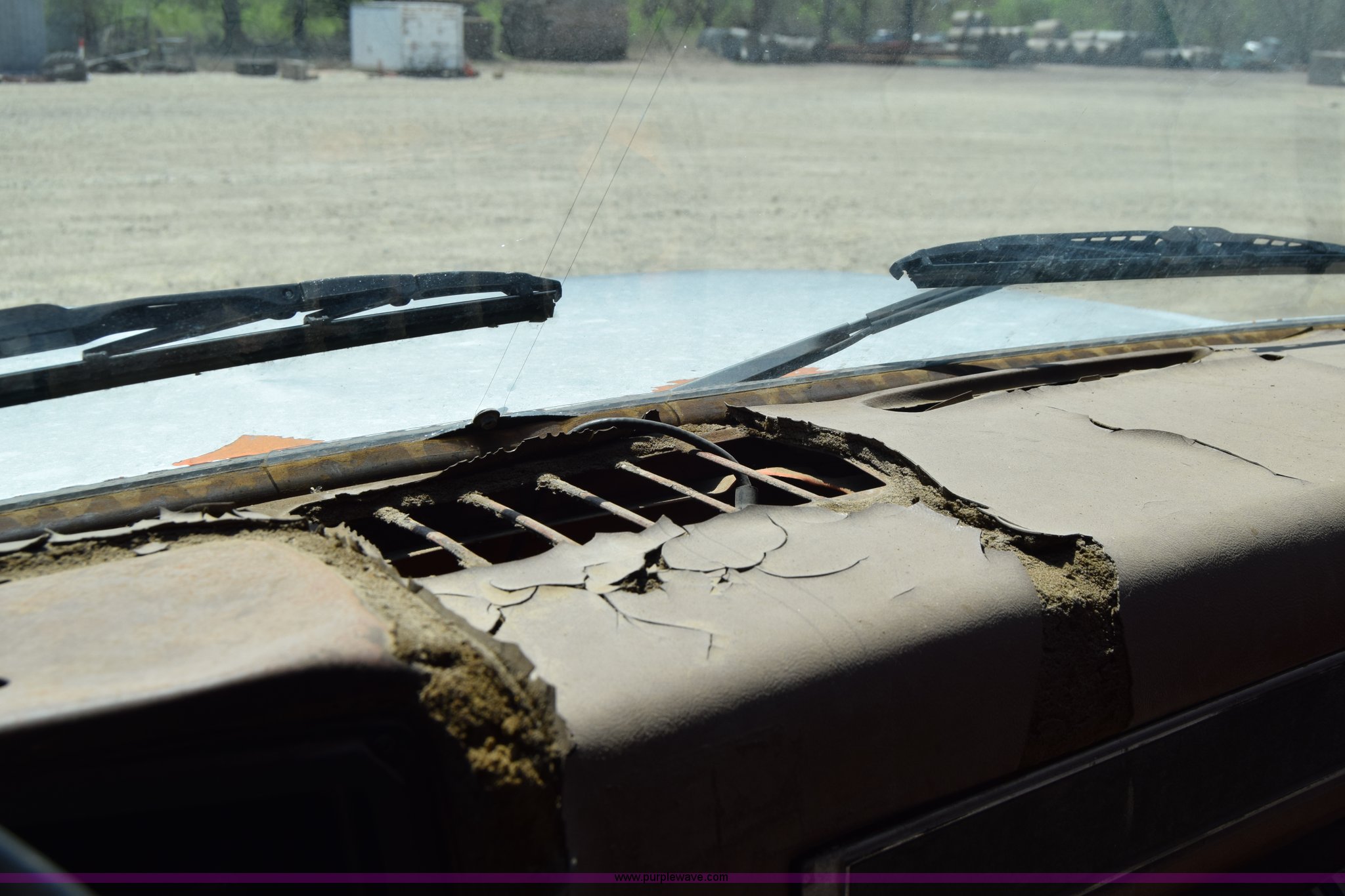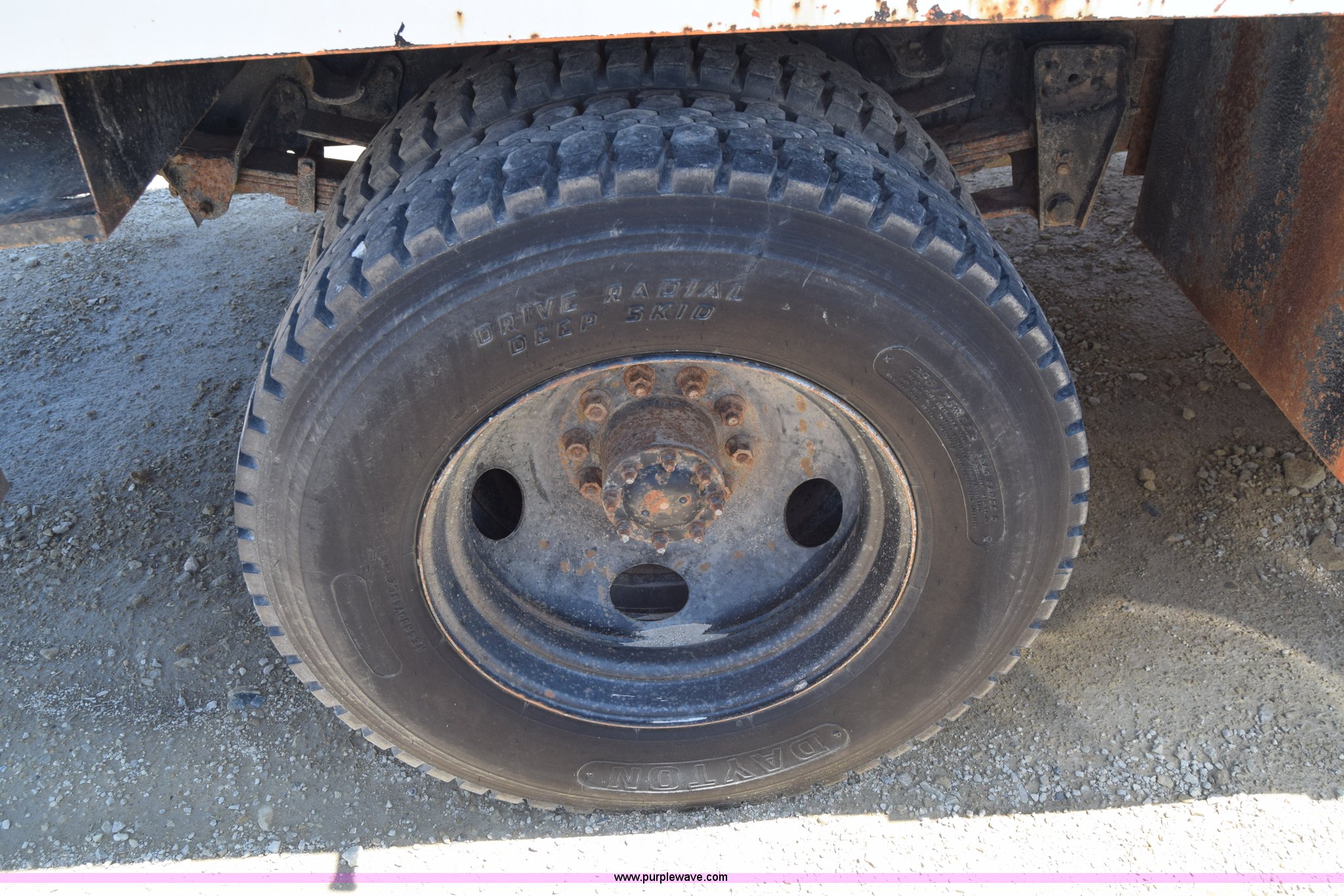 Purple Wave is selling a used Box Truck in Kansas. This item is a 1990 GMC TopKick chipper truck with the following: 27,103 miles on odometer, Actual mileage unknown, 6.0L V8 gas engine, Four speed manual transmission, Heat, Manual windows and locks, Cloth interior, Muncie PTO, 14'8"L x 7'9"W x 5'H chipper bed, Side storage, Pintle hitch ball hitch combo, 295/75R22.5 tires, Dash damaged, Rust