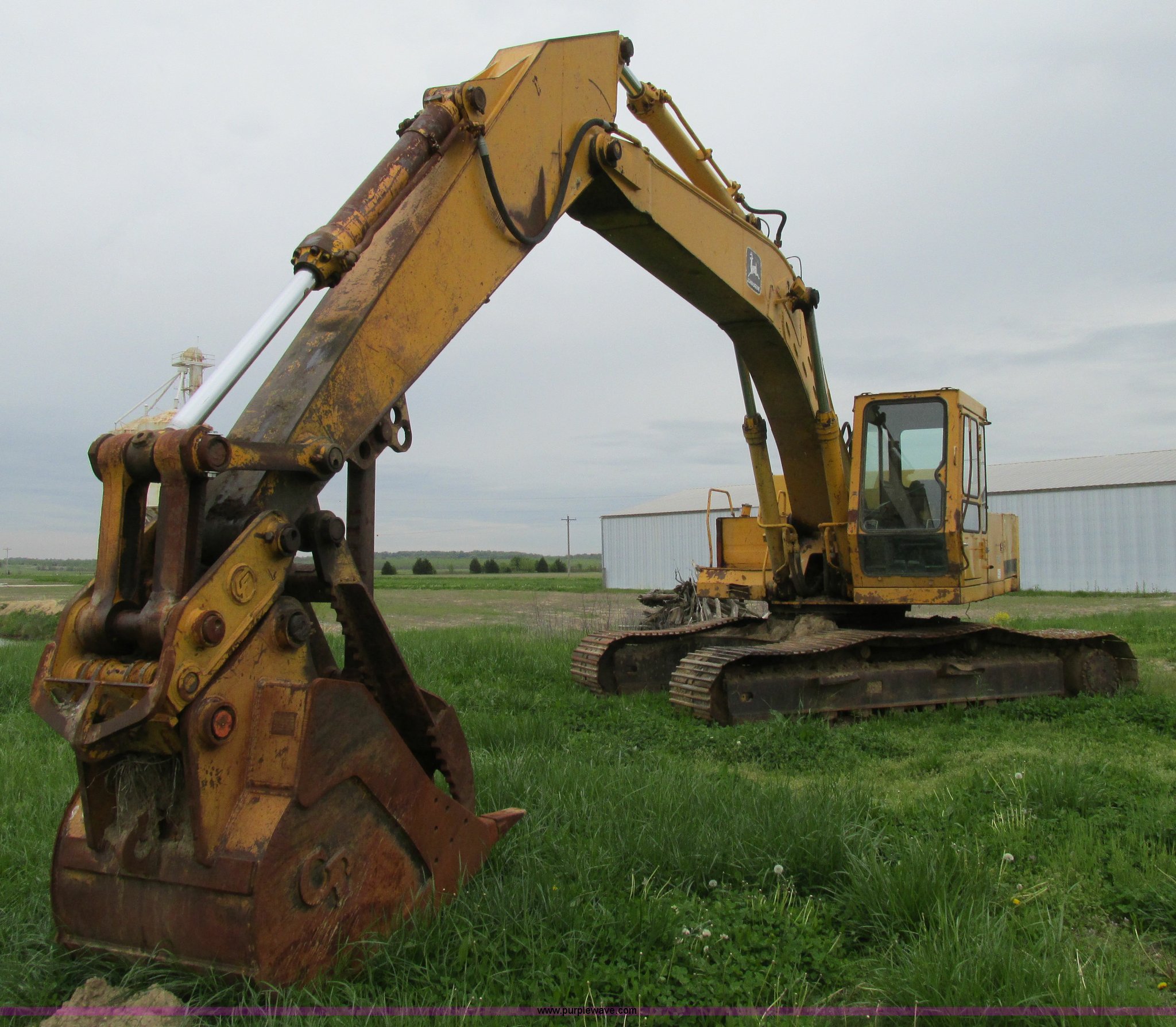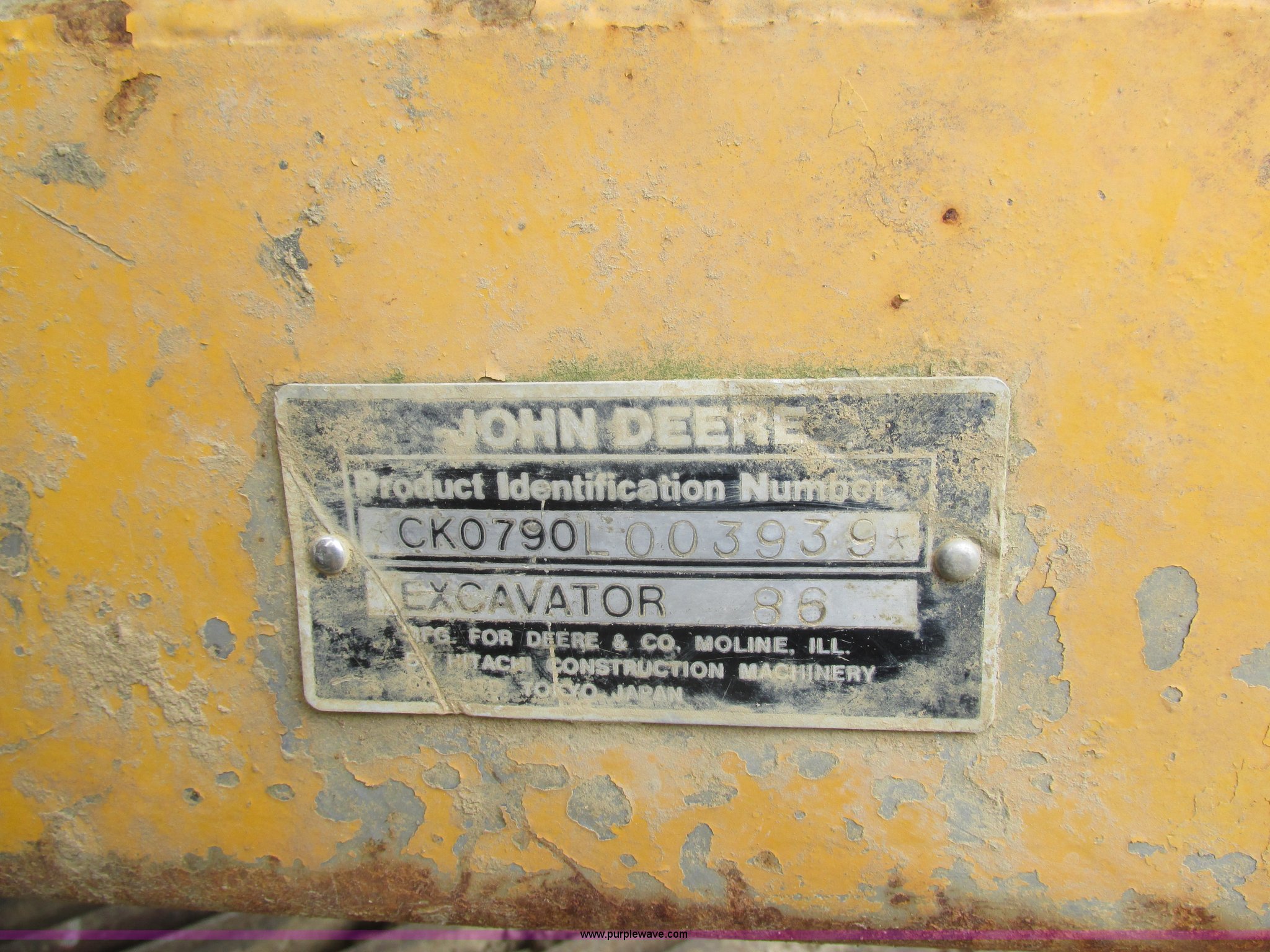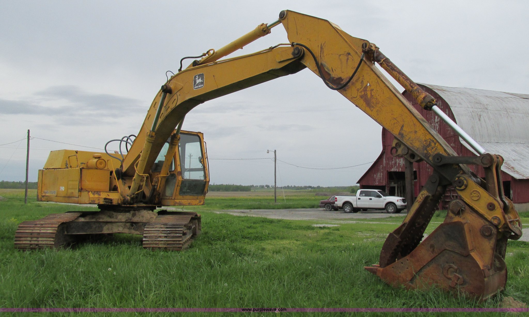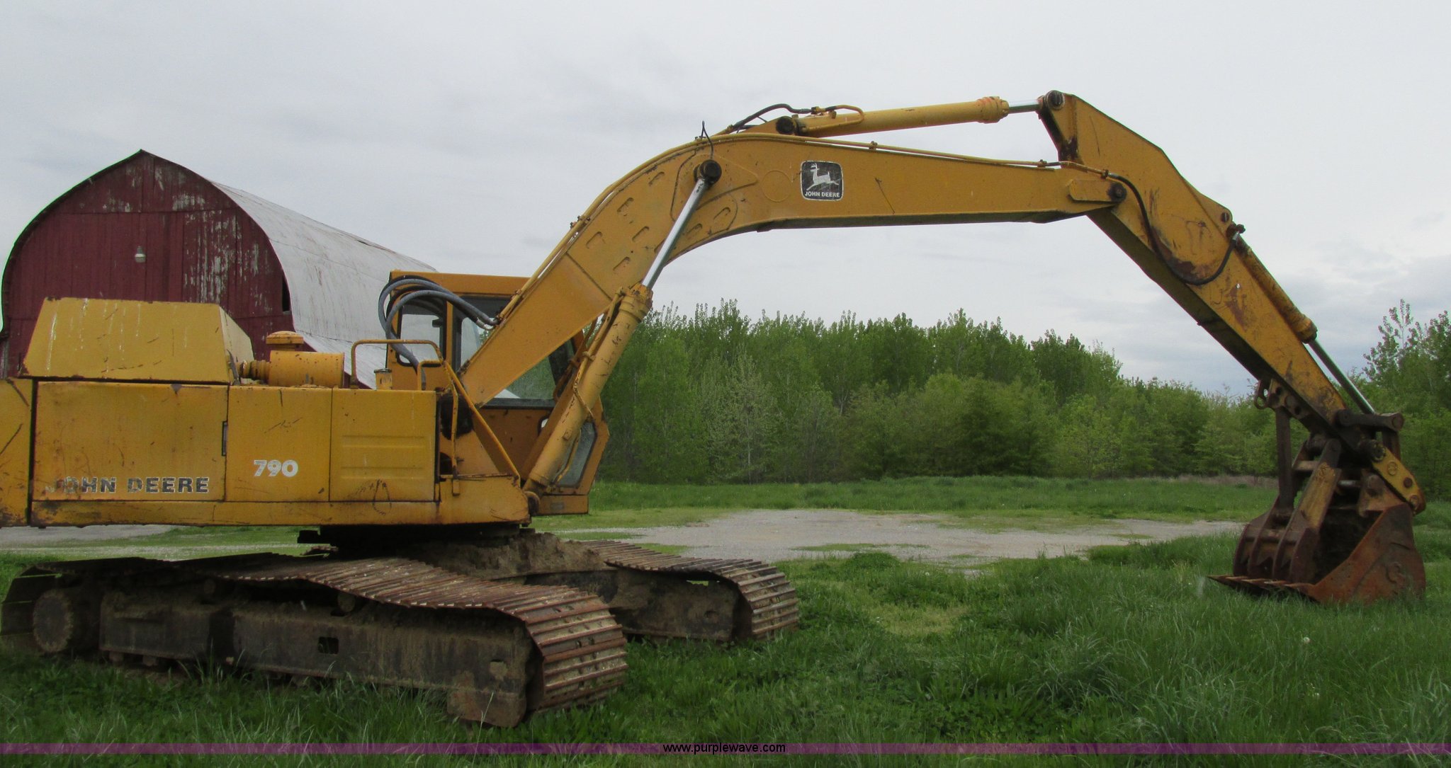 Purple Wave is selling a used Hydraulic Excavator in Illinois. This item is a 1986 John Deere 790 excavator with the following: John Deere 466 C.I.D. six cylinder diesel engine, Hydrostatic transmission, AC and heat, Spring suspension seat, Joystick controls, Standard boom, 12' stick length, CP 48" bucket, Manual thumb, Rear counter weights, 32"W steel double grouser track pads, 50,200 lbs. base operating weight, Glass cracked, Hydraulic pump leaks, Low hydraulic pressure, Serial CK0790L003939