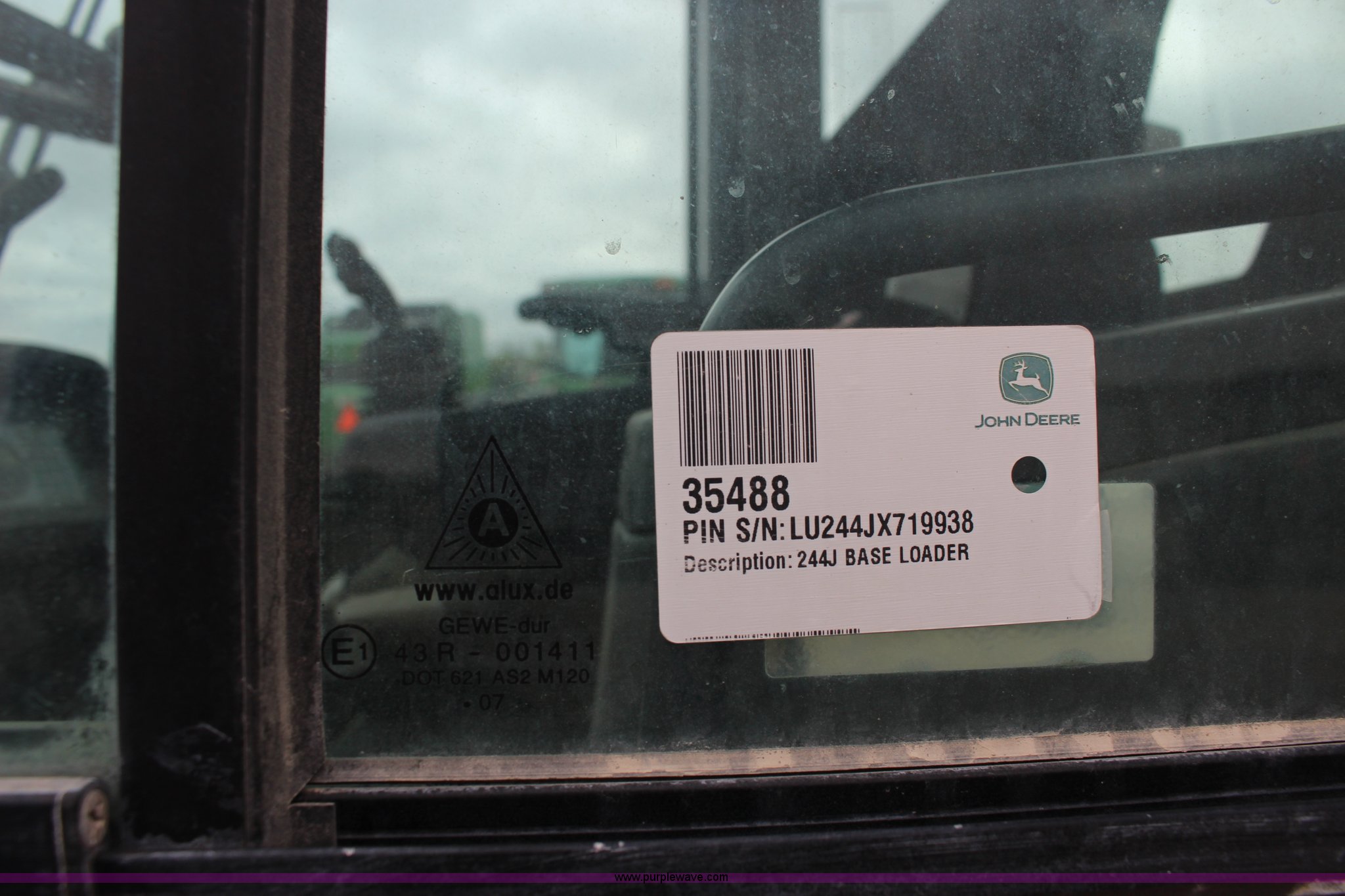 Purple Wave is selling a used Wheel Loader in Kansas. This item is a 2008 John Deere 244J wheel loader with the following: 9,515 hours on meter, John Deere E4024T diesel engine, 59 HP, Hydrostatic transmission, 2F-2R gears, EROPS, AC and heat, AM/FM, 7'W bucket, Auxiliary hydraulic remote, 12.5/80-18 NHS tires, Serial LU244JX719938, Stock# 35488