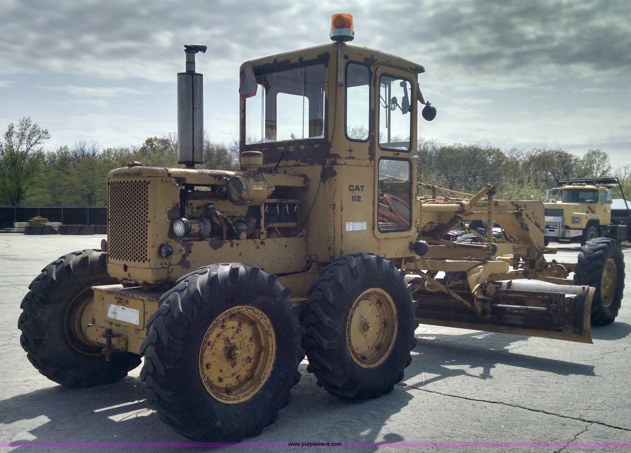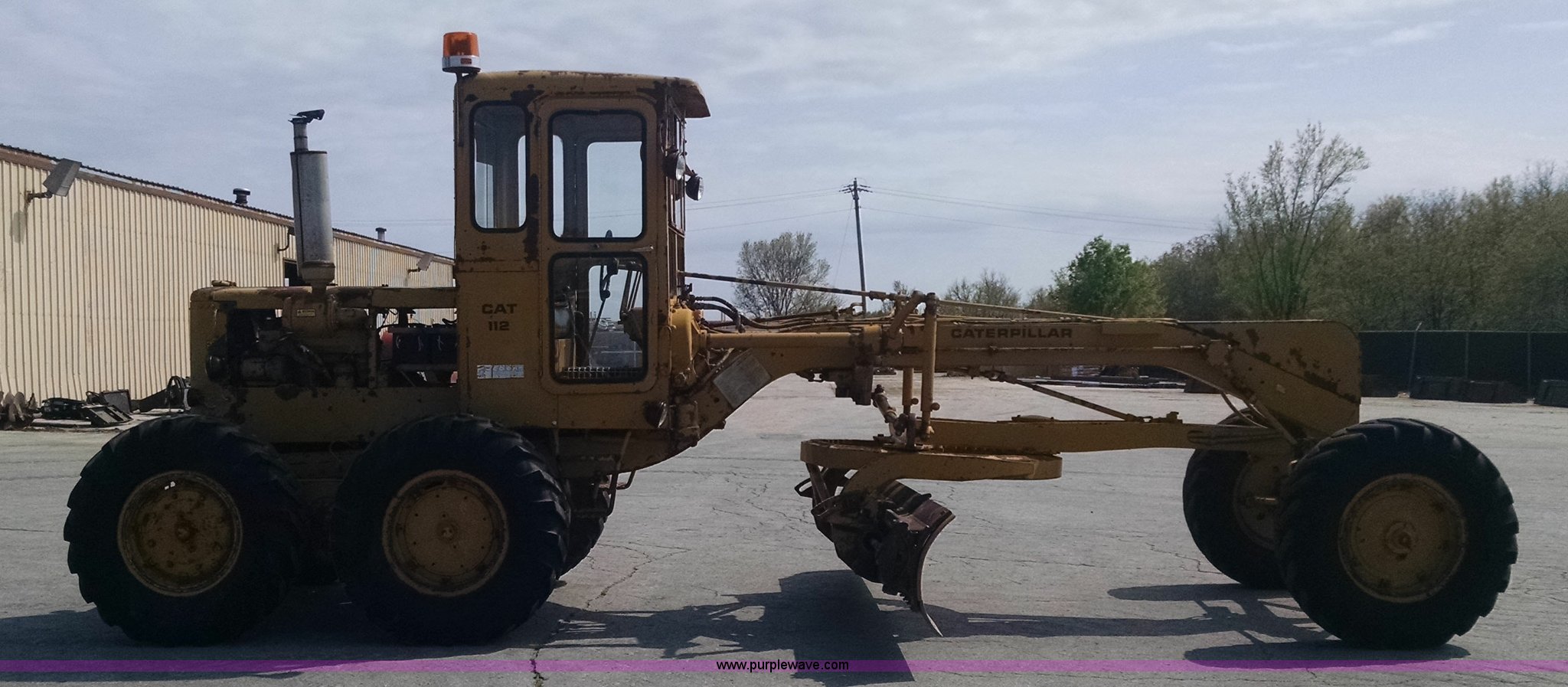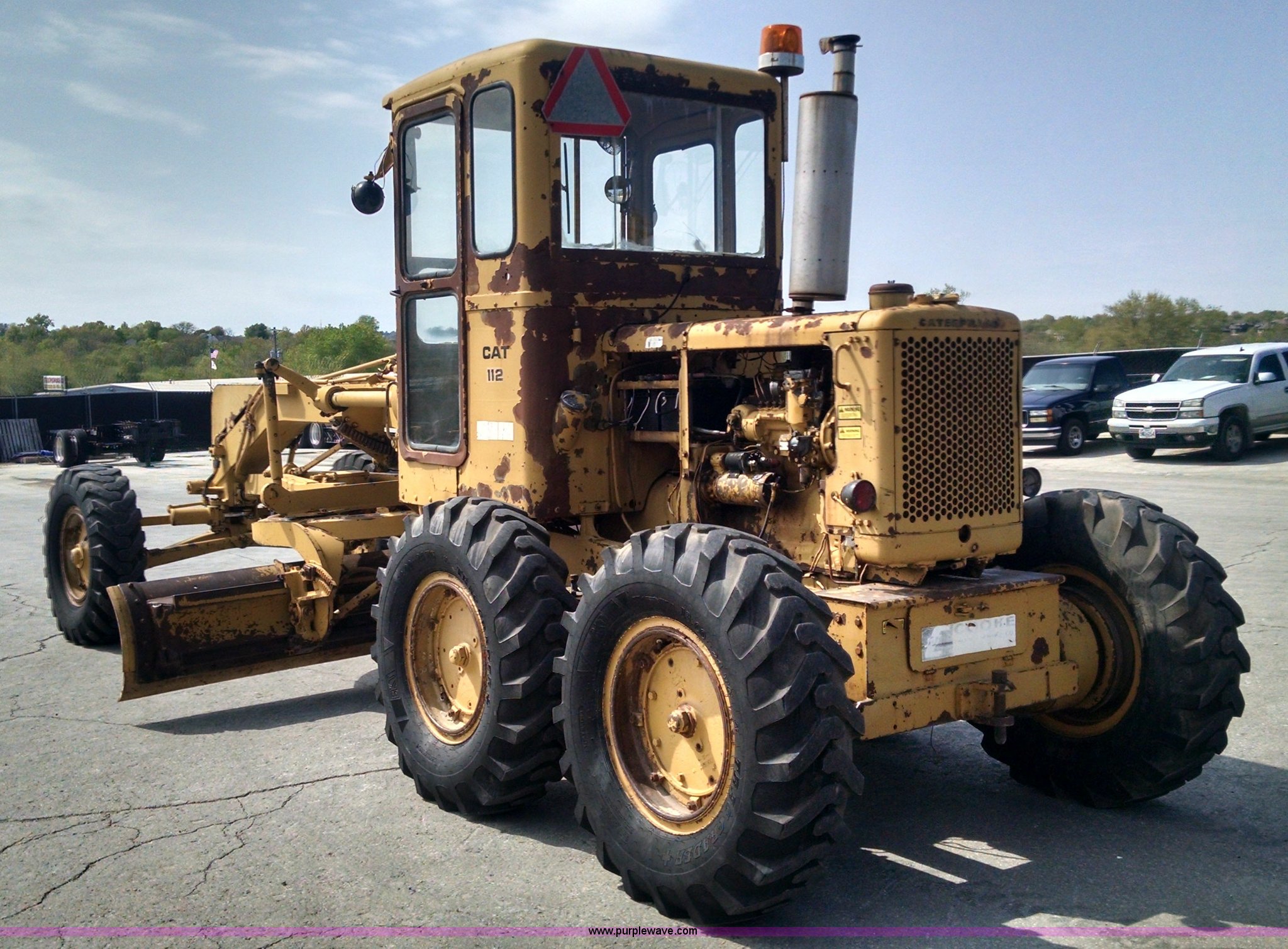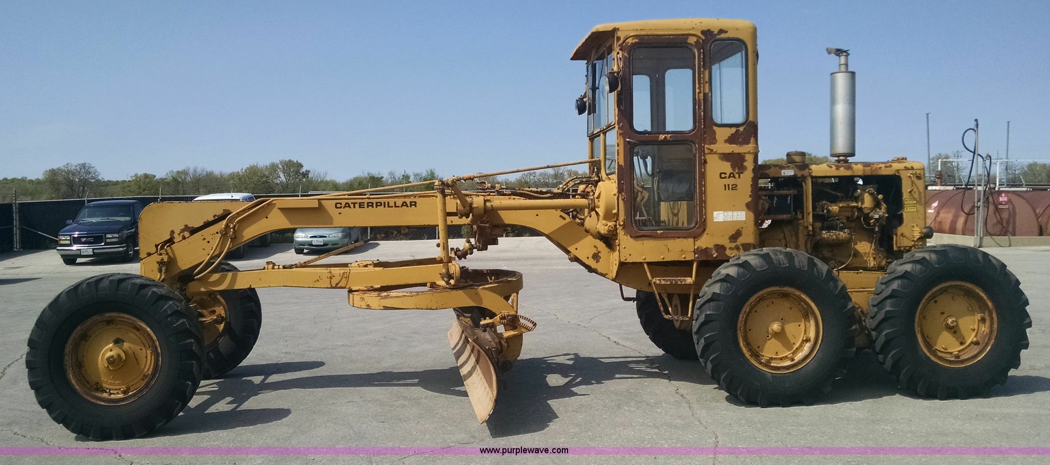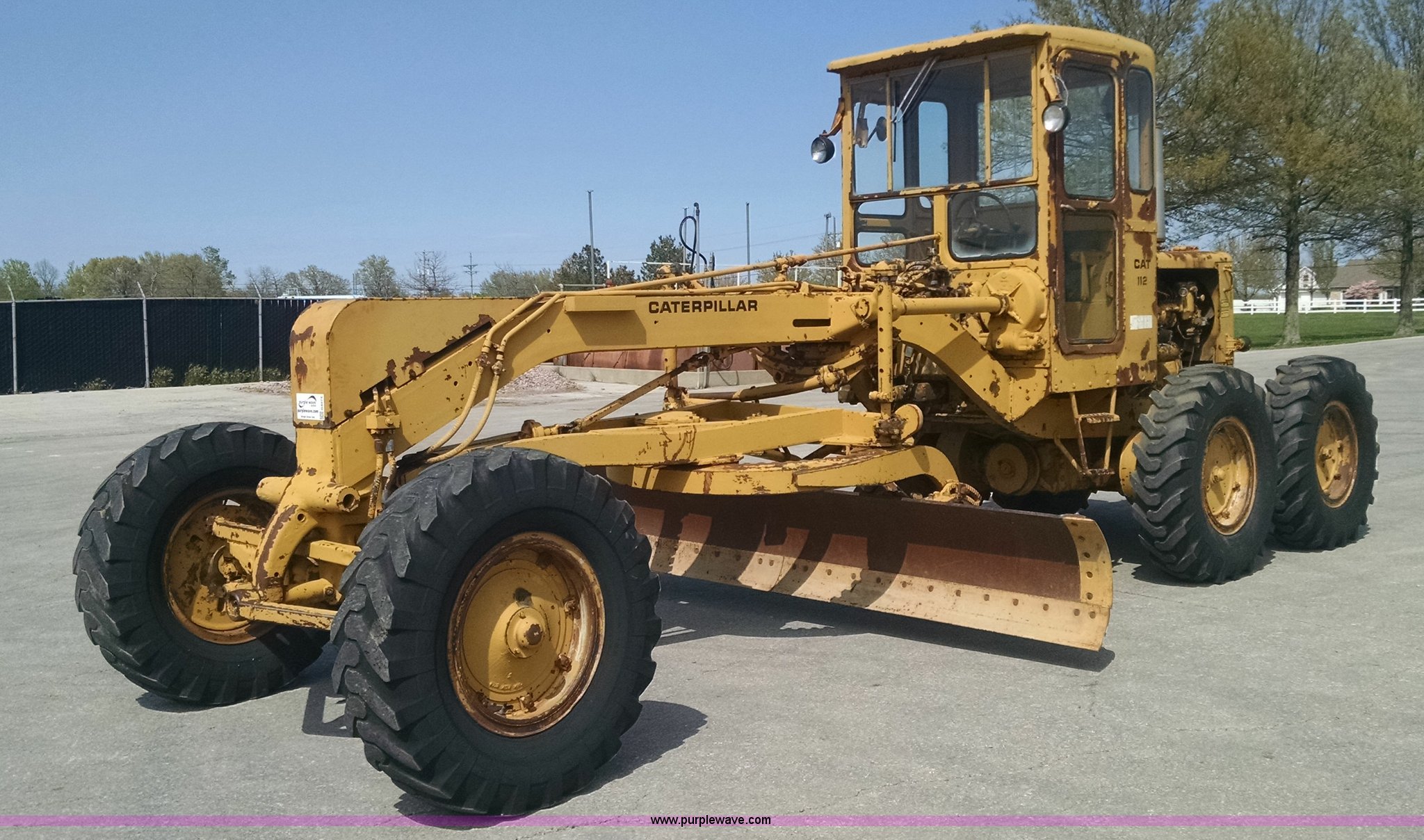 Purple Wave is selling a used Motor Grader in Missouri. This item is a 1968 Caterpillar 112E motor grader with the following: 6,308 hours on meter, Caterpillar four cylinder diesel engine, Direct-drive transmission, 6F-2R gears, Enclosed cab, Front and rear work lights, Moldboard, Side shift, Rigid frame, Pin hitch, 13-24 tires, Recently replaced cutting edges, Serial 91G765