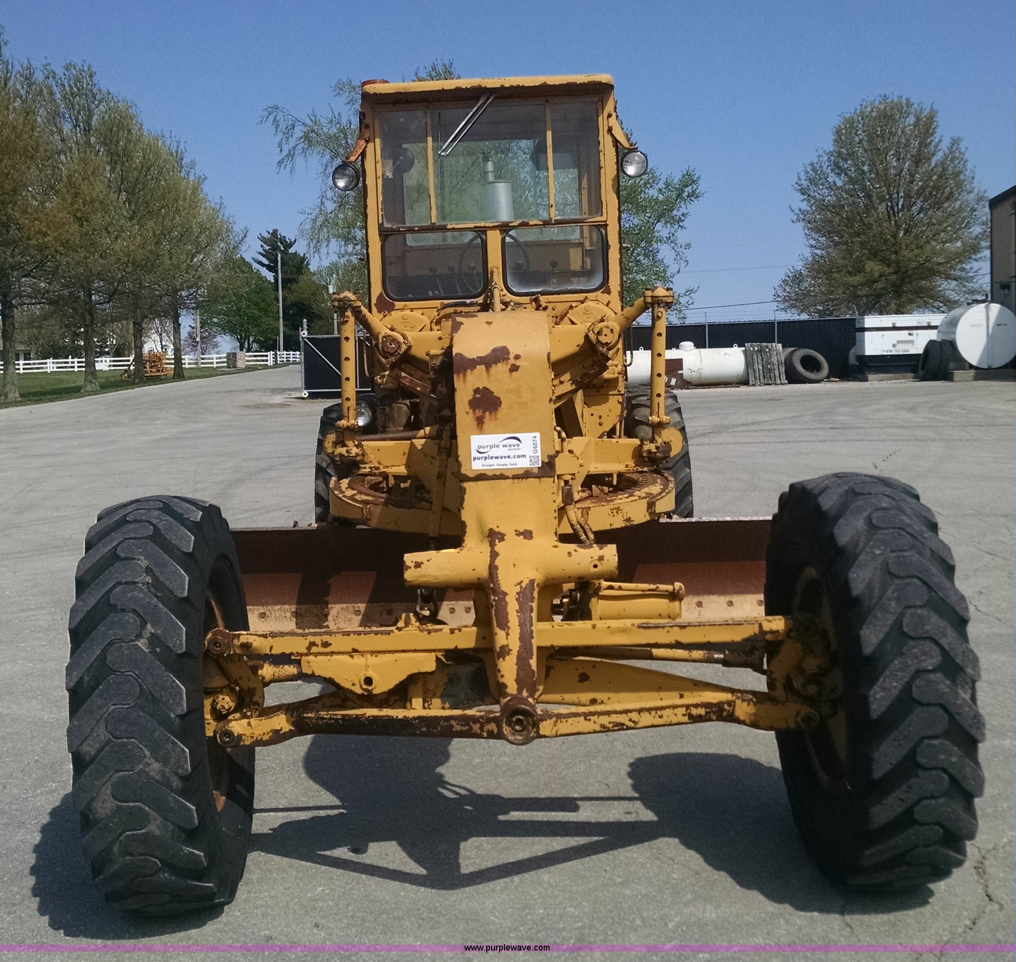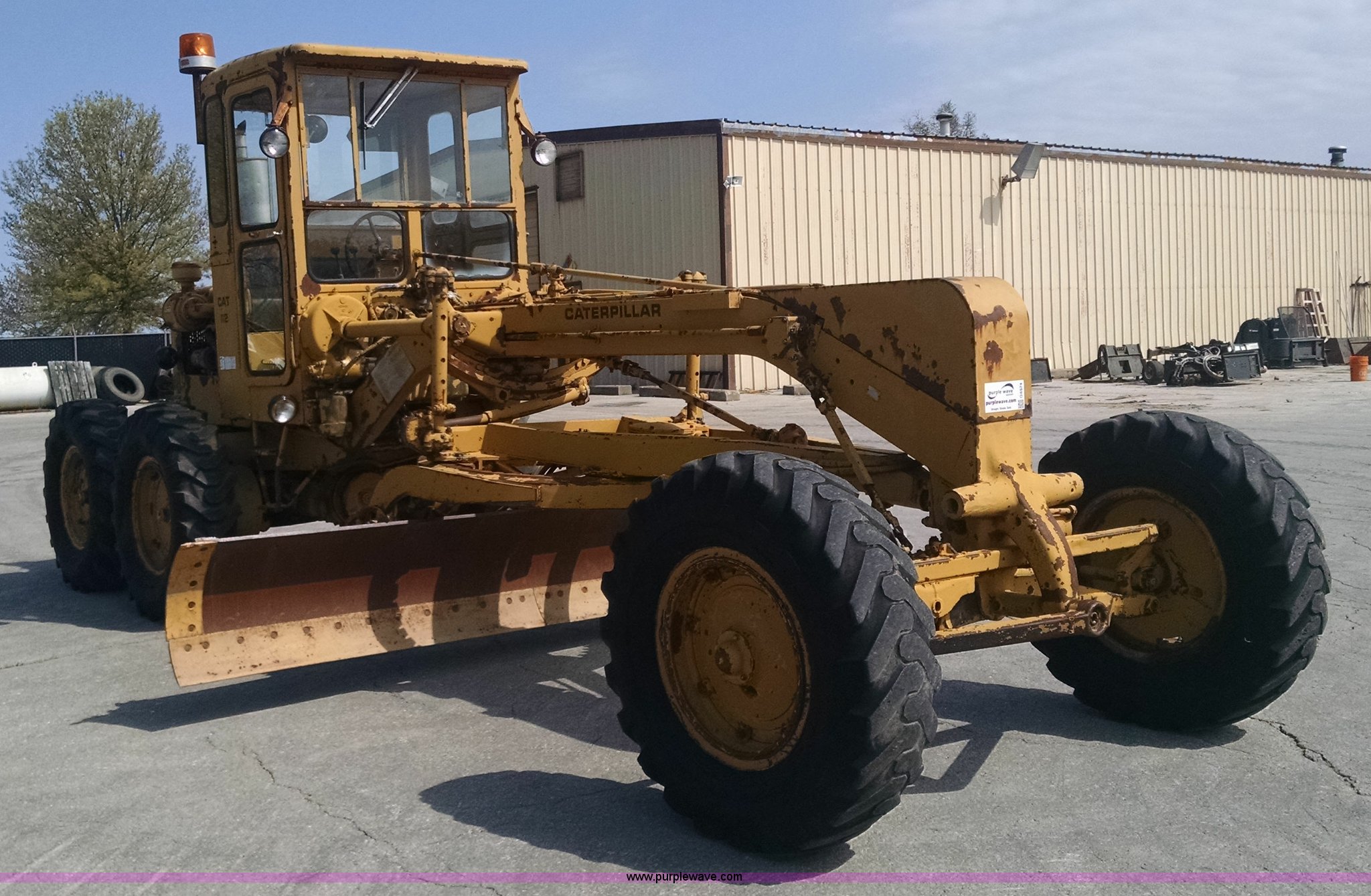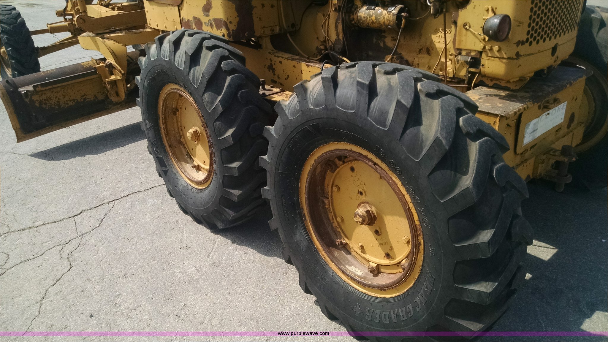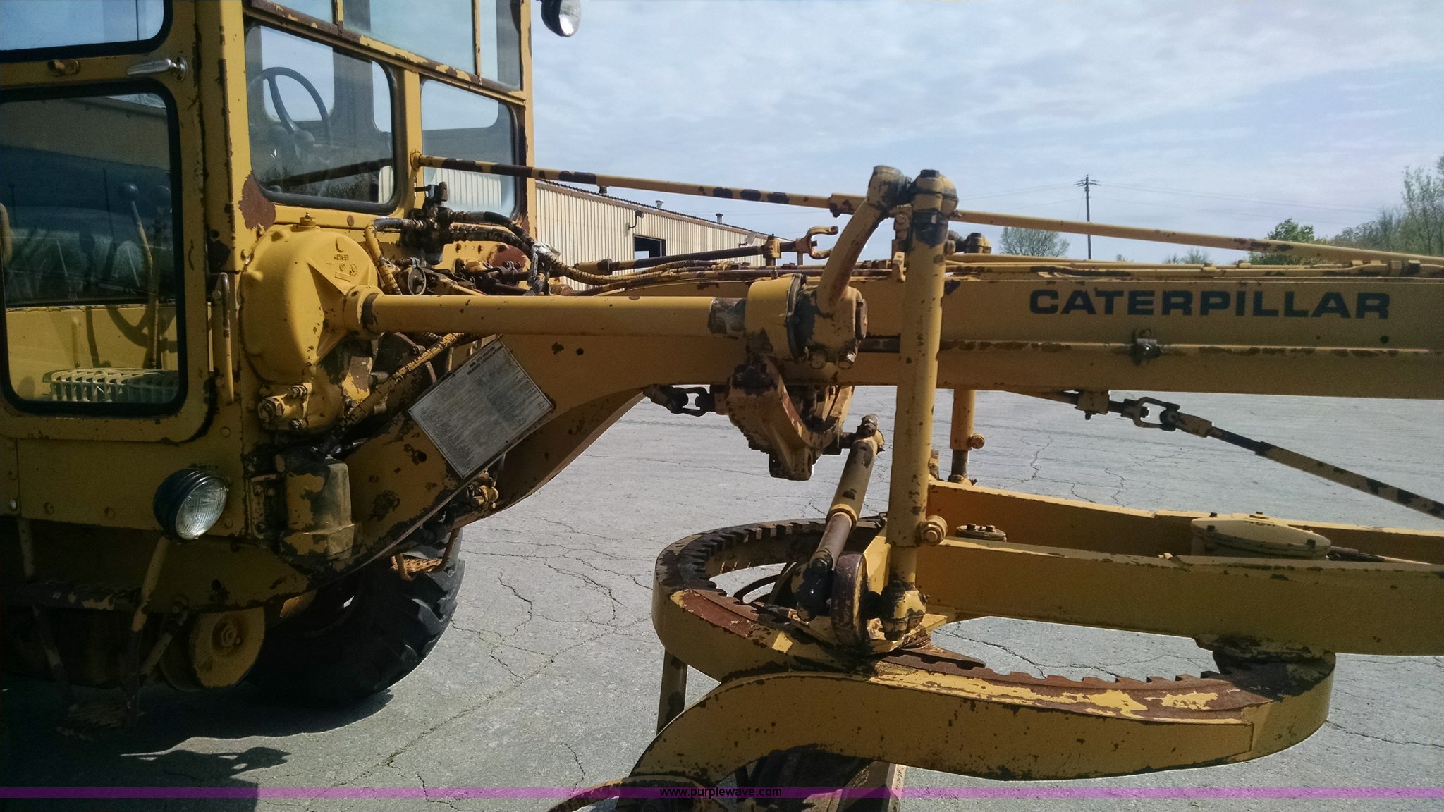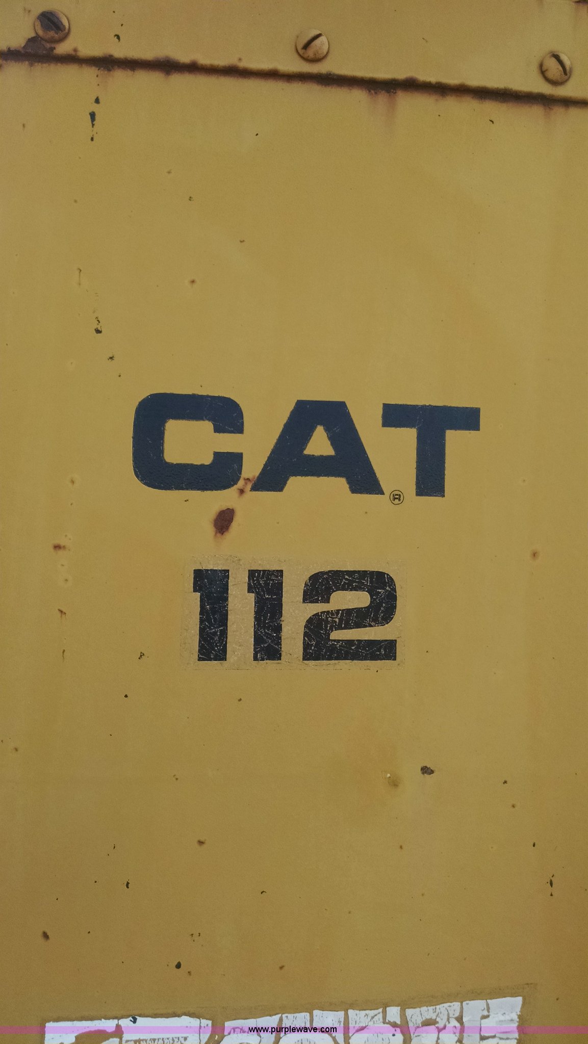 Purple Wave is selling a used Motor Grader in Missouri. This item is a 1968 Caterpillar 112E motor grader with the following: 6,308 hours on meter, Caterpillar four cylinder diesel engine, Direct-drive transmission, 6F-2R gears, Enclosed cab, Front and rear work lights, Moldboard, Side shift, Rigid frame, Pin hitch, 13-24 tires, Recently replaced cutting edges, Serial 91G765