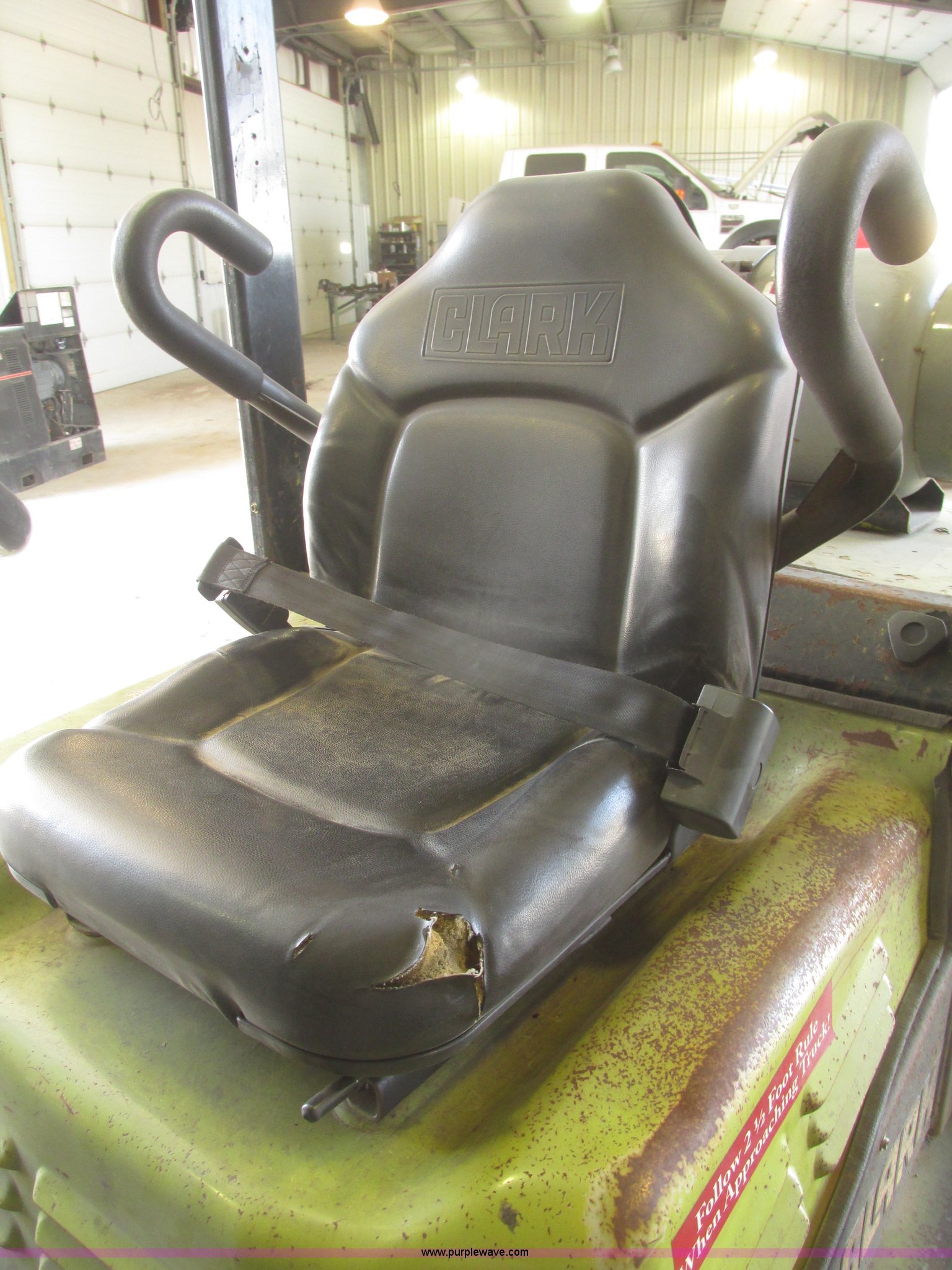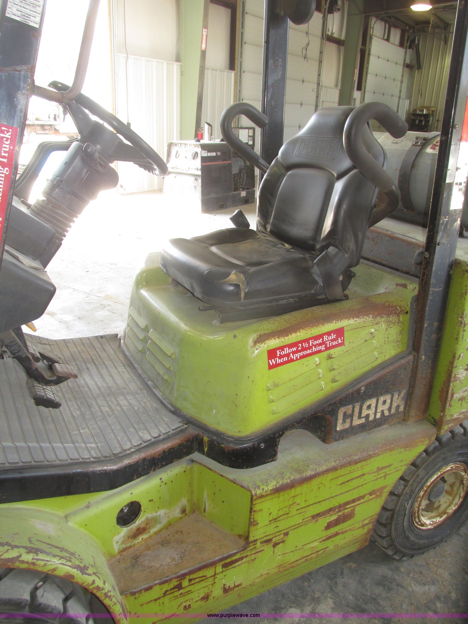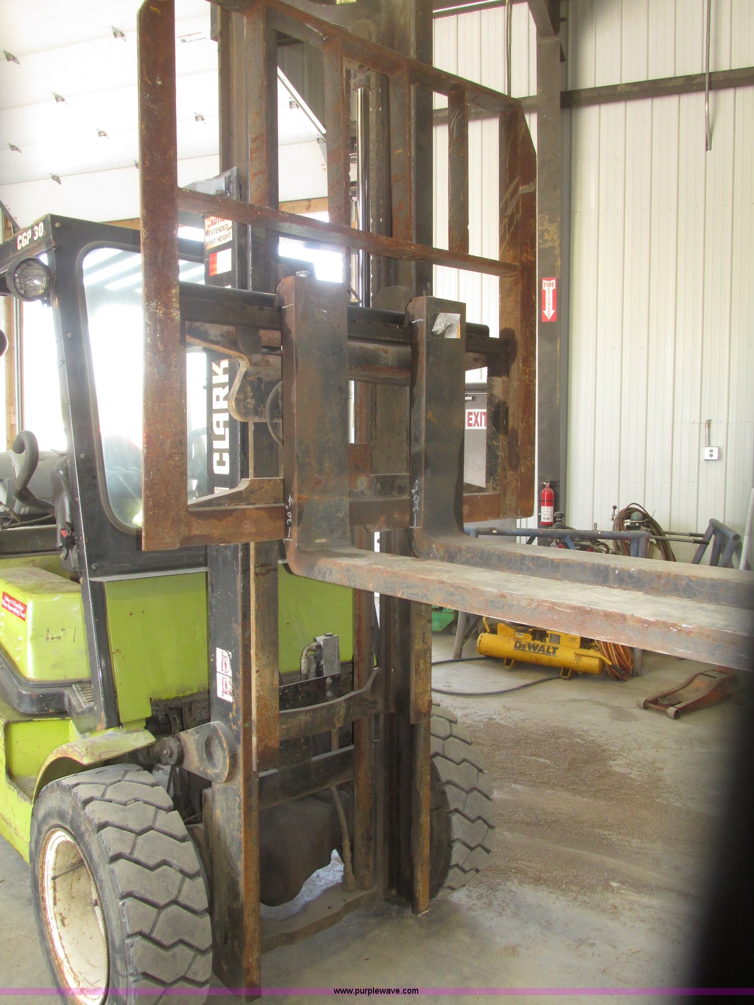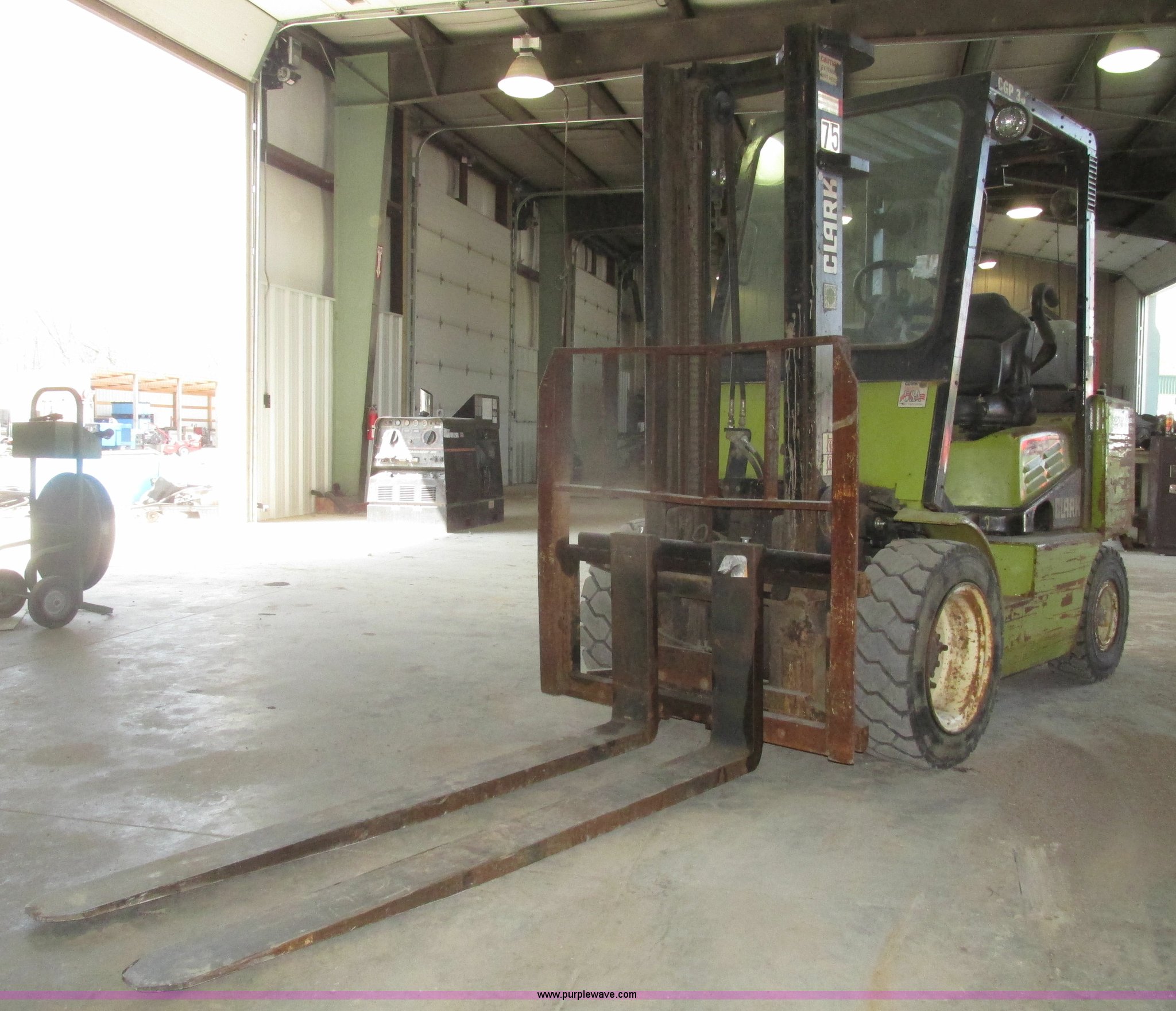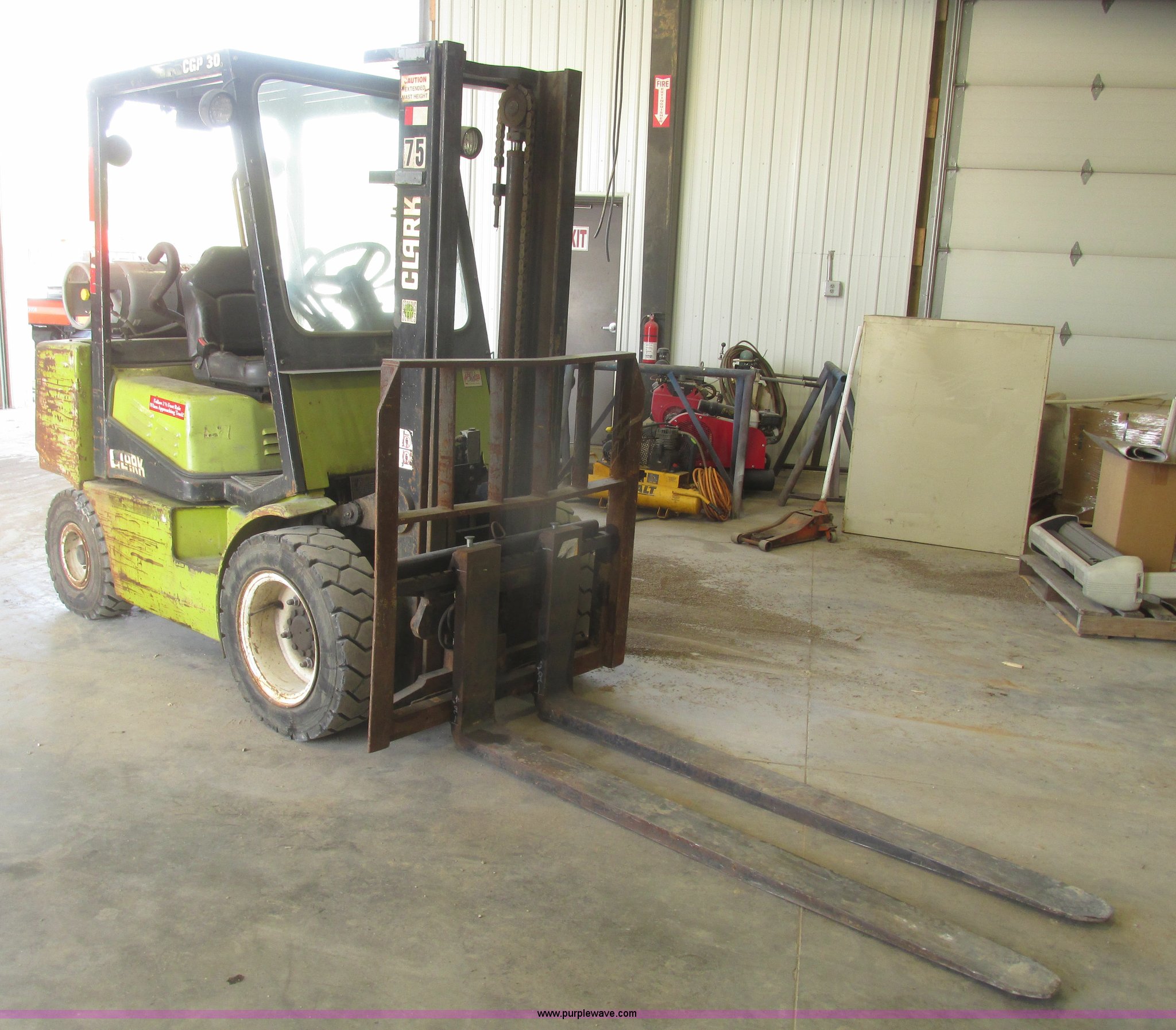 Purple Wave is selling a used Warehouse Forklift in Nebraska. This item is a Clark CGP30 forklift with the following: 2,261 hours on meter, Four cylinder propane engine, Hydrostatic transmission, OROPS, Serial D750811, Tilt steering wheel, Vinyl seat, 6,000 lbs maximum lift capacity at 24" on center, 130" maximum lift height, Two boom sections, Approximately 87" lowered height, 72"L x 6"W adjustable forks, 47"W x 46"H carriage, Side shift, Front and rear work lights, Warning beacon, Backup alarm, Michelin 225/75R15 front pneumatic tires, Michelin 6.50R10 rear pneumatic tires, 9,387 lbs. base operating weight, Propane bottle is not included, Serial P365LI-0043-9527FB