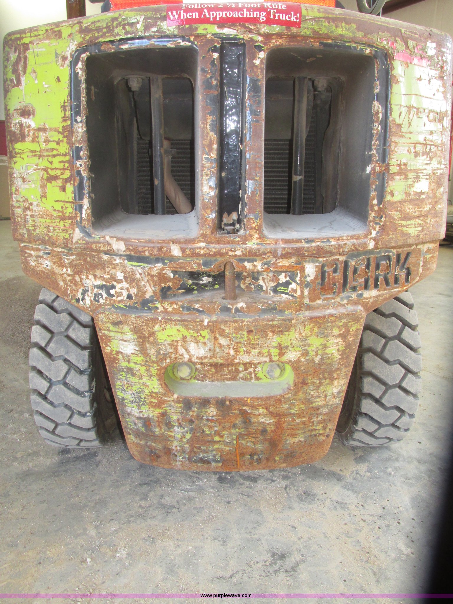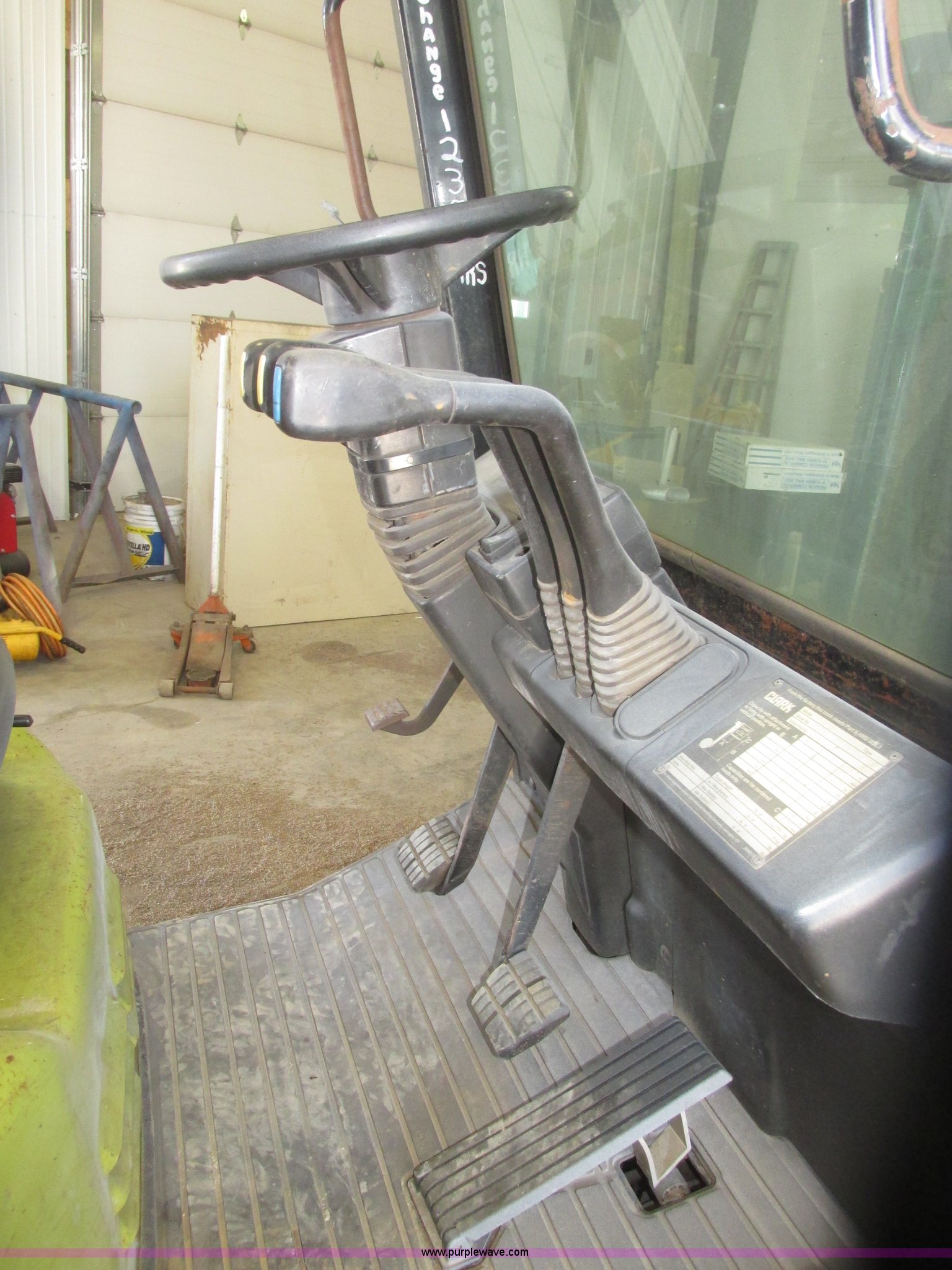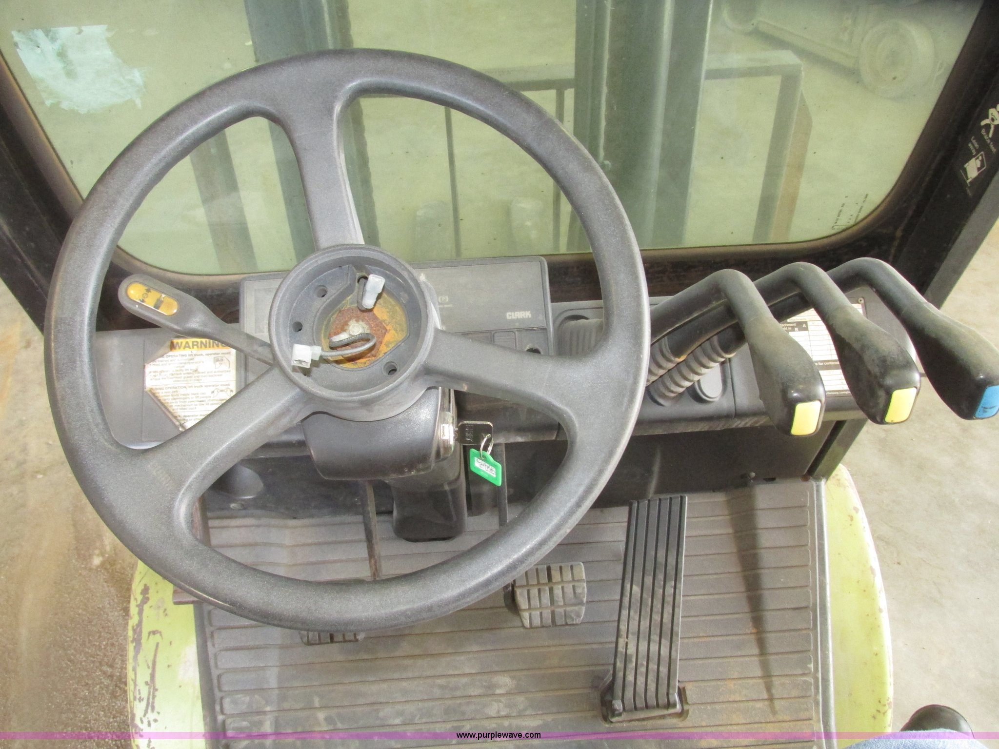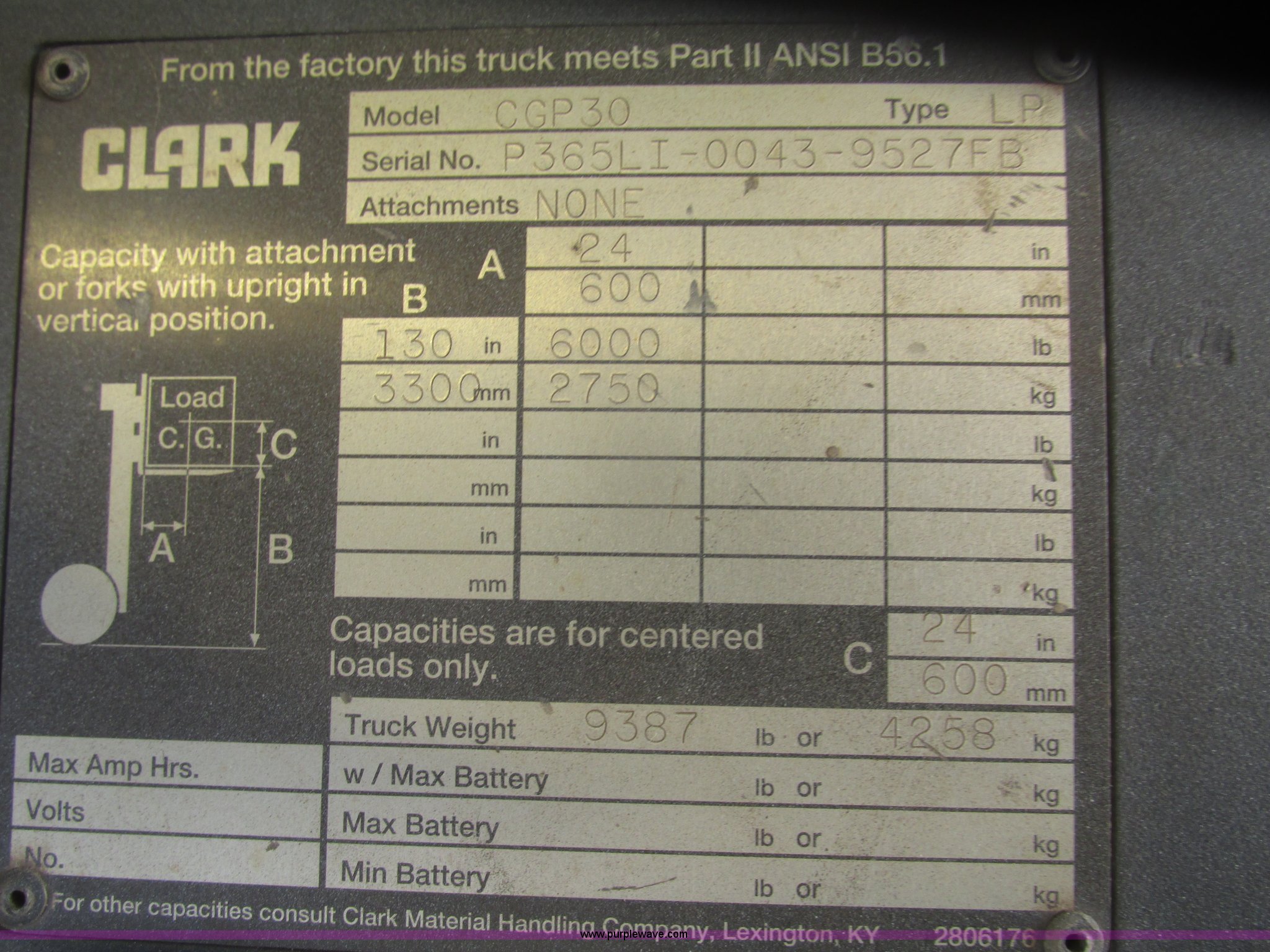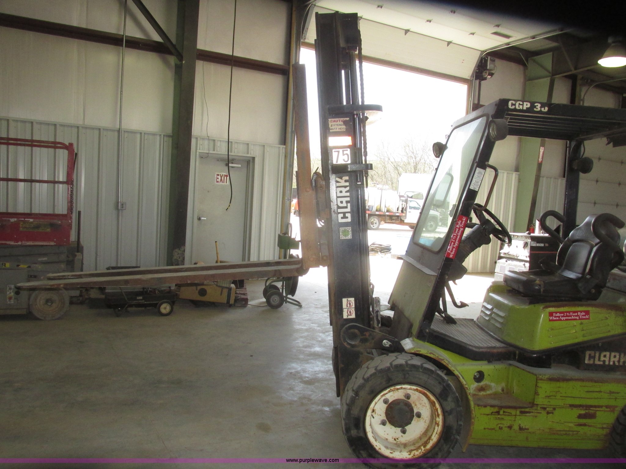 Purple Wave is selling a used Warehouse Forklift in Nebraska. This item is a Clark CGP30 forklift with the following: 2,261 hours on meter, Four cylinder propane engine, Hydrostatic transmission, OROPS, Serial D750811, Tilt steering wheel, Vinyl seat, 6,000 lbs maximum lift capacity at 24" on center, 130" maximum lift height, Two boom sections, Approximately 87" lowered height, 72"L x 6"W adjustable forks, 47"W x 46"H carriage, Side shift, Front and rear work lights, Warning beacon, Backup alarm, Michelin 225/75R15 front pneumatic tires, Michelin 6.50R10 rear pneumatic tires, 9,387 lbs. base operating weight, Propane bottle is not included, Serial P365LI-0043-9527FB