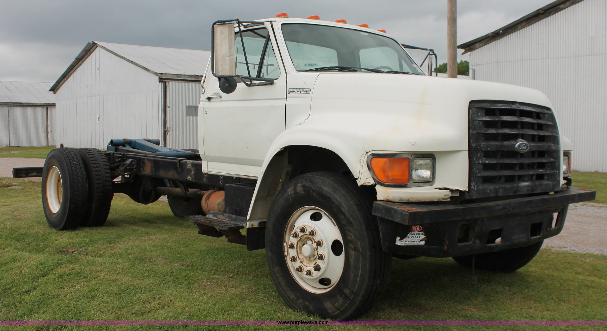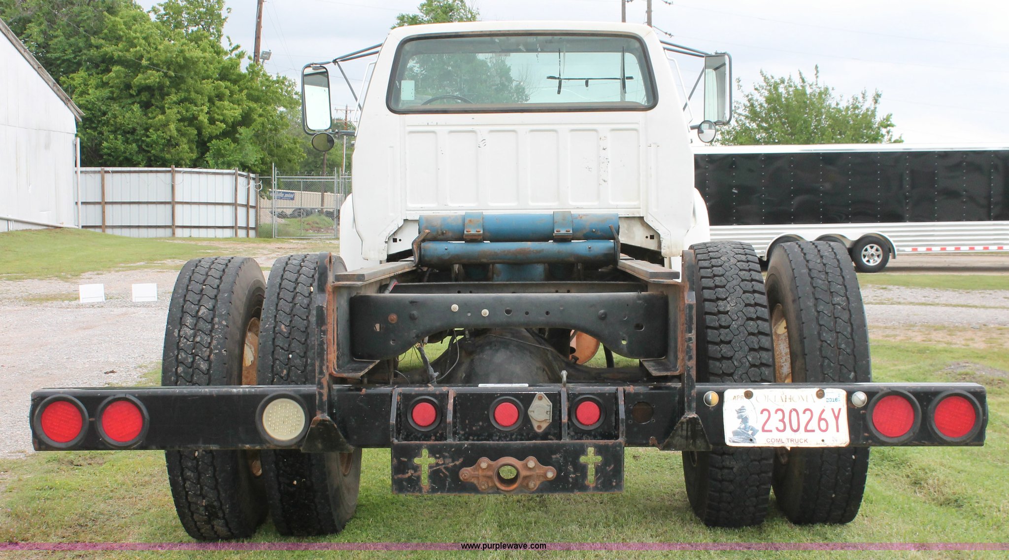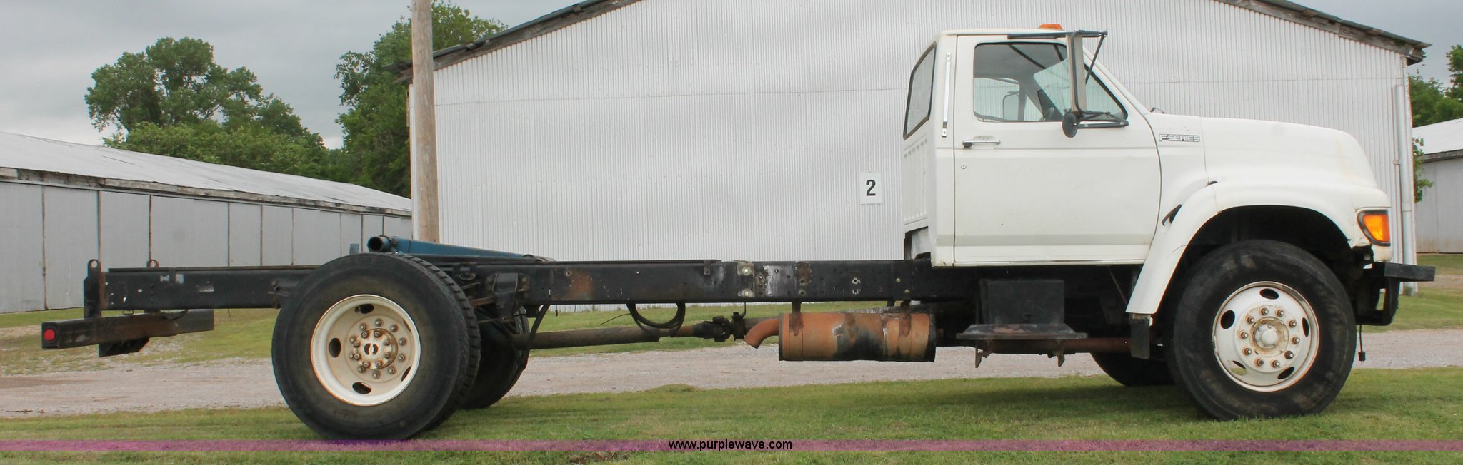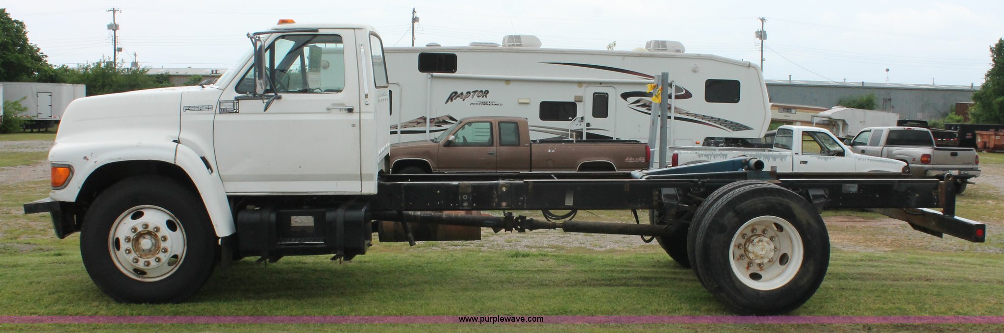 Purple Wave is selling a used Truck Chassis in Oklahoma. This item is a 1998 Ford F800 truck cab and chassis with the following: 147,975 miles on odometer, Cummins B5.9-190 5.9L L6 12V diesel engine, 190 HP, Serial 56388989, Six speed manual transmission, Heat, Manual windows and locks, Vinyl interior, Backup alarm, Block heater, 50 gallon fuel tank, Harsh RL-E50 Rigid-Lift hydraulic hoist, Dual ram cylinders, Dual PTO, Single pump, Brake controller, Trailer electrical outlet, Hydraulic brakes, 189" wheelbase, 11R22.5 tires, GVWR 30,000 lbs