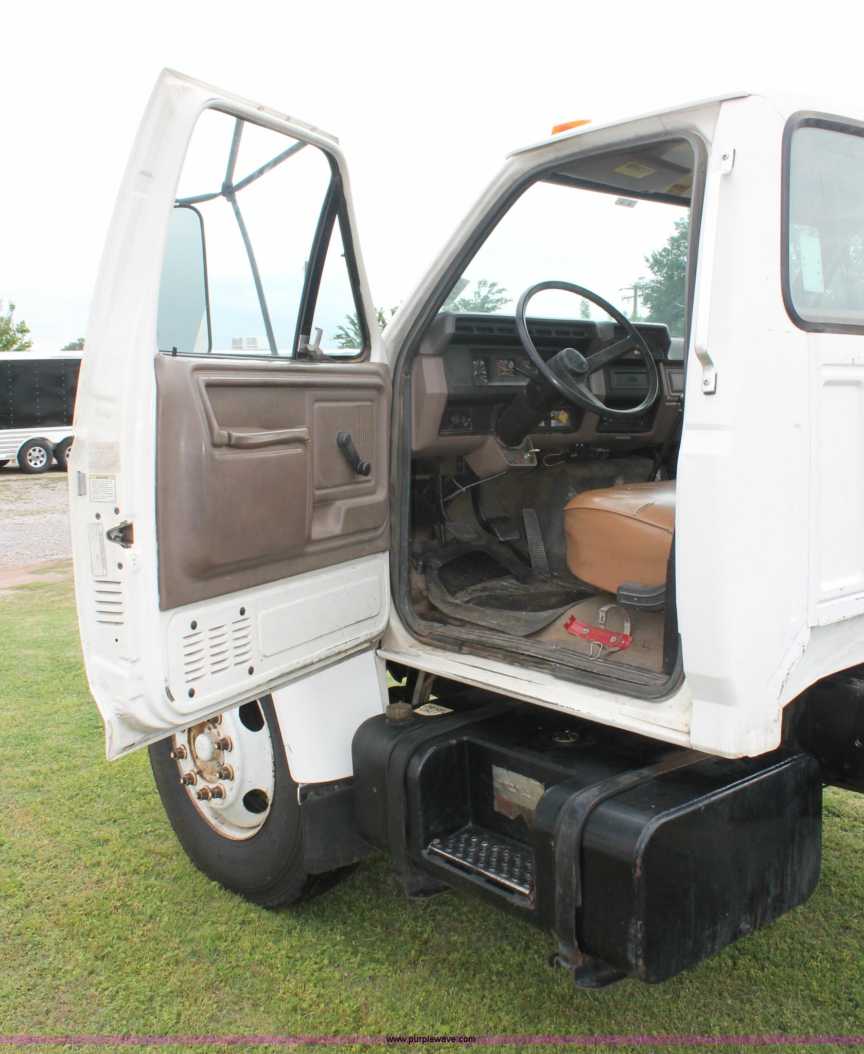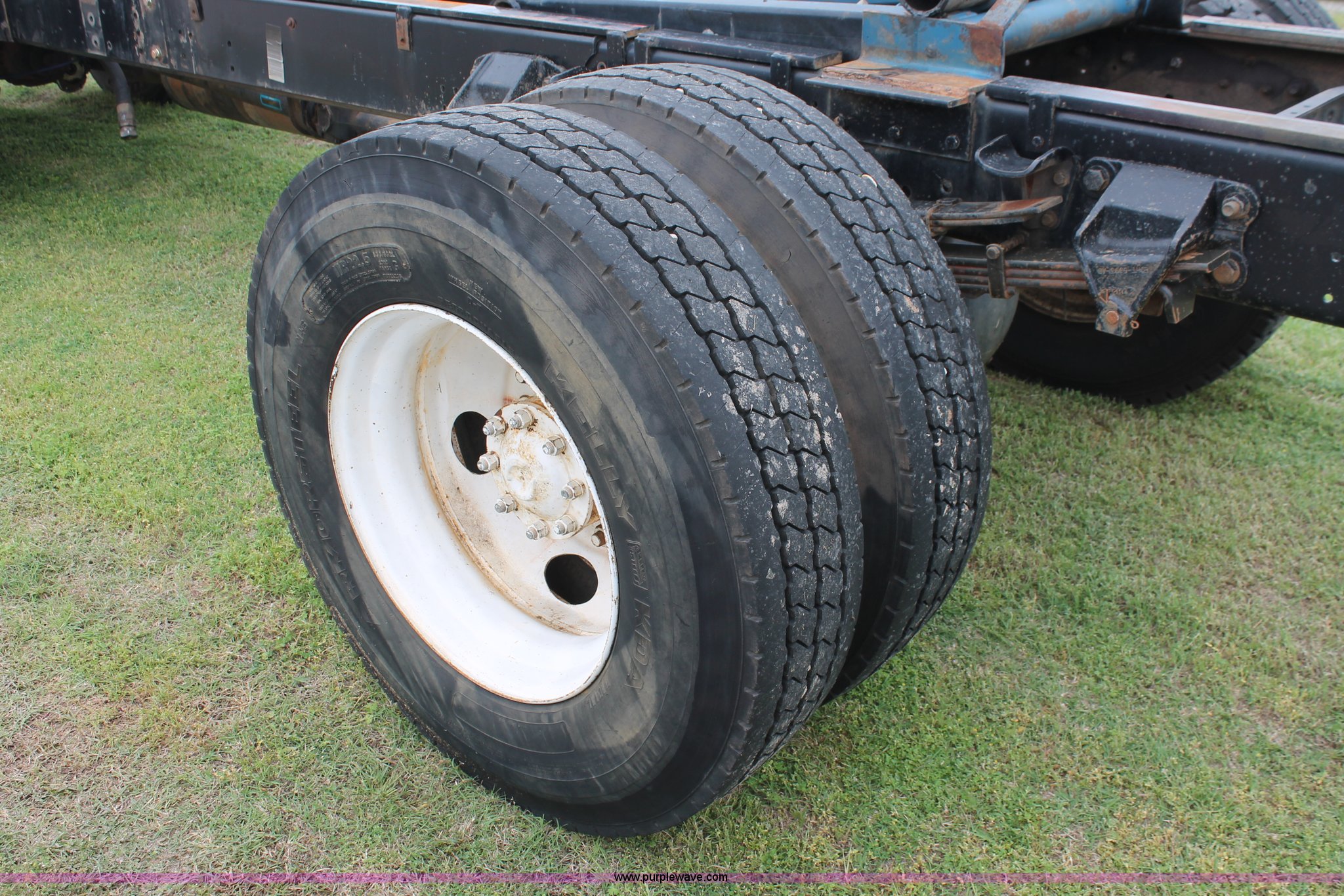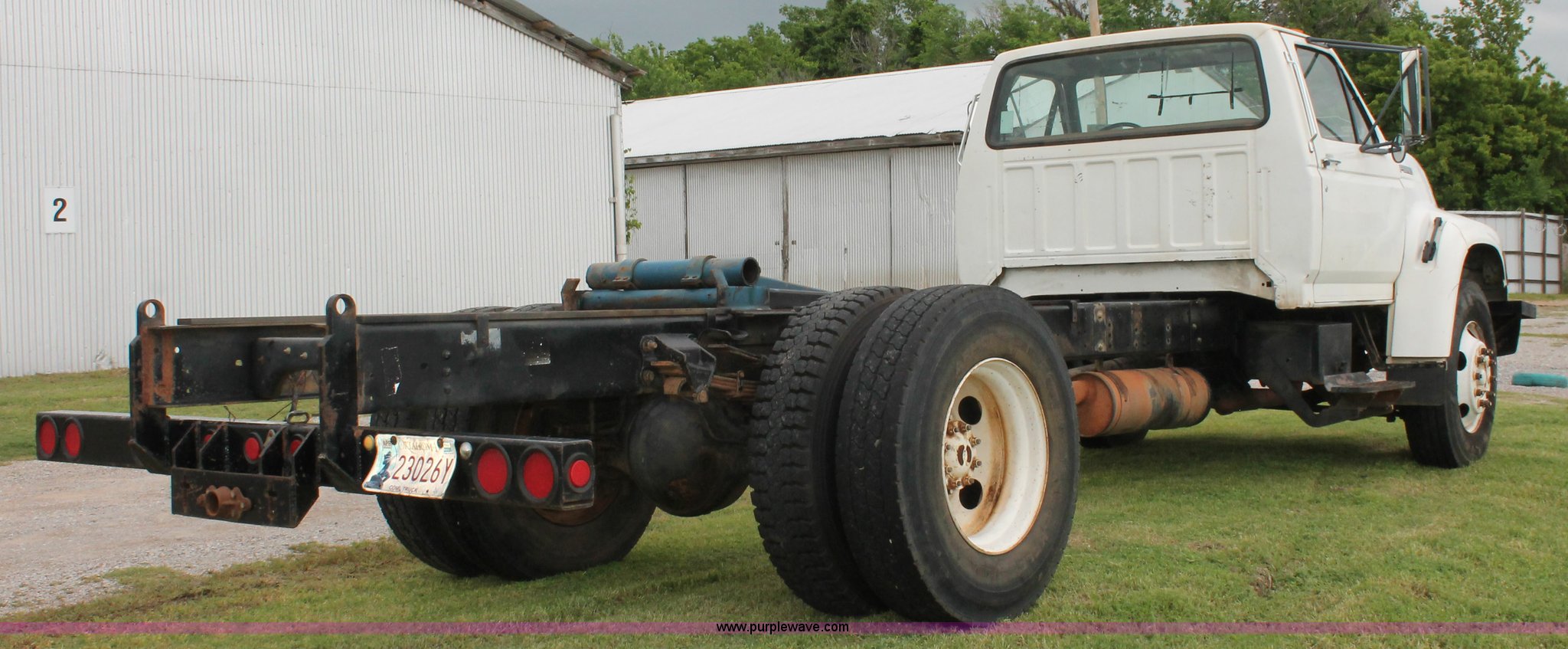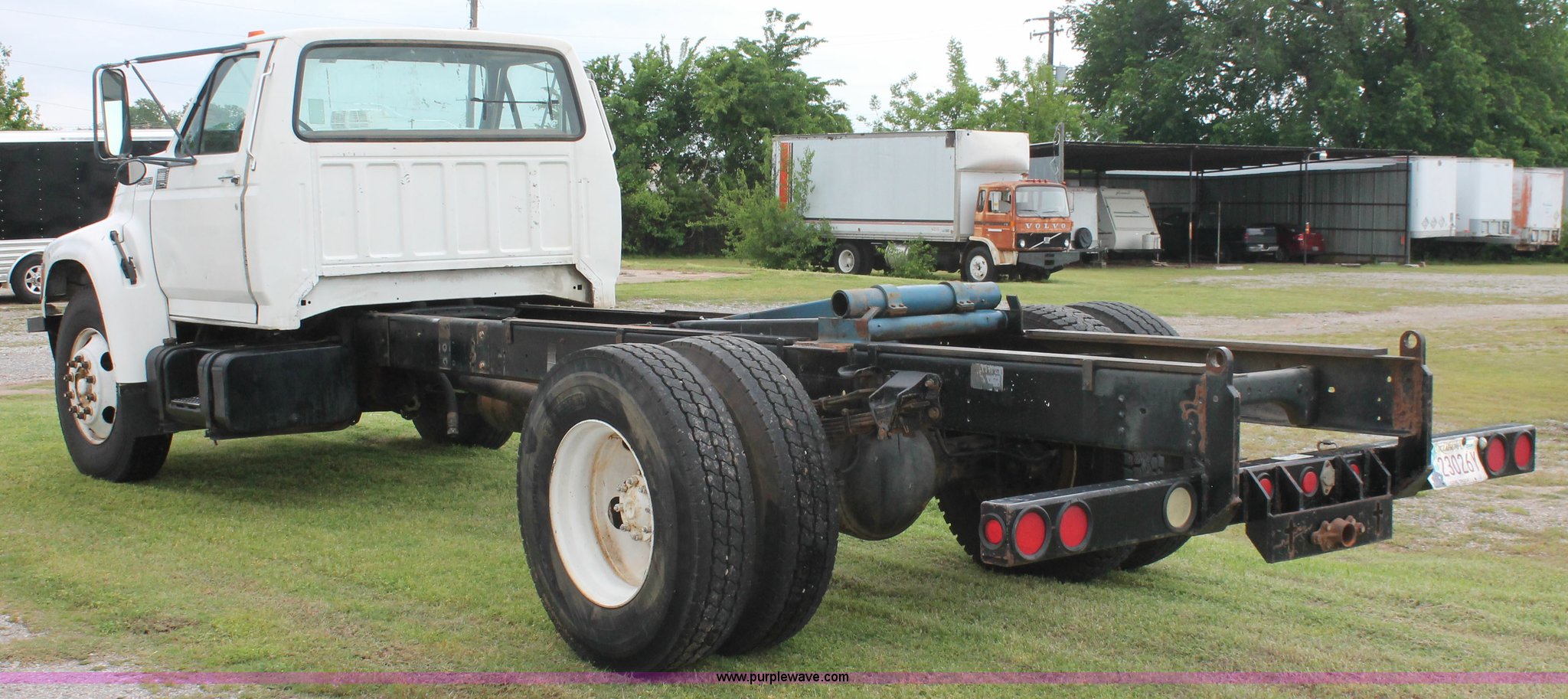 Purple Wave is selling a used Truck Chassis in Oklahoma. This item is a 1998 Ford F800 truck cab and chassis with the following: 147,975 miles on odometer, Cummins B5.9-190 5.9L L6 12V diesel engine, 190 HP, Serial 56388989, Six speed manual transmission, Heat, Manual windows and locks, Vinyl interior, Backup alarm, Block heater, 50 gallon fuel tank, Harsh RL-E50 Rigid-Lift hydraulic hoist, Dual ram cylinders, Dual PTO, Single pump, Brake controller, Trailer electrical outlet, Hydraulic brakes, 189" wheelbase, 11R22.5 tires, GVWR 30,000 lbs