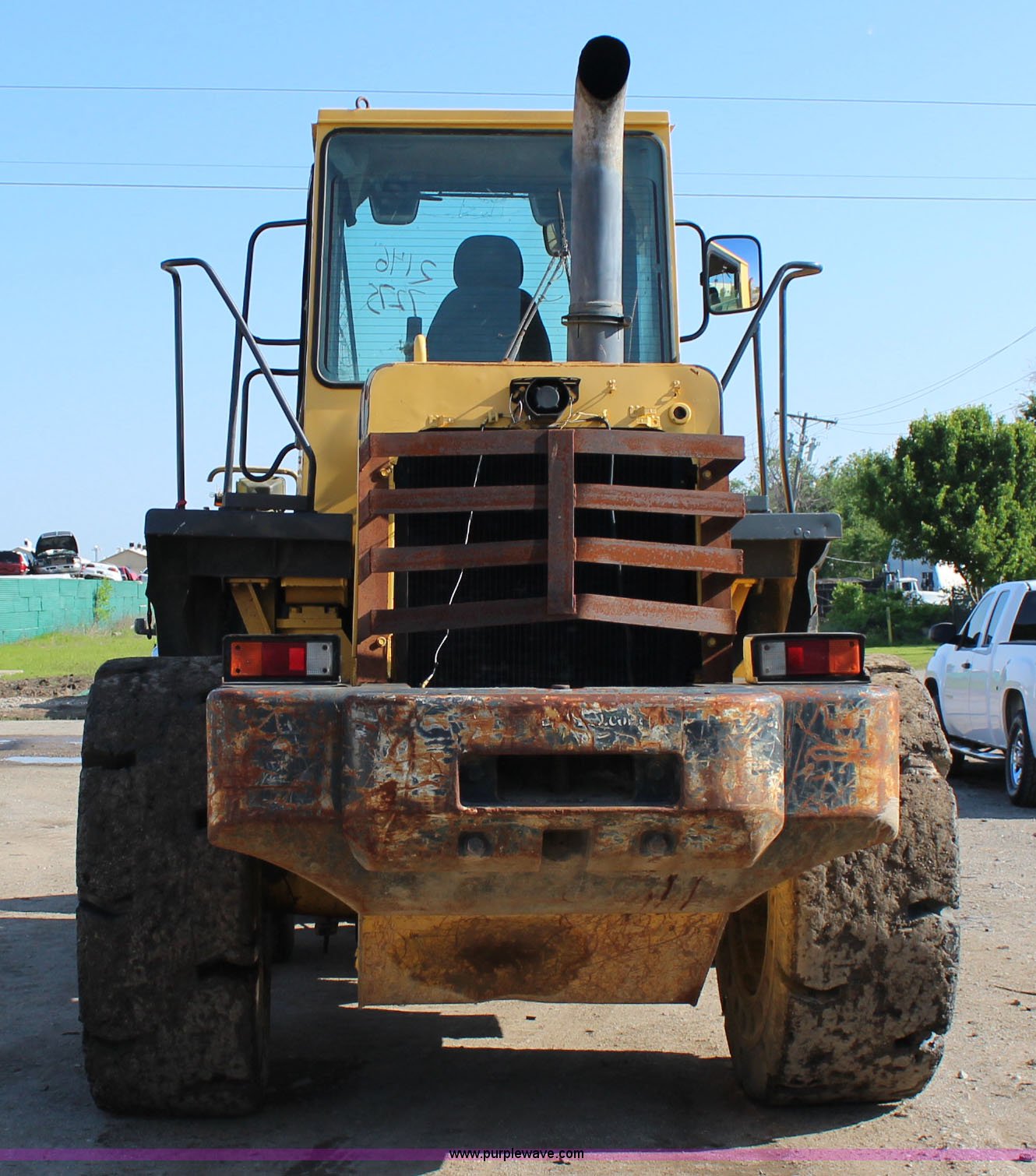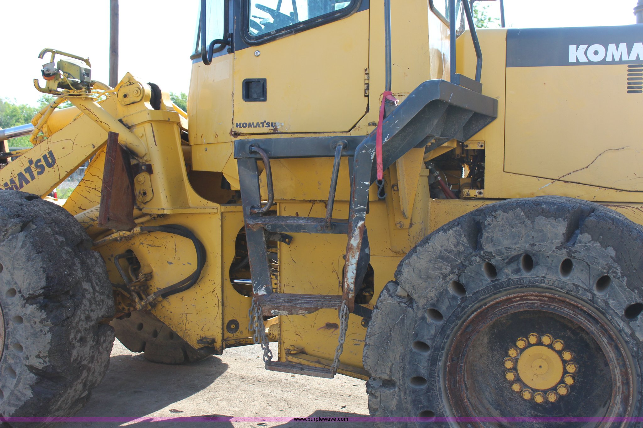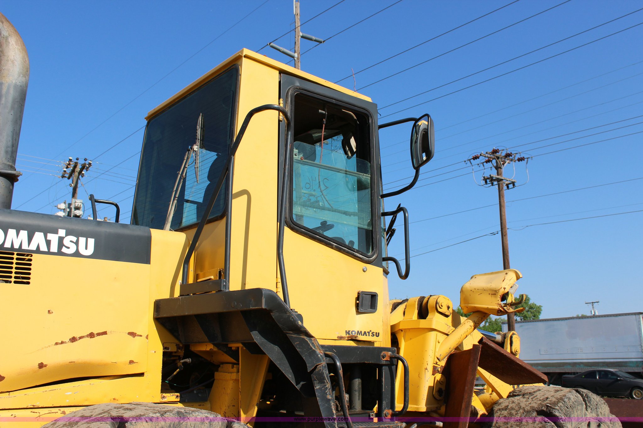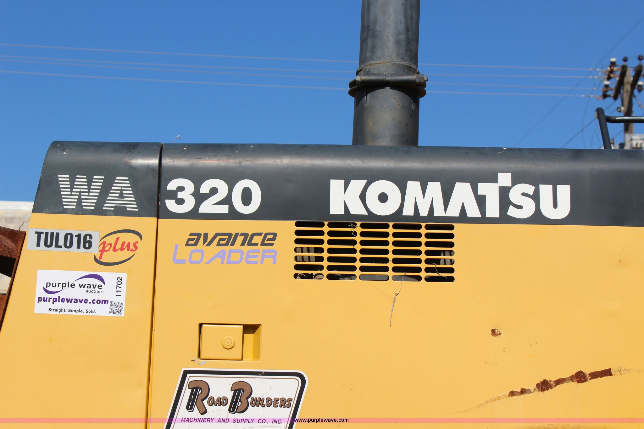Purple Wave is selling a used Wheel Loader in Oklahoma. This item is a 1999 Komatsu WA320-3MC wheel loader with the following: 13,310 hours on meter, Komatsu S6D108 7.2L six cylinder turbo diesel engine, 162 HP, Powershift transmission, 4F-4R gears, Enclosed cab, AC and heat, AM/FM, Tilt steering wheel, Air suspension seat, General purpose bucket, 9'W, 3.5 cubic yard capacity, Weld-on cutting edge, Hydraulic quick coupler, Rear counter weight, 20.5 x 25 solid tires, 31,200 lbs. base operating weight, Cracked windshield, Serial A31230