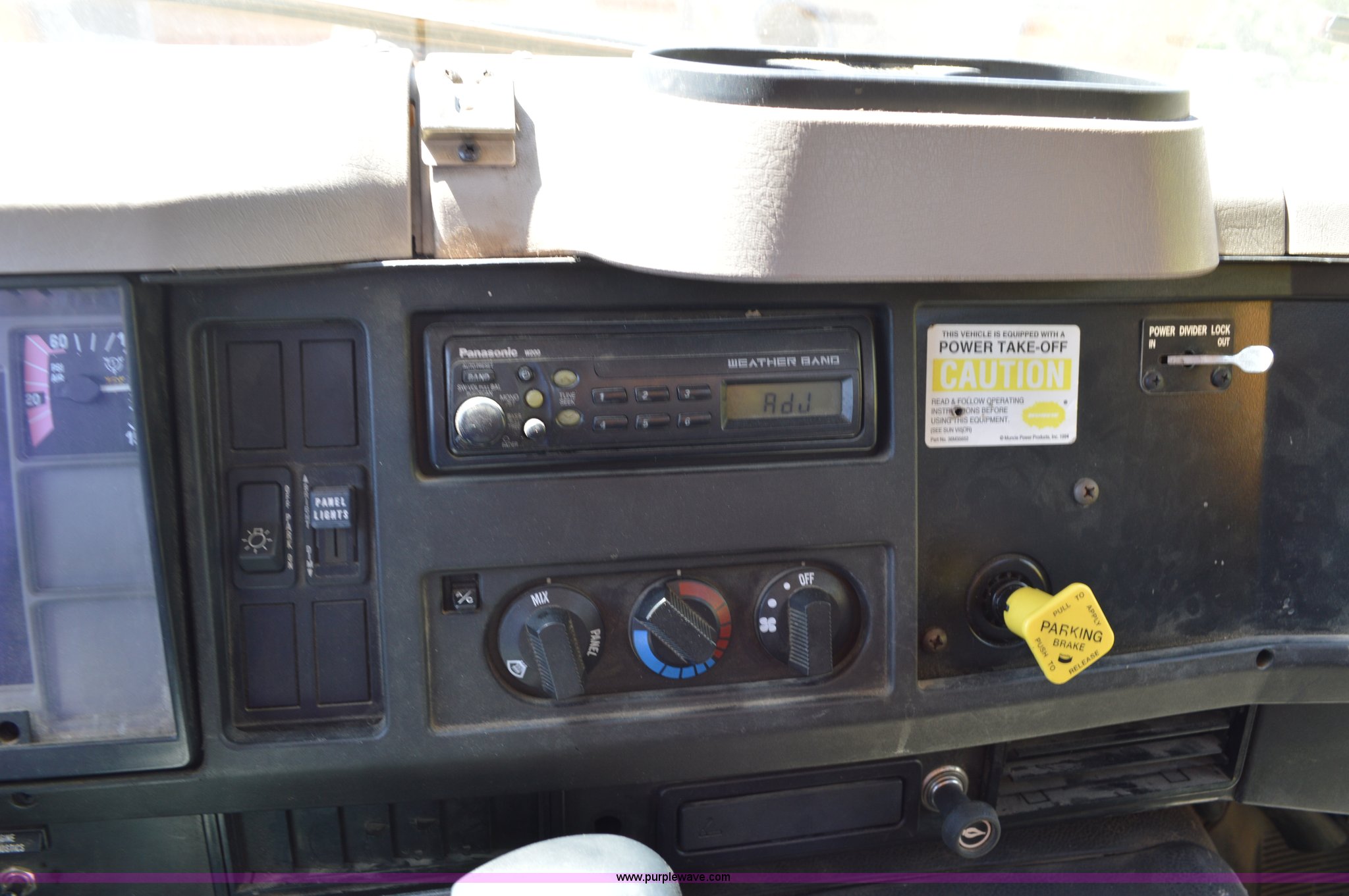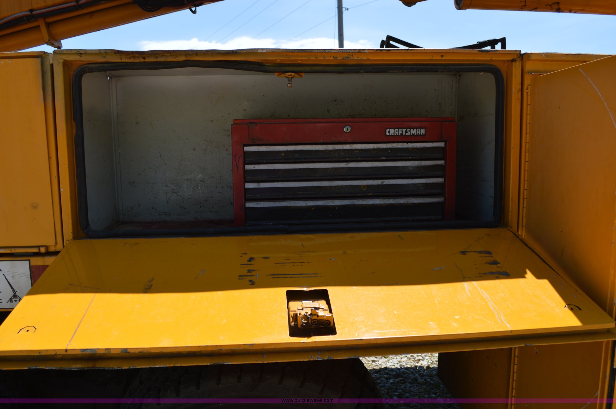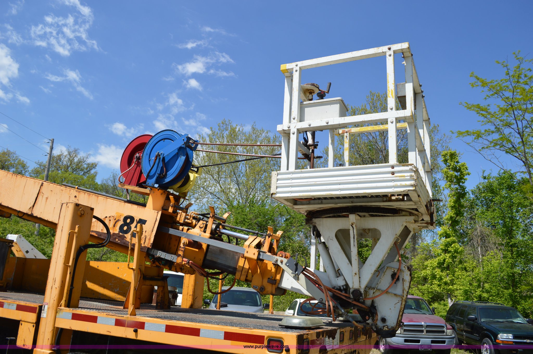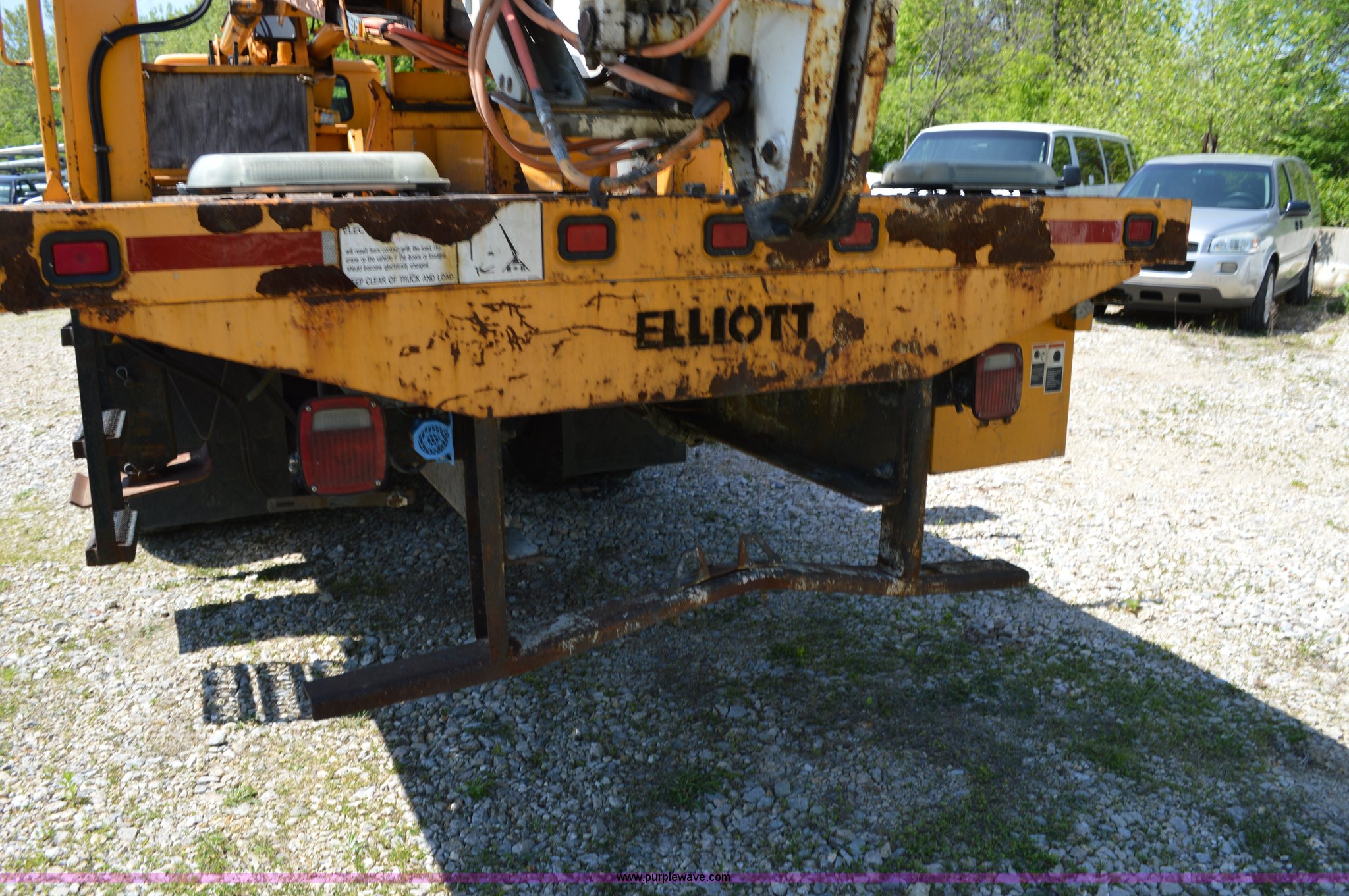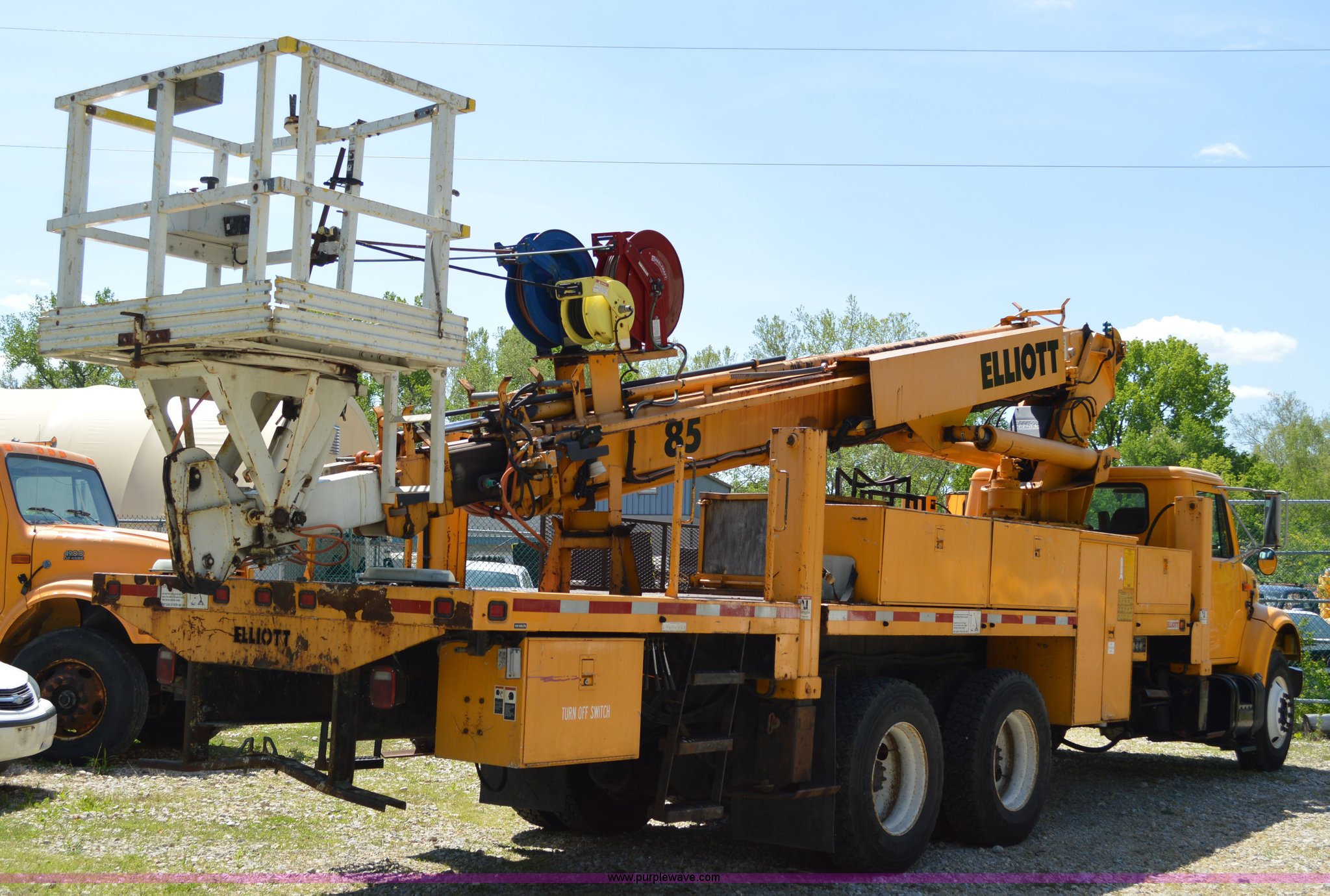 Purple Wave is selling a used Bucket Truck in Missouri. This item is a 2002 International 4900 bucket truck with the following: 55,575 miles on odometer, 4,609 hours on meter, International DT466 7.6L L6 diesel engine, Allison automatic transmission, Heat, AM/FM, Cruise, Air suspension seat, Elliot 85 bucket lift, 622 hours on meter, 85' maximum lift height, 5'L x 40"W x 40"H bucket, Hydraulic outriggers, Spring suspension, Air brakes, 11R22.5 tires, GVWR 46,000 lbs, FAWR 12,000 lbs, IAWR 12,000 lbs, RAWR 12,000 lbs, Windshield cracked, Engine has water in oil, Engine has blow by, ABS light is on, Engine warning light is on, Unit# G6763