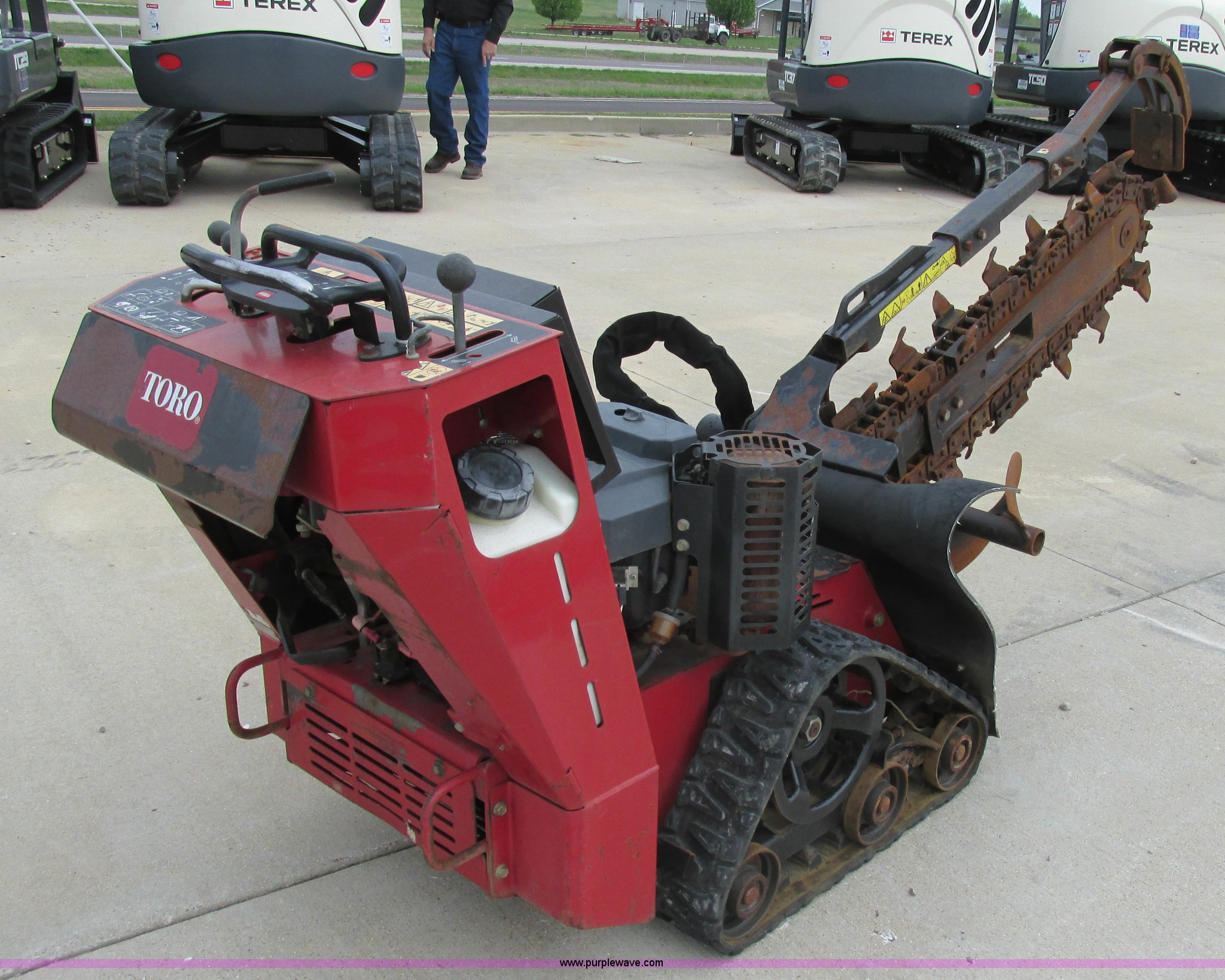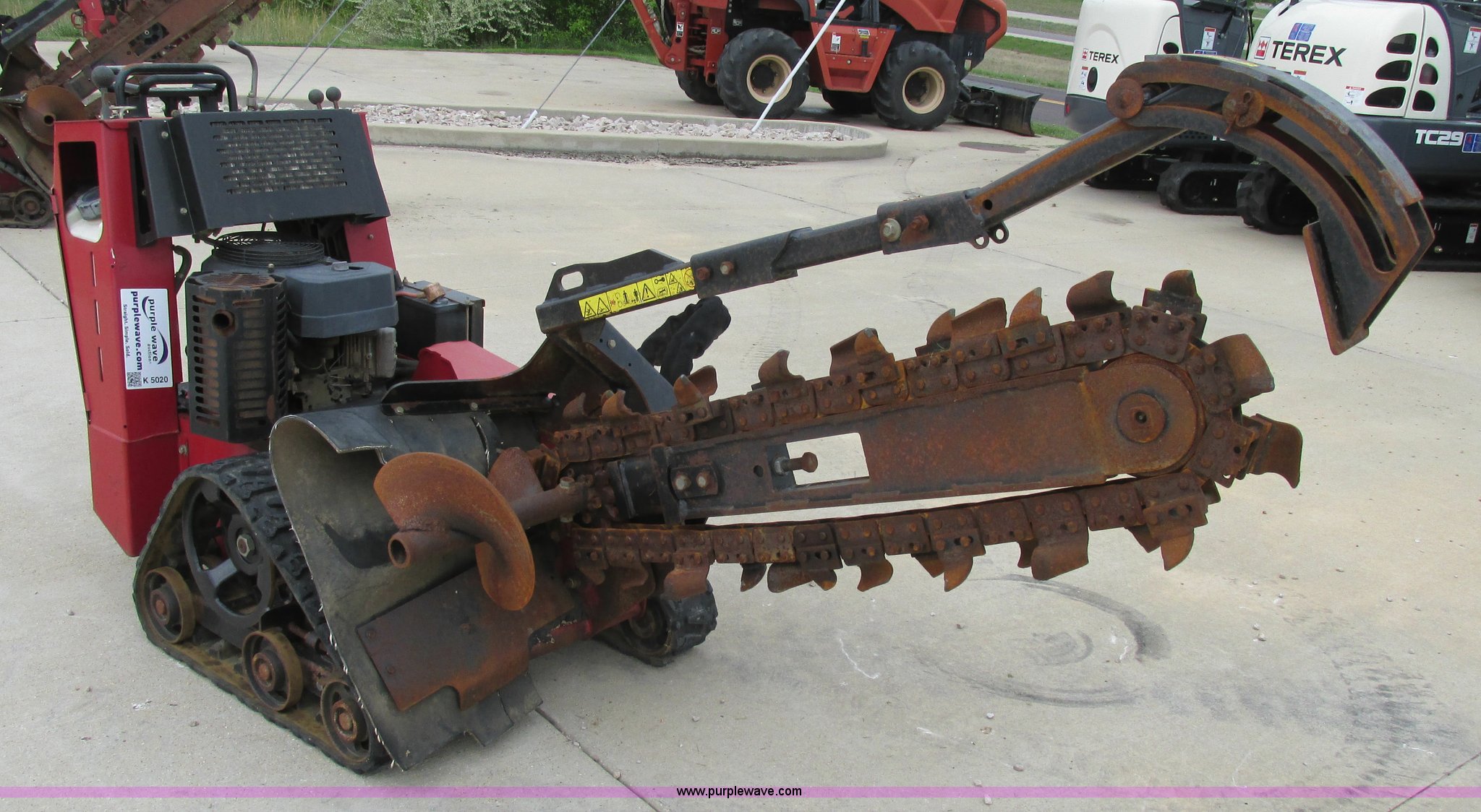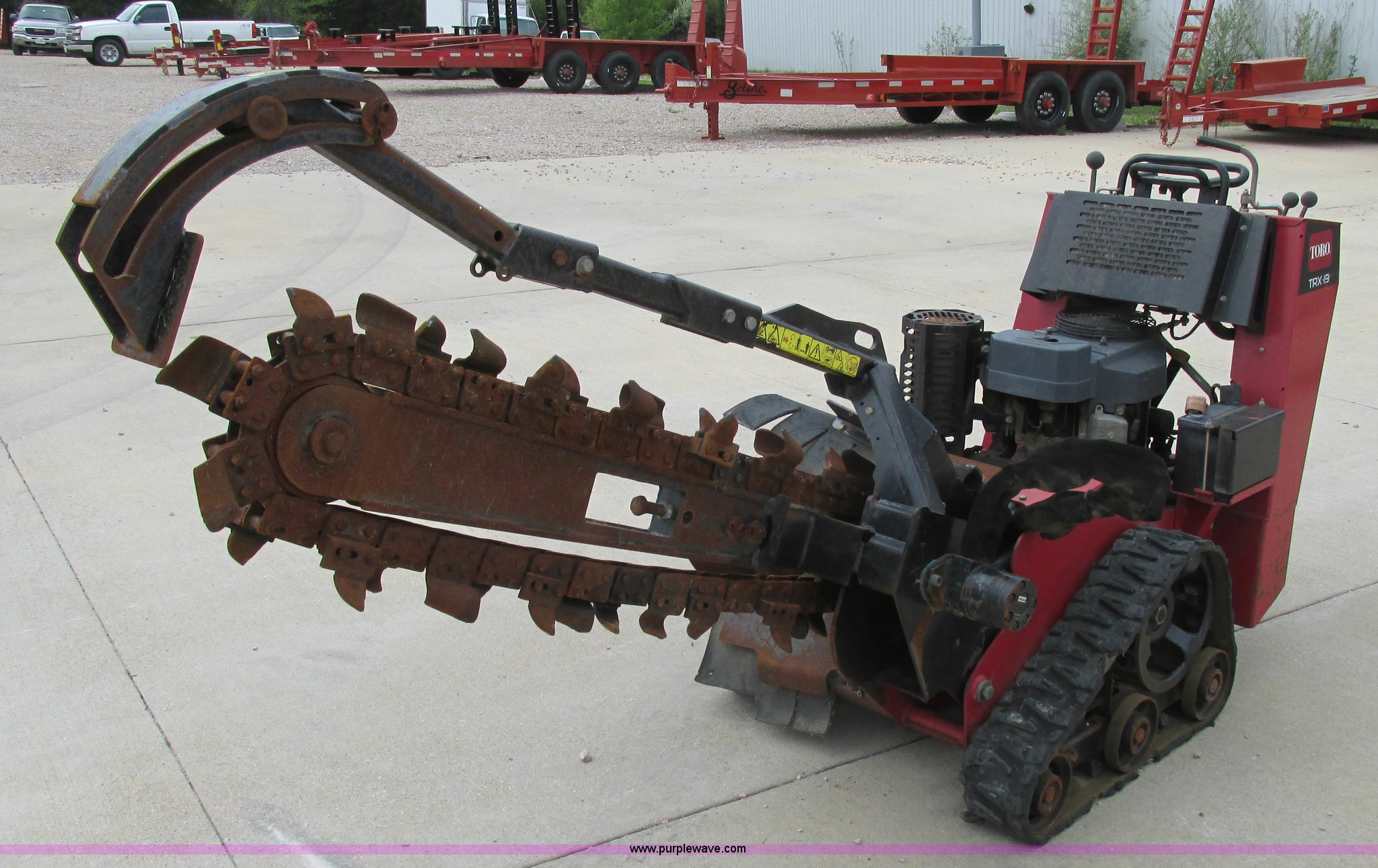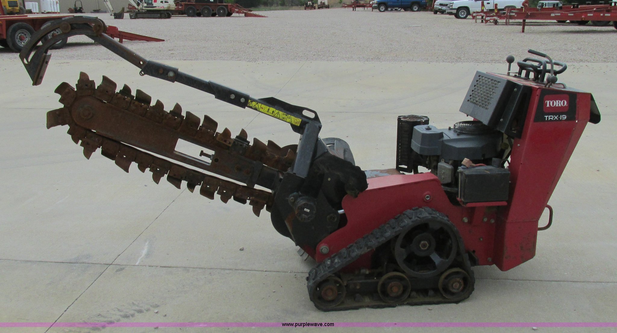 Purple Wave is selling a used Trencher or Rock Saw in Missouri. This item is a Toro TRX19 walk-behind trencher with the following: 555 hours on meter, Model 22971, Kawasaki gas engine, Electric start, Hydraulic driven transmission, 36" dig depth, Carbide tipped teeth, 5.5"W trench, Adjustable ditch cleaner/safety bar, Three bottom rollers, 6"W rubber tracks, Serial 22971-280000