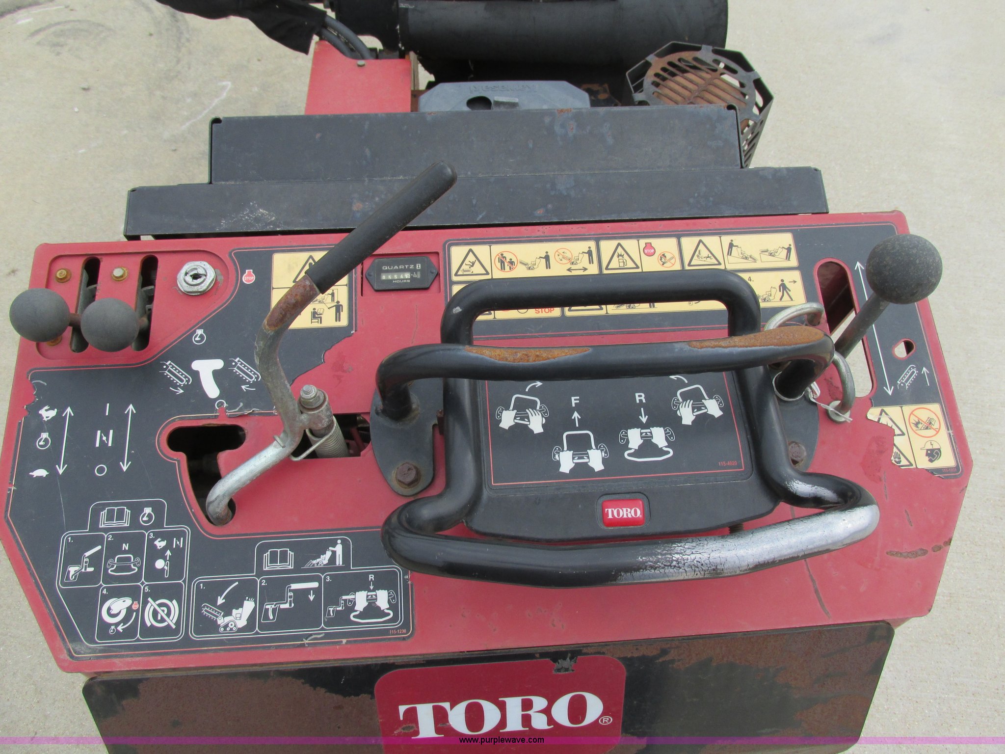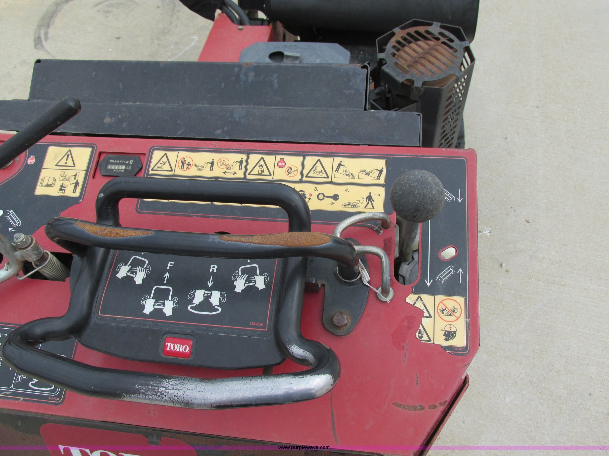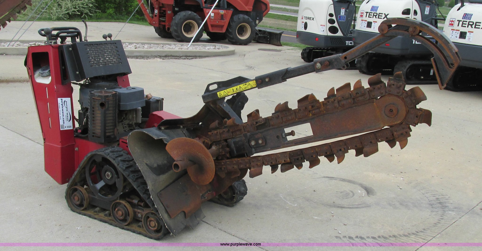 Purple Wave is selling a used Trencher or Rock Saw in Missouri. This item is a Toro TRX19 walk-behind trencher with the following: 555 hours on meter, Model 22971, Kawasaki gas engine, Electric start, Hydraulic driven transmission, 36" dig depth, Carbide tipped teeth, 5.5"W trench, Adjustable ditch cleaner/safety bar, Three bottom rollers, 6"W rubber tracks, Serial 22971-280000