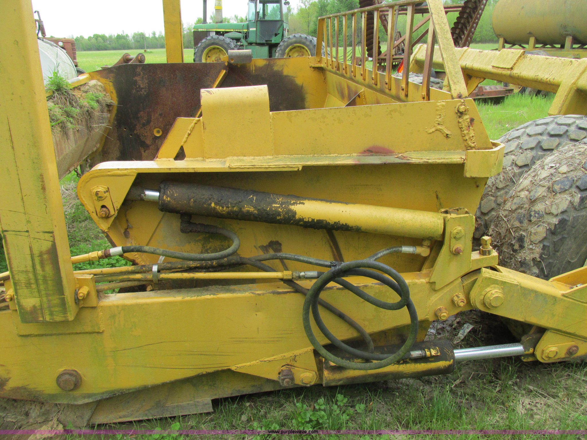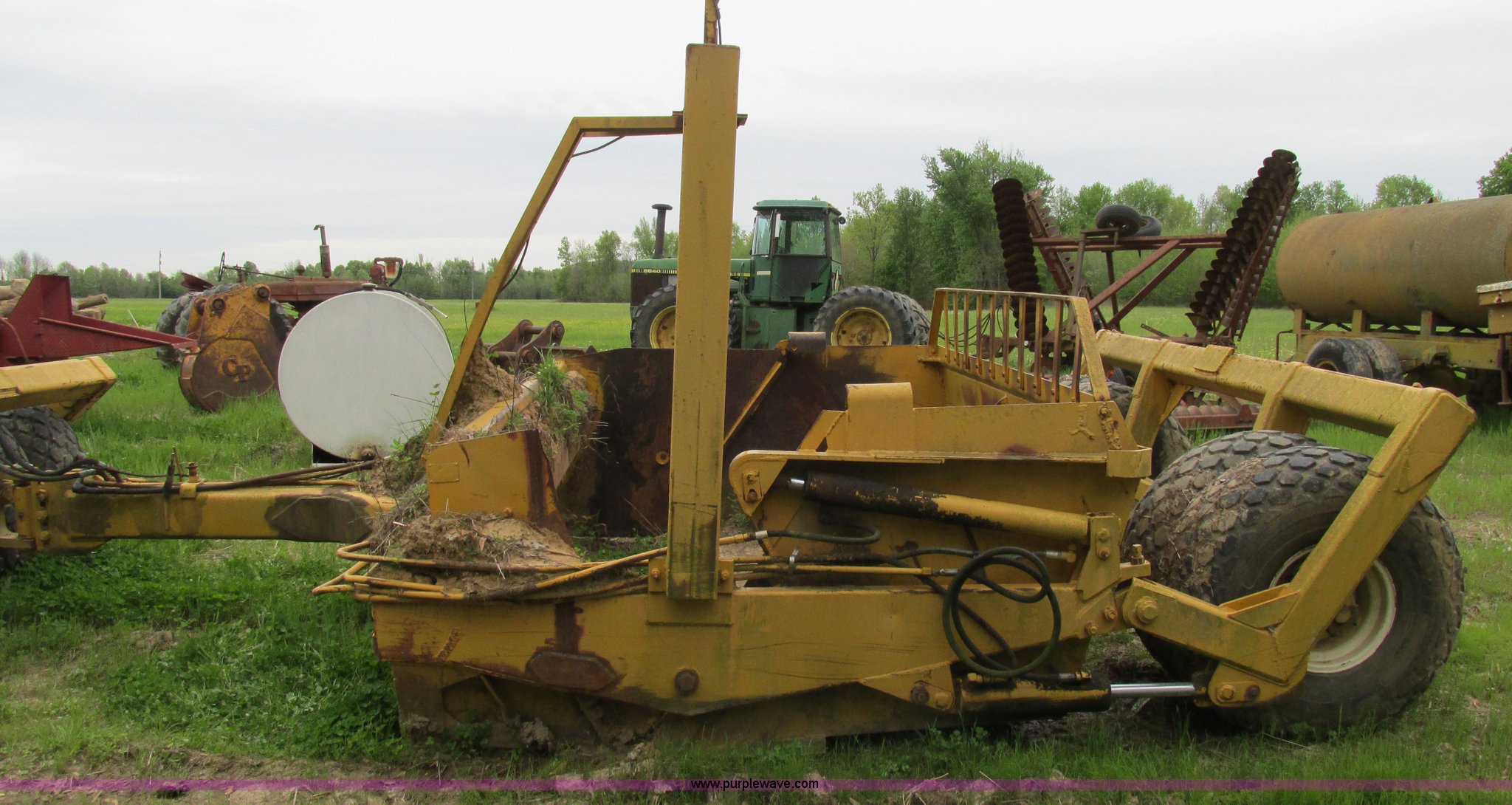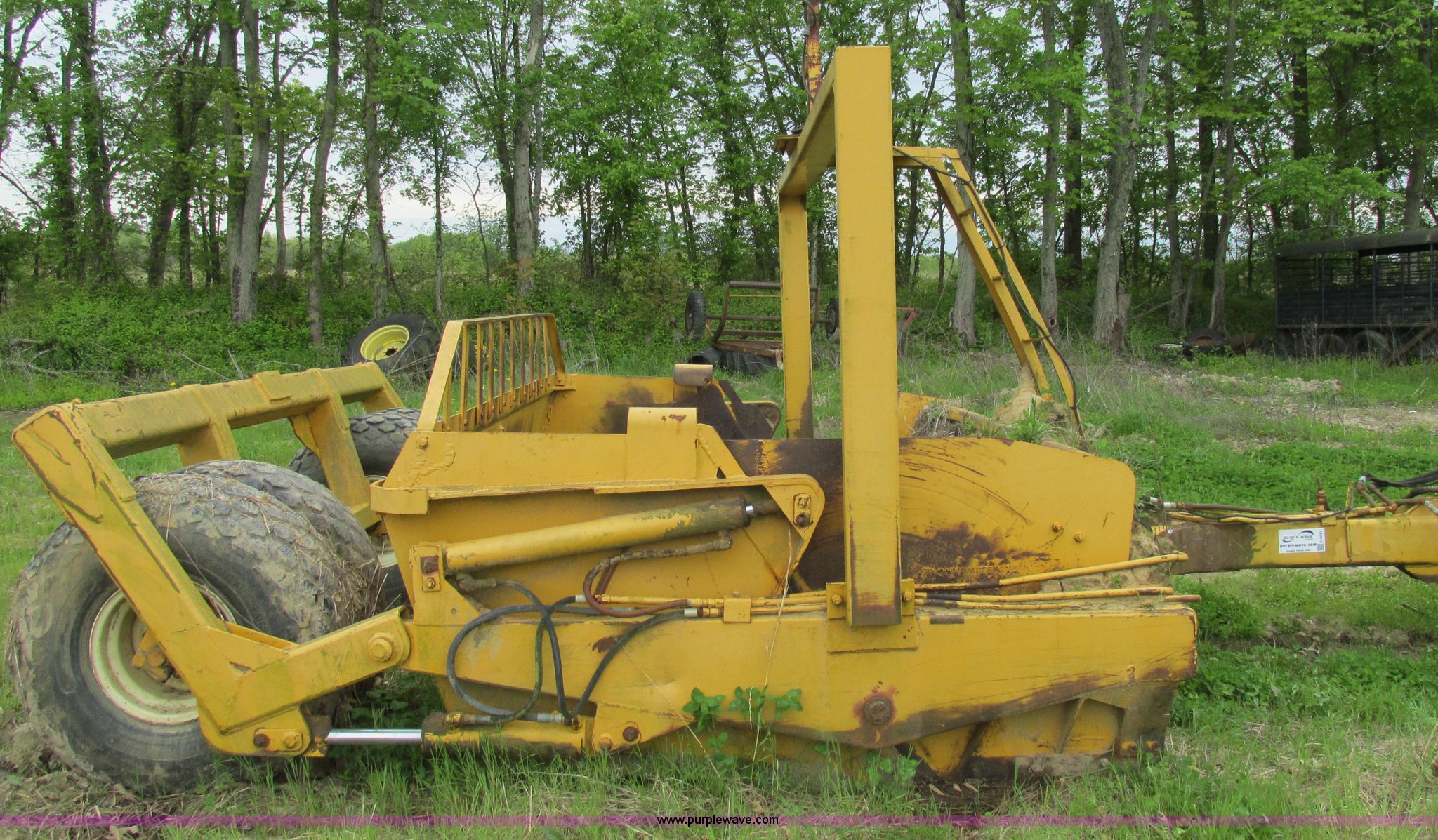 Purple Wave is selling a used Pull Type Scraper in Illinois. This item is a Reynolds 12P pan scraper with the following: 138" overall width, 12 cubic yard struck capacity, Bolt-on cutting edge, Coupler hitch, 13.50-16 ISL rear tires, Left side apron arm damaged but operable, Serial 14318