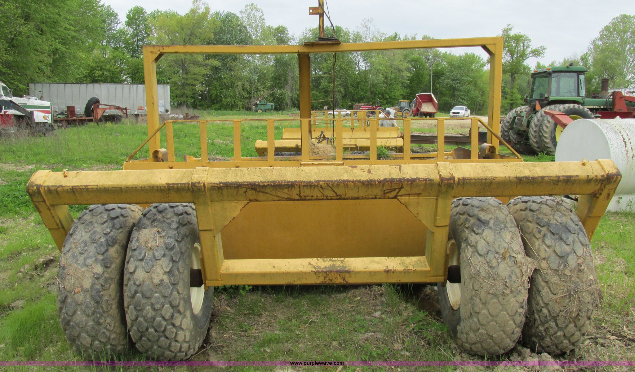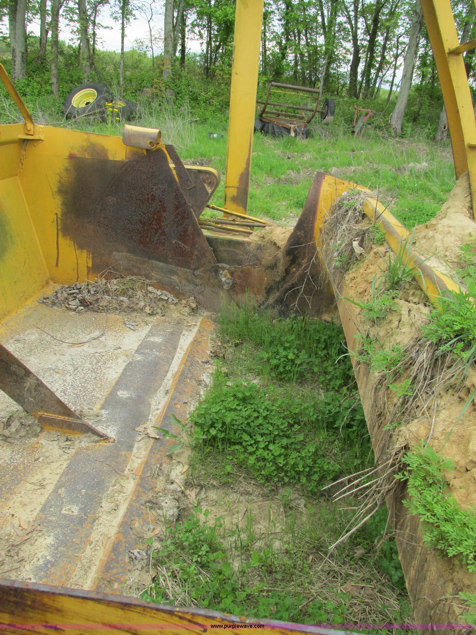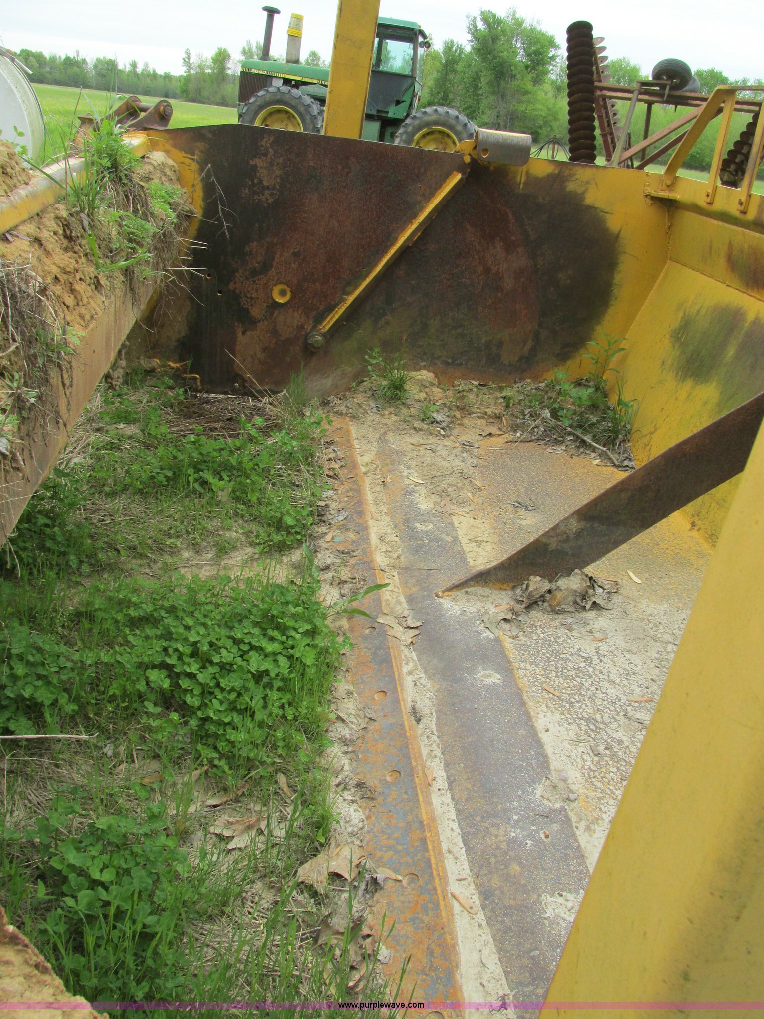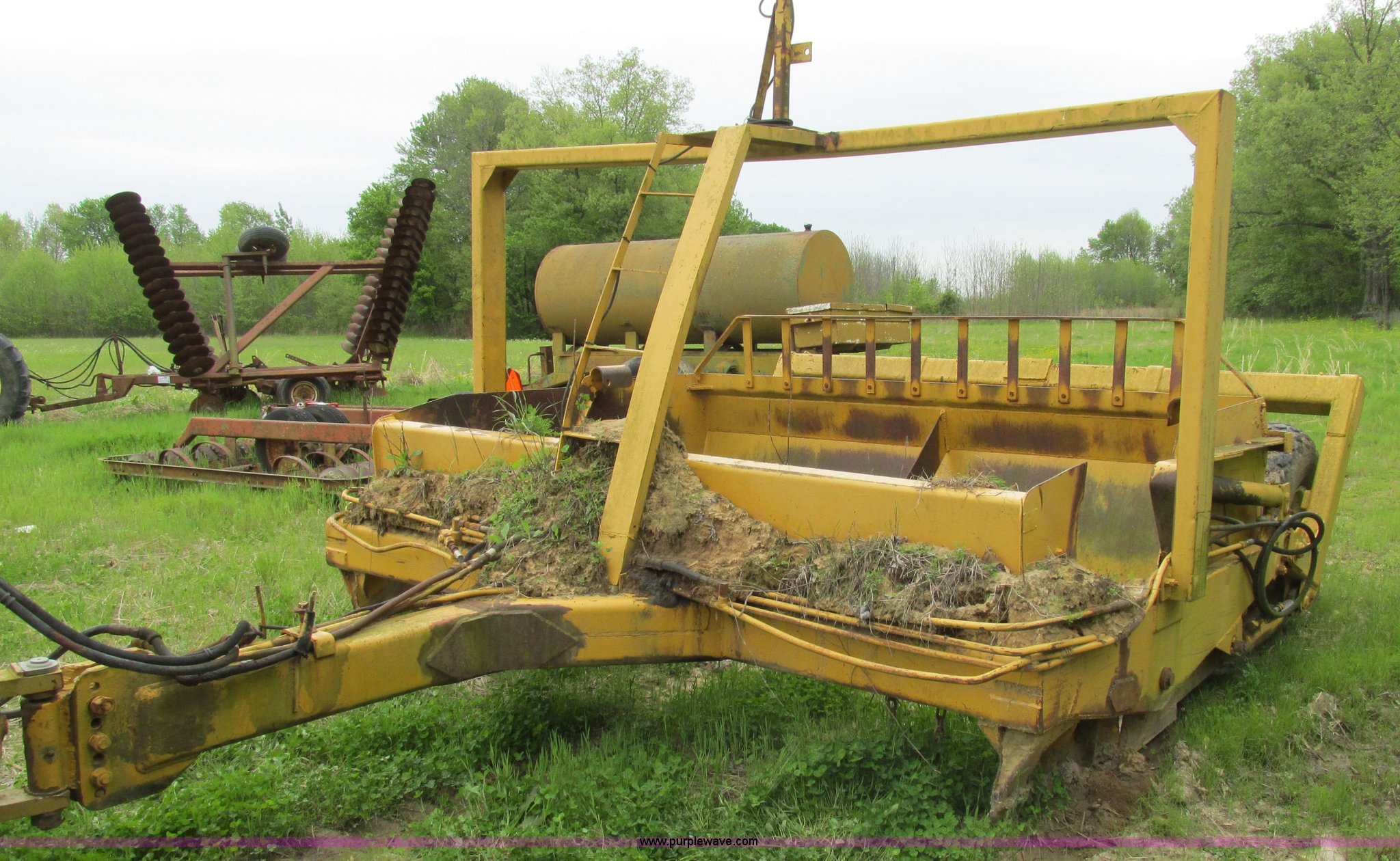Purple Wave is selling a used Pull Type Scraper in Illinois. This item is a Reynolds 12P pan scraper with the following: 138" overall width, 12 cubic yard struck capacity, Bolt-on cutting edge, Coupler hitch, 13.50-16 ISL rear tires, Left side apron arm damaged but operable, Serial 14318